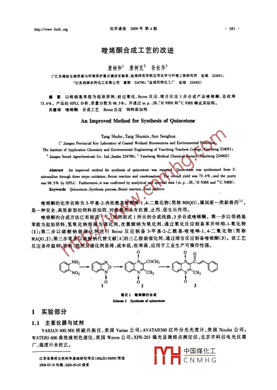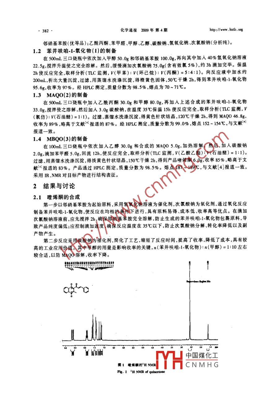 化學通報200年第4期喹烯酮合成工藝的改進唐樹和唐樹民2孫松華(江蘇灘涂生物資源與環(huán)境保護重點建設實驗室鹽城師范學院應用化學與環(huán)境工程研究所鹽城240512江蘇劍牌農藥化工有限公司建湖224003鹽城藥物化工廠鹽城224002)摘要以鄰硝基苯胺為起始原料,經過氧化、 Beirut反應、縮合反應3步合成產品唑烯酮,總收率73.4%。產品經HPC分析,質量分數(shù)為985%。并通過mp.、 R, H NMR和"CNMR確證其結構。關鍵詞喹烯酮合成工藝 Beirut反應飼料添加劑An Improved Method for Synthesis of QuincetoneJiangsu Provincial Key Laboratory of Coastal Wetland Bioresources and Environmental ProtectionThe Institute of Application Chemistry and Environmental Engineering of Yancheng Teachers College, Yancheng 224051;1 Jiangsu Sword Agrochemicals Co. Ld, Jianhu 224700'Yancheng Medical Chemical Factory, Yancheng 224002)Abstract An improved method for synthesis of quincetonenitroaniline through three steps: oxidation, Beirut reaction and condensation. The overall yield was 73. 4%, and the puritywas 98.5% by HPLC. Furthermore, it was confirmed by analytical and spectral data(m P, IR, H NMR andCNMRSynthesis process, Beirut reaction, Feed ad喹烯酮的化學名稱為3甲基-2肉桂酰基喹喔啉-1,4二氧化物(簡稱MBQO),屬國家一類新獸藥是一種安全、高效新型的飼料添加藥,對畜禽類具有抗菌、止瀉促生長作用。喹烯酮的合成方法已有報道口。按照圖式1所示的合成線路,3步合成喹烯酮。第一步以鄰硝基苯胺為起始原料,氫氧化鈉溶液為催化劑,次氯酸鈉為氧化劑通過氧化反應制備苯并呋咱1氧化物(1);第二步以碳酸鈉做催化劑進行 Beirut反應制備3-甲基-2-乙?;镞?,4二氧化物(簡稱MAQO,2);第三步筆者以碳酸鈉代替文獻[4]的三乙胺做催化劑,通過縮合反應制備喹烯酮(3)。該工藝反應條件溫和原料、溶劑及催化劑易得,成本低,收率高,應用于工業(yè)生產可操作性強圖式1烯酮的合成Scheme 1 Synthesis o quinocetone1實驗部分11主要儀器與試劑Ⅴ ARIAN400MR核磁共振儀,美國Ⅴanan公司; AVATAR360紅外分光光度計,美國 Nicolet公司;WATERS600高效液相色譜儀,美國 Waters公司;xP201偏光顯微熔點測定儀北京市科儀電光儀器廠,溫度計未校正中國煤化工江蘇省高校自然科學基礎研究項目(08KD15000)資助CNMHG200803-16收橫,2008002接受38化學通報200年第4期鄰硝基苯胺(優(yōu)等品);乙酰丙酮、苯甲醛、甲醇、乙醇、碳酸鈉、氫氧化鈉、次氯酸鈉(分析純)12苯并呋咱1氧化物(1)的制備在500mL三口燒瓶中依次加入甲醇S0.0g和鄰硝基苯胺100.0g,再向其中加入40%氫氧化鈉溶液2.5g攪拌升溫使之完全溶解。然后緩慢滴加次氯酸鈉75.0g(含有效氯5%),約3h滴加完畢。保溫2h使反應完全,取樣分析(TLC監(jiān)測,V(甲苯):V(環(huán)己烷):V(丙酮)=5:4:1)。向反應液中加水約200mL,析出大量沉淀,過濾,用蒸餾水洗滌沉淀,得橙黃色固體,50℃干燥2h,得到苯并呋咱1-氧化物95.6g,收率為97%。經HPLC測定,質量分數(shù)為985%,熔點為70~71℃。1.3MAQO(2)的制備在50m三口燒瓶中加入乙酰丙酮30.0g和甲醇80.0g,再加入上述合成的苯并呋咱1氧化物30g,攪拌使之溶解然后加入3.0g碳酸鈉在溫度35℃保溫15h使反應完全,取樣分析(TC監(jiān)測,V(氯仿):V(石油醚)=1:1)。過濾蒸餾水洗滌沉淀得黃色針狀結晶,120℃干燥2h,得到MAQO46.88,收率為89%,略高于文獻報道的87%。經HLC測定質量分數(shù)為99.0%,熔點152-154℃,與文獻報道一致。14MBQO(3)的制備在100mL三口燒瓶中依次加入乙醇30.0g和合成的MAQo5.08,加熱溶解。然后,加人碳酸鈉20g,滴加苯甲醛5.0g,回流12h,使反應完全,取樣分析(TLC監(jiān)測,V(乙酸乙酯):V(石油醚)=1:1)。過濾,用蒸餾水洗滌沉淀得淡黃色針狀結晶,150℃干燥2h,得到產品喹烯酮6.0g,收率85%,略高于文獻4報道的83%。產品通過HPC測定,質量分數(shù)為985%。熔點187~189℃,與文獻[4報道一致采用IR、NMR對目標產物進行結構表征。2結果與討論2.1喹烯酮的合成第一步以鄰硝基苯胺為起始原料采用氫氧化鈉溶液為催化劑次氯酸鈉為氧化劑,通過氧化反應制備苯并呋咱1氧化物使反應在均相的條件下進行,具有原料易得成本低、收率高等優(yōu)點。在滴加次氯酸鈉溶液前,應先攪拌2h,確保鄰硝基苯胺完全溶解防止生成的苯并呋咱1氧化物包裹原料導致產品純度偏低;應控制滴加速度,確保反應溫度在35℃以下,防止次氯酸鈉分解、轉化率降低以及副產物產生。第二步反應釆用碳酸鈉為催化劑,簡化了工藝,縮短了反應時間,提高了收率,降低了成本,具有較高的工業(yè)應用價值。其中甲醇的用量是影響收率的關鍵,n(苯并呋咱1氧化物):n(甲醇)=1:10左右較合適,以防MAQO溶解,收率下降B看聰留B6留兩3s中國煤化工圈1嚏烯酮的HNMRCNMHG化學通報200年第4期第三步反應釆用碳酸鈉替代三乙胺為催化劑,避免了使用會造成環(huán)境污染的有機胺。具有成本低、反應條件溫和時間短收率和純度高等優(yōu)點。該反應在滴加苯甲醛前應升溫回流數(shù)小時,確保物料完全溶解后再滴加,以提高收率和純度。2.2喹烯酮的結構表征目標化合物為淡黃色針狀晶體。mp.:187-189℃。IR(KBr)y(cm1):1658(C-0),1332(N-0)。細驗圖2疃烯酮的cNMR譜圖Flg. 2C NMR of qubncetooe由圖1和圖2可見喹烯酮的HNMR和CNMR數(shù)據(jù)分別如下:HNMR(400MHz,CDC):88.67(d,J=8.4Hz,1H),859(d,J=8.0Hz,1H),784-7.93(m,2H),757~7.61(m,3H),7.26~746(m,3H)7.14(d,J=164Hx,1H),257(8,3H);"CNMR(400MH,CDC3):8186.13,147.66,140.1l139.31,138.20,137.24,133.86,132.80,131.%6,131.71,129.37,124.9%6,120.51,14.14。這些數(shù)據(jù)進一步