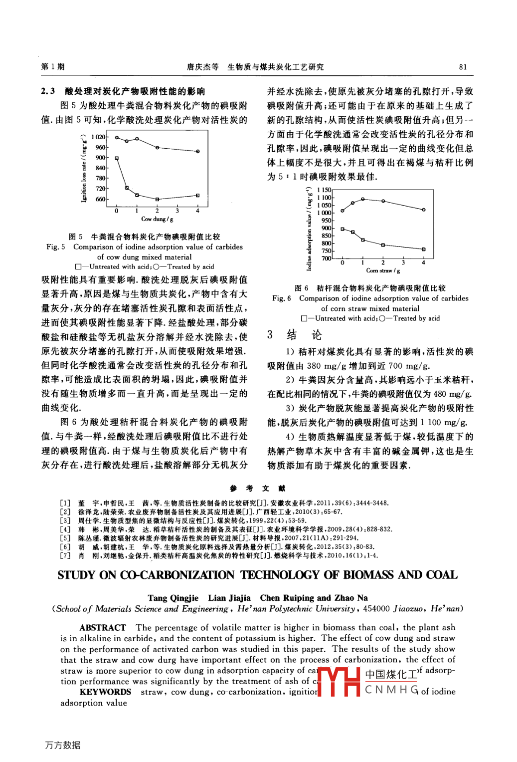 第38卷第1期煤炭轉化VoL 38 No2015年1月COAL CONVERSIONJan.2015生物質與煤共炭化工藝研究唐慶杰練佳佳?)陳瑞平3)趙娜摘要生物質含有較高的揮發(fā)分,炭化產(chǎn)物中草木灰呈堿性,且堿金屬鉀元素含量較高.研究了秸稈及牛糞等不同生物質對炭化所得活性炭性能的影響.結果表明:秸稈及牛糞對炭化過程具有重要的影響;通過燒失率計算及碘吸附值測定發(fā)現(xiàn),秸杄對炭化產(chǎn)物性能的影響明顯優(yōu)于牛糞,炭化產(chǎn)物經(jīng)脫灰處理后吸附性能顯著提高關鍵詞秸稈,牛糞,共炭化,燒失率,碘吸附值中圖分類號TQ536.9,S216.20引言有較多的無定形炭有利于制造出微孔發(fā)達的優(yōu)質活性炭的廣泛應用導致其需求量越來越大,對炭生物質中含有的揮發(fā)分含量遠遠高于煤因此在其吸附能力的要求越來越高盡管幾乎所有的含碳炭化制活性炭過程中,添加一定量的生物質因揮物質均可用于制造活性炭但從原料來源、成本及產(chǎn)發(fā)分的析出,在第一階段則產(chǎn)生大量的大孔,有助于品性能等方面綜合考慮以自然界中含碳量高、資源第二階段微孔的產(chǎn)生,對活性炭的吸附性能將產(chǎn)生極為豐富的煤作為制造活性炭的主要原料已成為必顯著的影響本實驗通過對所得活性炭的碘吸附值然趨勢但是煤質活性炭的質量普遍比木質炭低,除測定分析,研究在煤炭化過程中添加一定量的生物質了由于煤中含較多的無機礦物質外,主要是煤與木桔稈和牛糞后,對活性炭吸附性能的影響材包括果核和果殼等在結構上差異很大造成炭化1實驗部分時的歷程不同,前者炭化時多生成液相,形成取向性1.1原料及預處理好、易石墨化、各向異性、含無定形炭少的炭化物.活以內蒙古褐煤和焦作市郊區(qū)玉米秸稈和牛糞為性炭的孔隙中以微孔對比表面積的貢獻最大.活化研究對象,煤與生物質的粒度均研磨到120日時,在活化第一階段若能產(chǎn)生一定數(shù)量的大孔,則有160目,取煤5份,每份10g,分別加入0g,05g助于活化第二階段中微孔的發(fā)展,而活化第一階段1g,2g,4g生物質,混合均勻后于管式爐中進行主要是無定形炭被選擇性地消耗因此,炭化物中含炭化.生物質的工業(yè)分析和元素分析見表1表1生物質的工業(yè)分析和元素分析(%Table 1 Proximate and ultimate analysis of biomass(%.)Proximate analysis, adUltimate analysisSampleHCow dung32.406.4538.400.1.71Corn straw4.785.8871.5017.845.4842.1513.77兼 Mass fraction.1.2主要儀器設備及試劑測定原理是:向定量活性炭試樣中加入定量碘液,然實驗儀器:QSK5-14管式爐(北京電爐有限公后用硫代硫酸鈉標準溶液滴定碘的剩余濃度,求出司)和FZG8真空干燥箱(南京華奧真空設備公每克活性炭吸附碘的毫克數(shù)司).實驗試劑:氫氧化鉀,分析純;淀粉,化學純;碘,化學純;碘化鉀,分析純;碳酸鈉分析純;硫代硫酸2結果與討論鈉,分析純;鹽酸,分析純2.1無添加劑煤與生物質的炭化1.3碘吸附值的測定第80頁圖1為炭化過程中燒失率隨生物質含活性炭的碘值測定依據(jù)GB7702.7-1987,其量的變化規(guī)律由圖1可知,在煤用量一定的前提中國煤化工河南理工大學博士基金資助項目(B2011-059)l)博士、副教授;2)碩士生;3)本科生,河南理工大學材料科學與工程學院454000河CNMHG收稿日期:2014-03-25;修回H期:2014-05-22煤炭轉化2015年下,加入不同的生物質其燒失率的變化情況不同,且原因隨著生物質用量的不同呈現(xiàn)一定的規(guī)律性.與玉米2.2添加KOH后煤與生物質的炭化秸稈混合炭化時,燒失率隨玉米秸稈含量的增加而圖3為KOH處理對炭化產(chǎn)物燒失率的影響逐漸上升,但與牛糞共炭化時燒失率則隨著牛糞含量由圖3可知,KOH處理對混合物料的燒失率具有重飛Biomass/g圖1煤與生物質炭化產(chǎn)物的燒失率圖3混合物料加KOH處理的燒失率Fig. 1 Ignition loss rate of carbides of lignite and biomassFig 3 Ignition loss rate of mixture activated by KohB-Cow dung:O--Corn straw口 Cow dung; O-Corn straw的增加顯著下降且逐漸趨于平緩由于玉米秸桿的要影響,而且無論玉米秸稈還是牛糞,經(jīng)KOH處理揮發(fā)分含量高,炭化中有大量組分析出,則燒失率逐漸變大;然而牛糞灰分含量遠遠高于玉米秸稈和煤,后混合物料的燒失率都是隨著生物質用量的增加先降低后增加,同時玉米秸稈的燒失率都明顯高于牛因此,隨著牛糞的增多燒失率呈明顯下降趨勢圖2為單一煤及添加生物質后炭化產(chǎn)物的碘吸糞的燒失率由此可見在混合物料中當生物質含量較低時,添加一定量的KOH能顯著提高炭化產(chǎn)物附值,由圖2可知,添加生物質玉米秸稈及牛糞后炭的產(chǎn)率但是隨著生物質用量的增加,這種影響逐漸減弱圖4為添加KOH后炭化產(chǎn)物的碘吸附值.由圖4可知混合物料加入KOH后,炭化產(chǎn)物的碘吸Biomass/圖2炭化產(chǎn)物的碘吸附值Fig 2 Iodine adsorption value of carbides0-Cow dung:O-Corn straw化產(chǎn)物的碘吸附值都發(fā)生了顯著的提高,玉米秸稈Biomass /g對炭化產(chǎn)物碘吸附值的影響要明顯優(yōu)于牛糞,且開圖4混合物料加KOH后炭化產(chǎn)物的碘吸附值始時影響比較明顯,幾乎呈線性關系,但隨著生物質Fg4 lodine adsorption value of mixture activated by Koh用量的進一步增加,影響效果逐漸趨于平緩.玉米秸稈和牛糞都有較高的揮發(fā)分,因此在炭化過程中會附值較未經(jīng)KOH處理時都顯著提高而且隨著生產(chǎn)生大量的氣體,這些氣體在逸出過程中對提高活物質用量的