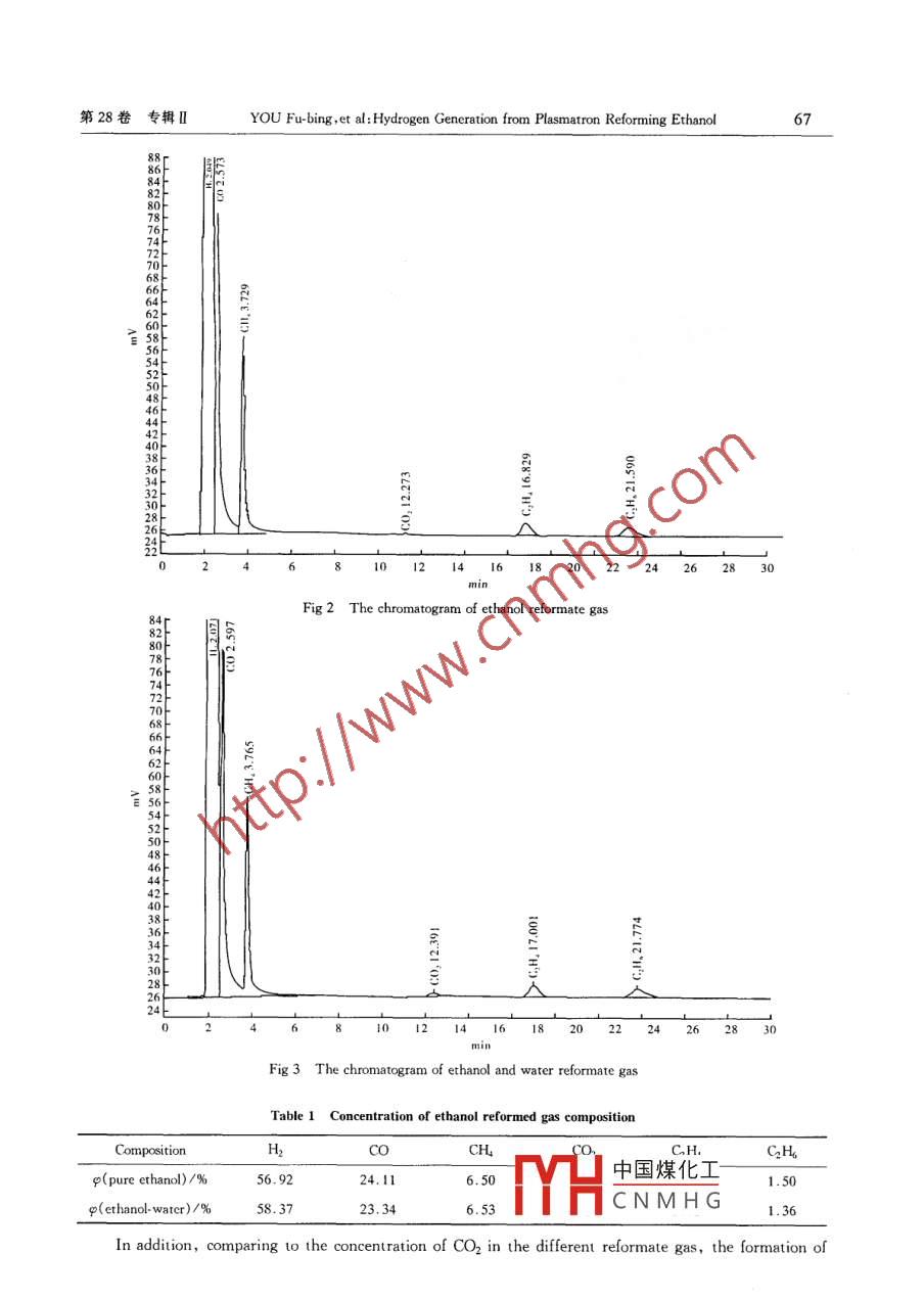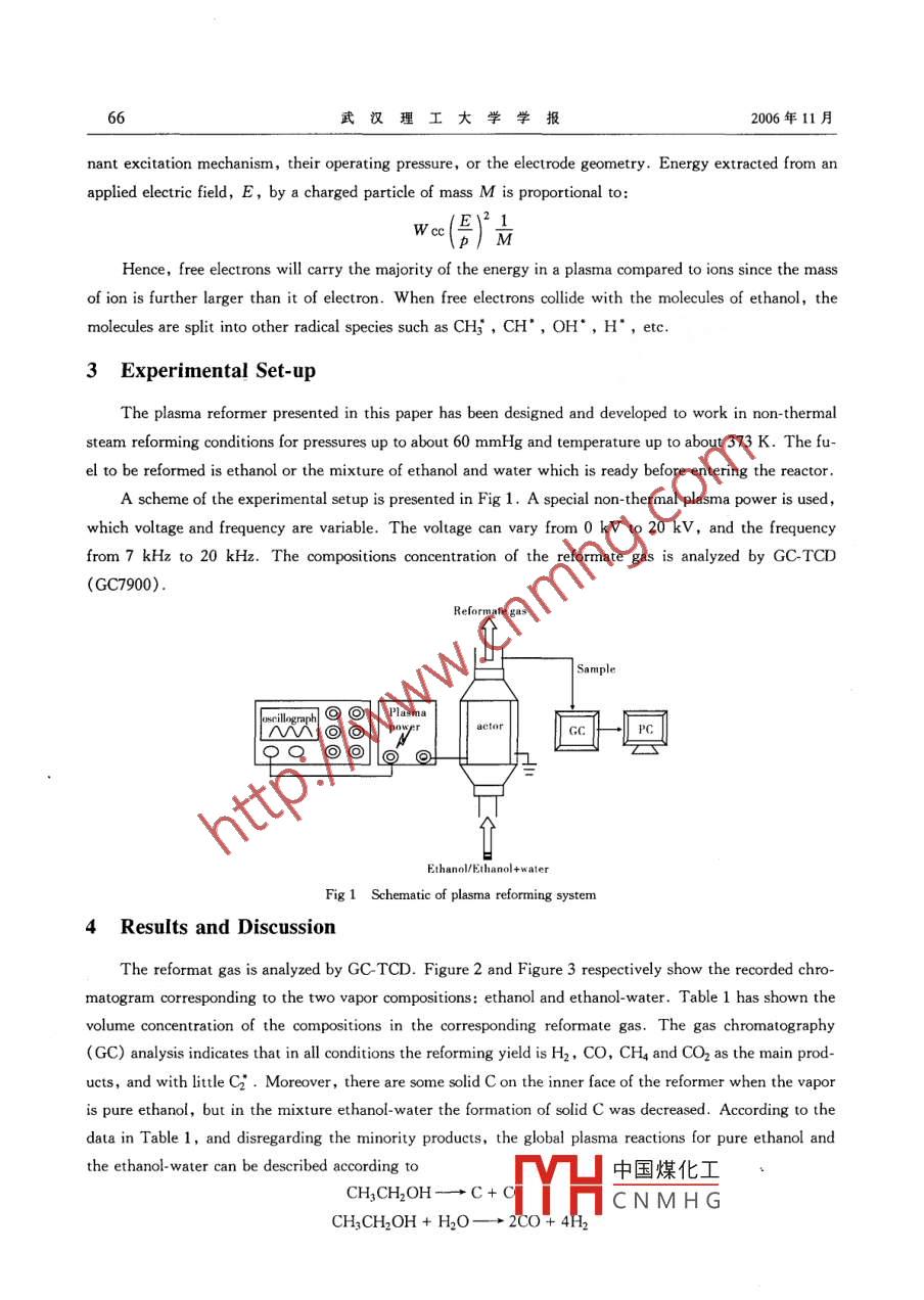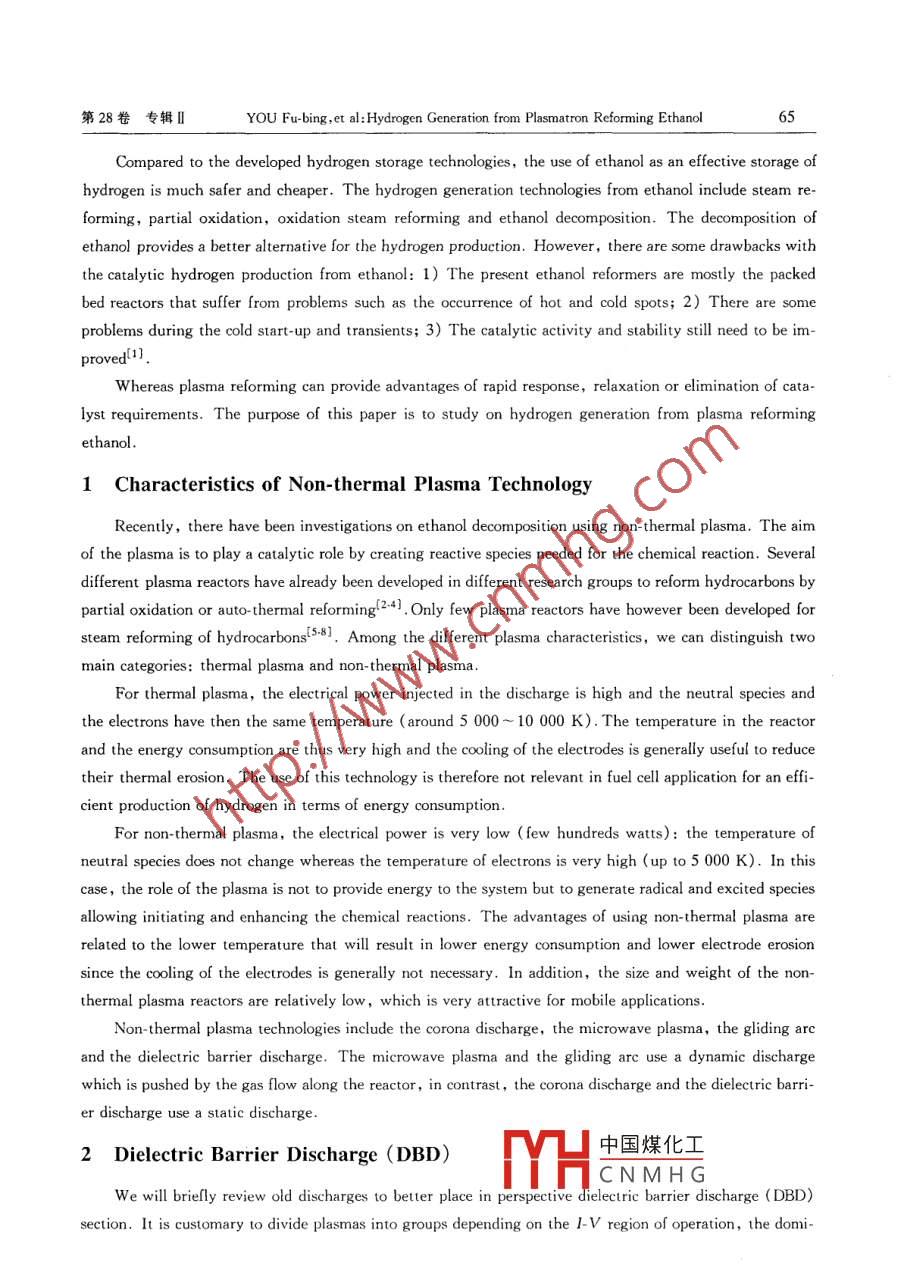 第28卷專(zhuān)輯Ⅱ武漢理工大學(xué)學(xué)報(bào)Vol.28 Suppl.Ⅱl2006年11月JOURNAL OF WUHAN UNIVERSITY OF TECHNOLOGYNov.2006Hydrogen Generation from PlasmatronReforming EthanolYOU Fu-bing, HU You-ping, LI Ge-sheng, GA0 Xiao-hong( School of Energy and Power Engineering, Wuhan University of Technology, Wuhan 430063, ChinaAbstract: Hydrogen generation through plasmatron reforming of ethanol has been carried out in a dielectric barrier discharge(DBD) reactor. The reforming of pure ethanol and mixtures of ethanol-water have been studied. The gas chro-matography (GC)analysis has shown that in all conditions the reforming yield was H2, CO, CH and Co2 as the mainproducts, and with little C. The hydrogen-rich gas can be used as fuel for gasoline engine and other applicationsKey words: hydrogen; plasreform: ethanolCLC number: TQ 116.2Document code: A Article ID: 1671-4431(2006)Suppl. I1-0064-05The increasing concern in environmental and pollution problems and energy shortage crisis implied alarge amount of efforts in the scientific world to develop alternative and renewable sources for decreasing useof fossil fuels, higher overall efficiencies and reducing emissions of harmful chemicals. These changes arelikely to be accompanied by a shift in fuel infrastructure away from gasoline and diesel towards alcohols andhydrogen-rich gases, which are more versatile and cleaner than todays common fuels. Fuel reforming, thechemical conversion of one type of fuel molecule into others, may be an extremely important part of futureenergy and power systems; reforming is also certain to be a key technology for the transitional period between current and future fuel infrastructures. The development of compact, efficient reformers that can bedirectly integrated into fuel supply systems has several possible advantages1) Power devices that have intrinsic fuel restrictions, such as fuel cells, can be brought into use withinthe current fuel infrastructure2)The effect of changes in fuel supply composition on existing vehicles and power plants can be miti-3)Both existing and future power plants can be operated with greater fuel flexibility, allowing for po-ntial emissions reductions at a slight cost in efficiency and complexity4)Hydrogen-rich gases can be supplied as fuel not only for fuel cells, but forfoundatdate:2006-08-23中國(guó)煤化工m: The Science and Technology Bureau of Wuhan(20061gty: YOU Fubing(1971-), male, candidate doctor. E-mail: youfb@HCNMHG第28卷專(zhuān)輯ⅡYOU Fu-bing, et al: Hydrogen Generation from Plasmatron Reforming Ethanol65Compared to the developed hydrogen storage technologies, the use of ethanol as an effective storage ofhydrogen is much safer and cheaper. The hydrogen generation technologies from ethanol include steam re-forming, partial oxidation, oxidation steam reforming and ethanol decomposition. The decomposition ofthanol provides a better alternative for the hydrogen production. However, there are some drawbacks withthe catalytic hydrogen production from ethanol: 1) The present ethanol reformers are mostly the packedbed reactors that suffer from problems such as the occurrence of hot and cold spots; 2) There are someproblems during the cold start-up and transients; 3) The catalytic activity and stability still need to be improved)Whereas plasma reforming can provide advantages of rapid response, relaxation or elimination of catalyst requirements. The purpose of this paper is to study on hydrogen generation from plasma reformingethanol1 Characteristics of Non-thermal Plasma TechnologyRecently, there have been investigations on ethanol decomposition using non-thermal plasma. The aimof the plasma is to play a catalytic role by creating reactive species needed for the chemical reaction. Severaldifferent plasma reactors have already been developed in different research groups to reform hydrocarbons bypartial oxidation or auto-thermal reforming 2-4. Only few plasma reactors have however been developed forsteam reforming of hydrocarbons (5.81. Among the different plasma characteristics, we can distinguish twomain categories: thermal plasma and non-thermal plasmaFor thermal plasma, the electrical power injected in the discharge is high and the neutral species andthe electrons have then the same temperature (around 5 000-10 000 K). The temperature in the reactorand the energy consumption are thus very high and the cooling of the electrodes is generally useful to reducetheir thermal erosion. The use of this technology is therefore not relevant in fuel cell application for an efficient production of hydrogen in terms of energy consumptionFor non-thermal plasma, the electrical power is very low(few hundreds watts): the temperature ofneutral species does not change whereas the temperature of electrons is very high(up to 5 000 K). In thiscase, the role of the plasma is not to provide energy to the system but to generate radical and excited speciesallowing initiating and enhancing the chemical reactions. The advantages of using non-thermal plasma areelated to the lower temperature that will result in lower energy consumption and lower electrode erosionsince the cooling of the electrodes is generally not necessary. In addition, thetht of the non-thermal plasma reactors are relatively low, which is very attractive for mobile applicaton-thermal plasma technologies include the corona discharge, the microwave plasma, the gliding arcand the dielectric barrier discharge. The microwave plasma and the gliding arc use a dynamic dischargehich is pushed by the gas flow along the reactor, in contrast, the corona discharge and the dielectric barrier discharge use a static discharge2 Dielectric Barrier Discharge(DBD)中國(guó)煤化工CNMHGWe will briefly review old discharges to better place ine dielectric barrier discharge(DBD)section. It is customary to divide plasmas into groups depending on the I-v region of operation, the dor武漢理工大學(xué)學(xué)報(bào)2006年11