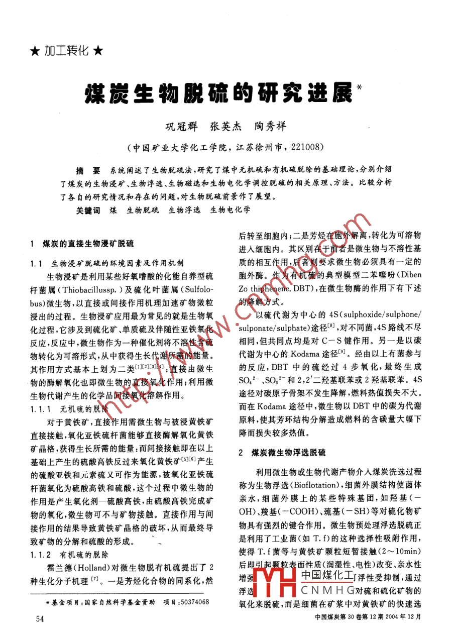 ★加工轉(zhuǎn)化★煤炭生物脫硫的研究進(jìn)展鞏冠群張英杰陶秀祥(中國(guó)礦業(yè)大學(xué)化工學(xué)院,江蘇徐州市,221008)摘要系統(tǒng)闡述了生物脫硫法,研究了煤中無(wú)機(jī)硫和有機(jī)硫脫除的基礎(chǔ)理論,分別介紹了煤炭的生物浸礦、生物浮選、生物磁選和生物電化學(xué)調(diào)控脫硫的相關(guān)原理、方法。比較分析了各自的研究情況和存在的問(wèn)題,對(duì)生物脫硫前景作了展望。關(guān)鍵詞煤生物脫硫生物浮選生物電化學(xué)后轉(zhuǎn)至細(xì)胞內(nèi);二是芳烴在胞外解離,轉(zhuǎn)化為可溶物1煤炭的直接生物浸礦脫硫進(jìn)入細(xì)胞內(nèi)。其區(qū)別在于前者是微生物與不溶性基1.1 生物浸礦脫硫的環(huán)境因素及作用機(jī)制質(zhì)的相互作用,后者則要求微生物必須具有一定的生物浸礦是利用某些好氧嗜酸的化能自養(yǎng)型硫胞外酶。作為有機(jī)硫的典型模型二苯噻吩(Diben桿菌屬(Thiobacillussp. )及硫化葉菌屬(Sulfolo-Zo thiphenene. DBT),在微生物酶的作用下有下述bus)微生物,以直接或間接作用機(jī)理加速礦物微粒的降解方式。浸出的過(guò)程。生物浸礦應(yīng)用最為常見(jiàn)的就是生物氧以硫代謝為中心的4S( sulphoxide/ sulphone/化過(guò)程,它涉及到硫化礦、單質(zhì)硫及伴隨性亞鐵氧化sulponate/ sulphate)途徑[8) ,對(duì)不同菌,4S路線不盡反應(yīng),反應(yīng)中,微生物作為一種催化劑將不溶性含硫相同,但共同點(diǎn)均是對(duì)C-S鍵作用。另一是以碳物轉(zhuǎn)化為可溶形式,從中獲得生長(zhǎng)代謝所需的能量。代謝為中心的Kodama途徑0。經(jīng)由以上有菌參與其作用方式基本.上劃為二類(lèi)12)[3[]:直接由微生的反應(yīng),DBT中的硫經(jīng)過(guò)4步氧化,最終生成物的酶解氧化也即微生物的直接氧化作用;利用微SO.2-、SO3?- 和2,2'二羥基聯(lián)苯或2羥基聯(lián)苯。4S生物代謝產(chǎn)生的化學(xué)品間接氧化溶解作用。途徑對(duì)碳原子骨架不發(fā)生降解,燃料熱值損失不大。1.1.1 無(wú)機(jī)硫的脫除而在Kodama途徑中,微生物以DBT中的碳為代謝對(duì)于黃鐵礦,直接作用需微生物與被浸黃鐵礦原料,使其芳環(huán)結(jié)構(gòu)分解造成燃料的含碳量大幅下直接接觸,氧化亞鐵硫桿菌能夠直接酶解氧化黃鐵降而損失較多熱值。礦晶格,獲得生長(zhǎng)所需的能量:而間接接觸即在以上2煤炭微生物浮選脫硫基礎(chǔ)上產(chǎn)生的硫酸高鐵反過(guò)來(lái)氧化黃鐵礦[51[6]產(chǎn)生的硫酸亞鐵和元素硫又可作為能源,被氧化亞鐵硫利用微生物或生物代謝產(chǎn)物介人煤炭洗選過(guò)程桿菌氧化為硫酸高鐵和硫酸,這個(gè)過(guò)程中微生物的稱(chēng)為生物浮選(Bioflotation) ,細(xì)菌外膜結(jié)構(gòu)使菌體作用是產(chǎn)生氧化劑一硫酸高鐵,由硫酸高鐵完成礦親水,細(xì)菌外膜上的某些特殊基團(tuán),如羥基(一物的氧化,微生物可不與礦物接觸。直接作用與間OH)、羧基( -CO0H)、巰基(- SH)等對(duì)硫化物礦接作用的結(jié)果導(dǎo)致黃鐵礦晶格的破壞,從而最終導(dǎo)物具有強(qiáng)烈的鍵合作用。微生物預(yù)處理浮選脫硫正致礦物的分解和硫酸的形成。是利用了工業(yè)菌(如T.f)的這種選擇性吸附作用,1.1.2 有機(jī)硫的脫除使得T.f菌等與黃鐵礦顆粒短暫接觸(2~10min)霍蘭德(Holland)對(duì)微生物脫有機(jī)硫提出了2后即引起顆粒表面性質(zhì)(潤(rùn)濕性.電性)改變.親水性種生化分子機(jī)理的。一是芳烴化合物的同系化,然增強(qiáng)中國(guó)煤化工浮性受抑制,通過(guò)浮YHCNMHG對(duì)硫和硫化礦物的*基金項(xiàng)目:國(guó)家自然科學(xué)基金資助項(xiàng) 目:50374068氧化來(lái)脫硫,而是細(xì)菌在礦漿中對(duì)黃鐵礦的快速選54中國(guó)煤炭第30卷第12期2004年12月?lián)裎?改變其表面性質(zhì),因而分選速度大大加快,4生物電化學(xué)脫硫杰克(Zeky)和安蒂亞(Attia)[10]通過(guò)實(shí)驗(yàn)發(fā)現(xiàn):在浮選前用T.f菌處理5~ 10min,則煤中黃鐵礦硫浮4.1 脫硫菌種的選育與誘變馴化選去除率可達(dá)90%。中國(guó)礦業(yè)大學(xué)生物選礦項(xiàng)目蘇歌(Suga)[17]等人研究發(fā)現(xiàn)在電場(chǎng)作用下,細(xì)課題組利用T.f 菌和紅假單胞菌(Rhodopseudo-菌細(xì)胞具有特性定位、向電生長(zhǎng)的現(xiàn)象。而且電場(chǎng)monasSP.)對(duì)煤進(jìn)行浮選脫硫,初步研究效果也較技術(shù)對(duì)細(xì)胞膜的可逆性電擾動(dòng)技術(shù),實(shí)現(xiàn)了電場(chǎng)對(duì)好,可實(shí)現(xiàn)無(wú)機(jī)硫60%~70%的脫除率。細(xì)胞融合的誘變馴化,同時(shí)使通過(guò)控制脈沖電壓峰值和時(shí)間,在膜恢復(fù)過(guò)程中發(fā)生細(xì)胞間融合,有利于3生物磁選脫硫融合活性高的細(xì)胞,使膜融合向核融合發(fā)展,造成雜細(xì)菌由細(xì)胞構(gòu)成,胞內(nèi)線粒體、核糖體、各種酶、交優(yōu)育。中國(guó)礦業(yè)大學(xué)化工學(xué)院在研究T.f菌脫核酸、基質(zhì)及細(xì)胞的選擇性通過(guò)性膜結(jié)構(gòu),在磁場(chǎng)的除煤中硫的同時(shí)也發(fā)現(xiàn)了利用電場(chǎng)可以馴化選育菌作用下會(huì)發(fā)生系列變化與誘導(dǎo)反應(yīng)。利用這一現(xiàn)種并提高脫硫比率的試驗(yàn)結(jié)果。象,人們借用磁場(chǎng)對(duì)細(xì)菌進(jìn)行馴化、誘導(dǎo)繁殖與選利用細(xì)菌生長(