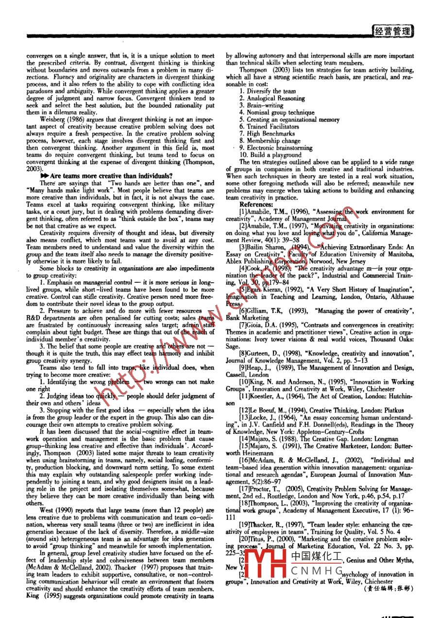 2010年2月總第211期Analysis of Creativity and Innovation江蘇大豐市彩虹貿(mào)易發(fā)展有限公司何瑪中國熱帶農(nóng)業(yè)科學(xué)院徐惠敏摘要:創(chuàng)新與變革是企業(yè)在當(dāng)今全球化信息時代生存發(fā)展的關(guān)鍵之策,它能使傳統(tǒng)行業(yè)起死回生,它是新興產(chǎn)業(yè)的制勝法寶。革新為企業(yè)創(chuàng)造了財富,為社會創(chuàng)造了價值,管理學(xué)大師彼得德魯克認(rèn)為,人類的革新活動本身就創(chuàng)造了資源。不僅是科學(xué)家和企業(yè)家致力于科技和產(chǎn)品的創(chuàng)新,社會學(xué)家和學(xué)者們也熱衷于研究社會變革所推動的社會進(jìn)步。同時,個人創(chuàng)造力和集體創(chuàng)新能力的相互影響和制約關(guān)系也是管理者關(guān)注的問題,即如何在組織中形成個人與集體的創(chuàng)新能力的合力。本文簡要介紹分析了創(chuàng)新與變革在學(xué)術(shù)領(lǐng)域中的一- 些基本概念和理論,并論述如何構(gòu)建集體創(chuàng)新能力。對研究企業(yè)管理和從事市場營銷工作的人士可以提供理論和實踐.上的參考和借鑒。關(guān)鍵詞:創(chuàng)新 創(chuàng)造力變革想象力發(fā)散性思維集體創(chuàng)新能力合力比Introductioninnovation as a series of intersecting circles (ee Figure 1), whereStated it simply, creativity ,is to make something new. As the creative. ideas are the input and innovation is the output. Ideas arecreature of the God, we human beings have been creating enormousscreened to produce results, which include making something newer,things on this planet, for the sake of survival and protection, contest better, faster, cheaper, and/or more aesthetic. This view is supportedand conquest, wellbeing. and enjoyment, even mischief, or just of no by Amabile (1997) who considered creativity as the first step in inno-reason. Hence there are bows and shields, telephones and spaceships, vatin, which is the sucessful implementation of the novel, appropi-medicine and movies, as well as computer virus.ate ideas.Nowadays, people love the new, the original, the creative andinnovative. They love it not only because of the popularity of revolu-tionaries or the trend of liberalization, but because it is the necessityto deal with the rapid environmental changes. Over the past fewdecades, creativity and innovation have become a highly fashionabletopic, especially in business world where its importance to the con-tinued success for business has been well recognized. Cook (1998)Figure 1 Relationship between creativity and innovationconsiders creativity as an element of competitive advantage for orga-nizations, and Majaro (1991) suggests enhanced creativity can provideTitus (2000) has defined creativity as "the birth of imaginativea company with a competitive edge. While many businesemen alsoew ideas"."' In general, the mathematician tends to get good ideas inallege that companies must innovate or they will die.mathematics, the musician in music, the psychologist in psychology.Either favoured by researchers or critical for executives, creativ-Creative thinkinearises moreeasily in fieldeandinrelationtoorob-ity and innovation in business management has been investigated andlems that we know a good deal about (Proctor, 2005). Locke (1964)practiced at all levels from organization structure, team project, to in.maintained that the source of all ideas is human experience and un-dividual performance. In this paper, first there is a brief overview inderstanding, that is, ideas sprang from knowledge. This implies cre-the area about some key concepts and major theories relating to cre-ativity is the essence of profound knowledge. While Albert Einsteinativity enhancement and creative problem solving. Next, a discussiononce wrote:“Imagination is more important than knowledge. Knowl-on team creativity building is elaborated.,edge is limited. Imagination encircles the world."比A Broad View on Creativity and InnovationCreativity is very much concermed with how we imaging things.Creativity v8. innovation.Imagination is generally the first step in leaming, or creating, some-CneativityInnovationthing radically new. In creativity, imagination is making plans, seeingpossibilities, even drawing blueprints. Egan (1992) defined imagina-tion as the capacity to think of things in terms of possibilities, and isa conscious and intentional act of mind as well as the source of newNotions about creativity and innovation are complex, and thereand useful ideas and thingg in a particular context or discipline.is no one standard authority on the subject (Proctor, 2005). The twoBailin (1994) agreed that creative achievement requires the use of theterms are often used interchangeably and that may sometimes misleadimagination. Skill and imagination are interwoven, and the reciprocalliterature reviewers who are new in the field.interaction between them allows for creative achievement and growthThe concept of creativity often comes across in our daily life,to manifest in new and useful developments in a given context or dis-and there are varous definitions of it. The simplest one is' *thinkingAccording to Roger Sperry's Left Brain/Right Brain theory con-diferently" from Dennis Gioia (1995) who saw creativity 8 the pro-cerning creative thinking (see Le Boeuf, 1994), imaginative thinkingcess of“ making the familiar strange and making the strange famil-.is controlled by right brain, while problem solving is done by leftiar." Amabile's (1996) definition of creativity as“the production ofnovel and useful ideal in any domain" has been widely ciled. Simi.brain. To put them work together to form one big mind, then it islarly, Gilliamn (1993) defined creativity as a process of discoveringcreative problem solving.what has not been considered.- the act of making new connections.T