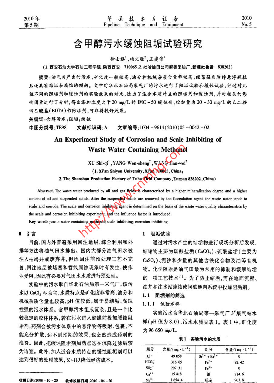 2010年.管道_技術(shù)5設(shè)備2010第5期Pipeline Technique_ and EquipmentNo.5含甲醇污水緩蝕阻垢試驗研究徐士祺' ,楊文勝2 ,王建偉2(1.西安石油大學(xué)石油工程學(xué)院,陜西西安710065 ;2.吐哈油田公司鄞善采油廠新疆吐魯番838202)摘要:油氣田產(chǎn)出的污水,礦化度一般較高,油分和機(jī)械雜質(zhì)含量都較高,經(jīng)絮凝劑除掉懸浮顆粒后還具有結(jié)垢和腐蝕的傾向。文中對華北石油局采氣廠的污水進(jìn)行了阻垢試驗和緩蝕試驗,經(jīng)過對幾組不同的阻垢劑和緩蝕劑的實驗效果的對比,選出了適合水質(zhì)特點的阻垢劑和緩蝕劑,并對相關(guān)的影響因素進(jìn)行了分析,得出添加濃度大于20 mg/L的IMC-50緩蝕劑,投加量為20 ~30 mg/L的乙二胺四乙酸鹽(EDTA)作防垢劑,可取得較好效果。關(guān)鍵詞:含醇污水;阻垢;緩蝕中圖分類號:TE98文獻(xiàn)標(biāo)識碼:A .文章編號:1004 -9614(2010)05 -0042 -02An Experiment Study of Corrosion and Scale Inhibiting ofWaste Water Containing MethanolXU Shi-qi' ,YANG Wen-sheng' ,WANG Jian-wei?(1. Xi'an Shiyou University ,Xi'an 710065 ,China;2. The Shanshan Production Factory of Tuha Field Company , Turpan 838202 ,China)Abstract:The waste water produced by oil and gas fields is characterized by a higher mineralization degree and a highercontent of oil and suspended solids. After the suspended solids are removed by the flocculation agent, the waste water tends toscale and corrode. The scale and corosion inhibiting agent is determined on the basis of the waste water quality charateristics bythe scale and corrosion inhibiting experiment , and the influence factor is intoduced.Key words: waste water containing methanol ;scale inhibiting;corrosion inhibiting0引言1阻垢試驗?zāi)壳?國內(nèi)外普遍采用回注地層、綜合利用和外通過對污水產(chǎn)生的結(jié)垢物進(jìn)行現(xiàn)場分析后發(fā)現(xiàn),排等方法將油氣田水排出。國內(nèi)大部分油氣田水被結(jié)垢物 主要為碳酸鹽垢( CaCO3)、硫酸鹽垢(主要為注人枯竭井或廢棄井,但因回注前預(yù)處理工藝不完CaSO,)、泥沙和少量的其他含鐵化合物及油等有機(jī)善,回注地層被堵塞和管線腐蝕現(xiàn)象時有發(fā)生,使作物?;瘜W(xué)阻垢是油氣田最為常用的抑制和緩解結(jié)垢業(yè)受阻,因此有必要對氣田水水質(zhì)進(jìn)行預(yù)處理。的一項工藝技術(shù)”。為了防止結(jié)垢,需在地面流程、實驗中的污水取自華北石油局第一采氣廠,該污油井和注水站連續(xù)或間歇地向系統(tǒng)中投加阻垢劑。水以CaCl2型為主,水質(zhì)特點是礦化度非常高,油分和1.1阻垢劑的篩選機(jī)械雜質(zhì)含量也較高,pH值較低,屬于易結(jié)垢、腐蝕1.1.1 試驗水樣性強(qiáng)的污水體系。含甲醇污水組成復(fù)雜,且是-一個比實驗污水為華北石油局第一采氣廠 3"集氣站水較穩(wěn)定的膠體體系,若在污水進(jìn)入儲罐前投加緩蝕阻樣(pH值為8.0),污水水質(zhì)見表1。表1中,礦化度垢劑,藥劑會被污水體系中的懸浮物等吸附、包裹、不為96650mg/L.能充分?jǐn)U散,達(dá)不到預(yù)期的效果,也必然造成藥劑的表1實驗污水的水質(zhì)浪費。因此,把緩蝕阻垢劑加藥點選在沉降過濾后較為適宜。此外,加入適合水質(zhì)特點的緩蝕阻垢劑可以,組分含量/(mg.L-1)含量/(mg.L-I)C1-49 058S2+ +Ba20達(dá)到很好的處理效果,又可以降低經(jīng)濟(jì)成本。HCO;316. 6582.42so?-297.31Fe3+Ca2+15418油214.6收稿日期:2008-10-20收修改稿日期:2010-04 -20_Mg2*1 654.4機(jī)雜963. 8..第5期徐士祺等:含甲醇污水緩蝕阻垢試驗研究431.1.2 試驗藥品C.腐蝕速率值取3個試樣的平均測定結(jié)果。通過對污水水樣的分析可見,水樣中主要結(jié)垢離表3不同溫度下的阻垢試驗子為Ca2*、Mg*等。為此,從常見的油田防垢劑ED-溫度/C加量/(mg.L")阻垢率/%防垢效果TA、HEDP、PAA .ATMP等中進(jìn)行篩選2]。選定的藥品191.6極少量結(jié)垢30100.0無結(jié)垢產(chǎn)生主要有R-SO,Na(十二烷基苯磺酸鈉)、(NaPO3)。_5100. 0(六偏磷酸鈉) EDTA(乙二胺四乙酸鹽)、HEDP(羥基:85.3503C乙叉二磷酸鹽)、EDTMP(乙二胺四甲叉磷酸)、PAA_S(聚丙烯酸)、ATMP(氨基三甲叉磷酸)及AMP(單磷86.1酸腺苷)。701.1.3 試驗結(jié)果86.5在50C條件下,向水樣中加入不同防垢劑進(jìn)行90防垢實驗??瞻姿畼蛹尤朔拦竸┖螅Y(jié)垢沉淀量減_5(少,水中Ca2*、Mg*含量降低。將加人防垢劑的水樣2.1緩蝕劑的篩選與不加防垢劑的空白水樣相比較,減少的沉淀量與空2.1.1實驗水樣白水樣沉淀量的比值即為阻垢率3。由表2可見,實驗污水仍為華北石油局第一采氣廠3"集氣站PAA和HEDP效果較好,EDTA效果最好。EDTA 是水樣(pH值為8.0)?;瘜W(xué)分析中使用極為廣泛的一-種試劑,與Ca2*、Mg2'2.1.2試驗藥品金屬離子具有很強(qiáng)的絡(luò)合作用,故其防垢效果將比較緩蝕劑為KYHZ - 10、KYHZ -4、MC -50、KW -3656、KY -3514[5]。好。表2不同阻垢劑篩選試驗2.1.3試驗結(jié) 果由表4可知,在50C下,先向混和水樣通高純氮藥劑種類加量/(mg.川)_阻垢奉/%R- SO,Na1:70.6一定量結(jié)垢氣0.5h除氧,然后添加緩蝕劑KYHZ-10、KYHZ-(NaPO,)。64. 34 IMC-50、KW - 3656.KY -3514。試驗結(jié)果表明水EDTA1586.4樣的腐蝕性都比空白時的明顯降低,說明這些緩蝕劑HEDP81.2均有緩蝕效果,其中緩蝕劑IMC -50效果最好。PAA77.1表4不同緩蝕劑篩 選試驗ATMP72. 5加量/腐蝕速率/溫度/CEDTMP78.2(mg.L1)(mm.a~')AMP73.40. 2760. 1321.2溫度和加劑量對 EDTA阻垢效果的影響KYHZ -1000_0.097在不同溫度下,向水樣中加人不同量EDT