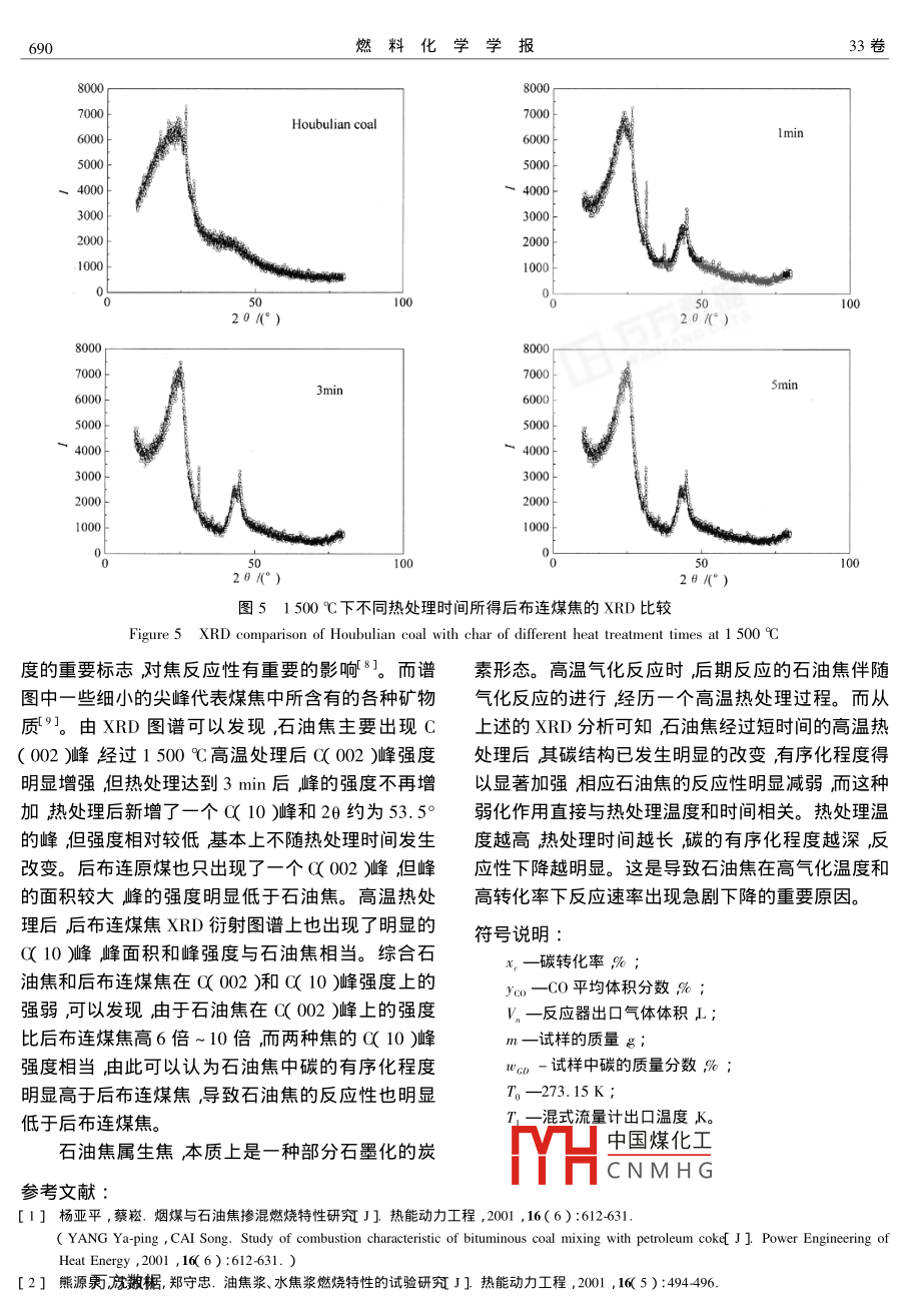 第33卷第6期燃料化學(xué)學(xué)報ol. 33 No 62005年12月Journal of Fuel Chemistry and TechnologyDec.2005文章編號:0253-240200506-0687405石油焦高溫氣化反應(yīng)性唐黎華,陳冬霞,朱學(xué)棟,吳勇強(qiáng),倪燕慧,朱子彬華東理工大學(xué)化學(xué)工藝研究所,上海200237)摘要常壓μ200℃~1500℃在自制管式反應(yīng)器中以二氧化碳為氣化介質(zhì)研究了石油焦以及石油焦與后布連煤焦摻混后形成的混合焦的氣化反應(yīng)性借助于ⅪRD分析了高溫處理后石油焦與煤焦在碳結(jié)構(gòu)有序化方面的區(qū)別。研究結(jié)果表明當(dāng)碳轉(zhuǎn)化率高于0.7氕氣化超過1300℃石油焦的反應(yīng)速率岀現(xiàn)急驟下降氕氣化溫度越高相應(yīng)石油焦速率下降越快?;旌辖箽饣磻?yīng)性既不同于純石油焦也不同于純煤焦。隨石油焦摻入比變化而改變的拐點主要源于石油焦與煤焦的反應(yīng)性之間差異。較高轉(zhuǎn)化率下出現(xiàn)的拐點主要源于石油焦本身隨氣化溫度提高導(dǎo)致氣化速率下降。RD測定顯示高溫處理后石油焦中碳有序化程度要明顯高于煤焦。高氣化溫度下石油焦碳結(jié)構(gòu)發(fā)生明顯有序化是導(dǎo)致其反應(yīng)活性急劇下降的重要原因關(guān)鍵詞:石油焦;高溫氣化;XRD;碳結(jié)構(gòu)中圖分類號:TO051.13T038.2文獻(xiàn)標(biāo)識碼:A中國進(jìn)口的中東原油中硫質(zhì)量分?jǐn)?shù)較高其副表2后布連原煤性質(zhì)產(chǎn)品石油焦含有較高的硫,一般作為動力燃料燃燒Table 2 Properties of Houbulian coal sample時產(chǎn)生的硫氧化物通過添加石灰石解決。但是隨著ate analysis wan /Ultimate analysis wdn /%環(huán)保對大氣污染排放物要求的提高,加之燃燒后產(chǎn)生的大量廢渣難以處理所以尋找更為有效的石油27.4319.1553.4281.003.981.250.3313.44焦處理技術(shù)一直是研究者追求的目標(biāo)。借助高溫氣化爐將石油焦轉(zhuǎn)化成高價值氬、動力和蒸汽同時將原料中98%以上的硫轉(zhuǎn)化成單質(zhì)硫可實現(xiàn)石油焦1.2煤焦制備將后布連煤放在干餾爐內(nèi)加熱干的資源化利用。石油焦作為燃料的研究已有許多報餾用高純氮氣充分置換將氮氣流量調(diào)至20mL導(dǎo)31對石油焦氣化反應(yīng)也進(jìn)行了一定的研min以5℃/min的速率升溫至900℃并在該溫度究461但涉及石油焦以及石油焦與煤焦混合焦在下保持2h在氮氣保護(hù)下降至室溫再將制得的焦高氣化溫度下的反應(yīng)性研究很少。本文以上海煉油樣過篩得到粒徑200μm-280m的焦樣分析數(shù)廠石油焦和后布連( Houbulian)煤焦為對象在據(jù)見表3200℃~1500℃下對石油焦以及石油焦與煤焦混表3后布連煤焦性質(zhì)合焦的氣化特性進(jìn)行了研究。Table 3 Properties of Houbulian char samples1實驗部分Proximate analysis wan / Ultimate analysis war /91.1原料實驗選用上海煉油廠石油焦和后布連煤作為試樣試樣粒徑200μm~280μm。石油焦以3.4321.1575.4293.322.581.100.162.84及煤樣的組成分析分別見表1和表2。表1石油焦性質(zhì)1.3焦氣化反應(yīng)性測定實驗用CO,作氣化劑Table 1 Properties of petroleum coke sam流量控制在0.50L/min~0.60L/min實驗證實該P(yáng)roximate analysis war, / Ultimate analysis war /%條件下已消除內(nèi)、外擴(kuò)散的影響。試樣量約0.2FCC8.780.1891.0491.683.261.722.770.57236hH中國煤化工器是一個長CNMH叵溫區(qū)中心有鉑銠熱by difference電偶測溫加熱爐內(nèi)的加熱元件為硅碳棒。作者簡方雋貨搖0),男,上海人,博士,化學(xué)工藝專業(yè),從事煤氣優(yōu)和固體廢棄物資源化工作。Em1:hang(@ecust.edu.cn688燃料化學(xué)學(xué)報33卷6即得到反應(yīng)速率與碳轉(zhuǎn)化率的關(guān)系。2結(jié)果與討論2.1石油焦的反應(yīng)性圖2是石油焦氣化反應(yīng)的789101113145比較。由圖2(a)可見隨氣化溫度上升石油焦的圖1氣化速率測定裝置示意圖高溫氣化反應(yīng)性也隨之提高;但當(dāng)氣化溫度高于Figure 1 Diagram of testing apparatus of gasification rate1300℃石油焦的轉(zhuǎn)化率與反應(yīng)時間曲線在高轉(zhuǎn)化-CO, cylinder 2-flowmeter : 3-buffer bottle: 4-suIfi率明顯岀現(xiàn)拐點氣化溫度越高拐點岀現(xiàn)的位置越acid washing bottle;5- -dry bottle:6- temperature con-提前。從圖2(b)也可以發(fā)現(xiàn)在碳轉(zhuǎn)化率低于0.7troller:7- porcelain boat:8- lace r9rtoe:10時石油焦的反應(yīng)速率隨氣化溫度提高而上升沮當(dāng)碳轉(zhuǎn)化率高于0.7隨著氣化溫度的提高石油焦的反filter; 14--triple valve 15--chromatographic instrument應(yīng)速率出現(xiàn)了急驟下降溫度越高相應(yīng)石油焦反應(yīng)1.4數(shù)據(jù)處理在反應(yīng)器出囗處每間隔一定時間速率下降越快,下降的位置也越提前。由圖2xc)可取樣通過色譜儀分析其中的CO的體積分?jǐn)?shù)同時見碳轉(zhuǎn)化率分別為0.2和0.5時石油焦反應(yīng)速率由濕式流量計計量碳轉(zhuǎn)化率與對應(yīng)氣化反應(yīng)時間與溫度的關(guān)系與煤焦基本相似即反應(yīng)速率隨溫度的關(guān)系由下式可求得。提高而上升擔(dān)碳轉(zhuǎn)化率0.9時反應(yīng)溫度從1200℃碳轉(zhuǎn)化率x的計算式提高至1300℃反應(yīng)速率單調(diào)上升繼續(xù)提高溫度,yc0△1270反應(yīng)速率則開始呈現(xiàn)單調(diào)下降趨勢。表4是石油焦2mu GD在1200℃~150℃C不同碳轉(zhuǎn)化率下的活化能比較。通過對碳轉(zhuǎn)化率x與氣化時間t的曲線進(jìn)行微由表4可見碳