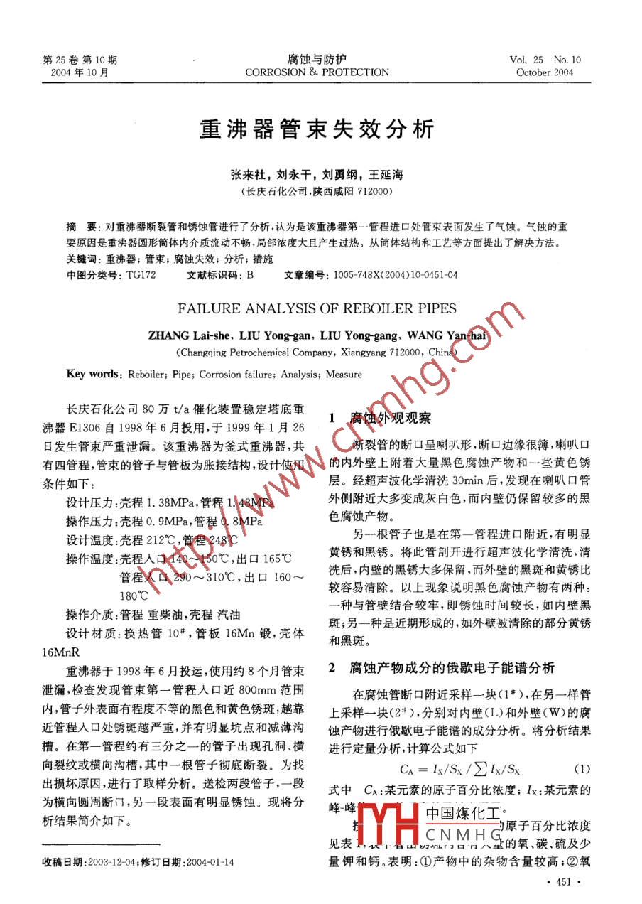 第25卷第10期腐蝕與防護(hù)ol.25No.10004年10月corrosion PROTECTION重沸器管束失效分析張來(lái)社,劉永干,劉勇綱,王延海(長(zhǎng)慶石化公司,陜西咸陽(yáng)712000要:對(duì)重沸器斷裂管和銹蝕管進(jìn)行了分析認(rèn)為是該重沸器第一管程進(jìn)口處管束表面發(fā)生了氣蝕。氣蝕的重因是重沸器圓形筒體內(nèi)介質(zhì)流動(dòng)不暢,局部濃度大且產(chǎn)生過(guò)熱。從筒體結(jié)構(gòu)和工藝等方面提出了解決方法關(guān)鍵詞:重沸器;管束;腐蝕失效;分析;措施中圖分類(lèi)號(hào):TG172文獻(xiàn)標(biāo)識(shí)碼:B文章編號(hào):1005-748X(2004)100451-04FAILURE ANALYSIS OF REBOILER PIPESZHANG Lai-she, LIU Yong-gan, LIU Yong-gang, WANG Yan-hai(Changqing Petrochemical Company, Xiangyang 712000, ChinaKey words: Reboiler; Pipe; Corrosion failure; Analysis; Measure沸器E1306自1998年6月投用,于199年1月261腐蝕外觀觀察日發(fā)生管束嚴(yán)重泄漏。該重沸器為釜式重沸器,共斷裂管的斷口呈喇叭形,斷口邊緣很簿,喇叭口有四管程,管束的管子與管板為脹接結(jié)構(gòu),設(shè)計(jì)使用的內(nèi)外壁上附著大量黑色腐蝕產(chǎn)物和一些黃色銹條件如下:層。經(jīng)超聲波化學(xué)清洗30min后,發(fā)現(xiàn)在喇叭口管設(shè)計(jì)壓力:殼程1.38MPa,管程1.48MP外側(cè)附近大多變成灰白色,而內(nèi)壁仍保留較多的黑操作壓力:殼程0.9MPa,管程0.8MPa色腐蝕產(chǎn)物設(shè)計(jì)溫度:殼程212℃,管程248℃另一根管子也是在第一管程進(jìn)口附近,有明顯操作溫度:殼程入口140~150℃,出口165℃黃銹和黑銹。將此管剖開(kāi)進(jìn)行超聲波化學(xué)清洗,清管程入口290~310℃,出口160洗后,內(nèi)壁的黑銹大多保留,而外壁的黑斑和黃銹比180℃較容易清除。以上現(xiàn)象說(shuō)明黑色腐蝕產(chǎn)物有兩種:操作介質(zhì):管程重柴油殼程汽油一種與管壁結(jié)合較牢,即銹蝕時(shí)間較長(zhǎng),如內(nèi)壁黑斑;另一種是近期形成的,如外壁被清除的部分黃銹設(shè)計(jì)材質(zhì):換熱管10*,管板16Mn鍛,殼體和黑斑。16MnR重沸器于1998年6月投運(yùn)使用約8個(gè)月管束2腐蝕產(chǎn)物成分的俄歇電子能譜分析泄漏,檢查發(fā)現(xiàn)管束第一管程入口近800mm范圍在腐蝕管斷口附近采樣一塊(1),在另一樣管內(nèi)管子外表面有程度不等的黑色和黃色銹斑,越靠上采樣一塊(2#),分別對(duì)內(nèi)壁(L)和外壁(W)的腐近管程人口處銹斑越嚴(yán)重,并有明顯坑點(diǎn)和減薄溝蝕產(chǎn)物進(jìn)行俄歇電子能譜的成分分析。將分析結(jié)果槽。在第一管程約有三分之一的管子出現(xiàn)孔洞、橫進(jìn)行定量分析,計(jì)算公式如下向裂紋或橫向溝槽,其中一根管子徹底斷裂。為找A=lx/S/∑Ix/Sx出損壞原因,進(jìn)行了取樣分析。送檢兩段管子,段式中CA:某元素的原子百分比濃度;Ix:某元素的為橫向圓周斷口,另一段表面有明顯銹蝕?,F(xiàn)將分峰峰析結(jié)果簡(jiǎn)介如下中國(guó)煤化工。的原子百分比濃度見(jiàn)表CNMH的氧、碳硫及少收稿日期:2003-1204;修訂日期:200401-14量鉀和鈣。表明:①產(chǎn)物中的雜物含量較高;②氧張來(lái)社等:重沸器管束失效分析表1銹斑成分的原子百分比濃度(%)編號(hào)OCK1#-L2214371#W30412#-L33136.03.42#W2919.744Sx0.210.50.180.80.80.47和硫含量高。3鋼管的成分組織對(duì)樣管的化學(xué)成分進(jìn)行分析,其結(jié)果見(jiàn)表2。表2管材的化學(xué)成分(%)MnCS0.240.440.0170.0900.032從表中可以看出,成分滿(mǎn)足設(shè)計(jì)要求。對(duì)組織(b)的檢驗(yàn)表明,為鐵素體加少量珠光體,組織正常。斷口附近管壁形貌觀察4.1外壁形貌將斷裂的喇叭口切開(kāi),經(jīng)超聲波化學(xué)清洗后,進(jìn)行宏觀和微觀分析,宏觀發(fā)現(xiàn)在喇叭口的管外壁露出的金屬表面呈灰白色,且表面起伏粗糙,布滿(mǎn)大而淺的蝕坑。用掃描電子顯微鏡對(duì)此表面進(jìn)行低倍觀察,直徑大多在1mm以下,如圖1(a)所示,從圖中還可以看到一條明顯的長(zhǎng)約2mm的表面裂紋。將其中的一個(gè)坑放大,可看到明顯的塑性變形痕跡,如圖1(b)所示,將此進(jìn)行放大,可看到許多小坑和局部脫離的小粒子,其尺寸為微米級(jí),還有大小不一的裂紋,如圖1(c)和1(d)所示。這些特征表明,它是氣蝕所造成。4.2管內(nèi)壁形貌31420斷裂管子的喇叭口內(nèi)壁表面平坦,其上散布點(diǎn)(d)狀蝕坑,圖2(a)和(b)為喇叭口內(nèi)壁的掃描電子顯圖1喇叭形端口附近管外壁的表面掃描電子顯微鏡照片微鏡低倍和高倍照片,其高倍掃描電子顯微鏡照片(a)低倍(b)局部放大(c)和(d)再進(jìn)一步放大如圖2(c)和(d),圖2d的泥紋是腐蝕產(chǎn)物干裂所質(zhì)濃度升高,從而加速腐蝕。因此,第一管程進(jìn)口約致。在喇叭口邊有類(lèi)似外壁的小坑80mm范圍內(nèi)的管子腐蝕與該原因有關(guān)。5損壞原因分析(2)氣蝕在操作中,重柴油在第一管程溫度上第積進(jìn)口處殼體介質(zhì)流動(dòng)不(1)汽油流動(dòng)不暢該重沸器管束出人口端與暫中國(guó)煤化工這種氣蝕是由于局部殼體間有長(zhǎng)約1m的圓形簡(jiǎn)體(見(jiàn)圖3),由于圓形筒CNMHG和所含水分極易汽化,體內(nèi)的汽油流動(dòng)不暢,腐蝕產(chǎn)物容易沉積,使腐蝕介形成大量汽泡汽泡破裂時(shí)對(duì)管壁造成很高的沖擊張來(lái)社等:重沸器管束失效分析重柴油出口汽油入口(a)100圖3重沸器結(jié)構(gòu)示意圖接處所產(chǎn)