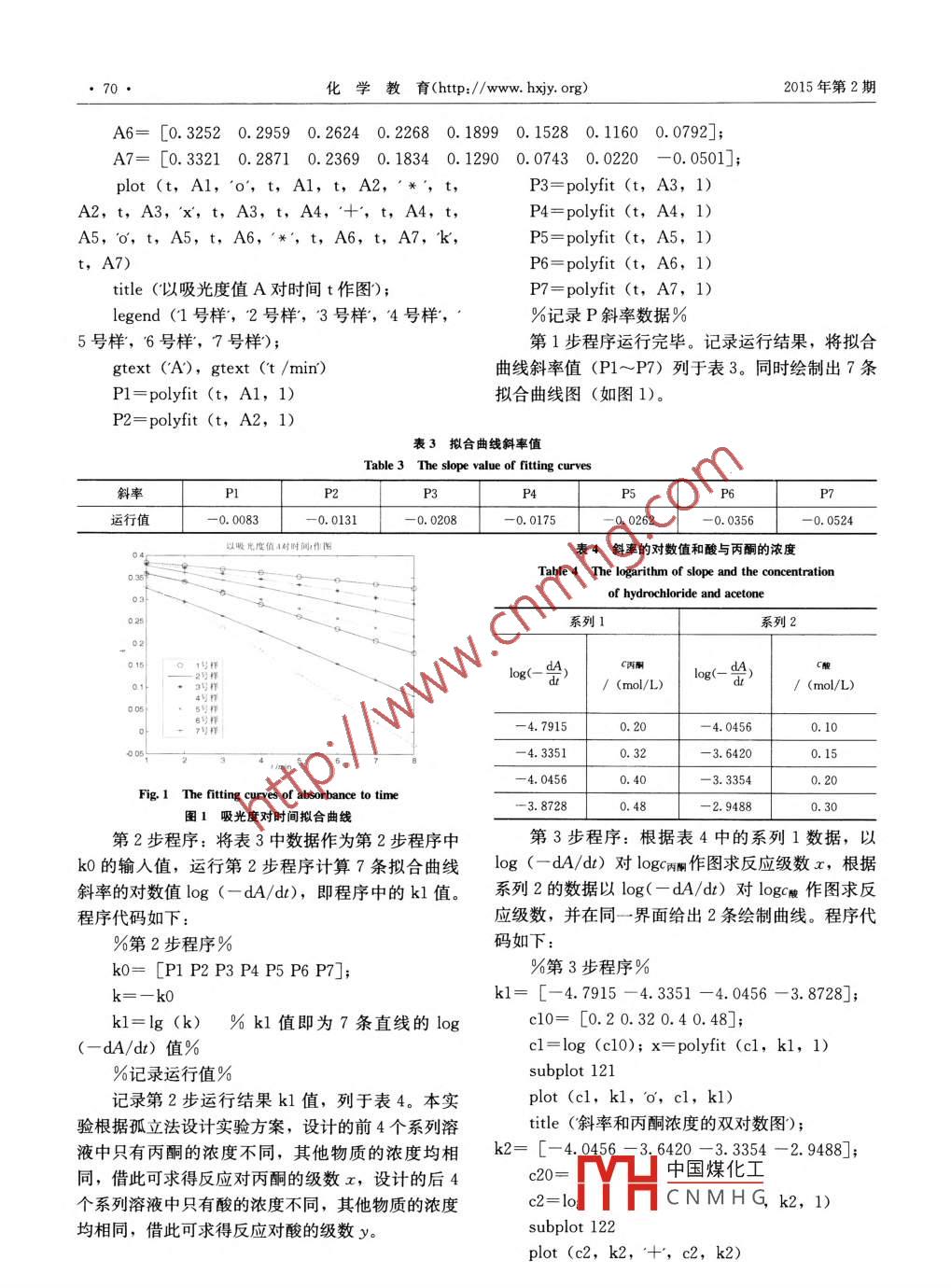 化學(xué)教育(http://www.hxjy.org2015年第2期信息技術(shù)與化學(xué)MATLAB在動(dòng)力學(xué)實(shí)驗(yàn)數(shù)據(jù)處理中的應(yīng)用高錦紅(渭南師范學(xué)院化學(xué)與生命科學(xué)學(xué)院陜西渭南714000摘要將 MATLAB數(shù)學(xué)軟件編寫程序用于物理化學(xué)實(shí)驗(yàn)“丙酮碘化反應(yīng)速率方程”的數(shù)據(jù)處理與繪圖,根據(jù)孤立法設(shè)計(jì)實(shí)驗(yàn)步驟以此推得反應(yīng)級(jí)數(shù),所得結(jié)果準(zhǔn)確度高,避免了傳統(tǒng)數(shù)據(jù)處理方法所帶來(lái)的人為誤差,具有方便、快速與直觀等優(yōu)點(diǎn),可以補(bǔ)充和改進(jìn)物理化學(xué)實(shí)驗(yàn)的教學(xué)。關(guān)鍵詞 MATLAB物理化學(xué)動(dòng)力學(xué)反應(yīng)級(jí)數(shù)實(shí)驗(yàn)數(shù)據(jù)處理DOI:10.13884/1003-3807hxjy.2014040036物理化學(xué)實(shí)驗(yàn)是化學(xué)化工類學(xué)生必修的一門基和H+濃度密切相關(guān)。礎(chǔ)實(shí)驗(yàn)課程,該實(shí)驗(yàn)中數(shù)據(jù)處理量大且計(jì)算煩瑣,假設(shè)上述反應(yīng)的反應(yīng)速率方程為幾乎所有的實(shí)驗(yàn)都離不開(kāi)大量的計(jì)算和繪圖。目前在物理化學(xué)課程的現(xiàn)行教材和教學(xué)中,對(duì)數(shù)據(jù)的處d碘=kc丙cC理大多還是停留在手工處理層面。將數(shù)值軟件用式中x,y,z分別代表丙酮、氫離子和碘的于物理化學(xué)實(shí)驗(yàn)教學(xué)中進(jìn)行復(fù)雜數(shù)值信息的處理成反應(yīng)級(jí)數(shù),將該式取對(duì)數(shù)得為教學(xué)改革與創(chuàng)新的趨勢(shì)。 MATLAB軟件是20世紀(jì)80年代推出的一套高效工程計(jì)算語(yǔ)言,它集lg()=lk+xlg兩+ygc+zlg碘數(shù)值計(jì)算、圖形可視化等功能于一體,允許用戶以在上述3種物質(zhì)中,首先固定其中2種物質(zhì)的數(shù)學(xué)形式的語(yǔ)言編寫程序,易于學(xué)習(xí)和掌握2-7。濃度,配制出濃度不同的一系列第3種物質(zhì)溶液,丙酮碘化反應(yīng)的速率方程”是化學(xué)、化工等這樣反應(yīng)速率只是該物質(zhì)濃度的函數(shù)。以lg(專業(yè)物理化學(xué)中的一個(gè)必做實(shí)驗(yàn),該實(shí)驗(yàn)采用孤立dc碘/dt)對(duì)該組分濃度的對(duì)數(shù)作圖,所得直線的斜法來(lái)推得速率方程,是動(dòng)力學(xué)研究中常用的一種方率即為該物質(zhì)在此反應(yīng)中的反應(yīng)級(jí)數(shù)。同理,可以法。孤立法是設(shè)計(jì)一系列溶液,其中只有某一物質(zhì)得到其他2種物質(zhì)的反應(yīng)級(jí)數(shù)。具體實(shí)驗(yàn)原理參考的濃度不同,而其他物質(zhì)的濃度均相同,借此可求教材第107-108頁(yè)。得反應(yīng)對(duì)該物質(zhì)的級(jí)數(shù),同樣得到各種作用物的級(jí)1.2實(shí)驗(yàn)儀器和試劑數(shù),從而確立速率方程。由于本實(shí)驗(yàn)數(shù)據(jù)處理量?jī)x器:UV-2000紫外分光光度計(jì)(北京萊伯大,學(xué)生在進(jìn)行數(shù)據(jù)處理時(shí)均采用坐標(biāo)紙進(jìn)行手工泰科有限公司);容量瓶(25mL);移液管(5作圖,手工作圖和數(shù)據(jù)計(jì)算不僅費(fèi)時(shí)費(fèi)工,且處理的數(shù)據(jù)不理想。采用 MATLAB軟件編寫程序進(jìn)行mL);碘量瓶(100mL);燒杯(50mL)本實(shí)驗(yàn)的數(shù)據(jù)處理與作圖,所得結(jié)果準(zhǔn)確度高,具試劑:丙酮溶液(2.0mol/L);鹽酸溶液有方便、快速與直觀等優(yōu)點(diǎn)。(2.0mol/L)。1實(shí)驗(yàn)部分實(shí)驗(yàn)步驟及其注意事項(xiàng)1.1實(shí)驗(yàn)原理2.1實(shí)驗(yàn)步驟以丙酮碘化為例,說(shuō)明如何用孤立法和穩(wěn)態(tài)近21.1溶液配制似條件推得速率方程。丙酮鹵化反應(yīng)是一個(gè)復(fù)雜反(1)2.0mol/L丙酮溶液的配制:用25mL移應(yīng),其反應(yīng)式為:液管吸取14.7mL丙酮加人100mL容量瓶中,用CH; COCH3+ X2-CH3 COCH2X+x+H+去離子水稀釋至刻度后轉(zhuǎn)移到100mL碘量瓶中式中X為鹵素。實(shí)驗(yàn)表明反應(yīng)速率幾乎與X備用。H中國(guó)煤化工的種類及其濃度無(wú)關(guān),而與溶液中的CH3COCH3(2)0CNMHG制:準(zhǔn)確稱取渭南師范學(xué)院教育教學(xué)改革研究重點(diǎn)項(xiàng)目(JG201319);渭南師范學(xué)院特色學(xué)科項(xiàng)目(14TSXK04)通信聯(lián)系人, E-mail: gjh@163.cm2015年第2期化學(xué)教育(http://www.hxjy.org0.7133gKIO3于250m燒杯中微熱溶解,加入(2)混合反應(yīng)溶液時(shí)操作必須迅速準(zhǔn)確分析純KI5.5g,加熱溶解;再加入0.41mol/L(3)比色皿的位置不得變化HCl50mL混合后定容于1L容量瓶中。3數(shù)據(jù)處理與實(shí)驗(yàn)結(jié)果(3)鹽酸與碘混合溶液的配制:取7個(gè)25mL本實(shí)驗(yàn)具體實(shí)驗(yàn)步驟可參考教材第109頁(yè)容量瓶編號(hào),按編號(hào)1~7分別加入表1中的溶液。(Ⅳ實(shí)驗(yàn)步驟)。儀器操作實(shí)驗(yàn)中鹽酸、碘與丙酮混合溶液配制如表1所(1)開(kāi)啟紫外分光光度計(jì)進(jìn)行自檢。示。表1中碘、鹽酸和丙酮的濃度依次為0.01(2)待儀器自檢完成后,進(jìn)入光度測(cè)量界面,0.5、2.0mol/L進(jìn)行參數(shù)設(shè)置。表1混合溶液中鹽酸、碘和丙酮的體積(3)設(shè)置好參數(shù)后,將樣品池和參比池都放入Table 1 The volume of hydrochloride, iodine參比液,儀器進(jìn)行校正acetone in mixed solution2.1.3樣品測(cè)量體積v/m樣品序號(hào)在樣品池中放入樣品液,其方法如下: