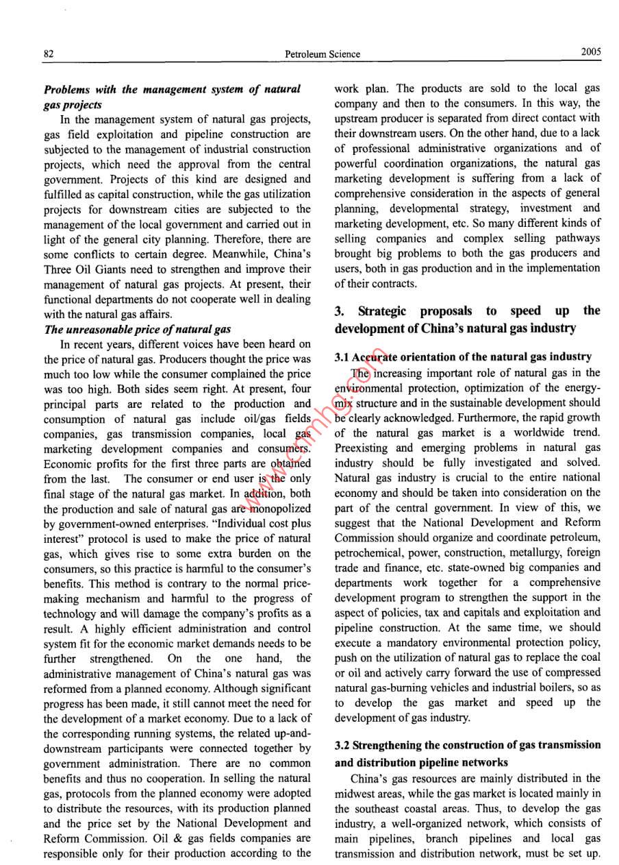 Petroleum ScienceVol.2 No.3Problems and Strategies of China's Natural Gas IndustryLiu Chunxu and Li Hongxun(College of Economic Administration, China University of Petroleum,Dongying, Shandong 257061, China)Reeived April s, 2005Abstract: Although significant progress in China's natural gas industry has been made since the adoption of the“"EighthFive-Year Plan"(from 1991 to 1995), some problems still exist in the aspects of gas resources, exploitation, utilizationand macromanagement, and hinder a further development of the natural gas industry. A series of strategies for solving theproblems was put forward, including accurate orientation of the natural gas industry, strengthening the construction of gastransmission and distribution networks, comprehensive exploitation policies for "integration of up-and downstream”,govermment-supported gas-preferential policies, construction of the gas market frameworks and devoting strong effort tothe new market development.Key words: China, natural gas industry, problem, development, strategyAccording to the current evaluation, 80 percent of1. Introductionthe total natural gas reserves are distributed in Sichuan,Great progress in China's natural gas industry hasOrdos, Xinjiang, Qinghai and other midwest regions asbeen made since 1990.The proved natural gas reserveswell as offishore areas. In addition, 2/3 of thehave increased substantially each year, from 1,000recoverable reserves have been discovered in thesebillion cubic meters in 1990 to 2,600 billion cubicareas (Cheng, et al, 2001). On the other hand, most ofmeters in 2000. During this period, the natural gasthe developed cities are located in east and southeastproduction has increased by about ten percent annually,China. They are suffering from an energy shortage andfrom 15.2 billion to 27.73 billion cubic meters.the environmental pollution, so clean energy like naturalHowever, compared with that of the developedgas is in great demand there. The natural gas fromcountries, China's natural gas industry remainsoffshore areas cannot meet their need for clean energy.Thus,theinconsistency between the resourcebackward in such aspects as prospecting, exploitation,distribution and market demand distribution is obvious.utilization and macromanagement. Through an analysisPoor geographical condition and hostile environmentof the unfavorable factors inhibiting the development ofin natural gas ubundant areathe natural gas industry, this paper will discuss theMost of the natural gas reserves have beenstrategy for a further development of the natural gasdiscovered in poor geographical areas, 84 percent ofindustry.them in deserts (26%), mountains (25%), the Loess2. Problems with China's natural gas industryPlateau (12%) and offshore (21%) areas. Moreover, thegas reservoir beds have some unfavorablecharacteristics like deep burial depth and poor2.1 Profiles of China's natural gas industryAbundance of natural gas reserves and low degree ofpetrophysical properties. About 32.5 percent of theresources are buried 3,500-4,500 meters deep and 24.8its explorationAccording to the statistics from the“Second Nationalpercent are found more than 4,500 meters underground.Oil/gas Resource Evaluation", the total natural gasDeep-layered gas resources are found mainly in Tarim,resources amount to 3,804 billion cubic meters.Junggar, Sichuan and Erdos basins. More than 50Mainland and offshore areas hold 2,990 billion and 814percent of them are deep-buried, low-permeable andbillion respectively (Zeng, et al, 1999), while theultra-low-permeable resources (Zeng, et al, 1999), thuscumulative proved reserves are only 6% of the totalbringing more serious problems to the natural gasresources, which is much lower than the world averageexploitation and increasing the cost of gas production.(42.6%).2.2 Status of the natural gas exploitation anThe regional distribution of natural gas does notutilization in Chinamatch the market demand distributionVol.2 No.3Problems and Strategies for China's Natural Gas Industry81Large reserve-to-production ratio due to low gasenergy consumption (Zeng, et al, 1999). For theproductionworldwide gas consumption mix, the percentages usedAlthough the proved natural gas reserves haveby power plants, by industry, as chemical raw materials,increased significantly since the Eighth Five-Year Planfor cities and commerce are 13%, 34%, 4% and 39%(from 1991 to 1995), the increase of the natural gasrespectively in North America. Gas consurmptionoutput remains slow, partially due to limitations inaccounts for 27.2% in energy consumption structure. Instorage and transportation facilities and downstreamWestern Europe, the numbers are 17%, 24%, 4% andmarketing. Currently, the annual natural gas output is 45% respectively. Gas consumption is 19.2% of theonly about 27 billion cubic meters, namely 20 cubicwhole energy consumption structure (Li, et al, 2001).meters per person. There is a big gap compared with theApparently, compared with the worldwide consumptiondeveloped countries. For example, the annual naturalmixes, the share of natural gas used as chemical rawgas output in England is 1,300 cubic meters per person.materials is relatively huge and unreasonable. TheMeanwhile, residual recoverable reserves of natural gasstructure of gas consumption needs to be optimized soof about 1,000 billion cubic meters have not beenas to increase the ratio of natural gas consumption in theexploited. The reserve-to-production ratio is higher thanenergy consumption structure.70:1 (Li, et al, 2001). Therefore, the potential of naturalGas storage and transmission equipment not wellgas resources, especially proved reserves, is still great.constructedLack of a full understanding of natural gasAffected by the wrong thought that oil is superior toSome relevant officials and urban residents have notnatural gas and due to the insufficient investment inrealized the important role of natural gas in improvingChina's infrastructure, natural gas storage a