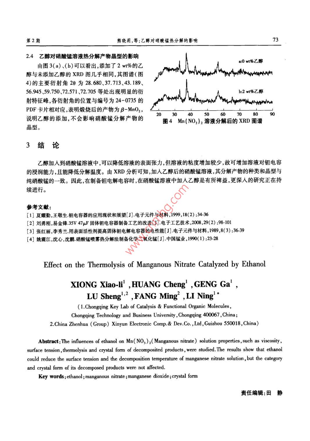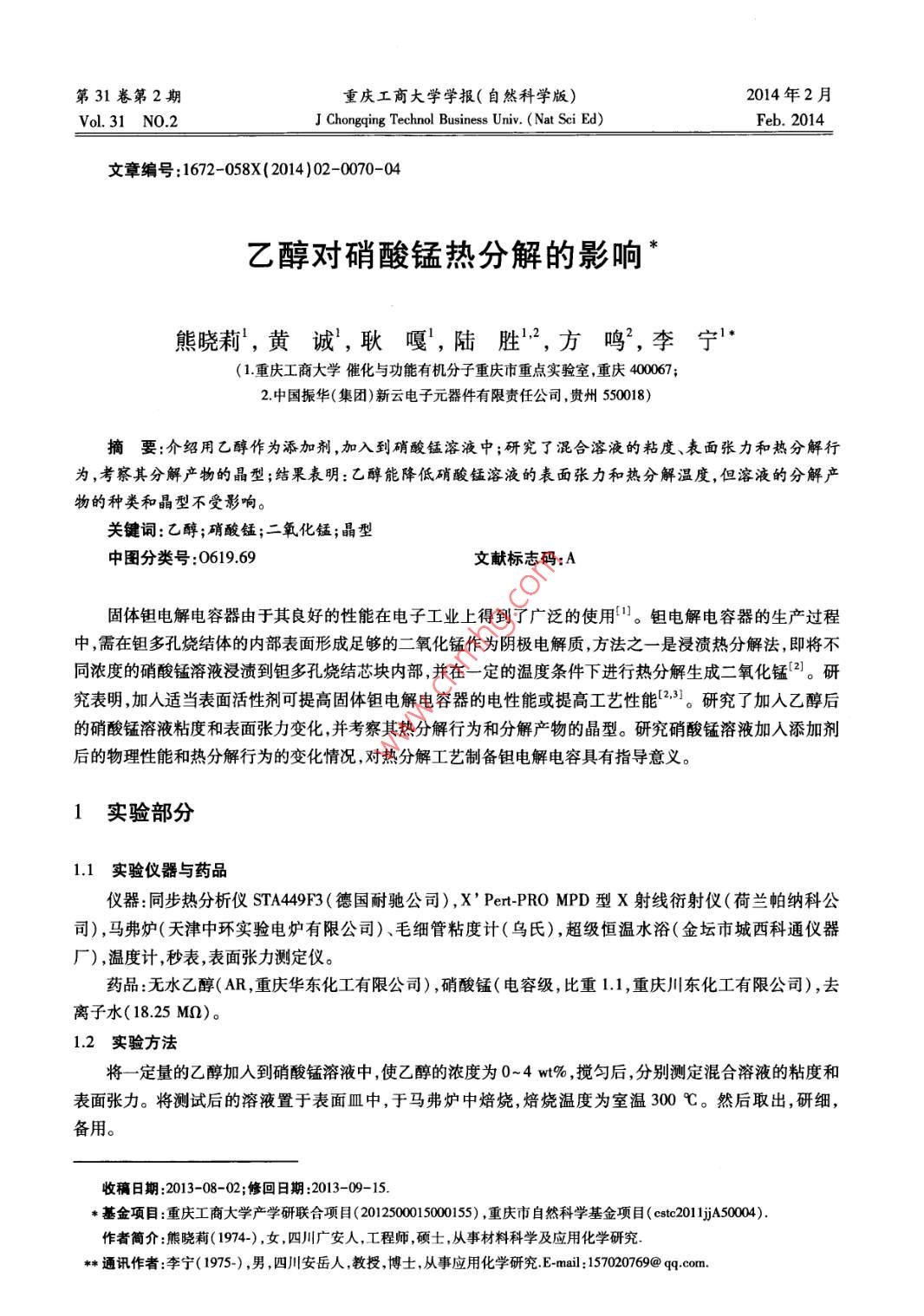 第31卷第2期重慶工商大學學報(自然科學版2014年2月Vol.31N0.2J Chongqing Technol Business Univ. (Nat Sci Ed)Feb.2014文章編號:1672-058X(2014)02-0070-04乙醇對硝酸錳熱分解的影響熊嘵莉,黃誠,耿嘎',陸勝2,方鳴,李寧(1重慶工商大學催化與功能有機分子重慶市重點實驗室,重慶400067;2中國振華(集團)新云電子元器件有限責任公司,貴州550018)摘要:介紹用乙醇作為添加劑,加入到硝酸錳溶液中;研究了混合溶液的粘度、表面張力和熱分解行為,考察其分解產(chǎn)物的晶型;結果表明:乙醇能降低硝酸錳溶液的表面張力和熱分解溫度,但溶液的分解產(chǎn)物的種類和晶型不受影響。關鍵詞:乙醇;硝酸錳;二氧化錳;晶型中圖分類號:061969文獻標志碼:A固體鉭電解電容器由于其良好的性能在電子工業(yè)上得到了廣泛的使用。鉭電解電容器的生產(chǎn)過程中,需在鉭多孔燒結體的內部表面形成足夠的二氧化錳作為陰極電解質,方法之一是浸漬熱分解法,即將不同濃度的硝酸錳溶液浸漬到鉭多孔燒結芯塊內部,并在一定的溫度條件下進行熱分解生成二氧化錳{2。研究表明,加入適當表面活性劑可提高固體鉭電解電容器的電性能或提高工藝性能2,。研究了加入乙醇后的硝酸錳溶液粘度和表面張力變化,并考察其熱分解行為和分解產(chǎn)物的晶型。研究硝酸錳溶液加入添加劑后的物理性能和熱分解行為的變化情況,對熱分解工藝制備鉭電解電容具有指導意義。1實驗部分1.1實驗儀器與藥品儀器:同步熱分析儀STA449F3(德國耐馳公司),X’ Pert-PRO MPD型X射線衍射儀(荷蘭帕納科公司),馬弗爐(天津中環(huán)實驗電爐有限公司)、毛細管粘度計(烏氏),超級恒溫水浴(金壇市城西科通儀器廠),溫度計,秒表,表面張力測定儀。藥品:無水乙醇(AR,重慶華東化工有限公司),硝酸錳(電容級,比重1.1,重慶川東化工有限公司),去離子水(1825Mn)。1.2實驗方法將一定量的乙醇加入到硝酸錳溶液中,使乙醇的濃度為0~4w%,攪勻后,分別測定混合溶液的粘度和表面張力。將測試后的溶液置于表面皿中,于馬弗爐中焙燒,焙燒溫度為室溫300℃。然后取出,研細備用。收稿日期:2013-08-02;修回日期:2013-09-15基金項目:重慶工商大學產(chǎn)學研聯(lián)合項目(2012500015000155),重慶市自然科學基金項目(cstc2011A500作者簡介:熊曉莉(1974-),女,四川廣安人,工程師碩士,從事材料科學及應用化學研究本串通訊作者:李寧(1975-),男,四川安岳人,教授,博士,從事應用化學研究E-mail:157020769@qq.com.第2期熊曉莉,等:乙醇對硝酸錳熱分解的影響711.3測試方法(1)粘度將粘度計垂直固定于超級恒溫水浴中,水浴溫度為設定溫度±0.05℃。分別取不同的待測供試液,用秒表準確記錄液面自測定線a下降至測定線b處的流出時間t(s)。以去離子水為參照,測相應的流出時間t(s),按式(1)計算測試液的粘度。改變測試溶液和測試條件,計算相應條件下的粘度n(cP)。重復測定3次,取平均值。ηo為相應條件的水的粘度(cP)。m=not/to(2)表面張力分別取不同的待測硝酸錳溶液,用最大氣泡法測定溶液的壓差AP值(Pa)。以水為參照測出水的壓差△P0值按式(2)計算待測溶液的表面張力(8,103N/m)。改變測試溶液和測試條件,計算相應條件下的表面張力。重復測定3次取平均值。δ0為相應條件的水的表面張力(6,103N/m)。σ=ao△P/△P0(2)(3)熱性質取3~5mg待測溶液在氬氣保護條件下,以20℃/min的速率從室溫升至400℃(4)X射線衍射:分別取12制得的待測粉末適量測試其X射線衍射。測試條件為28范圍:5-90°,掃描速率為25°/min,管電壓40kV,管電流40mA,Cu靶,ka。2結果與討論21乙醇對硝酸錳溶液粘度的影響將不同比例的無水乙醇分別加入到硝酸錳溶液中,搖勻,在不同溫度下測試添加后溶液粘度的變化,其結果見圖1。從圖1可以看出,隨著乙醇加入量的增加,溶液粘度僅緩慢增加,也就是說,乙醇的加入,對硝酸錳溶液滲透浸入鉭粉間隙的毛細管流動能力不會有明顯的影響。表1不同乙醇添加量對硝酸錳溶液10(比重1.)表面張力的影響5009不同比例擬合曲線相關性標準偏差08=81.6023-0.1833t0.99770.2583048=769158-0.1553t0.99590.29471.08=730195-0.1381t0.99560.27112.08=68.3887-01264t099590.23984.08=629120-0.1104t099570.2151乙醇添加量%圖1添加不同量的乙醇的Mn(NO3)2(比重1.1)溶液的粘度22乙醇對硝酸錳溶液表面張力的影響將不同比例的無水乙醇分別加入到硝酸錳溶液中測試添加后溶液表面張力的變化,其結果見圖2,其變化規(guī)律可用線性回歸的方法進行擬合,擬合結果見表1。從圖2(表1)可以看出,隨著乙醇加人量的增加溶液表面張力不斷降低,同時,溶液溫度越高,其表面張力也緩慢降低。表面張力降低有利于溶液在鉭粉表面鋪展。事實上,溶液在鉭多孔燒結體中的浸潤存在2種形式:一方面,由于鉭粉與液體之間的固液界面張力使液體在鉭粉表面自動鋪展,即鉭粉表面被固液界面所代替。另一方面,鉭粉之間的孔隙形成大量的毛細管通道,液體在凹面附加壓力的驅動下沿間隙自發(fā)產(chǎn)生毛細流動粘度大小會影響其流動情況。這兩種浸潤作用同時存在,且相互影響。重慶工商大學學報(自然科學版)第31卷1.1硝酸錳溶液0%乙→04%乙蔚628401%乙I→2%乙圖2不同乙醇添加量對Mn(NO3)2溶液表面張力的影響23乙醇對硝酸錳溶液熱分解的影響從圖3可以看出,對Mn(NO3)2溶液的分解是分步進行的。研究表明,Mn(NO3)2熱分解大致分為脫出結合水生成堿式硝酸錳、生成MnO2等幾個階段。添加2w%乙醇后,使Mn(NO2)2的熱分