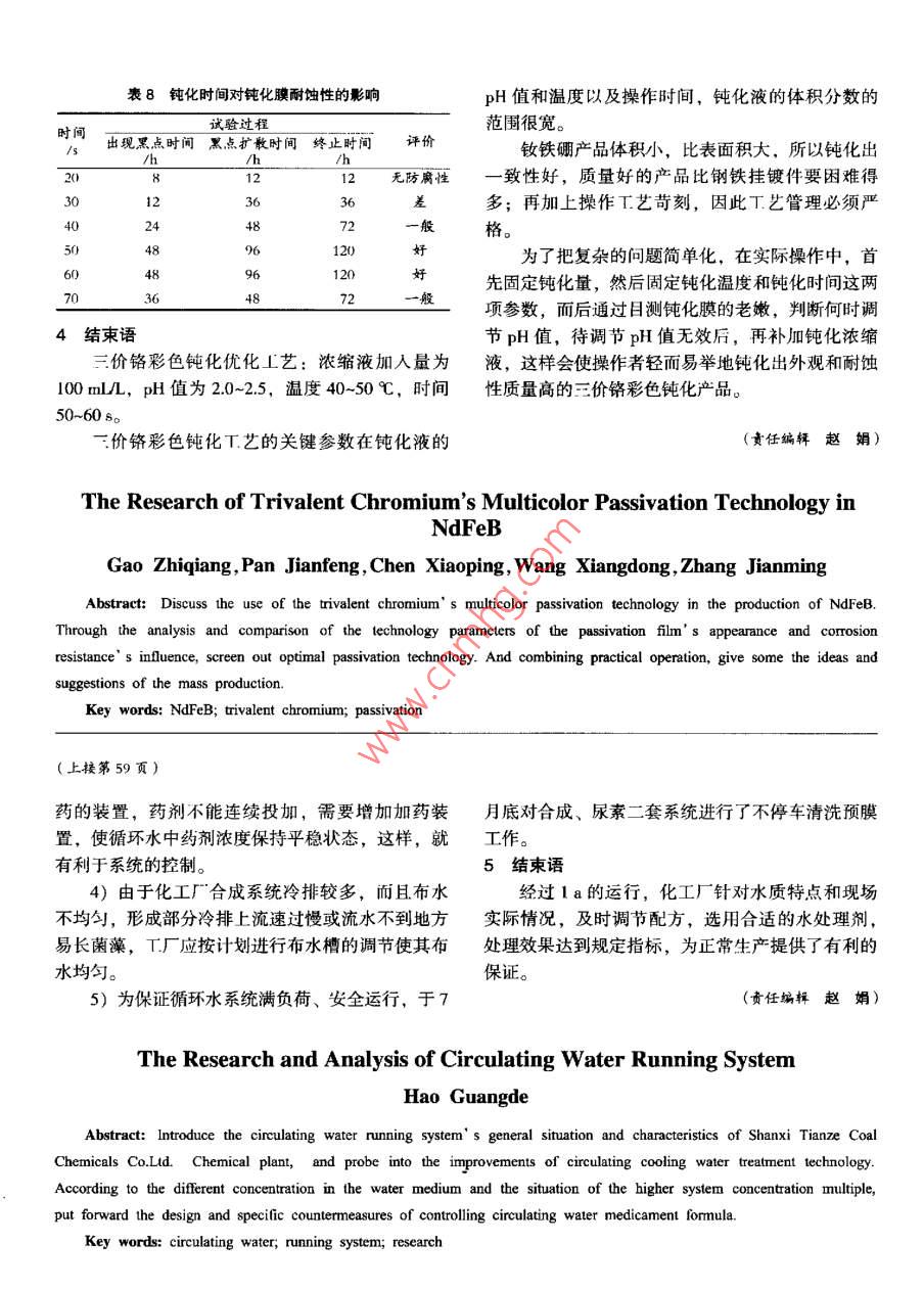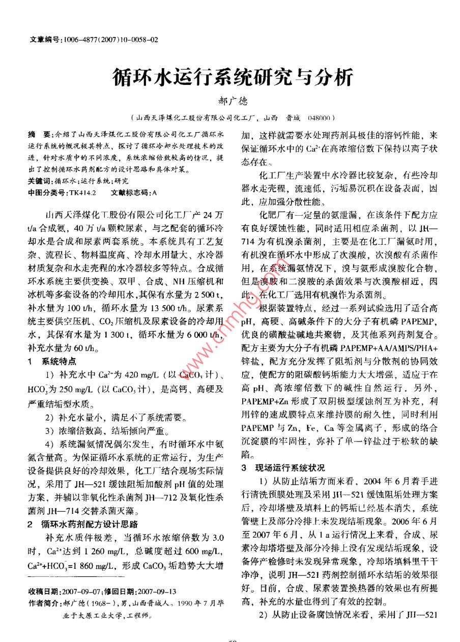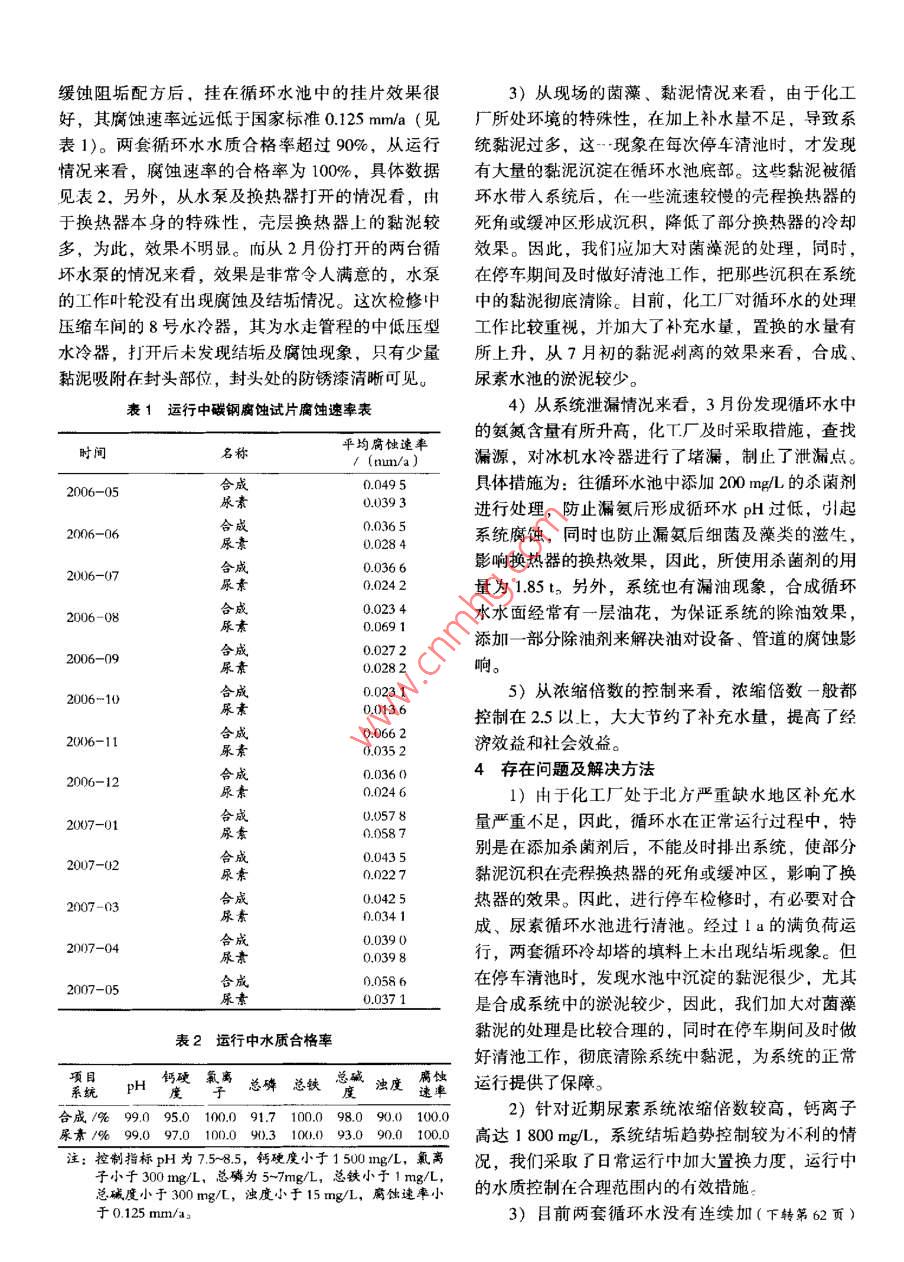 文章編號:1006-4877(2007)10-0058-02循環(huán)水運(yùn)行系統(tǒng)研究與分析郝廣德〔山西天澤煤化工股份有限公司化工廠,山西晉城(48m)摘要:介紹了山西夭澤煤化工股份有公司化工廠循環(huán)水加,這樣就需要水處理藥劑具極佳的溶鈣性能,來運(yùn)行系統(tǒng)的概況極其特點(diǎn),探討了循環(huán)冷卻水處理技末的改保證循環(huán)水中的Ca2在高濃縮倍數(shù)下保持以離子狀進(jìn),針對水質(zhì)中的不同濃度,系統(tǒng)濃縮倍救較高的情況,提態(tài)存在出了控制循環(huán)水藥劑配方的設(shè)計(jì)思路和具體對策。關(guān)鍵詞:循環(huán)水;運(yùn)行系統(tǒng);研究化工廠生產(chǎn)裝置中水冷器比較復(fù)雜,有些冷卻中圖分類號:TK4142文獻(xiàn)標(biāo)志碼:A器水走殼程,流速低,污垢易沉積在設(shè)備表面,因此,應(yīng)加強(qiáng)分散性能山西天澤煤化T股份有限公可化工廠產(chǎn)24萬化肥廠有一定量的氨泄漏,在該條件下配方應(yīng)ua合成氨,40萬ⅶa顆粒尿素,與之配套的循環(huán)冷有良好緩蝕性能,同時(shí)適用相應(yīng)殺菌劑,以H卻水是合成和尿素兩套系統(tǒng)。本系統(tǒng)具有工藝復(fù)714為有機(jī)溴殺菌劑,主要是在化工廠漏氨時(shí)用,雜、流程長、物料溫度高、冷卻水用量大、水冷器有機(jī)溴在循環(huán)水中形成了次溴酸,次溴酸有殺菌作材質(zhì)復(fù)雜和水走殼程的水冷器較多等特點(diǎn)。合成循用,在系統(tǒng)漏氨情況下,溴與氨形成溴胺化合物環(huán)水系統(tǒng)主要供變換、雙甲、合成、NH壓縮機(jī)和但是溴胺和二溴胺的殺菌效果與次溴酸相近,因冰機(jī)等多套設(shè)備的冷卻用水,其保有水量為2500t,此,在化工廠選用有機(jī)溴作為殺菌劑。補(bǔ)水量為100th,循環(huán)水量為13500th。尿素系根據(jù)裝置特點(diǎn),經(jīng)過一系列試驗(yàn)選用了適合高統(tǒng)主要供空壓機(jī)、CO2壓縮機(jī)及尿素設(shè)備的冷卻用pH,高硬、高堿條件下的大分子有機(jī)磷 PAPEMP水,其保有水量為1300,循環(huán)水量為6000ih,優(yōu)良的磺酸鹽堿地共聚物,及其他系列藥劑復(fù)合。補(bǔ)充水量為60h配方主要為大分子有機(jī)磷 PAPEMP+ AAAMIS/PHA1系統(tǒng)特點(diǎn)鋅鹽,配方充分發(fā)揮了阻垢劑與分散劑的協(xié)同效1)補(bǔ)充水中Ca為420mgL(以CaC計(jì))、應(yīng),使配方的阻碳酸鈣垢能力大大增強(qiáng),適應(yīng)于在HCO3為250mg(以CaCO3計(jì)),是高鈣、高硬及高pH、高濃縮倍數(shù)下的堿性自然運(yùn)行.另外嚴(yán)重結(jié)垢型水質(zhì)。PAPEMP+Zn形成了雙陰極型緩蝕劑互為補(bǔ)充,利2)補(bǔ)允水量小,滿足不了系統(tǒng)需要。用鋅的速成膜特點(diǎn)來維持膜的耐久性,同時(shí)利用3)濃縮倍數(shù)高,結(jié)垢傾向嚴(yán)重。PAPEMP與zn,e,Ca等金屬離子,形成的絡(luò)合4)系統(tǒng)漏氨情況偶爾發(fā)生,有時(shí)循環(huán)水中氨沉淀膜的本固性,彌補(bǔ)了單一鋅鹽過于松軟的缺氮含量高。為保證循環(huán)水系統(tǒng)的正常運(yùn)行,為生產(chǎn)陷。設(shè)備提供良好的冷卻效果,化工廠結(jié)合現(xiàn)場實(shí)際情3現(xiàn)場運(yùn)行系統(tǒng)狀況況,釆用了JH-521緩蝕阻垢加酸劑pH值的處理1)從防止結(jié)垢方面來看,2004年6月著手進(jìn)方案,并輔以非氧化性殺菌劑J712及氧化性殺行清洗預(yù)膜處理及采用J1-521緩蝕阻垢處理方案菌劑JH-714交替殺菌滅藻后,冷卻塔壁及填料上的鈣垢已經(jīng)基本消失,系統(tǒng)2循環(huán)水藥劑配方設(shè)計(jì)思路管壁上及部分冷排上未發(fā)現(xiàn)結(jié)垢現(xiàn)象。2006年6月補(bǔ)充水質(zhì)件極差,當(dāng)循環(huán)水濃縮倍數(shù)為30至2007年6月,從1a運(yùn)行情況上來看,合成、尿時(shí),Ca達(dá)到1260mg1,總堿度超過600mgn,素冷卻塔塔壁及部分冷排上沒有發(fā)現(xiàn)結(jié)垢現(xiàn)象,設(shè)Cx2+HCO3=1860mg,形成CaCO3垢趨勢大大增備停產(chǎn)檢修時(shí)未發(fā)現(xiàn)異常現(xiàn)象,冷卻塔填料里干干凈凈,說明JH-521藥劑控制循環(huán)水結(jié)垢的效果很收稿日期:2007-09-07;修回日期:2007-09-13好。目前,合成、尿素裝置換熱器的效果也有所提作者簡介:郝廣他(1968-),男,山西晉城人,199年7月畢高,補(bǔ)充的水量也得到了有效的控制。業(yè)于太原工業(yè)大學(xué),工程師2)從防止設(shè)備腐蝕情況來看,采用了J-521緩蝕阻垢配方后,掛在循環(huán)水池中的掛片效果很3)從現(xiàn)場的菌藻、黏泥情況來看,由于化工好,其腐蝕速率遠(yuǎn)遠(yuǎn)低于國家標(biāo)準(zhǔn)0.125mma(見廠所處環(huán)境的特殊性,在加上補(bǔ)水量不足,導(dǎo)致系表1)。兩套循環(huán)水水質(zhì)合格率超過90%,從運(yùn)行統(tǒng)黏泥過多,這…現(xiàn)象在每次停車清池時(shí),才發(fā)現(xiàn)情況來看,腐蝕速率的合格率為100%,具體數(shù)據(jù)有大量的黏泥沉淀在循環(huán)水池底部。這些黏泥被循見表2,另外,從水泵及換熱器打開的情況看,由環(huán)水帶入系統(tǒng)后,在一些流速較慢的殼程換熱器的于換熱器本身的特殊性,殼層換熱器上的黏泥較死角或緩沖區(qū)形成沉積,降低了部分換熱器的冷卻多,為此,效果不眀顯。而從2月份打開的兩臺循效果。因此,我們應(yīng)加大對菌藻泥的處理,同時(shí)壞水泵的情況來看,效果是非常令人滿意的,水泵在停車期間及時(shí)做好清池工作,把那些沉積在系統(tǒng)的工作葉輪沒有出