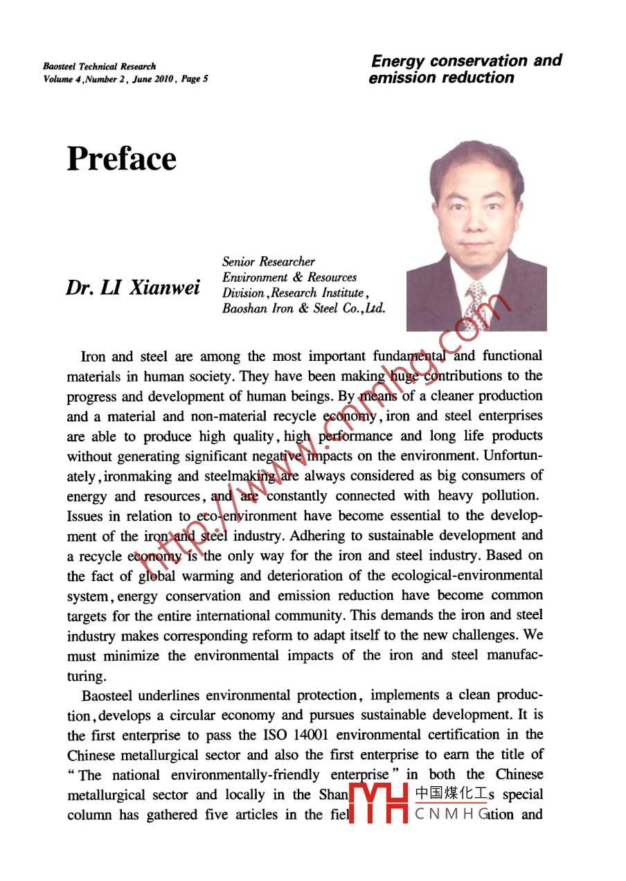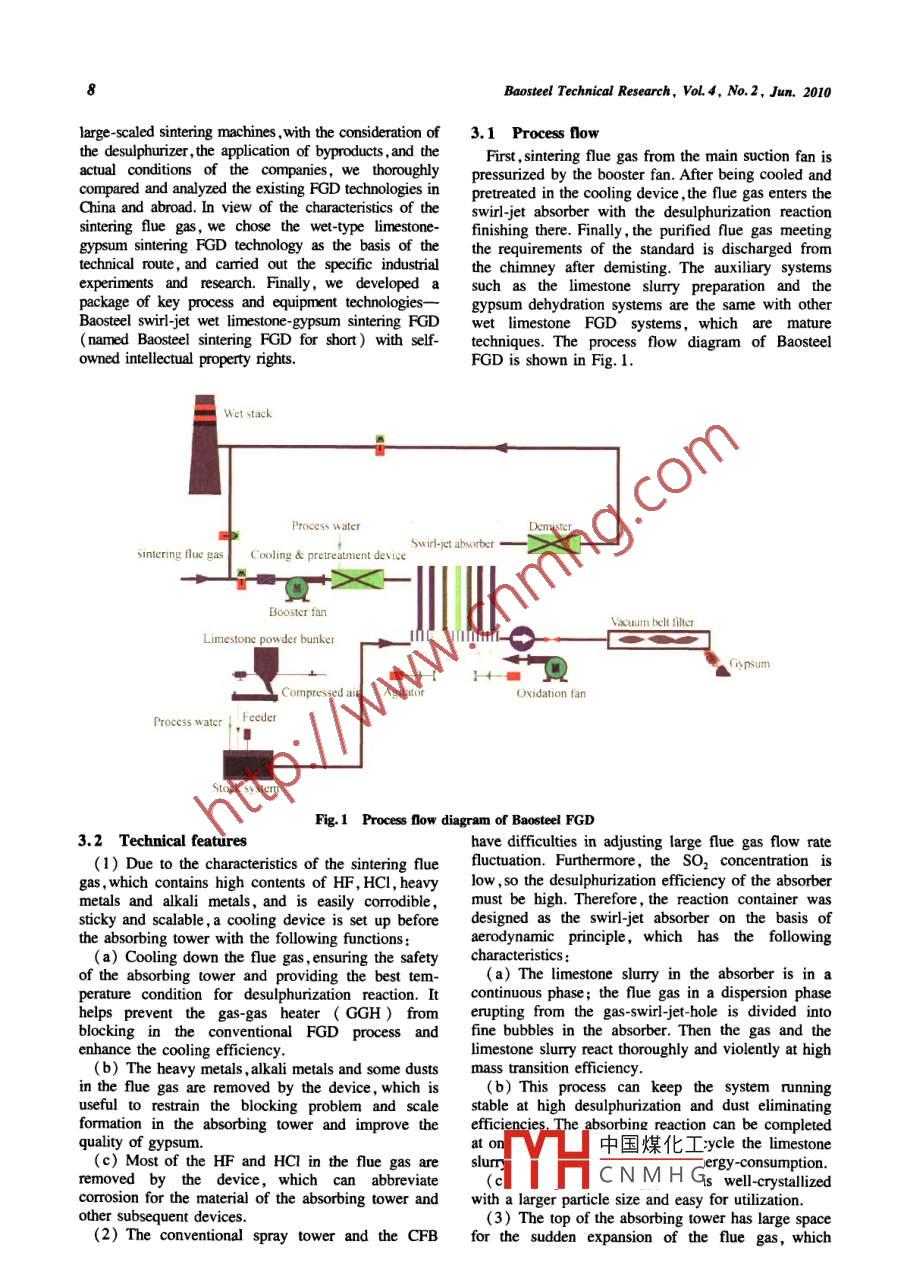Baosteel Technical ResearchEnergy conservation andvolume 4. Number 2, June 2010, Page 5emission reductionrefaceSenior researcherDr. Ll Xianwei Division. Research InstituteBaoshan Iron Steel Co.Ltd.e ron and steel are among the most important fundamental and functionalnaterials in human society. They have been making huge contributions to theprogress and development of human beings. By means of a cleaner productionand a material and non-material recycle economy, iron and steel enterprisesare able to produce high quality, high performance and long life productswithout generating significant negative impacts on the environment. Unfortunately, ironmaking and steelmaking are always considered as big consumers ofenergy and resources, and are constantly connected with heavy pollutionIssues in relation to eco-environment have become essential to the develoment of the iron and steel industry. Adhering to sustainable development anda recycle economy is the only way for the iron and steel industry. Based onthe fact of global warming and deterioration of the ecological-environmentalsystem, energy conservation and emission reduction have become commontargets for the entire international community. This demands the iron and steelindustry makes corresponding reform to adapt itself to the new challenges. Wemust minimize the environmental impacts of the iron and steel manufac-turingBaosteel underlines environmental protection, implements a clean produc-tion, develops a circular economy and pursues sustainable development. It isenterprise to pass the Iso 14001 environmental certification in theChinese metallurgical sector and also the first enterprise to earn the title ofThe national environmentally-friendly enterprise in both the Chinesemetallurgical sector and locally in the shan凵中國煤化工 s specialcolumn has gathered five articles in the fielCN MH Tion andemission reduction. All these articles present Baosteels latest researdy2010Baosteel Technical Research, Vol. 4, No. 2. Jun.development and practice in the fields of energy conservation and emissionreduction. Among them, two articles present the development and applicationsof the Baosteel sintering flue gas desulphurization(FGD)technology and theexperimental study of using the sintering FGD byproduct gypsum as a cementretarder. One article describes the two-stage treatment process developed forthe stainless steel cold-rolled product pickling wastewater, and one refers tothe energy conservation and applications of the waste heat recovery system inannealing furnaces. Based on a large number of dioxin analysis practices, thequick qualitative analysis method of polychlorinated dibenzo-dioxins andfurans( PCDD/Fs) for samples from the iron ore sintering process wasproposed and discussed in another article. These articles provide a glimpse ofthe efforts made by Baosteel in the fields of energy conservation and emissionreductionI would hereby like to express my great appreciation to the editors of thespecial column and the authors for their diligence and contributions. Letmake joint efforts and build a greener and world-class baosteel中國煤化工CNMHGBaosteel Technical Researchlume 4, Number 2, June 2010, Page 7Development and applications of Baosteel sinteringflue gas desulphurization technologySHEN Xiaolin, uU Daoging, LIN Yu, SHI Lei and WANG RuyiEnvironment Resources Division, Research Institute, Baoshan Iron Steel Co, Ltd Shanghai 201900, ChinaAbstract: The research background and technical features of Baosteel sintering flue gas desulphurization( FGD)-swirl-jet-absorbing wet limestone-gypsum sintering FGD technology, process and equipment are introduced in this paper Maincontents and achievements of the pilot experiment and the engineering practice of Baosteel FGD are analyzed anddiscussed systematically. Past engineering practice experiences indicate that Baosteel FGD has the following merits: wideapplicability to sintering flue gas features, such as frequently changing temperatures, unstable SO, concentration, intensivelyfluctuating flow rates, etc., high pollutants removal efficiency, low investment and energy consumption; stable and reliableKey words: sintering flue gas; desulphurization technology; engineering practicedoi:10.3969/j.issn.1674-3458.2010.02.0022 Main characteristics of sintering flue gas1 ntroductionThe characteristics of sintering flue gas, which areIn recent yearsofradically different from those of the coal-fired flue gasChina keeps increasing year by year, and the iron and from power plants, are mainly summarized as followssteel works have been one of the main sources of so,(1)The flow rate of the flue gas fluctuates violentlyemission, where SO, emitted from the sintering process (0. 5 to 1.5 times of the designed value)accounts for more than 60% of the total(2)The SO, concentration in the flue gaemission of the entire iron and steel industrygreatly. The SO, concentration responds to thefore, sintering flue gas desulphurization( FGD has in the mineral sulphur content, which are 300been the key issue to control SO, emission in China. 2000 mg/Nm in most cases, with the maximum beingDue to the complicacy ofthe agglomerating and over 7000 mg/Nm, and the minimum belowsintering process, the technology of FGD used in power 300 mg/Nmplants cannot be directly or simply applied to sintering(3) The flue gas temperature varies greatly, which isFGD. The FGD technologies used in the iron and steelnormally 80-160C, with the maximum being 180Cindustry of developed countries are either too expensive(4)The main components of sintering dust areto be accepted by the Chinese companies, such asminerals and their oxides, of which Fe,O, accounts foractivated carbon adsorption, ammonia-ammonium over 40%, with heavy metals, alkali metals, etc, andsulphate, etc, or their byproducts are not comprehen- the micron or sub-micron particles amount for oversively utilizable, such as maximized emission reduction 60%of sintering( MEROS ) circulating fluidi