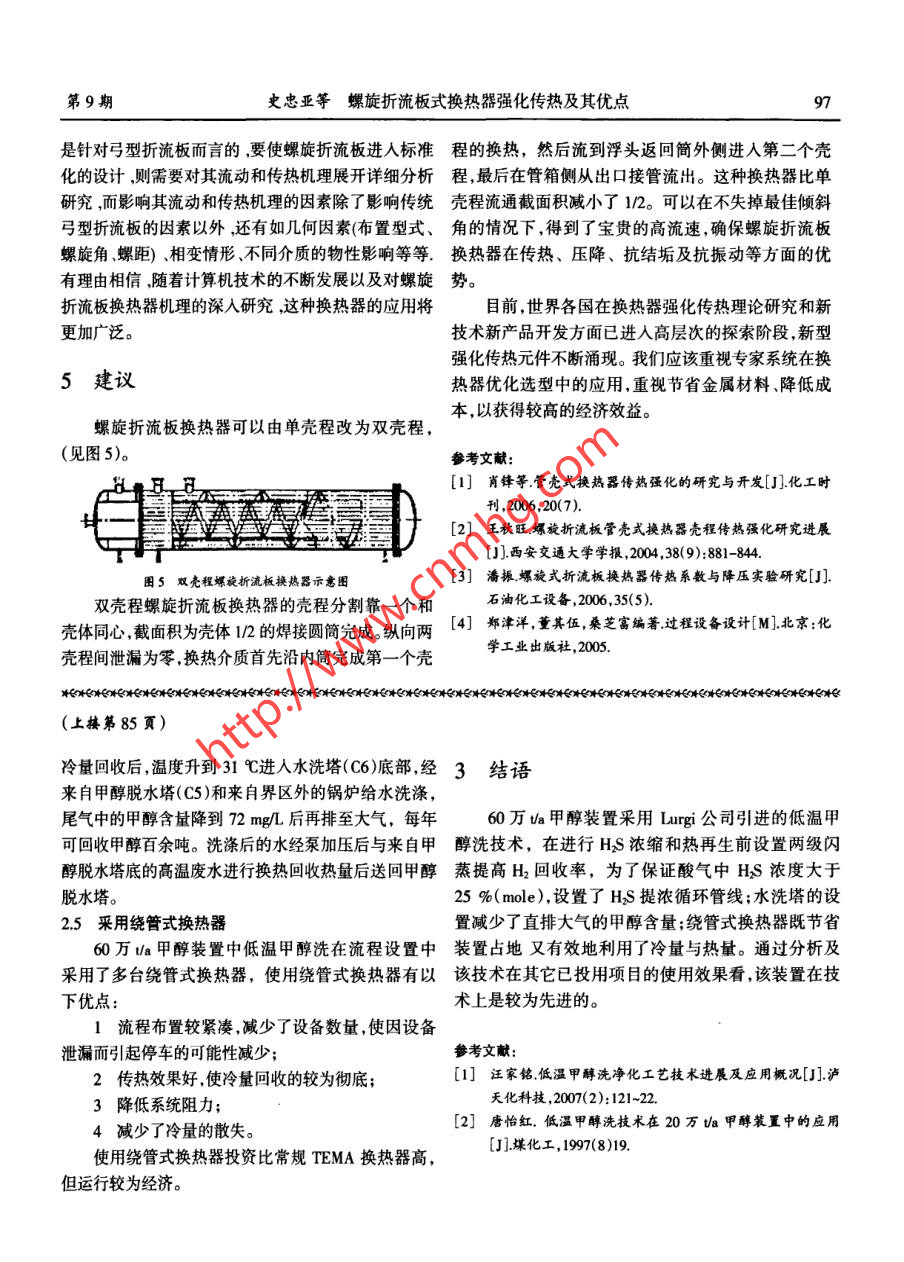 第28卷第9期石油化工應用Vol.28 No.92009年12月PETROCHEMICAL INDUSTRY APPLICATIONDec. 2009石化工藝與設備低溫甲醇洗技術在60萬噸/年甲醇裝置中的應用馮澎波.(神華寧煤集團煤炭化學工業(yè)分公司二甲醚項目籌建處,寧夏靈式751400)摘要:介紹了神華寧煤集團 83萬la二甲醚項目一期工程甲醇裝置配套的低溫甲醇洗工藝流程,分析了該工藝設計特點,總結了該工藝在設計上的先進性,并提出實施過程中存在和應注意的問題。關鍵詞:低溫甲醇洗;凈化;HS;CO2中圖分類號:TQ223.121文獻標識碼:A文章編號: 1673- -5285( 2009 )09- -0084 -03神華寧煤集團83萬ua二甲醚項目-期T.程以寧1 60 萬t/a甲醇裝置中低溫甲醇洗工藝東磁二礦、羊場灣礦煤為原料,由對置式多噴嘴氣化裝流程置制得原料氣,經中溫部分變換,低溫甲醇洗工藝脫硫脫碳,要求出工序的總硫≤0.1 mg/L.CO2≤3 % ,凈化來自CO耐硫變換工序的變換氣用鍋爐給水洗滌氣經聯(lián)合壓縮機加壓進人合成塔得到粗甲醇。為了給除氨后, 在供氣冷卻器(EIA) 中被來自甲醇洗滌塔下一工序提供合格的凈化氣,必須對合成氣中的CO2、(C1)的低溫凈化氣冷卻到 -20 C,為了防止變換氣中HS.COS等酸性氣體進行脫除。氣體凈化的指標直接水分 在低溫下冷卻結冰,在預冷前需噴人少量甲醇,然影響到甲醇的產量及合成觸媒的使用壽命,因此做好后經變換 氣/甲醇水分離器( DI )分離出甲醇和水,變換氣體凈化十分重要。氣從甲醇洗滌塔(C1) 底進人,依次脫除HS +COS、以脫除CO2為主要任務的酸性氣脫除方法有溶CO2。 送下一工序變壓吸附(PSA)的凈化氣中CO2含量液物理吸收、溶液化學吸收、低溫蒸餾和吸附4大約為 2 %,HS +COS<0.1 mg/L。 .類。前兩種方法應用最為普遍,溶液物理吸收法有低從甲醇貯槽(D5)來的貧甲醇在貧甲醇深冷器溫甲醇洗( Rectisol)法、聚乙二醇二甲醚(NHD)法、(E13)中 被冷卻到-36 C,并在貧甲醇冷卻器( E8)中被碳酸丙烯酯法,主要用于壓力較高的場合,化學吸收來 自HS濃縮塔(C2 )的富冷甲醇進-步冷卻到-50 C,方法有熱鉀堿法、N-甲基二乙醇胺( MDEA)法,主要從甲 醇洗滌塔(C1 )頂進人,甲醇洗滌塔上段為CO2吸用于壓力相對較低的場合。溶液物理吸收法中以低收段, 甲醇液自上而下與變換氣逆流接觸,脫除氣體中溫甲醇洗法能耗最低,可以在脫除CO2的同時完成CO2。從甲醇洗滌塔下段和底部引出的富CO2和富精脫硫。低溫甲醇洗是由德國林德( Linde)公司和魯HS.COS 甲醇液分別被冷卻減壓,進入閃蒸分離器奇(Lurgi)公司研究開發(fā)的,使用冷甲醇作為酸性氣(D3)進行減壓閃蒸,閃蒸氣從閃蒸分離器II(D4)輸吸收液,利用甲醇在-60 C左右的低溫下對酸性氣出 ,經循環(huán)氣壓縮機(K1 )壓縮后再進入系統(tǒng)。體的溶解度極大的物理特性,在同-塔內分段選擇從閃蒸分離器底部出來的閃蒸液經減壓后送往性的進行脫硫和脫碳。少量的脫碳富液脫硫,不僅簡HS濃縮塔(C2)通過低壓N2降低氣相中CO2的分壓,化了流程且容易得到高濃度的H$組分,并可用克上部不含硫的閃蒸液洗滌該塔下部溶液中閃蒸出的勞斯法回收硫。H2S和Cos。從HS濃縮塔中部引出的回收冷量甲醇*收稿日期:2009-09- -22第9期馮澎波低溫甲 醇洗技術在60萬噸/年甲醇裝置中的應用85進入下部被來自氣提塔(C3)的含N2尾氣和來自管網(wǎng)器(E12) 提供的熱量徹底再生,熱再生塔底部出來的的低壓氮氣氣提,塔底部經加壓過濾后的粗甲醇回收甲 醇水溶液一部分被送往甲醇貯槽(D5)被低溫甲醇冷量后送氣提塔(C3 )被塔底氮氣氣提。洗裝置循環(huán)使用;另- -部分送人甲醇脫水塔(C5 )進行富含HS.COS的甲醇經N2氣提、加壓、回收冷量精餾,熱源由甲醇/水分離塔再沸器(E14)提供,甲醇脫升溫至近80 C進熱再生塔(C4)。熱再生塔頂含HS水塔底出來的甲醇含 量小于0.03 %( wt)的廢水經冷卻氣體在濃度沒有達到進硫磺回收裝置要求的濃度前,后送污水處理 系統(tǒng)。通過循環(huán)管線繼續(xù)回到硫化氫濃縮塔濃縮,濃度達到60萬Ua甲醇裝置中低溫甲醇洗工藝原則流程(見進硫磺回收裝置的要求后引出。甲醇被熱再生塔再沸圖1)。HS'(體本概確問收E8"BhK13團一品9E19CI:甲鴨洗海塔C5:中醇版術塔C2: H.s膿蟾塔C6:水洗塔C3:氣提塔C7:洗慷塔鋼妒給水座水C4:熱再生塔圍1低溫甲醇洗工藝原則流程圍2工藝流程設置特點分析表1甲醇蒸汽壓表溫度/C-54.5 -44. -25.3 -16.2 -6.0 -5.0 -21.2 -34.82.1甲醇對 CO2的吸收具有高選擇性,合成氣凈化度高-64.7甲醇屬于極性分子,它對酸性氣體的溶解度大,而、甲醇蒸汽壓對H、N2等非極性分子的溶解度小。壓力越高、溫度越AkPa101.30.05 0.133 0.667 1.33 2.67 5.33 13.3 26.7低,CO2和HS在甲醇中的溶解度越大,而H2、N2.CO出甲醇洗滌塔(Cl )氣相物流溫度為- 43 C,出HsS在甲醇中的溶解度隨著溫度的降低而降低。據(jù)Lurgi工濃縮塔(C2 )氣相物流溫度為-59 C,由于甲醇在低溫藝包數(shù)據(jù),當溫度從0降到-45 C時,H2在甲醇中的下具有 較低的蒸汽壓,故帶走的甲醇蒸汽很少。甲醇粘溶解降低30 %,當壓力一定時, -50 C甲醇與0 C相比,度 低故動力消耗和運轉費用很低。其對HS的溶解度提高8倍。60 萬U/a甲醇裝置中低2.3 提高去硫回收裝置尾氣中HS濃度溫甲醇洗工序在3.3 MPa壓力下,用-50 C及-20 C進低溫甲醇洗裝置的HS摩爾含量為0.075 %,為甲醇吸收CO2及HS,使凈化氣中CO2及HS穩(wěn)定地了保證去硫磺回收裝置尾氣中HS摩爾含量在25%以小于0.1 mg/L,CO2摩爾含量在2 %左右。而溶解在甲上,工藝物流在 進入HS濃