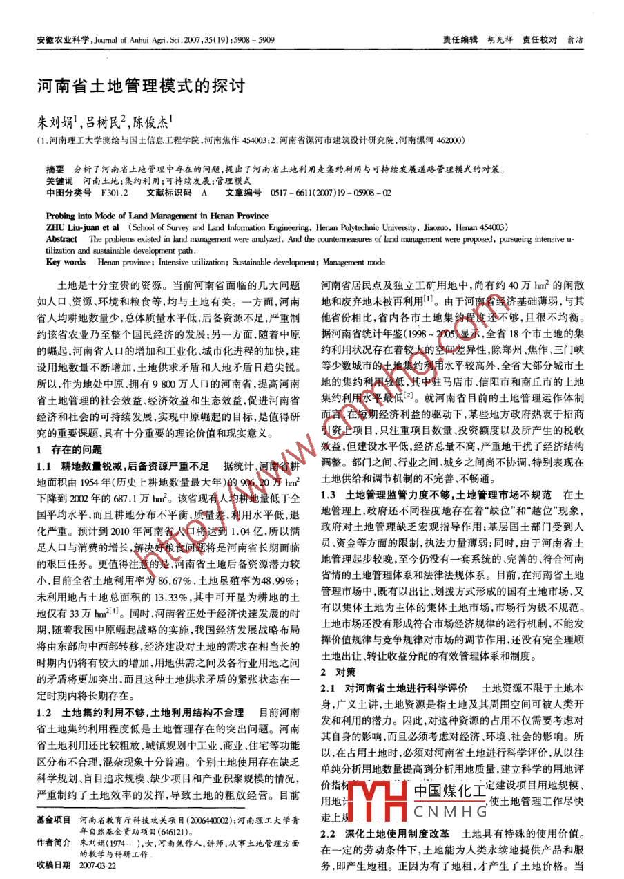 安徽農(nóng)業(yè)科學(xué),Joumal of Anhui Agi. Sei.2007 ,35<(19):5908 - 5909責(zé)任編輯胡先祥責(zé)任校對(duì)俞潔河南省土地管理模式的探討朱劉娟',呂樹民”,陳俊杰!(1.河南理工大學(xué)測(cè)繪與國(guó)土信息工程學(xué)院.河南焦作454003;2.河南省漯河市建筑設(shè)計(jì)研究院河南漯河462000)摘要分析了河南省土地管理中存在的問題 ,提出了河南省土地利用走集約利用與可持續(xù)發(fā)展道路管理模式的對(duì)策。關(guān)鍵詞河南土地;集約利用 ;可持續(xù)發(fā)展;管理模式中圖分類號(hào)F301.2 文獻(xiàn)標(biāo)識(shí)碼 A文章編號(hào) 0517- 6112007)19 - 05908 - 02Probing into Mode of Land Management in Henan ProvinceZHU Liu-juan et al (School of Survey and Land Information Engineering, Henan Polytechnice University, Jiaozuo, Henan 454003)Abstract The problens existed in land munagement were analyzed. And the countemeasures of land mangement were proposed, pursueing intensive u-tilization and sustainable development path.Key words Henan province; Intensive uiliztion; Sustainable development; Management mode土地是十分寶貴的資源。當(dāng)前河南省面臨的幾大問題河南省居民點(diǎn)及獨(dú)立工礦用地中,尚有約40萬hm?的閑散如人口、資源、環(huán)境和糧食等,均與土地有關(guān)。一方面,河南地和廢棄地未被再利用。由于河南省經(jīng)濟(jì)基礎(chǔ)薄弱,與其省人均耕地?cái)?shù)量少,總體質(zhì)量水平低.后備資源不足,嚴(yán)重制他省份相比,省內(nèi)各市土地集約程度還不夠,且很不均衡。約該省農(nóng)業(yè)乃至整個(gè)國(guó)民經(jīng)濟(jì)的發(fā)展;另一方面.隨著中原.據(jù)河南省統(tǒng)計(jì)年鑒(998 ~ 2005)顯示,全省18個(gè)市土地的集的崛起,河南省人口的增加和工業(yè)化、城市化進(jìn)程的加快,建約利用狀況存在著較大的空間差異性,除鄭州、焦作、三門峽設(shè)用地?cái)?shù)量不斷增加,土地供求矛盾和人地矛盾日趨尖銳。等少數(shù)城市的土地集約利用水平較高外.全省大部分城市土所以,作為地處中原、擁有9 800萬人口的河南省,提高河南地的集約利用較低,其中駐馬店市、信陽市和商丘市的土地省土地管理的社會(huì)效益、經(jīng)濟(jì)效益和生態(tài)效益,促進(jìn)河南省集約利用水平最低田]。就河南省目前的土地管理運(yùn)作體制經(jīng)濟(jì)和社會(huì)的可持續(xù)發(fā)展,實(shí)現(xiàn)中原崛起的目標(biāo),是值得研而言,在短期經(jīng)濟(jì)利益的驅(qū)動(dòng)下,某些地方政府熱衷于招商究的重要課題,具有十分重要的理論價(jià)值和現(xiàn)實(shí)意義。引資上項(xiàng)目,只注重項(xiàng)目數(shù)量、投資額度以及所產(chǎn)生的稅收效益,但建設(shè)水平低,經(jīng)濟(jì)總量不高,嚴(yán)重地干擾了經(jīng)濟(jì)結(jié)構(gòu)1存在的問題1.1耕地?cái)?shù)銳減,后備資源嚴(yán)重不足據(jù)統(tǒng)計(jì),河南省耕調(diào)整。部門之間、行業(yè)之間、城鄉(xiāng)之間尚不協(xié)調(diào),特別表現(xiàn)在地面積由1954 年(歷史.上耕地?cái)?shù)量最大年)的906. 20萬hm2?土地供給和調(diào)節(jié)機(jī)制的不完善.不暢通。下降到2002年的687.1萬hn?。該省現(xiàn)有人均耕地量低于全1.3土地管理 監(jiān)管力度不夠,土地管理市場(chǎng)不規(guī)范在土國(guó)平均水平,而且耕地分布不平衡.質(zhì)量差,利用水平低,退地管理上,政府還不同程度地存在著“缺位”和“越位"現(xiàn)象,化嚴(yán)重。預(yù)計(jì)到2010年河南省人口將達(dá)到1.04億,所以滿政府對(duì)土地管理缺乏宏觀指導(dǎo)作用;基層國(guó)土部門受到人足人口與消費(fèi)的增長(zhǎng),解決好糧食問題將是河南省長(zhǎng)期面臨員資金等方面的限制,執(zhí)法力量薄弱;同時(shí),由于河南省土的艱巨任務(wù)。更值得注意的是,河南省土地后備資源潛力較地管理起步較晚,至今仍沒有一套系統(tǒng)的、完善的、符合河南小,目前全省土地利用率為86.67% ,土地墾殖率為48.9%;省情的土地管理體系和法律法規(guī)體系。目前,在河南省土地未利用地占土地總面積的13.33% ,其中可開墾為耕地的土管理市場(chǎng)中,既有以出讓、劃撥方式形成的國(guó)有土地市場(chǎng),又地僅有33萬hnm2!)。同時(shí),河南省正處于經(jīng)濟(jì)快速發(fā)展的時(shí)有以集體土地為主體的集體土地市場(chǎng),市場(chǎng)行為極不規(guī)范。期,隨著我國(guó)中原崛起戰(zhàn)略的實(shí)施,我國(guó)經(jīng)濟(jì)發(fā)展戰(zhàn)略布局土地市場(chǎng)還沒有形成符合市場(chǎng)經(jīng)濟(jì)規(guī)律的運(yùn)行機(jī)制,不能發(fā)將由東部向中西部轉(zhuǎn)移,經(jīng)濟(jì)建設(shè)對(duì)土地的需求在相當(dāng)長(zhǎng)的揮價(jià)值規(guī)律與競(jìng)爭(zhēng)規(guī)律對(duì)市場(chǎng)的調(diào)節(jié)作用,還沒有完全理順時(shí)期內(nèi)仍將有較大的增加,用地供需之間及各行業(yè)用地之間土地出讓、轉(zhuǎn)讓收益分配的有效管理體系和制度。的矛盾將更加突出.而且這種土地供求矛盾的緊張狀態(tài)在一2對(duì)策2.1對(duì)河南省 土地進(jìn)行科學(xué)評(píng)價(jià)土 地資源不限于土地本定時(shí)期內(nèi)將長(zhǎng)期存在。1.2土地集約利用不夠 ,土地利用結(jié)構(gòu)不合理目 前河南身,廣義上講,土地資源是指土地及其周圍空間可被人類開省土地集約利用程度低是