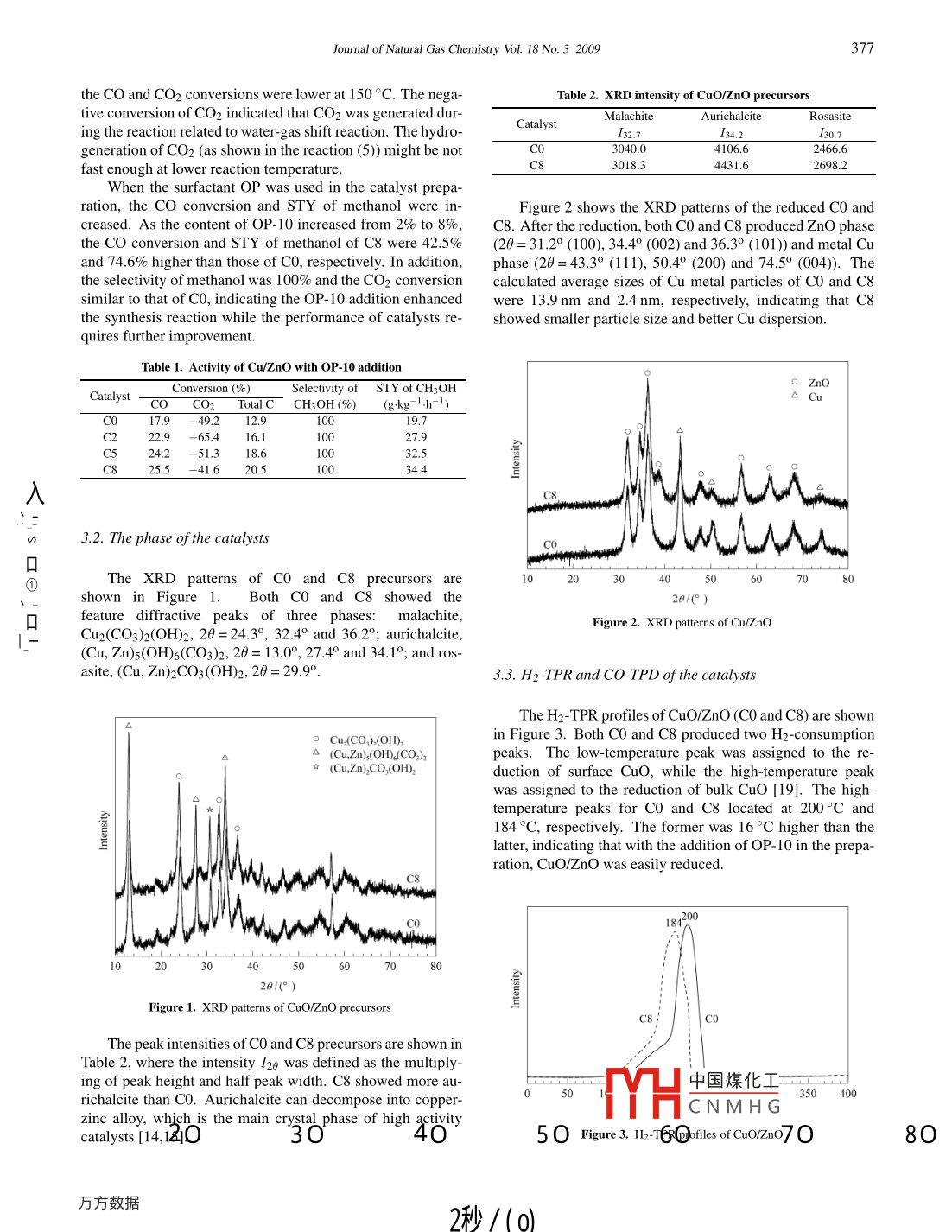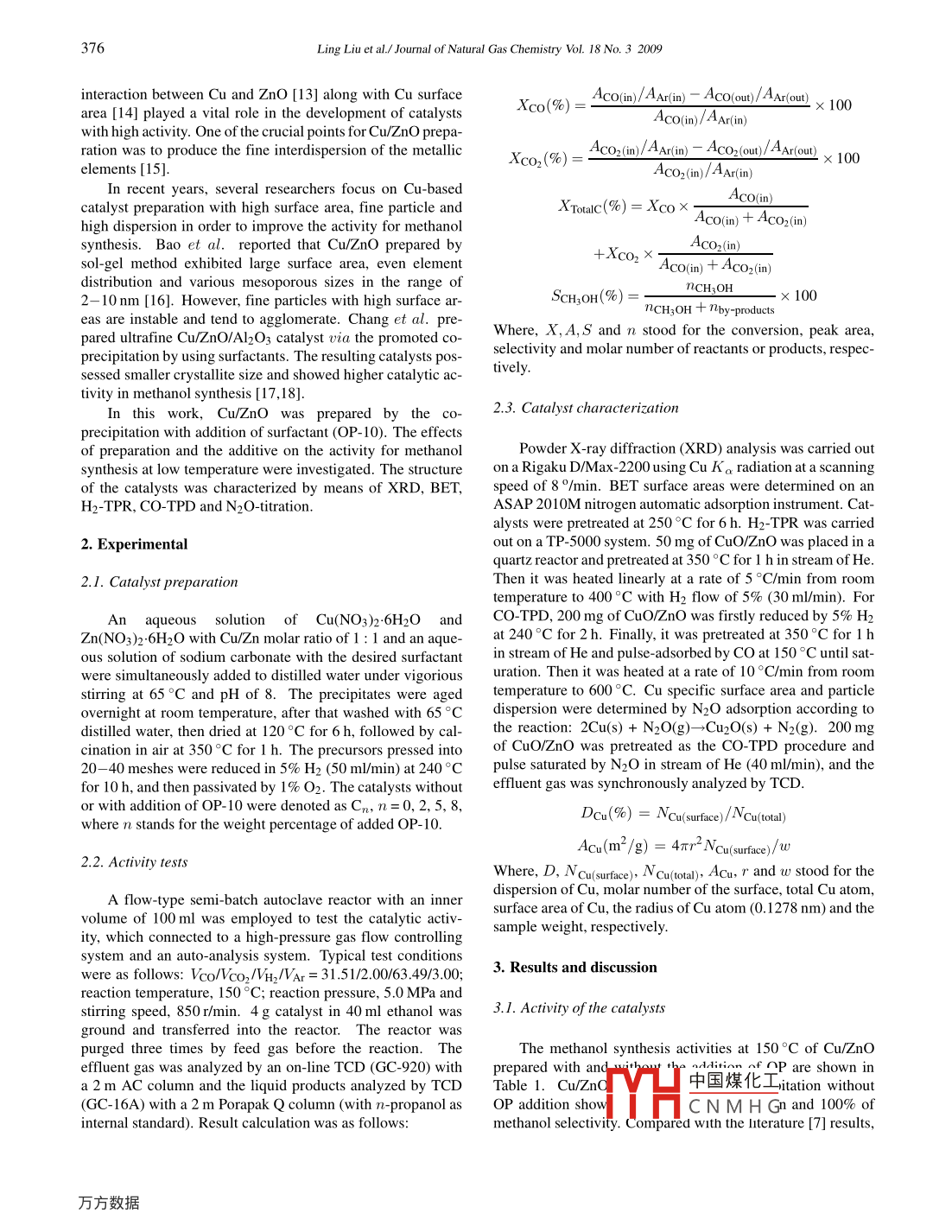 Available online at www.sciencedirect.comJOURNAL:OFScienceDirectNATURAL GASCHEMISTRYELSEVIERJournal of Natural Gas Chemistry 18(2009) 375- -378www.elsevier.com/locate/jngc .Promoting effect of polyoxyethylene octylphenol ether on Cu/ZnOcatalysts for low-temperature methanol synthesisLing Liu,Tiansheng Zhao*,Qingxiang Ma, Yufang ShenKey Laboratory of Energy Resources & Chemical Engineering of Ningxia, Ministry-Province Co-Cuitivated State Key Laboratory Base,Ningxia University, Yinchuan 750021, Ningxia, China[ Received December 29, 2008; Revised July 9, 2009; Available online August 21, 2009 ]AbstractCu/ZnO catalysts were prepared by the co precipitation method with the addition of OP- 10 (polyoxyethylene octylphenol ether) and werechemically and structurally characterized by means of XRD, BET, H2-TPR, CO-TPD and N2O-titration. The effect of OP- 10 addition on theactivity of Cu/ZnO for the slurry phase methanol synthesis at 150 °C was evaluated. The results showed that Cu/ZnO prepared with additionof 8% OP- 10 (denoted as C8) exhibited the promoted activity for the methanol synthesis. The conversion of CO and the STY (space timeyield) of methanol were 42.5% and 74.6% higher than thosepf Cp/ZnO prepared pvithout addition of OP-10 (denoted as C), respectively. Theprecursor of C8 contained more aurichalcite and rosasite,nd the concerted CEct of Cu-Zn in C8 was found to be stronger than that in CO.Compared with CO, C8 showed smaller particle size, lowerKey words .surfactant; Cu/ZnO; low-temperature methanol synthesis1. Introductionway of methanol synthesis at 443 K and under 50 bar fromCO2-containing syngas was reported [6- 10] as the follow-Methanol is an important bulk chemical, a kind of trans-ing steps (3)- (7), where Cu represented the catalytic site ofportation fuel and energetic material for fuel cells. DurativeCu/ZnO and ROH is the accompanying alcohol. CO2 andattention has been paid to methanol synthesis from syngas atH2O were cycled during the reaction.low temperature owing to thermodynamic advantage. BNLCO+ H2O→CO2+ H2(3)reported an effective route for low-temperature methanol syn-thesis, however, syngas needed to be free of CO2 and H2O inCO2 + 1/2H2 + Cu→HCOOCu(4order to maintain the activity of the basic catalysts. Methanolsynthesis at low-temperature via concurrent two steps of car-HCOOCu + ROH→HCOOR + CuOHbonylation and hydrogenolysis as shown below was inten-sively studied[1-3].HCOOR + 2H2→ROH+ CH;OHCH3OH + CO→HCOOCH3CuOH + 1/2H2→H2O + Cu(7)HCOOCH3 + 2H2→2CH3OHIn all CO+ 2H2→CH3OHHomogeneous alkali metal methoxides and modifiedmetal copper are used as catalysts for steps (1) and (2), re-Conventional preparation of Cu/ZnO is via cospectively. Alkali metal methoxides are vulnerable to CO2 precipitation of metal nitrates by bases, and some copper-and H2O, therefore, syngas is required to be free of both CO2 and zinc-containing phases are produced, and CuO/ZnO mix-and H2O or with low content of them, which causes high costtures were formed after calcination. When the precursor con-of syngas preparation.tained more aurichalcite (CuZn)s(CO3)2(OH)6 and rosasite(CuZn)2CO3(OH)2, Cu and ZnO showed homogenous distri-synthesis and is also used in water-gas shift reaction [4,5].bution and stronger concerted interaction. More active centersWith the aid of alcohol solvents, a novel and more practicalthen generated through thermal decomposition [11,12]. The* Corresponding author. E-mail: zhaots @ nxu.edu.cnThis work was supported by the Chinese Ministry of Science & Technology (2005CCA000), Spr中國(guó)煤化工。n for New CenturyExcellent Talents in University (NCET 08-0872) from the Chinese Ministry of Education are acknowledgMHCNM HGCopyright@2009, Dalian Institute of Chemical Physics, Chinese Academy of Sciences. All rights reserved.doi:10. 1016/S1003-9953(08)60121-8376Ling Liu et al./ Journal of Natural Gas Chemistry Vol. 18 No. 32009interaction between Cu and ZnO [13] along with Cu surfaceXco(%) =Aco(im)/Arin) - Aco(ou)/Ar(ou) x 100 .area [14] played a vital role in the development of catalystsAco(in)/Ar(i)with high activity. One of the crucial points for Cu/ZnO prepa-ration was to produce the fine interdispersion of the metallicXco2(%) =Acor(n)/Ar(in) - AcO2(oun)/AAr(ou)x 100elements [15].Aco2(in)/Ar(i)In recent years, several researchers focus on Cu-basedAco(in)catalyst preparation with high surface area, fine particle andXTotalc(%)= XcoXAco(in) + Aco2(in)high dispersion in order to improve the activity for methanolsynthesis. Bao et al. reported that Cu/ZnO prepared by+Xco2 xsol-gel method exhibited large surface area, even elementAco(in) + AcO2(in)distribution and various mesoporous sizes in the range ofNCHsOH-x1002- 10 nm [16]. However, fine particles with high surface ar-Scri:OH(%)=nirH.OH+noyby-productseas are instable and tend to agglomerate. Chang et al. pre-Where, X,A,S and n stood for the conversion, peak area,pared ultrafine Cu/ZnO/Al2O3 catalyst via the promoted co-selectivity and molar number of reactants or products, respec-precipitation by using surfactants. The resulting catalysts pos-sessed smaller crystallite size and showed higher catalytic ac-tively.tivity in methanol synthesis [17,18].In this work, Cu/ZnO was prepared by the co-2.3. Catalyst characterizationprecipitation with addition of surfactant (OP- 10). The effectsof preparation and the additive on the activity for methanolPowder X-ray diffraction (XRD) analysis was carried outsynthesis at low temperature were investigated. The structureon a Rigaku D/Max -2200 using Cu K a radiation at a scanningof the catalysts was characterized by means of XRD, BET,speed of 8 0/min. BET surface areas were determined on anH2-TPR, CO-TPD and N2O-titration.ASAP 2010M nitrogen automatic adsorption instrument. Cat-alysts were pretreated at 250 °C for 6 h. H2 TPR was carried2. Experimentalout on a TP- 5000 system.50 mg of CuO/ZnO was placed in aquartz reactor and pretreated at 350 °C for 1 h in stream of He.2