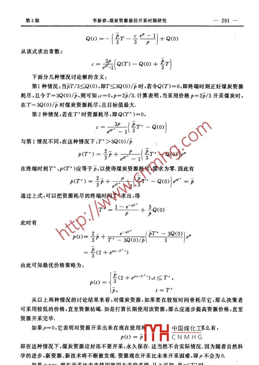 第23卷第3期經(jīng)濟數(shù)學Vol.23No.3.2006年9月MATHEMATICS IN ECONOMICSSep.2006煤炭資源最佳開采時期研究李新春(中國礦業(yè)大學管理學院,徐州,221008)摘要煤炭資源是一種不可再生資源,即耗竭性資源.現(xiàn)在的煤炭資源開采策略是一-種掠奪式的開采,不僅浪費資源,而且會使我國的煤炭將來很難滿足現(xiàn)代化建設的需要.為此,本文采用經(jīng)濟控制論模型試圖探討煤炭資源的最佳開采時期. .關鍵詞煤炭資源,開采時期,最佳1.引言我國煤炭資源目前已探明儲量近1500億噸,在全世界僅次于美國.我國的煤炭產(chǎn)量早在1989年就突破10億噸,居世界第-位.進入90年代,我國的煤炭生產(chǎn)已經(jīng)開始過剩,再加上地方小煤炭企業(yè)的無序生產(chǎn)和銷售,煤炭行業(yè)逐漸處于疲軟狀態(tài).到1999年底,國有重點煤礦76戶處于虧損狀態(tài),虧損面為80%,相當數(shù)量的煤炭企業(yè)瀕臨破產(chǎn).煤炭行業(yè)之所以走向低糜,其根本原因在于我國沒有對煤炭資源進行合理開發(fā).煤炭資源是一種不可再生資源.目前我國煤炭資源開發(fā)出以后僅作為能源供燃燒使用,而隨著科學技術(shù)逐漸發(fā)展,我們將會發(fā)現(xiàn)煤炭的其他新用途.同一單位的燒炭資源在不同時期開發(fā)所帶來的經(jīng)濟效益是不一樣的,即煤炭資源的價值具有時間效應.同一礦區(qū)的煤炭資源開發(fā)的時間選擇就成為我國煤炭資源最佳開發(fā)的關鍵問題.為此,本文構(gòu)造數(shù)學模型,計算一下如何最優(yōu)利用煤炭資源.2模型建立在建立模型前,首先定義一些變量:p(t)表示在時刻t煤炭資源的價格;q=f(p)表示人們對煤炭資源的需求函數(shù),df/dp<0;c=G(q)表示成本函數(shù),表示開采q單位煤炭資源時付出的代價;Q(t)表示時刻t的煤炭資源儲存量,Q(0)>0;T>0為終端時刻;p>0為社會貼現(xiàn)率.成本函數(shù)c=G(q)是開采量q的函數(shù),開采量應等于需求量,需求量q又是價格p的函數(shù),因此成本又可看作價格p的函數(shù);c=G(q) = G[f(p)中國煤化工生產(chǎn)者利潤函數(shù)由下式表示;“THCNMHGπ(p)= pf(p)- g(p)萬些熟星期:2005-12-28一290一-經(jīng)濟數(shù)學第23卷當價格太低時,必然要虧本,因此存在一個價格使得利潤為0;當價格太高時,需求量降至很少,收入pf(p)也將很小,也要虧本,因此存在另一個較高的價格使利潤為零.當進行煤炭資源最優(yōu)利用的規(guī)劃時,是否只須考慮利潤最大就可以了呢?回答是否定的.我們還必須考慮消費者這-方的消費者剩余:消費者剩余=消費者愿意花的錢-實際花的錢當價格為p=p"時消費者剩余ψ(p° )定義為:(p*)= |'.f(p)dp上式中p表示煤炭資源的極限價格,即當資源價格高于此時將不存在消費者.生產(chǎn)者利潤有時也稱之為生產(chǎn)都剩余,它指的是生產(chǎn)者出售產(chǎn)品q之后所賺的錢.而消費者剩余可以理解為消費者獲得的收益.那么目標函數(shù)中應同時考慮生產(chǎn)生產(chǎn)都剩余與消費者剩余,使其總和最大.當社會貼現(xiàn)率為P時目標可定為:maxJ=| [ψ(p) + π(p)]e- "dt另外,當市場需求量或生產(chǎn)者開采量為q= f(p)時,總儲量存量Q(t)將下降,單位時間內(nèi)下降的數(shù)量為q= f(p),即dQ(t)/dt=- f(p).由此,煤炭資源最優(yōu)利用問題可描述為:max J= [[4(分) + r(p)]e-*dts.t=- f(p)dQQ(0)為已知,Q(T)203. 模型分析令需求函數(shù)為f(p)=β- p(p為常數(shù)),成本函數(shù)為G(q)=q'=(p- p)”,則生產(chǎn)者利潤函數(shù)為r(p)= p(p- p)-(歷- p)”,消費者剩余函數(shù)為ψ(p)=|' (p-s)ds= (p-p)Jp-它。二上。于是,資源最優(yōu)開采模型為maxJ=[(p-p)-1+p(p-p)-(幣- p)2 |e -"dts.t.=一(P-p)Q(0)為給定值,Q(T)≥0現(xiàn)采用最大值原理求解以上模型,作哈密爾頓函數(shù):H=[F(p-p)-芒;R+p(β-p)-(幣- p)*]e-*+λ[-(幣-p)]中國煤化工巴三-(-0門*+2(p-FpMHCNMHG依極大值原理有必要條件:采取的價格策略p應使得哈密爾頓函數(shù)值取極大.拉格郎日算子λ_aH滿足λ==0.系統(tǒng)狀態(tài)方程為Q(t)= -(p- p).由此可以解出第3期李新春:煤炭資源最佳開采時期研究Q(t) = -+ Q(0)從該式求出常數(shù)cc=頭(Q(7)-Q(0)+到下面分幾種情況討論解的含義:第1種情況:當T/3≤Q(0) ,即TS3Q(0)/F時,若令Q(T)=0,即終端時刻正好煤炭資源耗盡,且令T= 3Q(0)/p,則可知:c= 0,p= 2p/3.計算表明,當采用價格p= 2p/3開采煤炭時,在T= 3Q(0)/F時煤炭資源耗盡;且目標值最大.第2種情況:若在T"時資源耗盡,即Q(T*)=0,c=3p (0- Q(0)與第1情況不同,在這種情況下:T*>3Q(0)/p .p(T")=影+一(雪一Q(o)-在終端時刻T* ,p(T* )應等于p,以使得煤炭資源耗盡,需求為零.因此有p(T")=號p+g°(BT*-Q(0)|e"=F通過上式,可以把資源耗盡的終端時間T"求出,得.T. .1二-+ 32(0)此時有e-pT*pT*一3Q(0)|erp()=鄂p+ -3Q0)0一3=烏(2 +exu-r*)由此可知最優(yōu)價格策略為:p(t) =專(2+ec-"*),t≤T',t= T*從以上兩種情況的討論結(jié)果來看,對煤炭資源,如果要在較短時間骨耗盡它,那么決策者可采用較低的價格,直至資源枯竭.如是打算長期使用該資源,那么應逐步提高資源價格,直至資源開采完畢.如果p=0,它表明對資源開采出來在現(xiàn)在使用利中國煤化工么有:p(t)= pMYHCNMHG即在這種情況下,煤炭資源應封凍不要開采,永久保存.這當然不合實際情況.因為隨著自然科學的進步,新資源、新技術(shù)將不斷被發(fā)現(xiàn).資源現(xiàn)在開采比未來開采困難,即p不會為0... 如果g→∞,現(xiàn)在開采比未來使用效用大無窮多倍.從上可知,當t