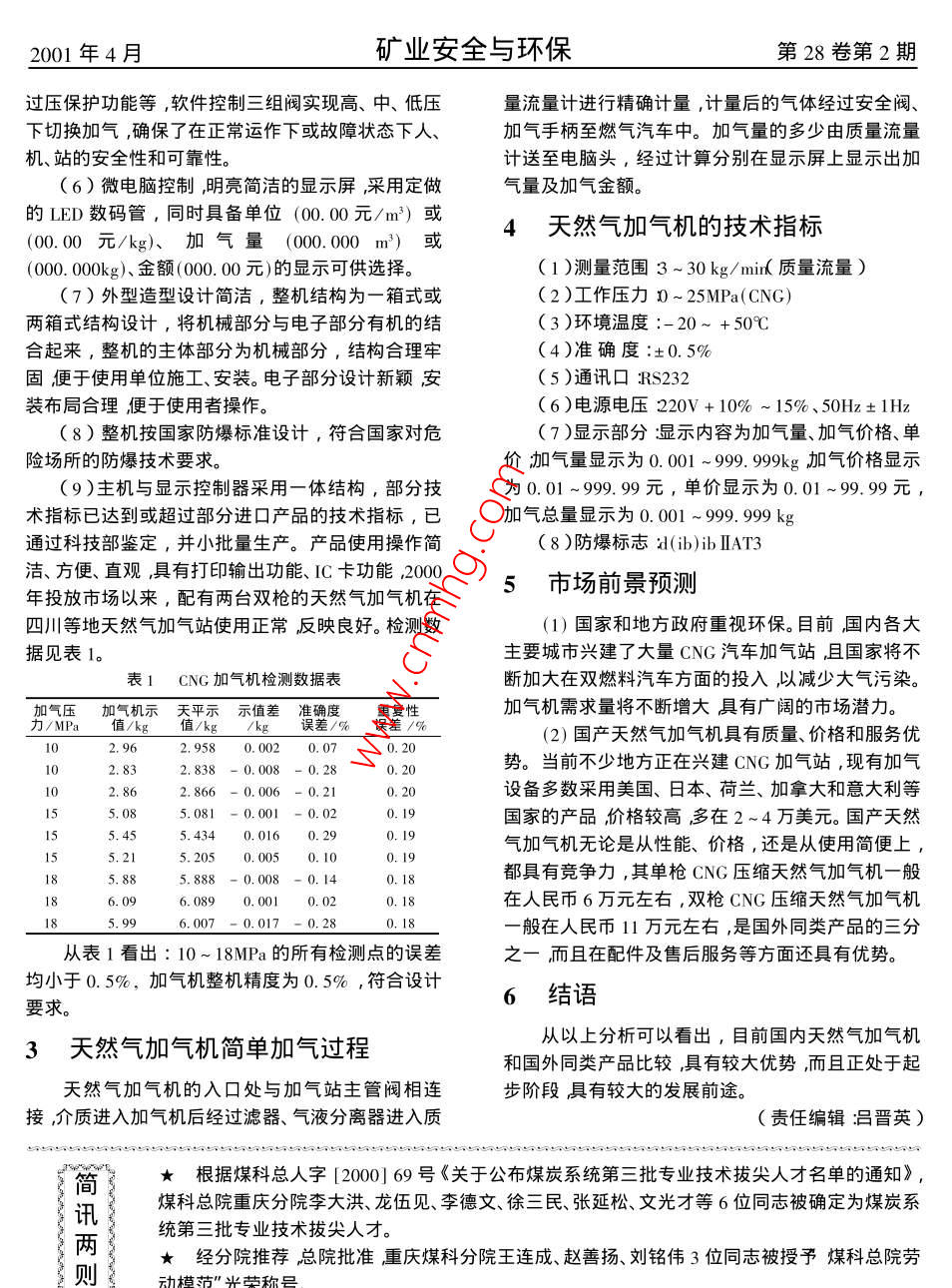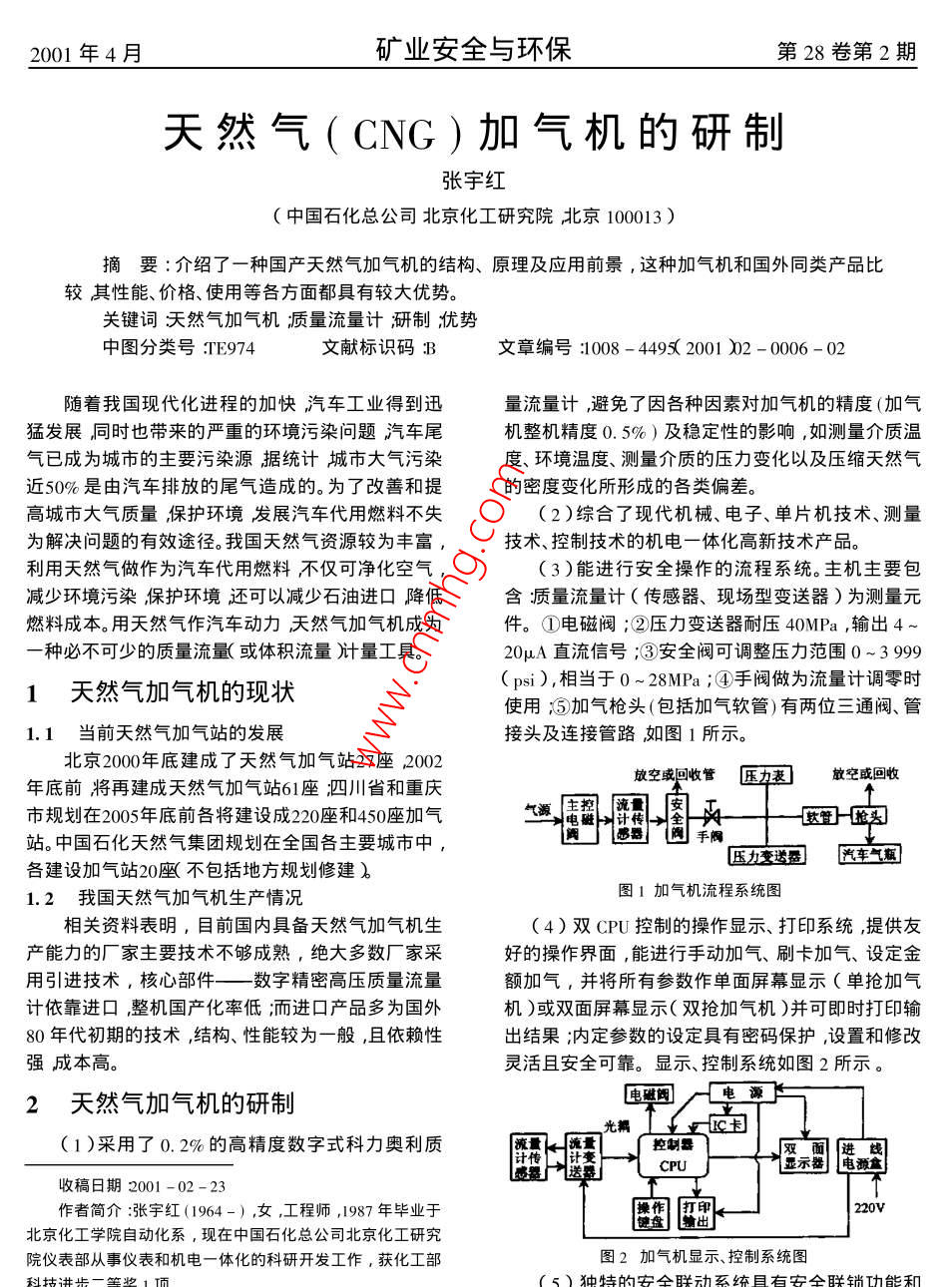 2001年4月礦業(yè)安全與環(huán)保第28卷第2期天然氣(CNG)加氣機(jī)的研制張宇紅中國石化總公司北京化工研究院北京100013)摘要:介紹了一種國產(chǎn)天然氣加氣機(jī)的結(jié)構(gòu)、原理及應(yīng)用前景,這種加氣機(jī)和國外同類產(chǎn)品比較其性能、價(jià)格、使用等各方面都具有較大優(yōu)勢。關(guān)鍵詞天然氣加氣機(jī)質(zhì)量流量計(jì)趼制猶勢中圖分類號TE974文獻(xiàn)標(biāo)識碼3文章編號:1008-44952001)2-0006-02隨著我國現(xiàn)代化進(jìn)程的加快汽車工業(yè)得到迅量流量計(jì),避免了因各種因素對加氣機(jī)的精度(加氣猛發(fā)展同時(shí)也帶來的嚴(yán)重的環(huán)境污染問題汽車尾機(jī)整機(jī)精度0.5%)及穩(wěn)定性的影響,如測量介質(zhì)溫氣已成為城市的主要污染源據(jù)統(tǒng)計(jì)城市大氣污染度、環(huán)境溫度、測量介質(zhì)的壓力變化以及壓縮天然氣近50%是由汽車排放的尾氣造成的。為了改善和提的密度變化所形成的各類偏差高城市大氣質(zhì)量保護(hù)環(huán)境發(fā)展汽車代用燃料不失2)綜合了現(xiàn)代機(jī)械、電子、單片機(jī)技術(shù)、測量為解決問題的有效途徑。我國天然氣資源較為豐富,技術(shù)、控制技術(shù)的機(jī)電一體化高新技術(shù)產(chǎn)品利用天然氣做作為汽車代用燃料不僅可凈化空氣3)能進(jìn)行安全操作的流程系統(tǒng)。主機(jī)主要包減少環(huán)境污染保護(hù)環(huán)境還可以減少石油進(jìn)口降低含質(zhì)量流量計(jì)(傳感器、現(xiàn)場型變送器)為測量元燃料成本。用天然氣作汽車動力天然氣加氣機(jī)成為件。①電磁閥;②壓力變送器耐壓40MPa,輸出4種必不可少的質(zhì)量流量或體積流量川量工具。20μA直流信號;③安全閥可調(diào)整壓力范圍0~39991天然氣加氣機(jī)的現(xiàn)狀(psi),相當(dāng)于0~28MPa;④手閥做為流量計(jì)調(diào)零時(shí)使用⑤加氣槍頭(包括加氣軟管)有兩位三通閥、管1.1當(dāng)前天然氣加氣站的發(fā)展接頭及連接管路如圖1所示。北京2000年底建成了天然氣加氣站27座2002年底前將再建成天然氣加氣站61座四川省和重慶放空成回收管巫力表放空或回收市規(guī)劃在2005年底前各將建設(shè)成220座和450座加氣源流量「安軟管}{搶頭站。中國石化天然氣集團(tuán)規(guī)劃在全國各主要城市中,感器肉手閥匹力變送車氣各建設(shè)加氣站20壓不包括地方規(guī)劃修建1.2我國天然氣加氣機(jī)生產(chǎn)情況圖1加氣機(jī)流程系統(tǒng)圖相關(guān)資料表明,目前國內(nèi)具備天然氣加氣機(jī)生4)雙CPU控制的操作顯示、打印系統(tǒng),提供友產(chǎn)能力的廠家主要技術(shù)不夠成熟,絕大多數(shù)廠家采好的操作界面,能進(jìn)行手動加氣、刷卡加氣、設(shè)定金用引進(jìn)技術(shù),核心部件——數(shù)字精密高壓質(zhì)量流量額加氣,并將所有參數(shù)作單面屏幕顯示(單搶加氣計(jì)依靠進(jìn)口,整機(jī)國產(chǎn)化率低洏而進(jìn)口產(chǎn)品多為國外機(jī))或雙面屏幕顯示(雙搶加氣機(jī))并可即時(shí)打印輸80年代初期的技術(shù),結(jié)構(gòu)、性能較為一般,且依賴性出結(jié)果;內(nèi)定參數(shù)的設(shè)定具有密碼保護(hù),設(shè)置和修改強(qiáng)成本高。靈活且安全可靠。顯示、控制系統(tǒng)如圖2所示。2天然氣加氣機(jī)的研制電磁闖(1)采用了0.2%的高精度數(shù)字式科力奧利質(zhì)收稿日期2001-02作者簡介:張宇紅(1964-),女,工程師,1987年畢業(yè)于操作220v北京化工學(xué)院自動化系,現(xiàn)在中國石化總公司北京化工研究院儀表部從事儀表和機(jī)電一體化的科研開發(fā)工作,獲化工部圖2加氣機(jī)顯示、控制系統(tǒng)圖2001年4月礦業(yè)安全與環(huán)保第28卷第2期過壓保護(hù)功能等,軟件控制三組閥實(shí)現(xiàn)高、中、低壓量流量計(jì)進(jìn)行精確計(jì)量,計(jì)量后的氣體經(jīng)過安全閥、下切換加氣,確保了在正常運(yùn)作下或故障狀態(tài)下人、加氣手柄至燃?xì)馄囍?。加氣量的多少由質(zhì)量流量機(jī)、站的安全性和可靠性。計(jì)送至電腦頭,經(jīng)過計(jì)算分別在顯示屏上顯示出加(6)微電腦控制明亮簡潔的顯示屏采用定做氣量及加氣金額。的LED數(shù)碼管,同時(shí)具備單位(00.00元/m3)或00.00元/kg)、加氣量(000.000m3)或4天然氣加氣機(jī)的技術(shù)指標(biāo)(00000g金額(0000元)的顯示可供選擇(1)測量范圍3~30kg/mi質(zhì)量流量)(7)外型造型設(shè)計(jì)簡潔,整機(jī)結(jié)構(gòu)為一箱式或(2)工作壓力~25MPa(CNG)兩箱式結(jié)構(gòu)設(shè)計(jì),將機(jī)械部分與電子部分有機(jī)的結(jié)3)環(huán)境溫度:-20~+50℃合起來,整機(jī)的主體部分為機(jī)械部分,結(jié)構(gòu)合理牢(4)準(zhǔn)確度:±0.5%固便于使用單位施工、安裝。電子部分設(shè)計(jì)新穎安(5)通訊囗Rs232裝布局合理便于使用者操作。(6)電源電壓220V+10%~15%、50Hz±1Hz(8)整機(jī)按國家防爆標(biāo)準(zhǔn)設(shè)計(jì),符合國家對危(7)顯示部分顯示內(nèi)容為加氣量、加氣價(jià)格、單險(xiǎn)場所的防爆技術(shù)要求價(jià)加氣量顯示為0.001~99999kg加氣價(jià)格顯示(9)主機(jī)與顯示控制器采用一體結(jié)構(gòu),部分技為0.01~999.99元,單價(jià)顯示為0.01~99.99元術(shù)指標(biāo)已達(dá)到或超過部分進(jìn)口產(chǎn)品的技術(shù)指標(b