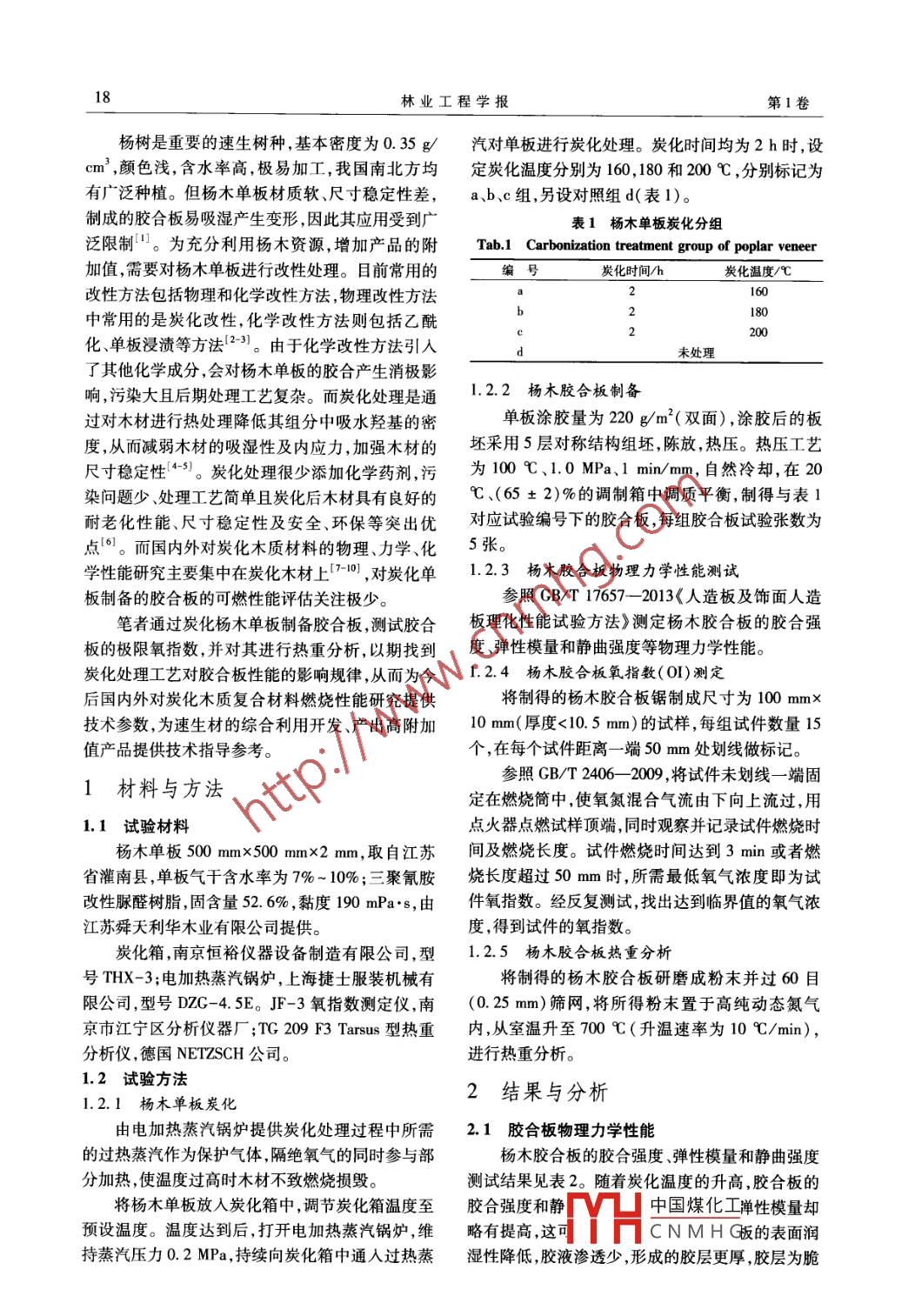 林業(yè)工程學(xué)報(bào),2016,1(2):17-20Doi:10.13360/isn,2096-139.2016.02.03炭化楊木單板制備膠合板的氧指數(shù)和熱重分析關(guān)明杰',常馨曼',薛明慧',王炳忠2’,翟通軍2(1南京林業(yè)大學(xué)材料科學(xué)與工程學(xué)院南京210037;2連云港南方木業(yè)有限公司,江蘇灌南222500)摘要:通過研究不同炭化處理溫度下的楊木單板制備膠合板的氧指教和熱重分析,以評價(jià)其阻燃性能。分別將160,180和200℃炭化處理后的單板熱壓制成5層對稱結(jié)構(gòu)膠合板,氧指數(shù)和熱重分析結(jié)果表明:炭化處理后的膠合板氧指數(shù)均高于未處理的膠合板,當(dāng)炭化條件為200℃和2h時(shí),膠合板氧指數(shù)最大值為30.3%,達(dá)到B3級難然材料標(biāo)準(zhǔn)。由TG-DIG曲線可知,炭化處理前后膠合板的TG、DTC曲線變化趨勢完全一致,主要差異體現(xiàn)在最終的成炭率、肩峰及特征峰對應(yīng)的具體溫度上。炭化條件為200℃和2h時(shí)的最終成炭奉為21·04%達(dá)到最大值;肩峰對應(yīng)溫度隨炭化溫度的升高而降低,炭化處理后膠合板特征峰對應(yīng)溫度均小于未處理的膠合板。關(guān)鍵詞:楊木;炭化處理;氧指數(shù);熱重分析;膠合板中圖分類號:TU531.2;T653.3文獻(xiàn)標(biāo)志碼:A文章編號:2096-1359(2016)02-0017-04Oxygen index and thermalgravimetric analysis ofpoplar plywood by carbonized veneerGUAN Mingjie, CHANG Xinman, XUE Minghui, WANG Bingzhong, ZHAI Tongjun(1. College of Materials Science and Engineering, Nanying Forestry Univeristy, Nanying 210037, China;2. Nanfang Wood Products Ltd. Co. Liangyungang, Guannan 222500, Jiangsu, China)Abstract: This paper aimed at investigating the effect of veneer carbonization treatment on the fire resistance propertieof poplar plywood by means of Oxygen Index(OI)and thermalgravimetric analysis. The poplar veneers carbonized in160, 180 and 200 C respectively for 2 h were used to produce five-layer plywood with melamine-urea-formaldehyderesin. a series of parameters of the carbonized plywood were tested in aspects of bonding shear strength, Modulus of Elasticity( MOE), Modulus of Rupture( MOR)and Ol Thermalgravimetric analysis was also used to analyze the thermalproperties of plywood correspondingly. The results showed that the bonding shear strength and mor decreased as the in-crease of carbonized temperature of poplar veneer, while MOE of plywood increased with the increase of carbonized temperature slightly. As a whole, bonding shear strength, MOE, MOR of the plywood from carbonized veneer declined obviously compared with those of control group. Bonding shear strength and mOR of the carbonized plywood from 200C and2 h decreased by 12. 7% and 38. 3% respectively, and MOE of the three carbonized plywood declined 26% to 30%. TheOI results showed that the oI in carbonization treatment groups were higher than that of control group. At the carbonize-tion condition of 200 and 2 h, the ol of the carbonized plywood was 30. 3%, reaching grade B, standard of refractorynaterials according to the classification for burning behavior of building materials and products( GB 8624-2012) Fromthe TG-DTG analysis curves, the variation tendency of the four groups were consistent, the differences were mainly inthe specific temperatures of final char yield, the acromion and characteristic peaks. Under the condition of 200C andh, the final char yield was 21. 04%, reaching the maximum value among four plywood groups. The temperature of acromion decreased with the rising of carbonization temperature, and the temperature of characteristic peaks in the carbon-ized groups were lower than that of control plywood. Generally, carbonization treatment on veneer improves the final charyield and Ol of plywood. It is supposed to be a new way to improve the fire resistance of plywood without any chemicalKey words: poplar; carbonization treatment; oxygen index; thermalgravimetric analysis; plywood修回日期:2015-11-03中國煤化工收稿日期:2015-07-3基金項(xiàng)目:蘇北科技發(fā)展計(jì)劃-科技型企業(yè)技術(shù)創(chuàng)新項(xiàng)目(BC2013425);江蘇高校優(yōu)勢學(xué)利CNMHG作者簡介:關(guān)明杰,女,副教授研究方向?yàn)橹衲静牡募庸だ谩?E-mail; mingjieguand@ hotmailcom林業(yè)工程學(xué)報(bào)第1卷?xiàng)顦涫侵匾乃偕鷺浞N,基本密度為0.35g/汽對單板進(jìn)行炭化處理。炭化時(shí)間均為2h時(shí),設(shè)cm3,顏色淺,含水率高極易加工,我國南北方均定炭化溫度分別為160,180和200℃,分別標(biāo)記為有廣泛種植。但楊木單板材質(zhì)軟尺寸穩(wěn)定性差,a、b、c組,另設(shè)對照組d(表1)。制成的膠合板易吸濕產(chǎn)生變形,因此其應(yīng)用受到廣表1楊木單板炭化分組泛限制。為充分利用楊木資源,增加產(chǎn)品的附Tab,1 Carbonization treatment group of poplar veneer加值,需要對楊木單板進(jìn)行改性處理。目前常用的炭化時(shí)間/h炭化溫度/℃改性方法包括物理和化學(xué)改性方法,物理改性方法中常用的是炭化改性,化學(xué)改性方法則包括乙?;瘑伟褰n等方法23)。由于化學(xué)改性方法引入未處理了其他化學(xué)成分,會對楊木單板的膠合產(chǎn)生消極影響污染大且后期處理工藝復(fù)雜。而炭化處理是通122楊木膠合板制備過對木材進(jìn)行熱處理降低其組分中吸水羥基的密單板涂膠量為220g/m2(雙面),涂膠后的板度,從而減弱木材的吸濕性及內(nèi)應(yīng)力加強(qiáng)木材的坯采用5層對稱結(jié)構(gòu)組坯陳放熱壓。熱壓工藝尺寸穩(wěn)定性4。炭化處理很少添加化學(xué)藥劑,污為100℃、1.0MPa、1min/mm,自然冷卻在20染問題少、處理工藝簡單且炭化后木材具有