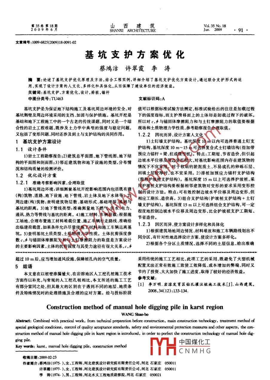 山西建筑Vol. 35 No. 18SHANXI ARCHITECTUREJun.2009●91文章編號:10096825(2009)18-0091-02基坑支護(hù)方案優(yōu)化蔡鴻潔許翠霞李濤摘要:論述了基坑支護(hù)優(yōu)化原理及方法,結(jié)合工程實(shí)例,詳細(xì)介紹了基坑支護(hù)優(yōu)化方案設(shè)計(jì),通過聯(lián)合支護(hù)形式的運(yùn)用,實(shí)現(xiàn)了設(shè)計(jì)方案的人文化、多樣化和具體化,從面保障了建設(shè)單位的經(jīng)濟(jì)效益。關(guān)鍵詞:基坑支護(hù),方案優(yōu)化,設(shè)計(jì),排樁,錨桿中圖分類號:TU463文獻(xiàn)標(biāo)識碼:A基坑支護(hù)是為保證地下結(jié)構(gòu)施工及基坑周邊環(huán)境的安全,對值可 以根據(jù)標(biāo)準(zhǔn)試驗(yàn)方法測定,標(biāo)準(zhǔn)試驗(yàn)給出的往往是加載過程基坑側(cè)壁及周邊環(huán)境采用的支擋加固與保護(hù)措施?;娱_挖是下的強(qiáng)度指標(biāo), 而支護(hù)滑移面上的土體卻是卸載過程下的破壞?;A(chǔ)和地下工程施工中的一個(gè)古老的傳統(tǒng)課題,同時(shí)又是一一個(gè)綜所以對 c,4與錨固體摩擦阻力和與土釘摩擦阻力的取值要根據(jù)合性的巖土工程難題,既涉及土力學(xué)中典型的強(qiáng)度與穩(wěn)定問題,現(xiàn)場和土質(zhì)物理力學(xué)性質(zhì) ,參考勘察報(bào)告合理取值。又包括了變形問題,同時(shí)還涉及到土與支護(hù)結(jié)構(gòu)的共同作用。1.2.2因坑而異 ,設(shè)計(jì)方案人文化1基坑支護(hù)方 案設(shè)計(jì)1)土釘墻支護(hù)結(jié)構(gòu)?;由疃?0 m以內(nèi)可選擇普通土釘支1.1 設(shè)計(jì)條件護(hù)結(jié)構(gòu),基坑深度10 m~ 15 m可選擇復(fù)合式土釘墻結(jié)構(gòu)(指加帶1)巖土工程勘察報(bào)告;2)建筑總平面圖,地下管線圖,地下結(jié)預(yù)應(yīng)力錨桿+梁柱或微型樁)。特點(diǎn):工期短、節(jié)省造價(jià),但引起構(gòu)的平面圖和剖面圖;3)鄰近建筑物和地下設(shè)施的類型,分布情邊坡水平位移及周邊變形較大,對基坑影響范圍內(nèi)存在建筑物的情況下不宜采用。對于軟弱的淤泥質(zhì)土、不易成孔的卵礫石層、況和結(jié)構(gòu)質(zhì)量的檢測評價(jià)?;靥钔翆虞^厚時(shí),也不宜采用。2)排樁加預(yù)應(yīng)力錨桿支護(hù)結(jié)構(gòu)1.2優(yōu)化設(shè)計(jì)方案(簡稱護(hù)坡樁支護(hù)結(jié)構(gòu))?;由疃?5 m以上可選擇護(hù)坡樁,采1.2.1準(zhǔn)確考察影響因素, 合理取值1)基坑周邊環(huán)境:詳細(xì)測最基坑開挖影響范圍內(nèi)包括既有建用護(hù)坡樁支護(hù)結(jié)構(gòu)要根據(jù)相鄰建筑物對變形的要求采用變形控(構(gòu))筑物道路、地下設(shè)施地下管線、巖土體及地下水體等。2)制的設(shè)計(jì)方法。特點(diǎn):可有效控制邊坡水平位移及周邊變形,但周邊建(構(gòu))筑物:查明建筑物層數(shù).基礎(chǔ)形式、基礎(chǔ)埋深.基礎(chǔ)與相應(yīng)工期長、造價(jià)高。3)組合支護(hù)結(jié)構(gòu)(護(hù)坡樁支護(hù)結(jié)構(gòu)+土釘基坑的距離。3)地下管線類型:準(zhǔn)確測量地下燃?xì)狻⒐┧?、電力、墻支護(hù)結(jié)構(gòu))?;由疃?5 m以上可選擇組合支護(hù)結(jié)構(gòu),可一定通訊、熱力等管線與基坑的距離。4)施工材料車輛荷載:根據(jù)施程度地控制邊坡水平位移及周邊變形,比全護(hù)坡樁支護(hù)工期短、工場地,合理布置施工材料堆載位置、施工車輛行走路線、準(zhǔn)確給節(jié)省造價(jià)。出臨建荷載值,如果條件允許盡量使施工材料和施工車輛遠(yuǎn)離基1.2.3 因區(qū)而異,使方案設(shè)計(jì)多樣化和具體化坑。5)查明基坑土質(zhì)類型、土質(zhì)物理力學(xué)性質(zhì)。土體抗剪強(qiáng)度參1)根據(jù)建筑場地周邊情況、材料堆放和施工車輛路線劃出不數(shù)c,中與錨固體摩擦阻力和與土釘摩擦阻力的取值是方案設(shè)計(jì)同分區(qū),有針對性地選擇設(shè)計(jì)方案,使設(shè)計(jì)方案多樣化。的主要影響因素,土體的抗剪強(qiáng)度與其受力途徑有很大關(guān)系,c,中2)根據(jù)各個(gè)分區(qū)土質(zhì)情況,選擇不同的土層信息,給出準(zhǔn)確超過10m后,應(yīng)當(dāng)增加通風(fēng)設(shè)施,保障樁孔內(nèi)的空氣質(zhì)量。采用傳統(tǒng)的施工工藝相比,此項(xiàng)工藝的采用,既避免了大型機(jī)械5結(jié)語配置無法正常有效施工致使工效降低.成本增加的弊端,同時(shí)又本文意在以樁壁滲漏量大、在巖溶地區(qū)人工挖孔樁施工技術(shù)節(jié)約了投資、大大加快了施工進(jìn)度,取得了較好的經(jīng)濟(jì)效益。方面作以補(bǔ)充,與常規(guī)的人工挖孔樁相比,本文所述的施工工藝參考文獻(xiàn):有部分雷同之處,但其最大的區(qū)別在于遇到不同的地層、地質(zhì)條[1] 李萬明.巖溶發(fā)育區(qū)鉆孔灌注樁施工技術(shù)[J].山西建筑,2008,34(12):133-134.件及特殊情況時(shí)的處理措施及合理的應(yīng)對方案。經(jīng)與投標(biāo)階段Construction method of manual hole digging pile in karst regionWANG ShaoboAbstract: Combined with practical work, from technical preparation before construction, main construction technology, treatment method ofspecial geological conditions, control of quality acceptance standards, safety and environmental protection measures and other aspects, the con-struction method of manual hole digging pile in karst region is introduced, in order to perfect the construction technology of manual hole dig