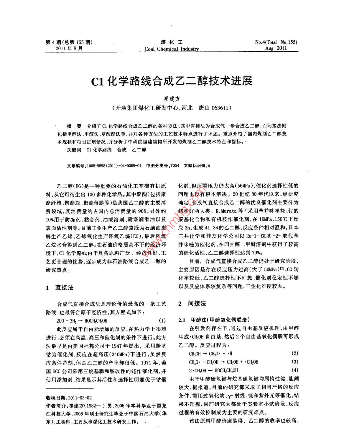 C1化學(xué)路線合成乙二醇技術(shù)進展