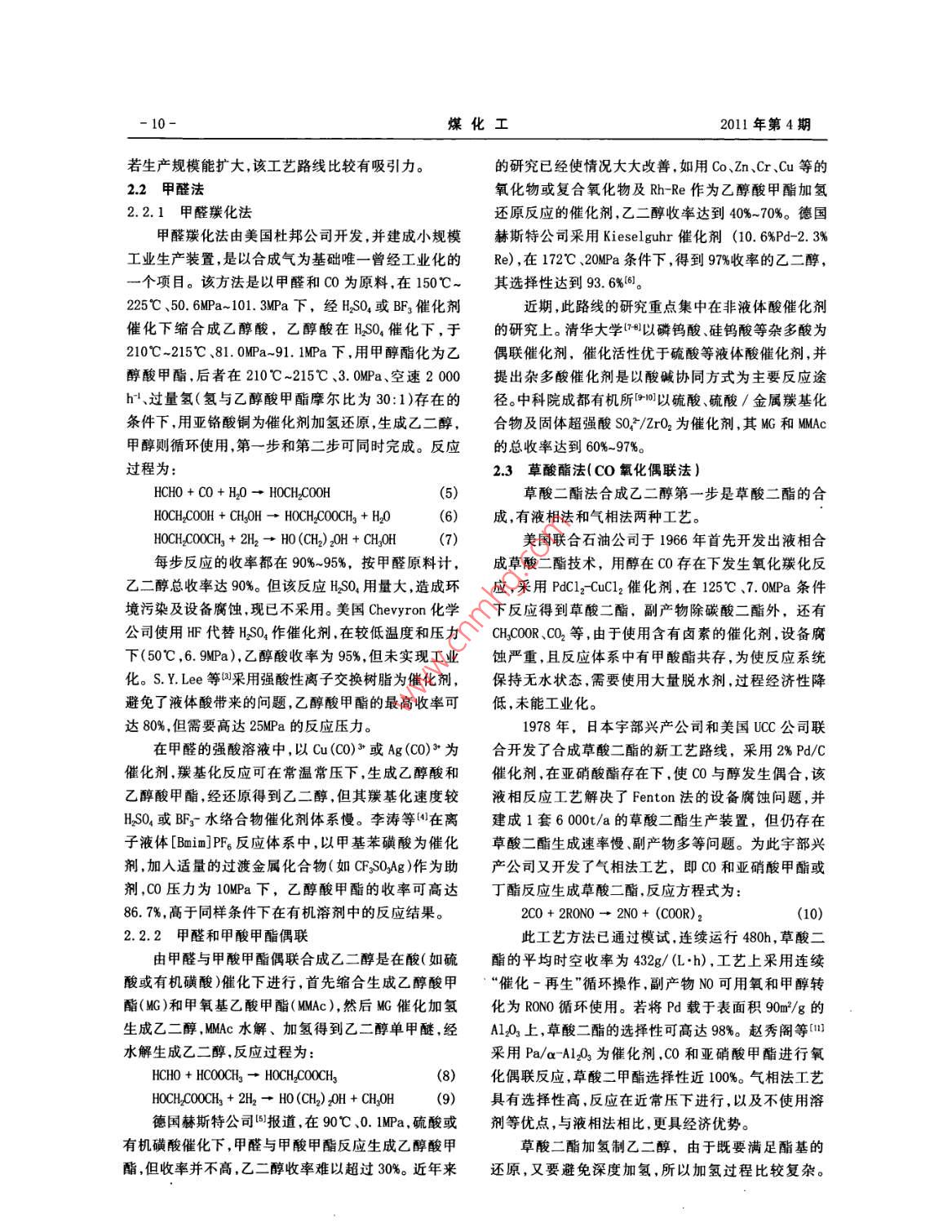 第4期(總第155期煤化工No 4(Total No 155)2011年8月Coal Chemical IndustryC1化學(xué)路線合成乙二醇技術(shù)進展崔建方(開灤集團煤化工研發(fā)中心河北唐山063611)摘要介紹了C化學(xué)路線合成乙二醇的各種方法,其中直接法為合成氣一步合成乙二醇,而間接法則包括甲醇法、甲醛法、草酸酯法等,并對各種方法的工藝技術(shù)特點進行了評述。重點介紹了國內(nèi)煤制乙二醇技術(shù)現(xiàn)狀和項目進展情況,并分析了中科院福建物構(gòu)所開發(fā)的煤制乙二醇技術(shù)特點和指標。關(guān)鍵詞Cl化學(xué)路線合成乙二醇文章編號:1005-9598(2011)-04000904中圖分類號:TQ54文獻標識碼:A乙二醇(EG)是一種重要的石油化工基礎(chǔ)有機原化劑,但所需壓力仍太高(56MPa),催化劑選擇性低的料,從它可衍生出100多種化學(xué)品。其中聚酯(包括聚問題也沒有根本解決。20世紀80年代以來,經(jīng)研究酯纖維聚酯瓶、聚酯薄膜等)是我國乙二醇的主要消確定,合成氣直接合成乙二醇的優(yōu)良催化劑主要分為費領(lǐng)域,其消費量約占國內(nèi)總消費量的90%,另外約銠和釕兩大類。K. Murata等u.用苯并咪唑鹽、釕的10%用于防凍劑、黏合劑、油漆溶劑、耐寒潤滑油以及羰基化合物和有機胺作催化劑,在1OMa、150℃下反表面活性劑等。目前工業(yè)生產(chǎn)乙二醇路線為石腦油裂應(yīng)3h,生成41.3%的乙二醇反應(yīng)條件相對溫和。日本解生產(chǎn)乙烯,乙烯氧化生產(chǎn)環(huán)氧乙烷(E),最后環(huán)氧三井化學(xué)和佳友化學(xué)公司以Ru-1-烷基-2-取代苯乙烷水合得到乙二醇。在石油價格居高不下的經(jīng)濟環(huán)并咪唑為催化劑在四甘醇二甲醚溶劑中獲得了較高境下,C1化學(xué)路線由于具備原料廣泛、經(jīng)濟性好、工的催化活性,乙二醇選擇性達到70%。藝更合理的優(yōu)勢,逐步成為非石油路線合成乙二醇的目前,合成氣直接合成乙二醇仍處于研究階段研究熱點。主要原因是存在反應(yīng)壓力過高(大于50MPa)(2、Co轉(zhuǎn)化率較低、乙二醇選擇性不理想催化劑穩(wěn)定性不夠1直接法以及反應(yīng)體系較復(fù)雜等問題,工業(yè)化難度較大。合成氣直接合成法是理論價值最高的一條工藝2間接法路線,也最符合原子經(jīng)濟性,其方程式如下2C0+3H2→ HOCHA CH2OH(1)2.1甲醇法(甲醇氧化偶聯(lián)法此反應(yīng)屬于自由能增加的反應(yīng),在熱力學(xué)上很難在引發(fā)劑存在下,通過自由基反應(yīng)機理,由甲醇進行,必須在高溫高壓和催化劑的條件下進行。此方生成CHOH自由基,然后2個自由基氧化偶聯(lián)可形成法最早是由美國杜邦公司于1947年提出,采用羰基乙二醇。反應(yīng)過程為鈷為催化劑,反應(yīng)在超高壓(340MPa)下進行,雖然反CHOH→CH·+·H應(yīng)條件苛刻,但是乙二醇的產(chǎn)率卻很低。1971年,美CH4O·+CHOH→CHOH+·CH2國UC公司采用三烷基膦和胺改性的銠作催化劑,并2·CH2OH→ HOCH CH OH(4)使用添加劑,結(jié)果顯示其活性和選擇性明顯優(yōu)于鈷催由于甲醇碳氫鍵與烷基碳氫鍵均屬惰性鍵,能閾較大,據(jù)報道,目前的研究都采取了相當嚴格的反應(yīng)收稿日期:2011-03-02條件,需用過氧化物、y射線、銠和紫外光等催化,結(jié)作者簡介:崔建方(1982-),男,2005年本科畢業(yè)于黑龍果不理想,目前研究大都處于實驗室小試階段反應(yīng)江科技大學(xué),2008年碩士研究生畢業(yè)于中國石油大學(xué)(華過程的有效控制成為主要的研究難點。東),工程師,主要從事煤化工技術(shù)研發(fā)工作該法原料甲醇價廉易得,乙二醇的收率也較高10煤化工2011年第4期若生產(chǎn)規(guī)模能擴大,該工藝路線比較有吸引力。的研究已經(jīng)使情況大大改善,如用Co、Zn、Cr、Cu等的22甲醛法氧化物或復(fù)合氧化物及Rh-Re作為乙醇酸甲酯加氫2.2.1甲醛羰化法還原反應(yīng)的催化劑,乙二醇收率達到40%-70%。德國甲醛羰化法由美國杜邦公司開發(fā),并建成小規(guī)模赫斯特公司采用 Kieselguhr催化劑(10.6%Pd-2.3%工業(yè)生產(chǎn)裝置,是以合成氣為基礎(chǔ)唯一曾經(jīng)工業(yè)化的Re),在172℃、20MPa條件下,得到97%收率的乙二醇,個項目。該方法是以甲醛和C0為原料,在150℃~其選擇性達到93.6%6225℃、50.6MPa~101.3Pa下,經(jīng)HS04或BF3催化劑近期,此路線的研究重點集中在非液體酸催化劑催化下縮合成乙醇酸,乙醇酸在HSO4催化下,于的研究上。清華大學(xué)以磷鎢酸、硅鎢酸等雜多酸為210℃-2l5℃、81.OMPa-91.1Pa下,用甲醇酯化為乙偶聯(lián)催化劑,催化活性優(yōu)于硫酸等液體酸催化劑,并醇酸甲酯,后者在210℃-215℃、3.OMPa、空速2000提出雜多酸催化劑是以酸堿協(xié)同方式為主要反應(yīng)途h、過量氫(氫與乙醇酸甲酯摩爾比為30:1)存在的徑。中科院成都有機所m以硫酸、硫酸/金屬羰基化條件下,用亞鉻酸銅為催化劑加氫還原生成乙二醇,合物及固體超強酸S0/ZrO2為催化劑,其MG和WAc甲醇則循環(huán)使用,第一步和第二步可同時完成。反應(yīng)的總收率達到60%-97%過程為23草酸酯法(CO氧化偶聯(lián)法)HCH0+C0+H0→ HOCH COOH(5)草酸二酯法合成乙二醇第一步是草酸二酯的合HOCH COOH CH3OH- HOCH COOCH3 H,0(6)成,有液相法和氣相法兩種工藝HOCH-COOCH, 2H2- HO(CH2)2OH+ CH3OH(7)美國聯(lián)合石油公司于1966年首先開發(fā)出液相合每步反應(yīng)的收率都在90%~95%,按甲醛原料計,成草酸二酯技術(shù),用醇在C0存在下發(fā)生氧化羰化反乙二醇總