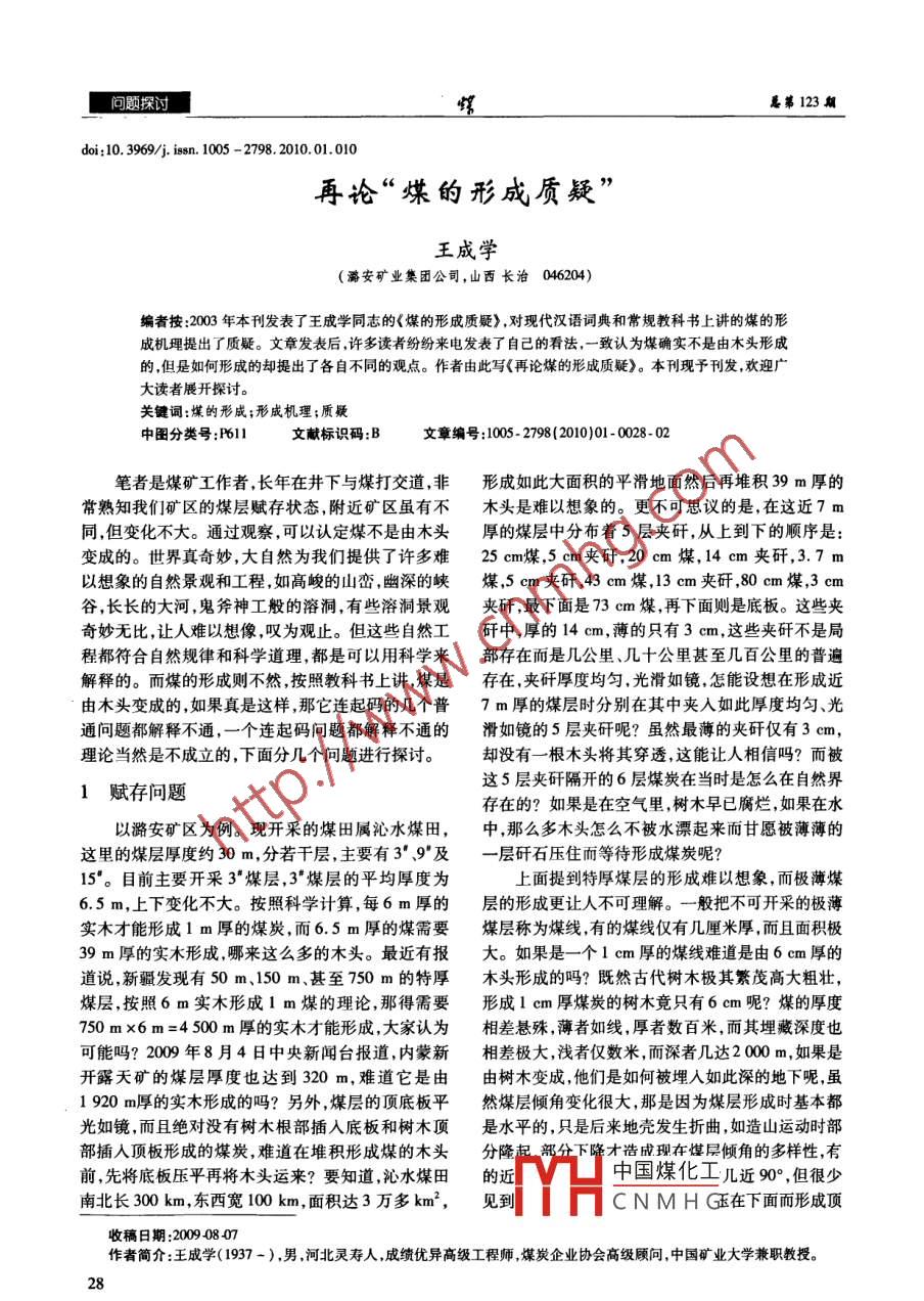 問題探討蝶總第123期doi:10. 3969/j. isn.1005 - 2798.2010.01. 010再論“煤的形成質(zhì)疑”王成學(潞安礦業(yè)集團公司,山西長治046204)編者按:2003年本刊發(fā)表了王成學同志的《煤的形成質(zhì)疑》,對現(xiàn)代漢語詞典和常規(guī)教科書上講的煤的形成機理提出了質(zhì)疑。文章發(fā)表后,許多讀者紛紛來電發(fā)表了自己的看法,一致認為煤確實不是由木頭形成的,但是如何形成的卻提出了各自不同的觀點。作者由此寫《再論煤的形成質(zhì)疑》。本刊現(xiàn)予刊發(fā),歡迎廣大讀者展開探討。關鍵詞:煤的形成;形成機理;質(zhì)疑中圖分類號:P611文獻標識碼:B文章編號:1005- 2798(2010)01 - 0028-02筆者是煤礦工作者,長年在井下與煤打交道,非形成如此大面積的平滑地面然后再堆積39m厚的常熟知我們礦區(qū)的煤層賦存狀態(tài),附近礦區(qū)雖有不木頭是難以想象的。更不可思議的是,在這近7 m同,但變化不大。通過觀察,可以認定煤不是由木頭厚的煤層中分布著5層夾矸,從上到下的順序是:變成的。世界真奇妙,大自然為我們提供了許多難25 cm煤,5 cm夾矸, 20 cm煤,14 cm夾矸,3.7 m以想象的自然景觀和工程,如高峻的山巒,幽深的峽煤,5 cm夾矸,43 cm煤,13 cm夾矸,80 cm煤,3 cm谷,長長的大河,鬼斧神工般的溶洞,有些溶洞景觀夾矸,最下面是73 cm煤,再下面則是底板。這些夾奇妙無比,讓人難以想像,嘆為觀止。但這些自然工矸中,厚的14 cm,薄的只有3 cm,這些夾矸不是局程都符合自然規(guī)律和科學道理,都是可以用科學來部存在而是幾公里、幾十公里甚至幾百公里的普遍解釋的。而煤的形成則不然,按照教科書上講,煤是存在,夾矸厚度均勻,光滑如鏡,怎能設想在形成近由木頭變成的,如果真是這樣,那它連起碼的幾個普7 m厚的煤層時分別在其中夾人如此厚度均勻、光通問題都解釋不通,一個連起碼問題都解釋不通的滑如鏡的5層夾矸呢?雖然最薄的夾矸僅有3 cm,理論當然是不成立的,下面分幾個問題進行探討。卻沒有一根木頭將其穿透,這能讓人相信嗎?而被這5層夾矸隔開的6層煤炭在當時是怎么在自然界1賦存問題存在的?如果是在空氣里,樹木早已腐爛,如果在水以潞安礦區(qū)為例?,F(xiàn)開采的煤田屬沁水煤田,中,那么多木頭怎么不被水漂起來而甘愿被薄薄的這里的煤層厚度約30 m,分若千層,主要有3".9"及一層矸石壓住而等待形成煤炭呢?15"。目前主要開采3*煤層,3*煤層的平均厚度為上面提到特厚煤層的形成難以想象,而極薄煤6.5 m,上下變化不大。按照科學計算,每6 m厚的層的形成更讓人不可理解。一般把不可開采的極薄實木才能形成1 m厚的煤炭,而6.5 m厚的煤需要煤層稱為煤線,有的煤線僅有幾厘米厚,而且面積極39m厚的實木形成,哪來這么多的木頭。最近有報大。如果是- -個1 cm厚的煤線難道是由6 cm厚的道說,新疆發(fā)現(xiàn)有50 m.150 m、甚至750 m的特厚木頭形成的嗎?既然古代樹木極其繁茂高大粗壯,煤層,按照6 m實木形成1 m煤的理論,那得需要形成1 cm厚煤炭的樹木竟只有6 cm呢?煤的厚度750mx6m=4500m厚的實木才能形成,大家認為相差懸殊,薄者如線,厚者數(shù)百米,而其埋藏深度也可能嗎? 2009年8月4日中央新聞臺報道,內(nèi)蒙新相差極大,淺者僅數(shù)米,而深者幾達2000 m,如果是開露天礦的煤層厚度也達到320 m,難道它是由由樹木變成,他們是如何被埋人如此深的地下呢,雖1920m厚的實木形成的嗎?另外,煤層的頂?shù)装迤饺幻簩觾A角變化很大,那是因為煤層形成時基本都光如鏡,而且絕對沒有樹木根部插入底板和樹木頂是水平的,只是后來地殼發(fā)生折曲,如造山運動時部部插人頂板形成的煤炭,難道在堆積形成煤的木頭分隆起部分下降才浩成現(xiàn)在煤層傾角的多樣性,有前,先將底板壓平再將木頭運來?要知道,沁水煤田的近中國煤化工幾近90° ,但很少南北長300 km,東西寬100 km,面積達3萬多km2,見到Y(jié)HCNMHG在下面而形成頂收稿日期:2009-08 07作者簡介:王成學( 1937 -),男,河北靈壽人,成績優(yōu)異高級工程師,煤炭企業(yè)協(xié)會高級顧問,中國礦業(yè)大學兼職教授。282010年1用王成學:再論“煤的形成質(zhì)疑”第19卷第1期底板倒翻的現(xiàn)象,更何況將其翻在近2000 m的地下樹木確實變成了煤,這也足以證明煤是木頭變成的。呢。這足以說明在煤層形成之后在上面又逐漸形成實則不然,凡是煤中存在的上述情況巖石中都存在,了新的巖石層,煤層僅是地表形成時其中的--層而既有木化石,也有動植物化石,甚至更多。你決不可已。能說見過木頭變成了石頭就以為石頭是木頭變成的。其實,木頭插在煤中就變成煤,插在巖石中就變2儲量問題成巖石,而且同樣的木頭插在不同的巖石中就可以教科書上講,煤是由木頭形成的,石油是動物遺變成不同的巖石,全國各地的硅化木千奇百怪,各式體形成的,似乎都是因為它們可燃。而可燃的東西各樣就足以證明。有的晶瑩剔透如玉,大多粗糙如大多由碳、氫、氧組成,而動植物的主要成分是碳氫泥巖片石,所以說,在特定情況下木頭可以變成哪種氧,所以就推斷可燃的煤及石油都是由動植物形成。東西,就認定哪種東西,- -定是木頭變成的是多么不而地球.上發(fā)現(xiàn)的可燃物很多,如天然氣、可燃冰、油可信。母頁巖等,難道它們也是由動植物形成的嗎?據(jù)說,那煤到底是怎么形成的呢?筆者總感到,它與可燃冰的儲量是煤及石油儲量的2倍還多,難道它其他巖
