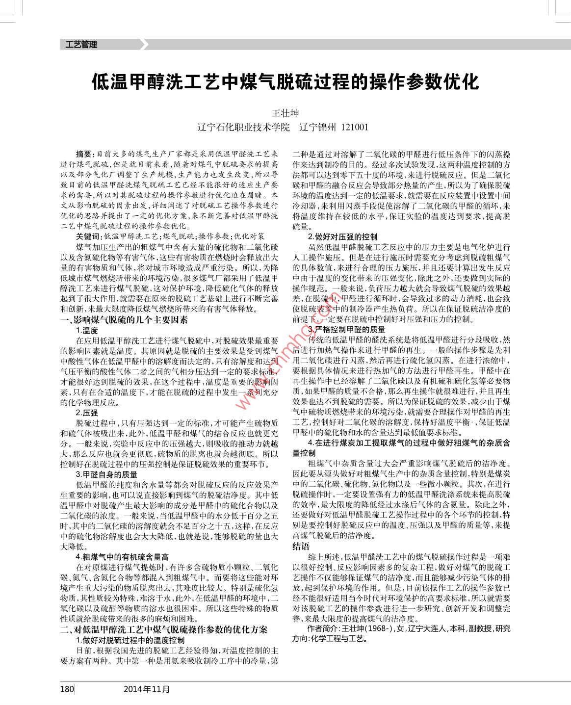 工藝管理低溫甲醇洗工藝中煤氣脫硫過程的操作參數(shù)優(yōu)化王壯坤遼寧石化職業(yè)技術(shù)學(xué)院遼寧錦州121001摘要:目前大多的煤氣生產(chǎn)廠家都是采用低溫甲醛洗工芑來二種是通過對(duì)溶解了二氧化碳的甲醛進(jìn)行低壓條件下的閃蒸操進(jìn)行煤氣脫硫,但是就目前來看,隨著對(duì)煤氣中脫硫要求的提高作來達(dá)到制冷的目的。經(jīng)過多次試驗(yàn)發(fā)現(xiàn),這兩種溫度控制的方以及部分氣化廠調(diào)整了生產(chǎn)規(guī)模,生產(chǎn)能力也發(fā)生改變,所以導(dǎo)法都可以達(dá)到零下五十度的環(huán)境,來進(jìn)行脫硫反應(yīng)。但是二氧化致目前的低溫甲醛洗煤氣脫硫工芑已經(jīng)不能很妤的適應(yīng)生產(chǎn)要碳和甲醛的融合反應(yīng)會(huì)導(dǎo)致部分熱量的產(chǎn)生,所以為了確保脫硫求的需要,所以對(duì)其脫硫過程的操作參欻進(jìn)行優(yōu)化迫在眉睫。本環(huán)境的溫度達(dá)到一定的低溫要求,就需要在反應(yīng)裝置中設(shè)置中間文從影響脫硫的因素岀發(fā),詳細(xì)闡述了對(duì)脫硫工芑操作參數(shù)進(jìn)行冷卻器,來利用閃蒸手段促使溶解了二氧化碳的甲醛的循環(huán),來優(yōu)化的思路并提岀了一定的優(yōu)化方案,來不斷完善對(duì)低溫甲醇洗將溫度維持在較低的水平,保證實(shí)驗(yàn)的溫度達(dá)到要求,提髙脫工藝中煤氣脫硫過程的操作參數(shù)優(yōu)化硫量關(guān)鍵詞:低溫甲醇洗工藝;煤氣脫硫;操作參數(shù);優(yōu)化對(duì)策2做好對(duì)壓強(qiáng)的控制煤氣加壓生產(chǎn)出的粗煤氣中含有大量的硫化物和二氧化碳雖然低溫甲醛脫硫工藝反應(yīng)中的壓力主要是電氣化爐進(jìn)行以及含氮硫化物等有害氣體,這些有害物質(zhì)在燃燒時(shí)會(huì)釋放岀大亼工操作施壓。但是在進(jìn)行施壓時(shí)需要充分考慮到脫硫粗煤氣量的有害物質(zhì)和氣體,將對(duì)城市環(huán)境造成嚴(yán)重污染。所以,為降的具體數(shù)值,來進(jìn)行合理的壓力施壓,并且還要計(jì)算出發(fā)生反應(yīng)低城市煤氣燃燒所帶來的環(huán)境污染,很多煤氣廠都釆用了低溫甲中由于溫度的變化帶來的壓強(qiáng)變仳,除此之外,還要做到實(shí)際的醇洗工藝來進(jìn)行煤氣脫硫,這對(duì)保護(hù)環(huán)境,降低硫化氣體旳釋放操作規(guī)范。一般來說,負(fù)荷歴力越大就會(huì)導(dǎo)致煤氣脫硫的效果越起到了很大作用,就需要在原來的脫硫工藝基礎(chǔ)上進(jìn)行不斷完善差,在脫硫中,甲醛進(jìn)行循環(huán)時(shí),會(huì)導(dǎo)致過多的動(dòng)力消耗,也會(huì)致和創(chuàng)新,來最大限度降低煤氣燃燒所帶來的有害氣體釋放使脫硫裝置中的制冷器產(chǎn)生熱負(fù)荷。所以在保證脫硫潔凈度的影響煤氣脫硫的幾個(gè)主要因素前提下,一定要在脫硫中控制好對(duì)壓強(qiáng)和壓力的控制3嚴(yán)格控制甲醛的質(zhì)量在應(yīng)用低溫甲醇洗工藝進(jìn)行煤氣脫硫中,對(duì)脫硫效果最重要傳統(tǒng)的低溫甲醛的醛洗系統(tǒng)是將低溫甲醛進(jìn)行分段吸收,然的影響因素就是溫度。其原因就是脫硫的主要效果是受到煤氣后進(jìn)行加熱氣操作來進(jìn)行甲醛的再生。一般的操作步驟是先利中酸性氣體在低溫甲醛中的溶解度而決定的,只有溶解度和達(dá)到用二氧化碳進(jìn)行閃蒸,然后再進(jìn)行硫化氫閃蒸。在進(jìn)行濃縮中,氣壓平衡的酸性氣體二者之間的氣相分壓達(dá)到一定的要求標(biāo)準(zhǔn),要根據(jù)具體情況來進(jìn)行熱加氣的方法進(jìn)行甲醛再生。甲醛中在才能很好達(dá)到脫硫的效果,在這個(gè)過程中,溫度是重要的影響因再生操作中已經(jīng)溶解了二氧化碳以及有機(jī)硫和硫化氫等必要物素,只有在合適的溫度下,才能在脫硫的過程中發(fā)生一系列充分質(zhì),如果甲醛的質(zhì)量不合格,那么再生操作就很難進(jìn)行,并且再生的化學(xué)物理反應(yīng)效果也達(dá)不到脫硫的需要。所以為保證脫硫的效果,減少由于煤2壓強(qiáng)氣中硫物質(zhì)燃燒帶來的環(huán)境污染,就需要合理操作對(duì)甲醛的再生脫硫過程中,只有壓強(qiáng)達(dá)到一定的標(biāo)準(zhǔn),才可能產(chǎn)生硫物質(zhì)工藝,控制好對(duì)二氧化碳的溶解度,保持好溫度平衡·,保證低溫和硫氣體被吸出來,此外,低溫甲醛和煤氣的結(jié)合反應(yīng)也就更充甲醛中的硫化物和水的含量達(dá)到最低值要求標(biāo)準(zhǔn)分。一般來說,實(shí)驗(yàn)中反應(yīng)中的壓強(qiáng)越大,則吸收的推動(dòng)力就越4.在進(jìn)行煤炭加工提取煤氣的過程中做好粗煤氣的雜質(zhì)含大,那么反應(yīng)也就會(huì)更徹底,硫物質(zhì)的脫離也就會(huì)越徹底。所以量控制控制好在脫硫過程中的壓強(qiáng)控制是保證脫硫效果的重要環(huán)節(jié)粗煤氣中雜質(zhì)含量過大會(huì)嚴(yán)重影響煤氣脫硫后的潔凈度。3甲醛自身的質(zhì)量因此要從源頭做好對(duì)粗煤氣生產(chǎn)中的雜質(zhì)含量控制,特別是煤炭低溫甲醛的純度和含水量等都會(huì)對(duì)脫硫反應(yīng)的反應(yīng)效果產(chǎn)中的二氧化碳、硫化物、氮化物以及一些微小顆粒。其次,在進(jìn)行生重要的影響說直接影響到煤氣的脫硫潔凈度。其中低脫硫操作時(shí),定要設(shè)置強(qiáng)有力的低溫