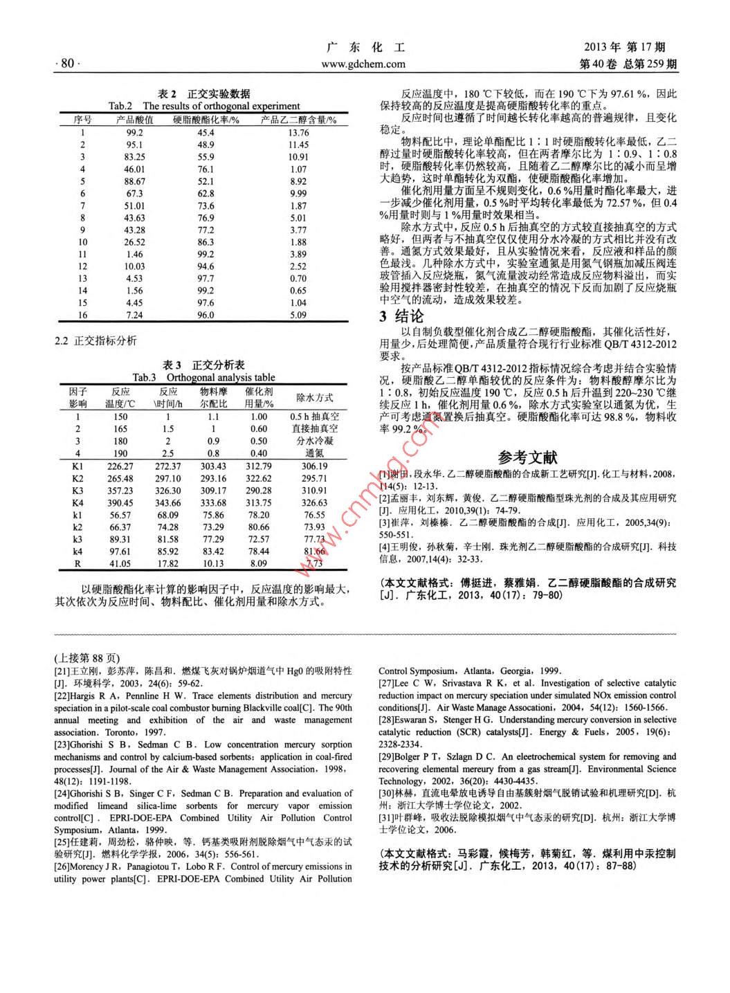 2013年第17期廣東化工第40卷總第259期www.gdchem.com乙二醇硬脂酸酯的合成研究傅挺進(jìn),蔡雅娟(瀘天化股份有限公司技術(shù)中心,四川瀘州646300)摘要]采用正交實(shí)驗(yàn)對(duì)影響乙二醇硬脂酸酯合成的因素做比較分析,實(shí)驗(yàn)發(fā)現(xiàn),采用自制負(fù)載型催化劑,能夠用較少的乙二醇量合成合格產(chǎn)品,較優(yōu)的合成條件為:酸醇摩爾比1:0.8,初始反應(yīng)溫度190℃,反應(yīng)0.5h后升溫到220-230℃繼續(xù)反應(yīng)1h,催化劑用量06%,硬脂酸酯化率可達(dá)988%,物料收率99.2%。[關(guān)鍵詞]乙二醇硬脂酸酯;珠光劑;單酯;合成[中圖分類(lèi)號(hào)TQ016.1[文獻(xiàn)標(biāo)識(shí)碼]A[文章編號(hào)]10071865(2013)17-0079-02Synthesis Study of Glycol StearateFu Tingjin, Cai Ya(Lutianhua CO, Ltd, Luzhou 646300, China)Abstract: Orthogonal experiment is conducted to compare and analyze the factors effecting the compound of ethylene glycol stearate, the experiment resultshowed that self-made supported catalyst was available to compound qualified products with less ethylene glycol, optimum synthesis conditions were: acid alcoholmole ratio 1: 0.8, the initial reaction temperature 190 C, react 0.5 h, the reaction temperature was raised to 220-230 C continue to react Ih, the amount of catalyst0.6%reaching a esterification rate of 98.8%for stearic acid, and material yield rate of.2%Keywords: glycol stearate: pearling agent; monoester; synthesis無(wú)毒、生物降解性好,原料豐富且價(jià)格低。利用其乳化性能,工物料收率會(huì)因此明顯降低。經(jīng)筆者實(shí)驗(yàn),無(wú)論物料配比、反應(yīng)溫業(yè)上可用作潤(rùn)滑劑和脫模劑,食品行業(yè)方面且具備一定的防腐抗度和不同的除水方式(通氮除水、冷凝回流、真空抽濾),未發(fā)生菌功效。此外還可作為分散劑、增溶劑、潤(rùn)滑劑、抗靜電劑等物料暴沸溢出情況且未洗滌處理的試驗(yàn)樣,其物料收率在98.7但其主要用途是在液體洗滌劑中,參考加入量1%2%,能明顯%994%范圍。若物料收率大于1,則說(shuō)明物料反應(yīng)量很少且反增加產(chǎn)品的珠光效果,且能增加產(chǎn)品的黏度,具有滋潤(rùn)皮膚、養(yǎng)應(yīng)溫度較低。發(fā)護(hù)發(fā)的功效。與其它類(lèi)型的表面活性劑的相溶性好,能體現(xiàn)其加入的硬脂酸量-產(chǎn)品量x產(chǎn)品酸值/硬脂酸酸值穩(wěn)定的珠光效果和增稠調(diào)理的功能。相比而言乙二醇硬脂酸雙酯硬脂酸酯化率%加入的硬脂酸量產(chǎn)生的珠光較強(qiáng)烈,而單酯產(chǎn)生的珠光更為細(xì)膩。物科收率=催化劑量近年研究乙二醇硬脂酸酯的報(bào)道主要集中在不同類(lèi)型催化劑反應(yīng)前物料總重(不完全反應(yīng)理論生成水星100的實(shí)驗(yàn)應(yīng)用,比較分析其硬脂酸酯化率的大小,進(jìn)一步降低產(chǎn)多資料中硬脂酸酯化率以物料初始酸值和反應(yīng)后產(chǎn)品酸值品色澤和提高工藝的環(huán)保性能,此外也有專門(mén)針對(duì)產(chǎn)品在化妝品的差異來(lái)計(jì)算,筆者認(rèn)為存在誤差,因?yàn)榉磻?yīng)前后的量并不相行業(yè)及應(yīng)對(duì)高剪切作用下珠光效果的持續(xù)性研究等。本文主要等利用自制負(fù)載型催化劑,優(yōu)化合成條件,并綜合考慮生產(chǎn)應(yīng)用情表1乙二醇硬脂酸單酯正交表1實(shí)驗(yàn)部分col stearate o實(shí)驗(yàn)反應(yīng)應(yīng)酸醇摩催化劑1.1試劑與儀器編號(hào)溫度℃時(shí)間h配比用量%除水方式試劑:乙二醇(分析純)、硬脂酸(印尼1801)、自制負(fù)載型催化劑1:1.11.00.5h抽真空儀器:S312-40數(shù)顯恒速攪拌器(配置雙葉四氟攪拌漿)1:1.00.6直接抽真空SHM-型數(shù)顯恒溫?cái)嚢杓訜崽?、PL4002梅特勒電子天平、SHBⅢ23456150l:090.5分水冷凝型循環(huán)水多用真空泵。2.121:0.80.4通氮12實(shí)驗(yàn)方法16l:1.00.5硬脂酸,乙二醇和催化劑經(jīng)電子天平稱量計(jì)量后,依次加入分水冷凝四口燒瓶(已稱重)中,并將燒瓶固定在數(shù)顯加熱套方盒中,接好l:0.8直接抽真空攪拌器、分水器(分水器上接冷凝管)、熱電阻溫度計(jì)套管(數(shù)顯加7891:090.605h抽真空熱套溫度反饋用)、水銀溫度計(jì)(實(shí)測(cè)反應(yīng)液溫度),加熱,物料完1:0.904直接抽真空全熔化后開(kāi)啟攪拌器并使攪拌速度固定在300r/min,繼續(xù)升溫到1801.51:0.80.50.5h抽真空定反應(yīng)溫度(水銀溫度計(jì)實(shí)測(cè)反應(yīng)液溫度)并保持?jǐn)?shù)顯加熱套溫控穩(wěn)定,開(kāi)始計(jì)時(shí),反應(yīng)完畢后將四口燒瓶取下稱重,催化劑沉o1231:1.10.通氮分水冷凝1:0.80.6分水冷凝規(guī)定分析方法取樣分析。140.91.0通氮13實(shí)驗(yàn)方案045h抽真空按上述確定的各影響因素的水平,制定L6(45)正交表,具體5直接抽真空如表1。注:反應(yīng)時(shí)間以實(shí)測(cè)反應(yīng)溫度達(dá)到預(yù)定反應(yīng)溫度后計(jì);催化劑用量以硬14產(chǎn)品標(biāo)準(zhǔn)和分析方法脂酸質(zhì)量計(jì)乙二醇硬脂酸酯的分析指標(biāo)及分析方法按QBT4312-2012規(guī)定的方法執(zhí)行。2數(shù)據(jù)分析實(shí)驗(yàn)中常用指標(biāo)有酸值醇含量和物料收率,實(shí)驗(yàn)過(guò)程2實(shí)驗(yàn)數(shù)據(jù)常用釋水量多少判斷反應(yīng)進(jìn)行程度。本文不采用熱水洗滌反應(yīng)上述正交實(shí)驗(yàn)數(shù)據(jù)如表2樣品的方法,并綜合考慮硬脂酸酯化率、產(chǎn)品乙二醇含量、物料收