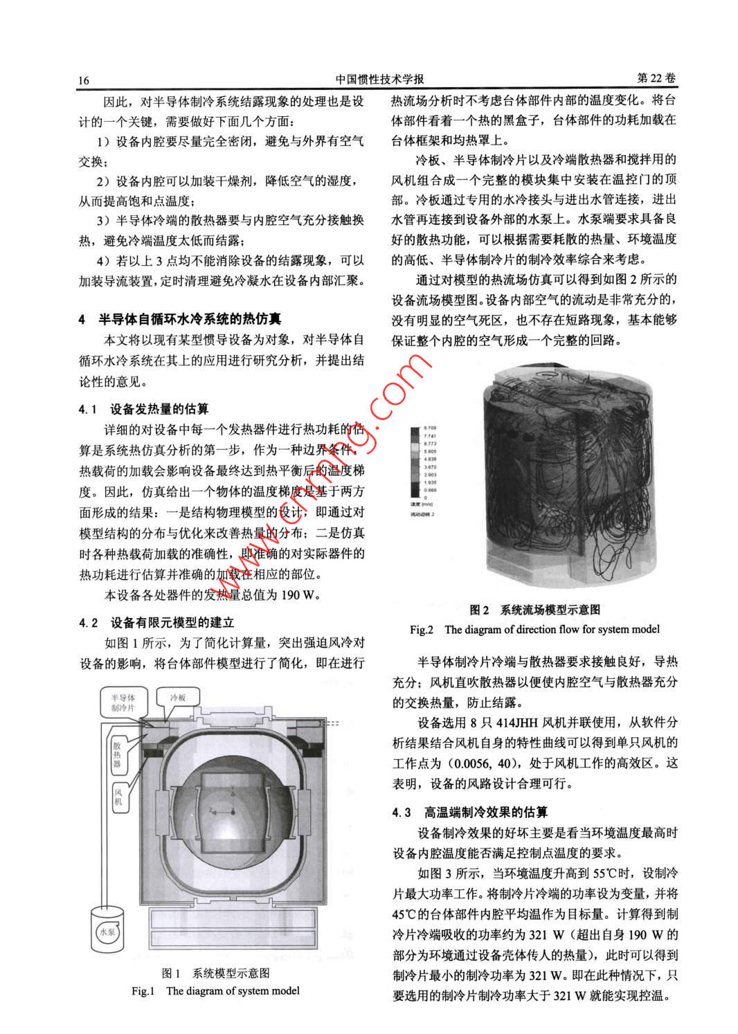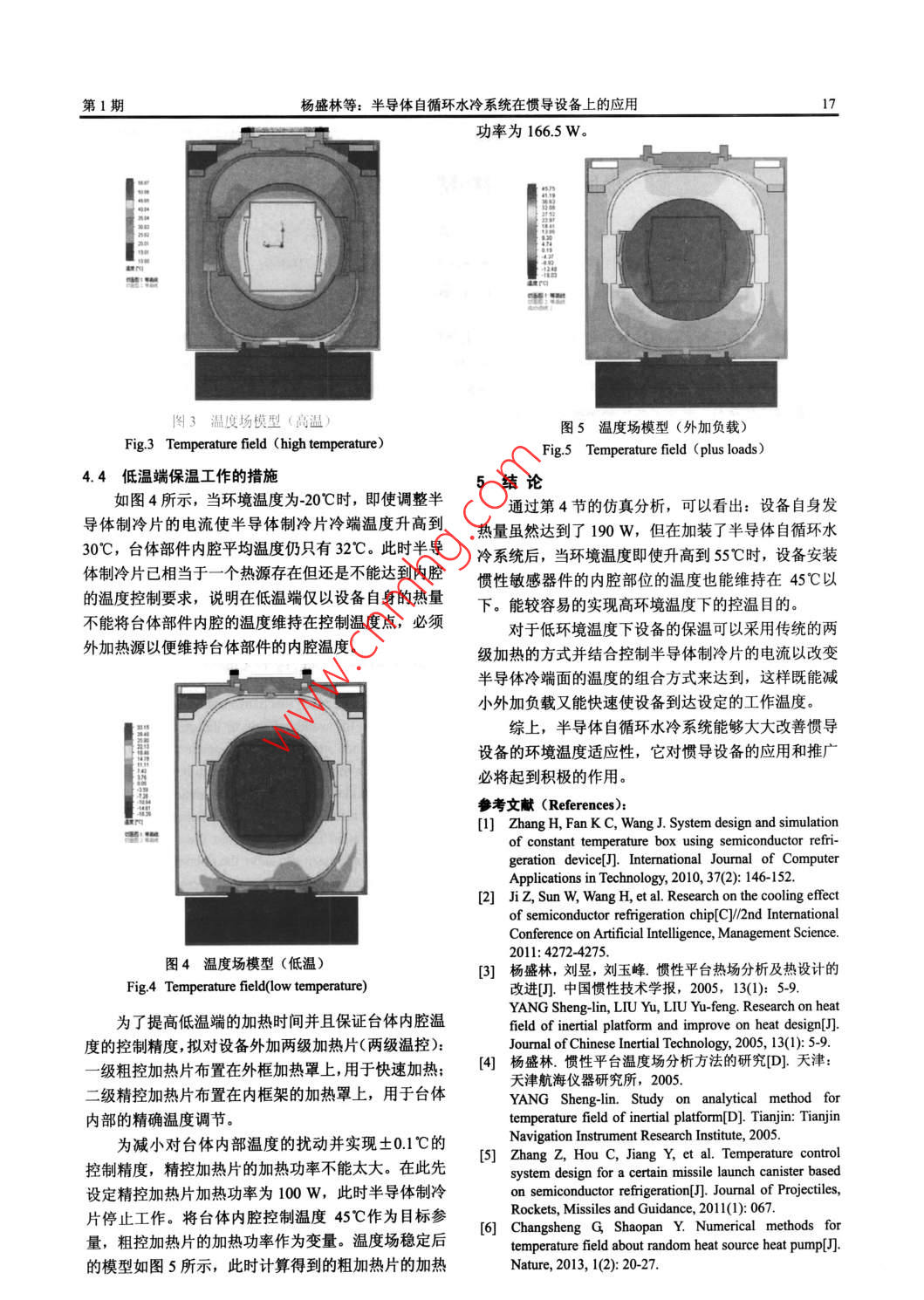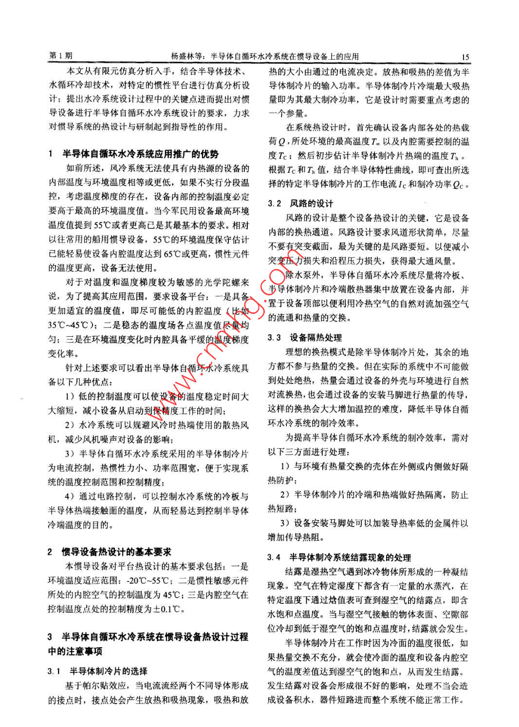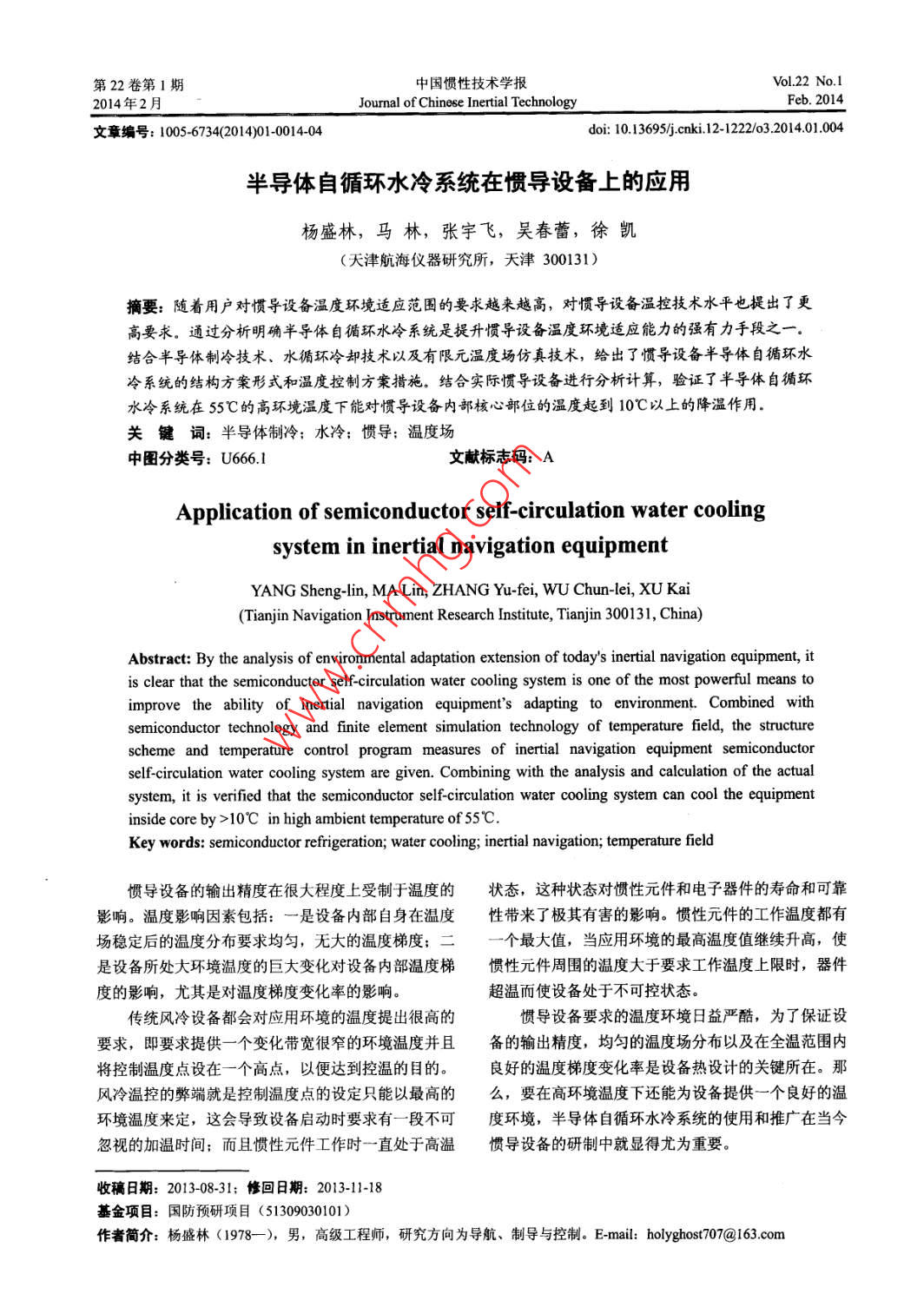 第22卷第1期中國(guó)慣性技術(shù)學(xué)報(bào)Vol.22 No.12014年2月.Jourmal of Chinese Inertial TechnologyFeb. 2014文章編號(hào): 1005-6734(2014)01-0014-04doi: 10.13695/j.cnki.12- 122/03.2014.01.004半導(dǎo)體自循環(huán)水冷系統(tǒng)在慣導(dǎo)設(shè)備.上的應(yīng)用楊盛林,馬林,張宇飛,吳春蕾,徐凱(天津航海儀器研究所,天津300131)摘要:隨著用戶對(duì)慣導(dǎo)設(shè)備溫度環(huán)境適應(yīng)范圍的要求越來(lái)越高,對(duì)慣導(dǎo)設(shè)備溫控技術(shù)水平也提出了更高要求。通過(guò)分析明確半導(dǎo)體自循環(huán)水冷系統(tǒng)是提升慣導(dǎo)設(shè)備溫度環(huán)境適應(yīng)能力的強(qiáng)有力手段之- -.結(jié)合半導(dǎo)體制冷技術(shù)、水循環(huán)冷卻技術(shù)以及有限元溫度場(chǎng)仿真技術(shù),給出了慣導(dǎo)設(shè)備半導(dǎo)體自循環(huán)水冷系統(tǒng)的結(jié)構(gòu)方案形式和溫度控制方案措施。結(jié)合實(shí)際慣導(dǎo)設(shè)備進(jìn)行分析計(jì)算,驗(yàn)證了半導(dǎo)體自循環(huán)水冷系統(tǒng)在55C的高環(huán)境溫度下能對(duì)慣導(dǎo)設(shè)備內(nèi)部核心部位的溫度起到10C以上的降溫作用。關(guān)鍵詞:半導(dǎo)體制冷;水冷;慣導(dǎo);溫度場(chǎng)中圖分類號(hào): U666.1文獻(xiàn)標(biāo)志碼: AApplication of semiconductor self-circulation water coolingsystem in inertial navigation equipmentYANG Sheng-lin, MA Lin, ZHANG Yu-fei, WU Chun-lei, XU Kai(Tianjin Navigation Instrument Research Institute, Tianjin 300131, China)Abstract: By the analysis of environmental adaptation extension of today's inertial navigation equipment, itis clear that the semiconductor self-circulation water cooling system is one of the most powerful means toimprove the ability of inertial navigation equipment's adapting to environment. Combined withsemiconductor technology and finite element simulation technology of temperature field, the structurescheme and temperature control program measures of inertial navigation equipment semiconductorself- circulation water cooling system are given. Combining with the analysis and calculation of the actualsystem, it is verified that the semiconductor self-circulation water cooling system can cool the equipmentinside core by >10C in high ambient temperature of55"C.Key words: semiconductor rfrigeration; water cooling; inertial navigation; temperature field慣導(dǎo)設(shè)備的輸出精度在很大程度上受制于溫度的狀態(tài),這種狀態(tài)對(duì)慣性元件和電子器件的壽命和可靠影響。溫度影響因素包括:-是設(shè)備內(nèi)部自身在溫度性帶來(lái)了極其有害的影響。慣性元件的工作溫度都有場(chǎng)穩(wěn)定后的溫度分布要求均勻,無(wú)大的溫度梯度;二一個(gè)最大值,當(dāng)應(yīng)用環(huán)境的最高溫度值繼續(xù)升高,使是設(shè)備所處大環(huán)境溫度的巨大變化對(duì)設(shè)備內(nèi)部溫度梯慣性元件周圍的溫度大于要求工作溫度上限時(shí),器件度的影響,尤其是對(duì)溫度梯度變化率的影響。超溫而使設(shè)備處于不可控狀態(tài)。傳統(tǒng)風(fēng)冷設(shè)備都會(huì)對(duì)應(yīng)用環(huán)境的溫度提出很高的慣導(dǎo)設(shè)備要求的溫度環(huán)境日益嚴(yán)酷,為了保證設(shè)要求,即要求提供一個(gè)變化帶寬很窄的環(huán)境溫度并且備的輸出精度,均勻的溫度場(chǎng)分布以及在全溫范圍內(nèi)將控制溫度點(diǎn)設(shè)在一個(gè)高點(diǎn),以便達(dá)到控溫的目的。良好的溫度梯度變化率是設(shè)備熱設(shè)計(jì)的關(guān)鍵所在。那風(fēng)冷溫控的弊端就是控制溫度點(diǎn)的設(shè)定只能以最高的么,要在高環(huán)境溫度下還能為設(shè)備提供-一個(gè) 良好的溫環(huán)境溫度來(lái)定,這會(huì)導(dǎo)致設(shè)備啟動(dòng)時(shí)要求有一-段不可度環(huán)境,半導(dǎo)體自循環(huán)水冷系統(tǒng)的使用和推廣在當(dāng)今忽視的加溫時(shí)間;而且慣性元件工作時(shí)-直處于高溫慣導(dǎo)設(shè)備的研制中就顯得尤為重要。收稿日期: 2013-08-31; 修回日期: 2013-11-18基金項(xiàng)目:國(guó)防預(yù)研項(xiàng)目(51309030101)作者簡(jiǎn)介:楊盛林(1978-),男,高級(jí)工程師,研究方向?yàn)閷?dǎo)航、制導(dǎo)與控制。E-mail: holyghost707@163.com第1期楊盛林等:半導(dǎo)體自循環(huán)水冷系統(tǒng)在慣導(dǎo)設(shè)備上的應(yīng)用5本文從有限元仿真分析入手,結(jié)合半導(dǎo)體技術(shù)、熱的大小由通過(guò)的電流決定。放熱和吸熱的差值為半水循環(huán)冷卻技術(shù),對(duì)特定的慣性平臺(tái)進(jìn)行仿真分析設(shè)導(dǎo)體制冷片的輸入功率。半導(dǎo)體制冷片冷端最大吸熱計(jì):提出水冷系統(tǒng)設(shè)計(jì)過(guò)程中的關(guān)鍵點(diǎn)進(jìn)而提出對(duì)慣量即為其最大制冷功率,它是設(shè)計(jì)時(shí)需要重點(diǎn)考慮的導(dǎo)設(shè)備進(jìn)行半導(dǎo)體自循環(huán)水冷系統(tǒng)設(shè)計(jì)的要求,力求一個(gè)參量。對(duì)慣導(dǎo)系統(tǒng)的熱設(shè)計(jì)與研制起到指導(dǎo)性的作用。在系統(tǒng)熱設(shè)計(jì)時(shí),首先確認(rèn)設(shè)備內(nèi)部各處的熱載荷Q,所處環(huán)境的最高溫度T。以及內(nèi)腔需要控制的溫1半導(dǎo)體自 循環(huán)水冷系統(tǒng)應(yīng)用推廣的優(yōu)勢(shì)度Tc;然后初步估計(jì)半導(dǎo)體制冷片熱端的溫度Tn。如前所述,風(fēng)冷系統(tǒng)無(wú)法使