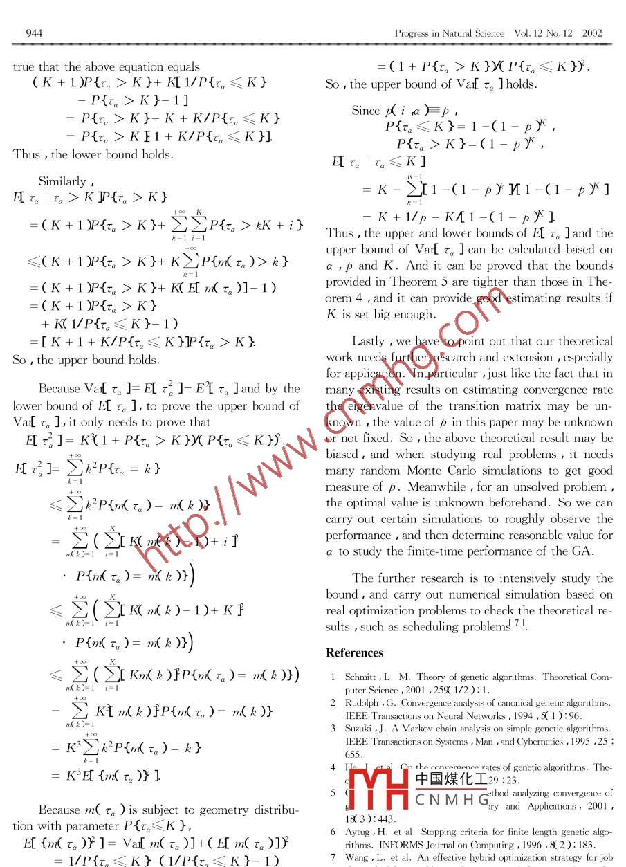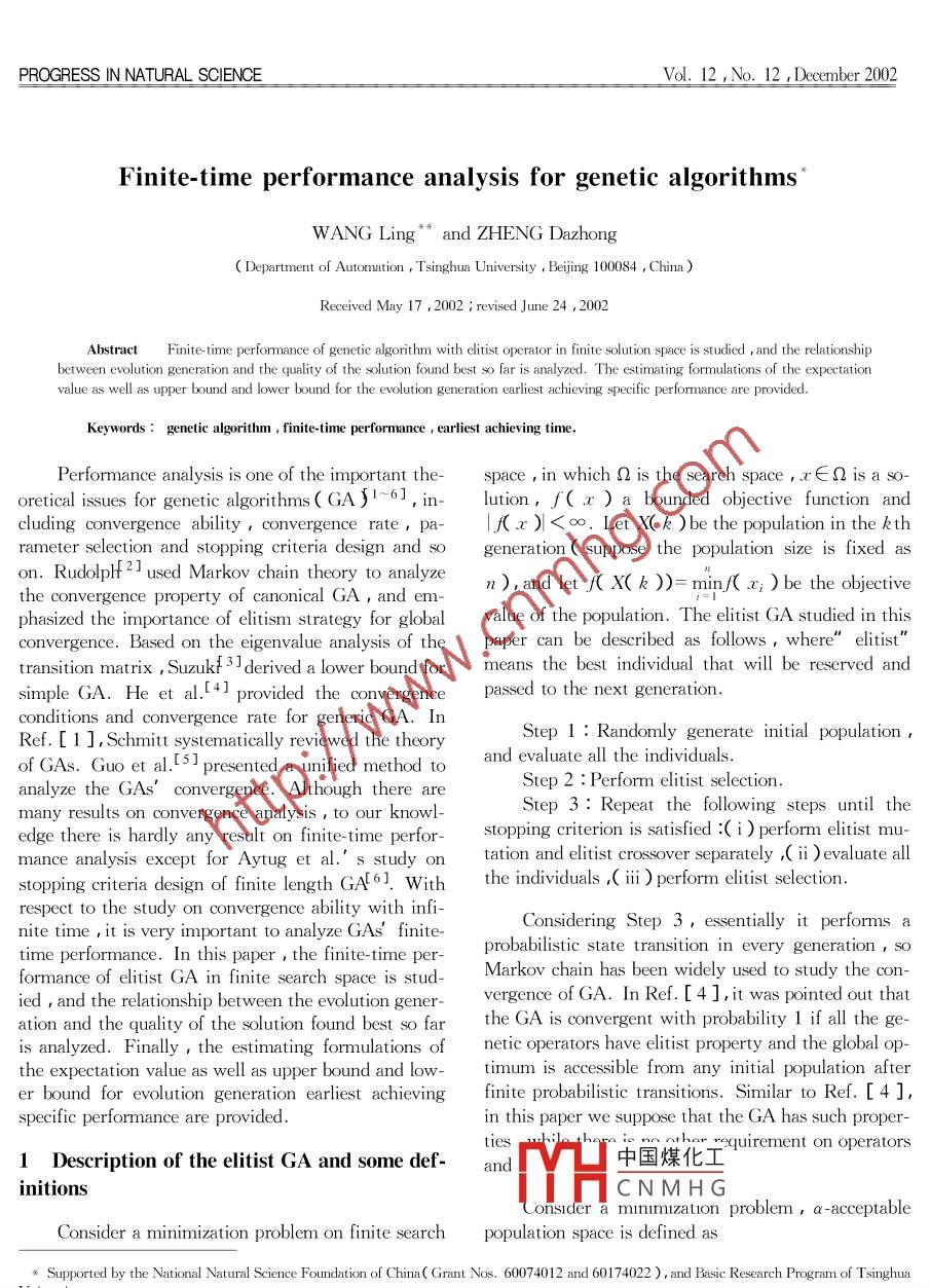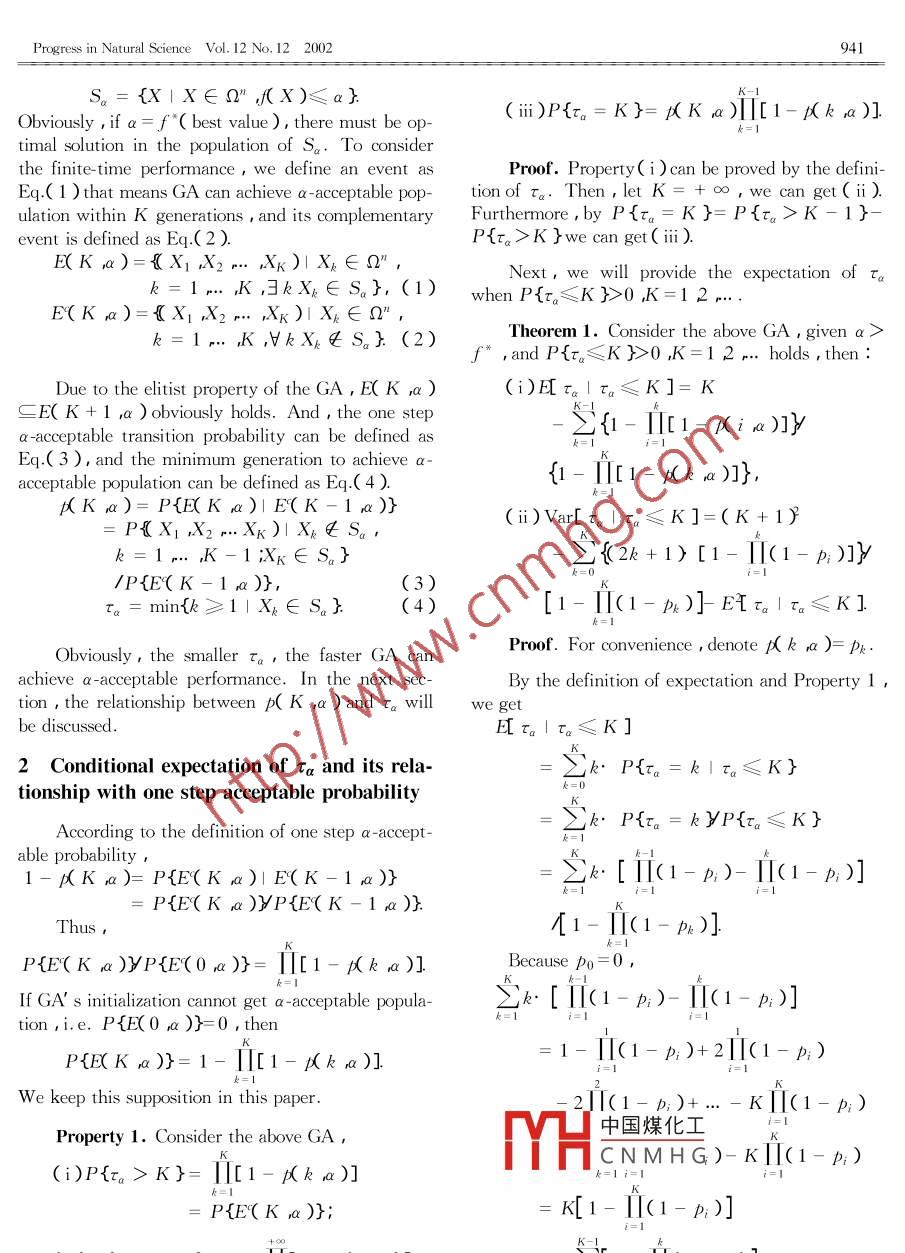 PROGRESS IN NATURAL SCIENCEVol. 12 ,No. 12 , December 2002Finite-time performance analysis for genetic algorithms'WANG Ling* and ZHENG Dazhong( Department of Automation , Tsinghua University , Bejing 100084 , China )Received May 17 ,2002 ;revised June 24 , 2002between evolution generation and the quality of the solution found best so far is analyzed. The estimating formulations of the expectationvalue as well as upper bound and lower bound for the evolution generation earliest achieving specific performance are provided.Keywords : genetic algorithm , finite-time performance , earliest achieving time.Performance analysis is one of the important the-space , in which 02 is the search space x∈∩is a so-oretical issues for genetic algorithms( GA{1~6] ,in-lution,f( x ) a bounded objective function andcluding convergence ability ,convergence rate , pa-|f(x )|<∞. Let X( k )be the population in the kthrameter selection and stopping criteria design and sogeneration ( suppose the population size is fixed ason. RudolpHt 21 used Markov chain theory to analyzen ),and let f( X( k ))= minf( x; ) be the objectivethe convergence property of canonical GA , and em-phasized the importance of elitism strategy for globalvalue of the population. The elitist GA studied in thisconvergence. Based on the eigenvalue analysis of thepaper can be described as follows , where" elitist'transition matrix , Suzukf 3] derived a lower bound formeans the best individual that will be reserved andsimple GA. He et al.L4) provided the convergencepassed to the next generation.conditions and convergence rate for generic GA. InStep 1 : Randomly generate initial population ,Ref. [ 1 ], Schmitt systematically reviewed the theoryof GAs. Guo et al.t51 presented a unified method toand evaluate all the individuals.Step 2 : Perform elitist selection.analyze the GAs' convergence. Although there areStep 3 : Repeat the following steps until themany results on convergence analysis , to our knowl-edge there is hardly any result on finite time perfor-stopping criterion is satisfied :( i ) perform elitist mu-mance analysis except for Aytug et al.' s study ontation and elitist crossover separately ,( ii ) evaluate allstopping criteria design of finite length GAL61 Withthe individuals ,( ii ) perform elitist selection.respect to the study on convergence ability with infi-Considering Step 3,essentially it performs anite time ,it is very important to analyze GAs' finite-time performance. In this paper , the finite-time per-probabilistic state transition in every generation ,soformance of elitist GA in finite search space is stud-Markov chain has been widely used to study the con-ied , and the relationship between the evolution gener-vergence of GA. In Ref.[4 ],it was pointed out thatation and the quality of the solution found best so farthe GA is convergent with probability 1 if all the ge-is analyzed. Finally , the estimating formulations ofnetic operators have elitist property and the global op-the expectation value as well as upper bound and low-timum is accessible from any initial population afterer bound for evolution generation earliest achievingfinite probabilistic transitions. Similar to Ref. [ 4 ],specific performance are provided.in this paper we suppose that the GA has such proper-1 Description of the elitist GA and some def-ties中國煤化工equirement on operatorsandinitionsMHCNMHG( onsider a mrnmuzation problem,a-acceptableConsider a minimization problem on finite searchpopulation space is defined as* Supported by the National Natural Science Foundation of China( Grant Nos.60074012 and 60174022 ) , and Basic Research Program of TsinghuaUrverivi,¥* To whotdence should be addressed. E-mail : wangling@ mail. tsinghua. edu. cnProgress in Natural Science Vol. 12 No.12 2002941S。= {X1X∈Q",f(X)≤a}(ii)P{r。= K}= μK a)II[1-Kk a)]Obviously ,if a=f*( best value), there must be op-k=1timal solution in the population of Sa. To considerthe finite- time performance , we define an event asProof. Property( i ) can be proved by the defini-Eq.( 1 ) that means GA can achieve a - acceptable pop-tionofτa.Then,letK=+∞,wecanget(i).ulation within K generations , and its complementaryFurthermore,by P{ta= K }= P{ra> K- 1 }-event is defined as Eq.( 2).P{tx>K }we can get( ii ).E(K ,a)={X; X2- Xk)| Xk∈Q”,Next, we will provide the expectation of Tak = 1.. ,K ,3kXk∈S.}, (1)when P{ra≤K }>0 ,K=1 2...E(K a)={X1 X2 r.. Xk)| Xk∈Q”,Theorem 1. Consider the above GA , given a >k=1..K,VkXptS。}(2)f* ,and P{ra≤K}>0 ,K=1 2... holds ,then :Due to the elitist property of theGA ,E(K ,a )(i)E[ra1 τa≤K]= KSE( K + 1 ,a ) obviously holds. And , the one step{1-I[1- Ki a)]}Ya -acceptable transition probability can be defined asEq.( 3 ), and the minimum generation to achieve a-acceptable population can be defined as Eq.(4 ).{1-T[1- (ke a)]},pK(Ka)=P{E(K,a)|E(K-1ra)}(i)Var[ ra1 τa≤K]=(K+ 1尸= P{(X1 ,Xz ..Xx)1Xpt S。,k =1. ,K-1 ;Xk∈S。}-之{(2k+1) [1- I[(1-p;)]}yk=0/P{E(K-1 ra )},(3)Ta=min{k≥1|X∈S。}(4 )[1-1[(1-px)]ETr。Iτ.≤K]Proof. For convenience ,denote μk ,a )= Pk.Obviously,the smaller Ta , the faster GA canachieve a -acceptable performance. In the next sec-By the definition of expectation and Property 1 ,tion , the relationship between p( K ,a ) and Ta willwe getbe discussed.E τ。| ra≤K]2 Conditional expectation of Ta and its rela-: 2k. P{ra = k |τa≤K}tionship with one step acceptable probability2k. P{r。= kYP{r?!躃}According to the definition of one step a -accept-able probability.1- p(K a)= P{E(K a)| E(K-1 a)}之k [i(1-p;)- 1(1-p,)]i=1= P{E( K a)}P{E( K- 1 ra )}.Thus,/[1-11(1-px)]P{E'(K a)YP{E(0a)}= [1- f(k a)]Because po=0 ,If GA' s initialization cannot get a -acceptable popula-Zk[i(1-p;)- 1(1-p;)]tion ,i.e. P{E(0 ra )}=0 , then= 1-1[(1- p;)+2H[(1- p;)P{E(K xa)}= 1-1[1- μ(k a)]We keep this supposition in this paper.2J[(1- p;)+..-KI[(1- p;)中國煤化工Property 1. Consider the above GA ,MHCN MHG)- kI[(1- p;)k=1 i=1(i)P{