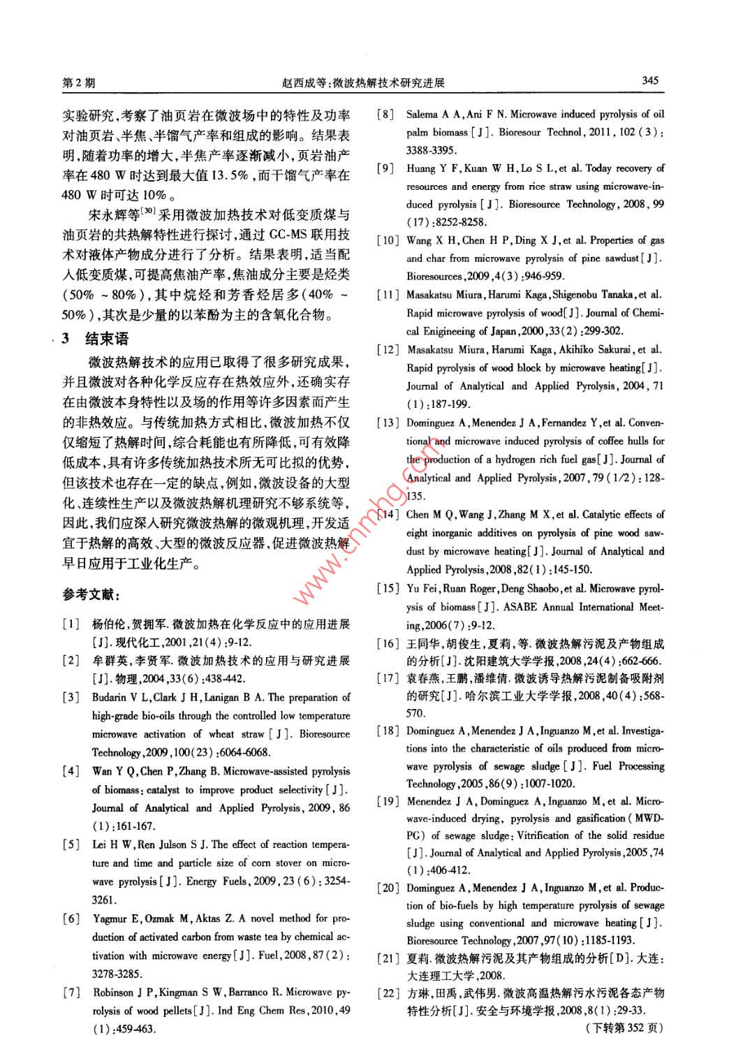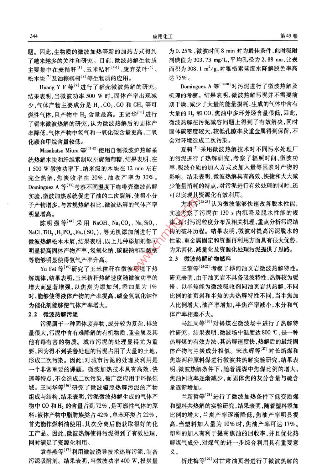 第43卷第2期應(yīng)用化工Vol 43 No. 22014年2月Applied Chemical IndustryFeb.2014專(zhuān)論與綜述3微波熱解技術(shù)研究進(jìn)展趙西成,李兆2,王力,苗波波31.西安建筑科技大學(xué)冶金工程學(xué)院陜西西安710052西安建筑科技大學(xué)材料與礦資學(xué)院陜西西安71005;3.西安建筑科技大學(xué)理學(xué)院陜西西安710055)摘要:綜述了國(guó)內(nèi)外關(guān)于微波熱解技術(shù)應(yīng)用的研究進(jìn)展探討了生物質(zhì)污泥、礦物燃料等通過(guò)微波加熱制取高附加值化學(xué)品的方法及其機(jī)理并且微波熱解存在非熱效應(yīng)是一條值得探索的資源有效利用的高效熱解方法。關(guān)鍵詞:微波熱解;生物質(zhì);污泥;礦物燃料中圖分類(lèi)號(hào):TQ51;T6文獻(xiàn)標(biāo)識(shí)碼:A文章編號(hào)1671-3206(2014)02-0343-03Research advances on microwave pyrolysisZHAO Xi-cheng, LI Zhao, WANG Li', MIAO Bo-bo3(1. College of Metallurgical Engineering, Xi'an University of Architecture and Technology, Xi'an710055,China2. College of Materials and Mineral Resources, Xi'an University of Architecture and Technology, Xi'an 710055, China3. School of Science, Xi an University of Architecture and Technology, Xi'an 710055,ChinaAbstract: The progress of the application of microwave pyrolysis in China and oversea was reviewed.Themethods and mechanism were introduced about producing high value-added chemicals through microwaveheating of biomass, sludge and fossil fuel. The microwave pyrolysis could be a way worthing tothe efficient fast pyrolysis about resources utilization of validityKey words: microwave pyrolysis; biomass; sludge; fossil fuel微波是一種頻率在300MHz~300GH的電磁稱(chēng)為“體加熱”,使加熱更快速、均勻,大大改善了加波微波加熱是物料在電磁場(chǎng)中將自身吸收的微波熱質(zhì)量。微觀上,當(dāng)微波作用到物質(zhì)上時(shí),介質(zhì)材料能轉(zhuǎn)化為物質(zhì)的熱能屬于體積性加熱。而常規(guī)加中會(huì)形成偶極子,已有的偶極子會(huì)重新排列并隨著熱時(shí),外部熱源通過(guò)傳導(dǎo)與對(duì)流的方式,使熱量由外高頻交變電磁場(chǎng)以每秒高達(dá)數(shù)億次的速度振動(dòng)。分部傳到內(nèi)部不僅效率低下,而且導(dǎo)致溫度分布不均子要隨著不斷變化的高頻電磁場(chǎng)的方向重新排列,(外高內(nèi)低)。相比于常規(guī)的加熱方式微波加熱具而分子具有一定熱運(yùn)動(dòng)及分子之間存在相互干擾,有即時(shí)性、整體性、選擇性、高效性和安全無(wú)污染等從而發(fā)生摩擦。在這一微觀過(guò)程中,微波能量轉(zhuǎn)化諸多優(yōu)點(diǎn)。微波加熱作為一種全新的加熱方式,已為介質(zhì)的熱量,宏觀的表現(xiàn)就是介質(zhì)溫度升高。經(jīng)在很多領(lǐng)域得到應(yīng)用。與傳統(tǒng)加熱方式相比,微波加熱具有加熱速度1微波熱解的基本原理及特點(diǎn)快、均勻加熱、節(jié)能高效、易于控制、能夠選擇性加熱微波加熱作為新的熱能技術(shù)加熱材料內(nèi)部受并且安全無(wú)害。到微波輻射后材料內(nèi)部可動(dòng)粒子得以加速運(yùn)動(dòng),相2微波熱解技術(shù)應(yīng)用現(xiàn)狀互之間得以碰撞及摩擦后物料內(nèi)部產(chǎn)生高熱效。而21微波熱解生物質(zhì)在一般高溫?zé)峤夥绞街?熱量是從表面向內(nèi)部傳遞生物質(zhì)能是人類(lèi)賴(lài)以生存的重要能源,具有重從而表面的溫度大于內(nèi)部的溫度。而在微場(chǎng)中溫要地位。對(duì)生物質(zhì)進(jìn)行熱解制備得到合成氣、生物度梯度剛好相反,其熱量產(chǎn)生于介質(zhì)內(nèi)部然后向周油等替代燃料,是當(dāng)今一個(gè)研究熱點(diǎn)。然而傳統(tǒng)加圍空間散發(fā),表面溫度低于中心溫度。微波加熱又熱方式存在著環(huán)境污染、生物質(zhì)能利用水平低等問(wèn)收稿日期:2013-11-17修改稿日期:20131基金項(xiàng)目:國(guó)家高技術(shù)研究發(fā)展計(jì)劃(863計(jì)劃)資助項(xiàng)目(2011A05A202)作者簡(jiǎn)介:趙西成(1951-)男河南新鄭人,西安建筑科技大學(xué)教授博士生導(dǎo)師,主要從事材料加工方面的研究。電ie:029-82201750,E-mail:zhaoxjd@163.com應(yīng)用化工第43卷題。因此,生物質(zhì)的微波加熱等新的加熱方式得到為0.25%,微波時(shí)間8mn時(shí)為最佳條件,此時(shí)吸附了越來(lái)越多的關(guān)注和研究。目前微波熱解生物質(zhì)劑碘值為303.73mg/L,平均孔徑為2.88mm,比表主要集中在麥秸稈3、玉米秸稈431、廢棄茶葉°、面積為308.1m2/g,對(duì)雅格素藍(lán)廢水降解脫色率高松木塊及油棕櫚樹(shù)。等生物質(zhì)的應(yīng)用。達(dá)75%。Huang Y F等”進(jìn)行了稻殼微波熱解的研究。Dominguez A等1對(duì)污泥進(jìn)行了微波熱解及結(jié)果表明,當(dāng)微波功率500W時(shí),固體產(chǎn)率出現(xiàn)減機(jī)理的考察。結(jié)果表明,微波熱解污泥并不需要前少,氣體產(chǎn)物主要成分是H2、CO2、CO和CH4等可期干燥減少了大量的能量損耗生成的氣體中含有燃性氣體,且產(chǎn)物中H2含量最高。王賢華進(jìn)行大量的H2和CO,焦油中多環(huán)芳烴含量很低,因此,了鋸末微波熱解的研究,認(rèn)為微波熱解后的固體產(chǎn)微波熱解在污泥減容問(wèn)題上得到了有效解決,同時(shí)率降低,氣體產(chǎn)物中氫氣和一氧化碳含量更高,二氧固體碳密度較大較低孔隙率及重金屬得到保留,不化碳和甲烷含量較低。會(huì)對(duì)環(huán)