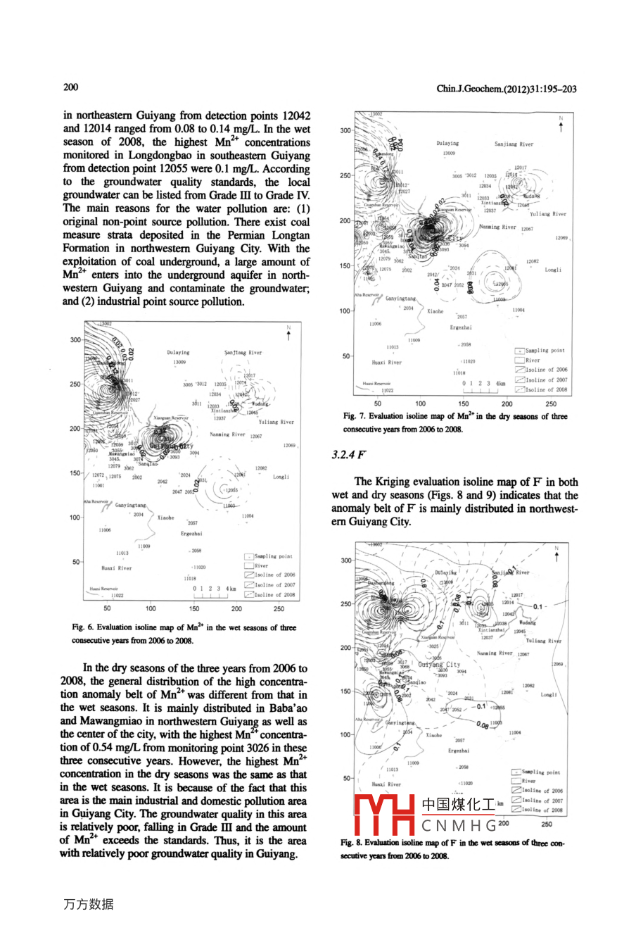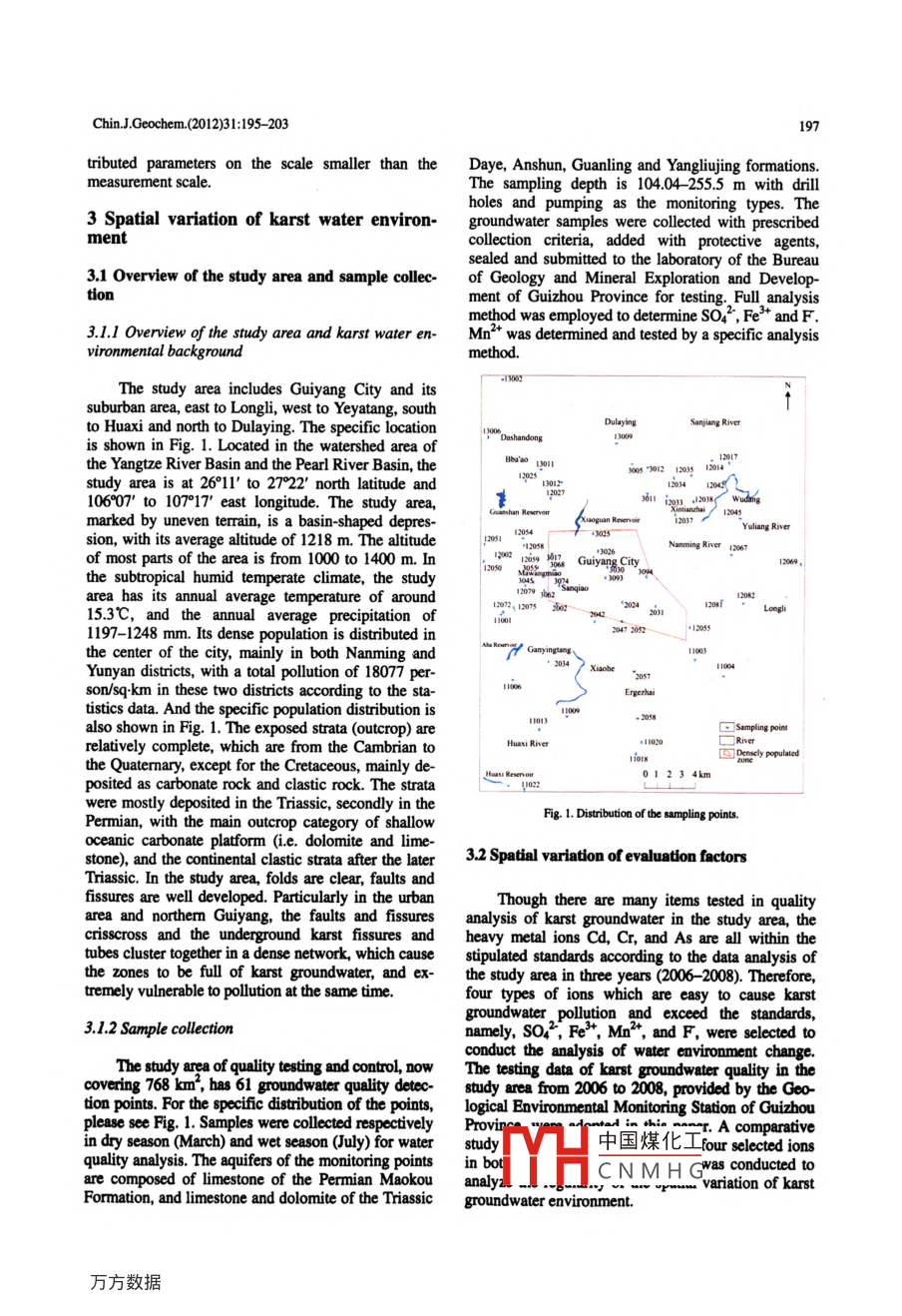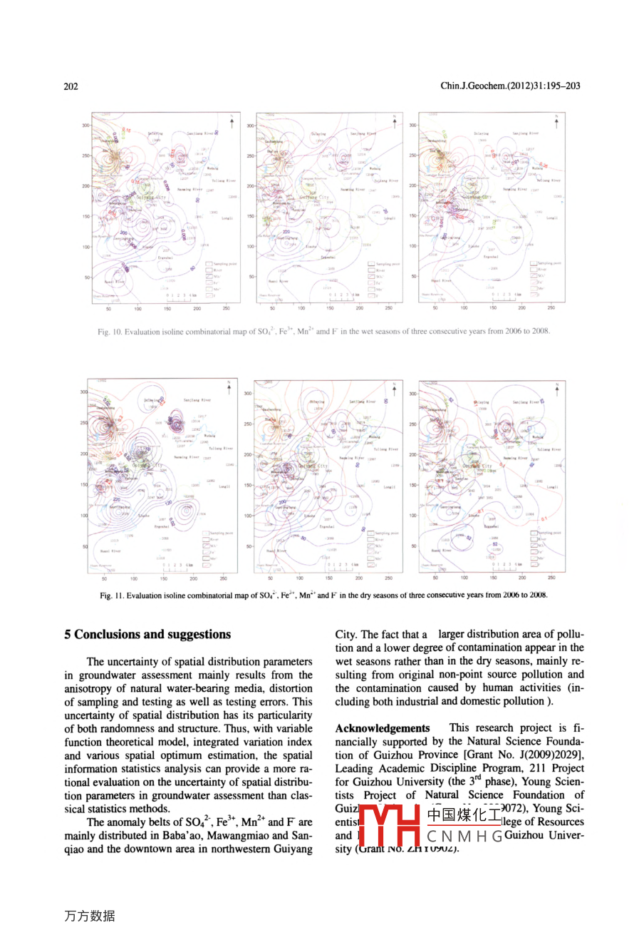 Chin.JGeochem.(2012)31:195- 203DOL: 10.1007/511631-012-0568-0Combinatorial analysis on spatial informationstatistics for the karst water environment inGuiyang, ChinaWANG Zhongmeil' , ZHU Lijun' , YANG Ruidong'. YANG Shengyuan', DING Jianping', and YANG Genlan'' College of Resources and Envionmental Engineering of Gutzhou Universiry, Giuiyang 50003, China2 Key Laboralory of Karsi Enmironment and Geohazard Preverion (Guizhou Universiry,. Ministry of Educarion, Gulyang 50003,. China3 Gwizhou lnsiute of Geological Environment Monion, Guiyang 50001.0 China●Coresponding author, E-mail: re.zmwang@gzu.edu.cnReceived September 19, 2010; accepted October 20. 2010◎Science Press and Institute of Gcochemistry. CAS and Springer-Verlag Berlin Heidelberg 2012Abstract The karst groundwater system is extremely vulnerable and easily contaninaled by human activities. Toundersland the spatial distribution of contaminants in the groundwater of karst urban areas and contributors to thecontamination, this paper employs the spatial informnation statistics analysis theory and method to analyze the karstgroundwater environment in Guiyang City. Based on the karsl groundwater quality data detected in 61 detectionpoints of the research area in the last three years, we made Kriging evaluation isoline map with some ions in the karstgroundwater, such as so. , Fe'*, Mn2+ and F, analyzed and evaluated the spatial distribution, extension and varia-tion of four types of ions on the basis of this isoline map. The results of the analysis show that the anomaly areas ofsoz",Fe2*, Mn2*.F and other ions are mainly located in Baba' a0. Mawangmiao and Sanqiao in northwestern Gui-yang City as well as in its downtown area by reasons of the original non-point source pollution and the contamina-tion caused by human activities (indutial and domestic pollution).Key words karst water environment; spaial information saisics; analysis1 Introductionshortage. Among its limited water resources, ground-water is the main source of water supply with theGuizhou Province is located in the heart of theamount of karst water over 90%. Therefore, we shouldkarst area of Southwest China. It covers a karst area ofprotect the limited water resource for local people's129600 km', accounting for 73.4% of the total area.health condition and sustainable development of Gui-The groundwalter system of Guiyang City is a typicalyang City. This paper attempts to analyze and evaluatekarst water system which is generally acknowledgedthe spatial distribution, extension and variation of theto be extremely vulnerable to the contaminationSO4", Fe", Mn' and F pollution sources in the karstcaused by human activities (Liang Yunchao et al..groundwater of Guiyang City.2008). With the development of Guiyang's economy,coal mining, industrial waste and municipal wastewa-bution randomness of evaluation parameters is theter poison the karst groundwater system. Especiallymajor factor that causes the uncertainty of waterthe pollution caused by coal mining makes the con-evaluation models (Sun Nazheng, 1989). The issue ofcentration values of so2, Fe'*, Mn2+ and F in thehow to quantify the randomness of various spatial dis-karst groundwater exceed the national standards.tribution parameters in groundwater environmentMoreover, the industrial waste discharged from theevaluation so as to ensure the reliability of utilizingprocesses of desulfurization and defluorination bythe evaluation models becomes crucial. Previous sta-cement plants, aluminium plants, tire factories, ther-tistical methods based on traditional simulation mod-mal powder plants and gas companies in Guiyang Cityels中國(guó)煤化工lics can no longerwill contributea lot to SO4 , Fe"*, Mn2* and F pollu-provithe spatial varia-tion of the karst groundwater. Meanwhile, municipaltionCNMHGdly use single de-MHsewage will cause F pollution in the groundwater. Onterministic models or complete stochastic models tothe other hand, Guiyang is a city of severe wateraccurately describe the spatial distribution uncertaintywww.gyig.ac.cn ww w.springerink .com勾Springer.196Chin.J.Geochem.(2012)31:195- 203of various parameters in water environmental assess-2.2 Evaluation model of spatial information statis-ment. Nevertheless, based on regionalized variableticstheory, spatial informnation statistics with variablefunction as its main tool is the science to study naturalThe model applied to analyzing the spatial varia-phenomena with randomness and structural character-tion of parameters in water environmental assessmentistics in their spatial distribution (Wang Renduo andshould help provide the structural information aboutHu Guangdao, 1989). As a result of applying this newspatial distribution parameters in water environmentalstatistical method, the deficiency of classical statisticsassessment, and practically display the spatial correla-in analysis on randomness of spatial distribution pa-tion of various evaluated parameters as well as therameters in water environmental assessment can bereciprocal transformational and synergic relationshipremedied, the spatial structural information and thebetween their randomness and structural characteris-spatial optimum estimation of the distributed parame-tics within the relevant spatial coverage. In actualters can be gained, and the analysis and evaluation ofpractice, we usually provide corresponding theoreticalthe spatial distribution uncertainty of various parame-models for discrele data of variable functions, in orderters in water environmental assessment tends to beto produce a quantitative analysis on the spatial varia-more rational. This paper thus adopts the spatial in-tion of parameters in water environmental assessment.formnation statistics theory and method to analyze andThe frequently used models are Spherical Model,evaluate the karst groundwater environment in Gui-Gaussian Model and Exponential Model (Zhangyang City.Zhengtong and Liu Shuchun, 1999; Jourmel and Hui-jbregts, 1982). Gaussia