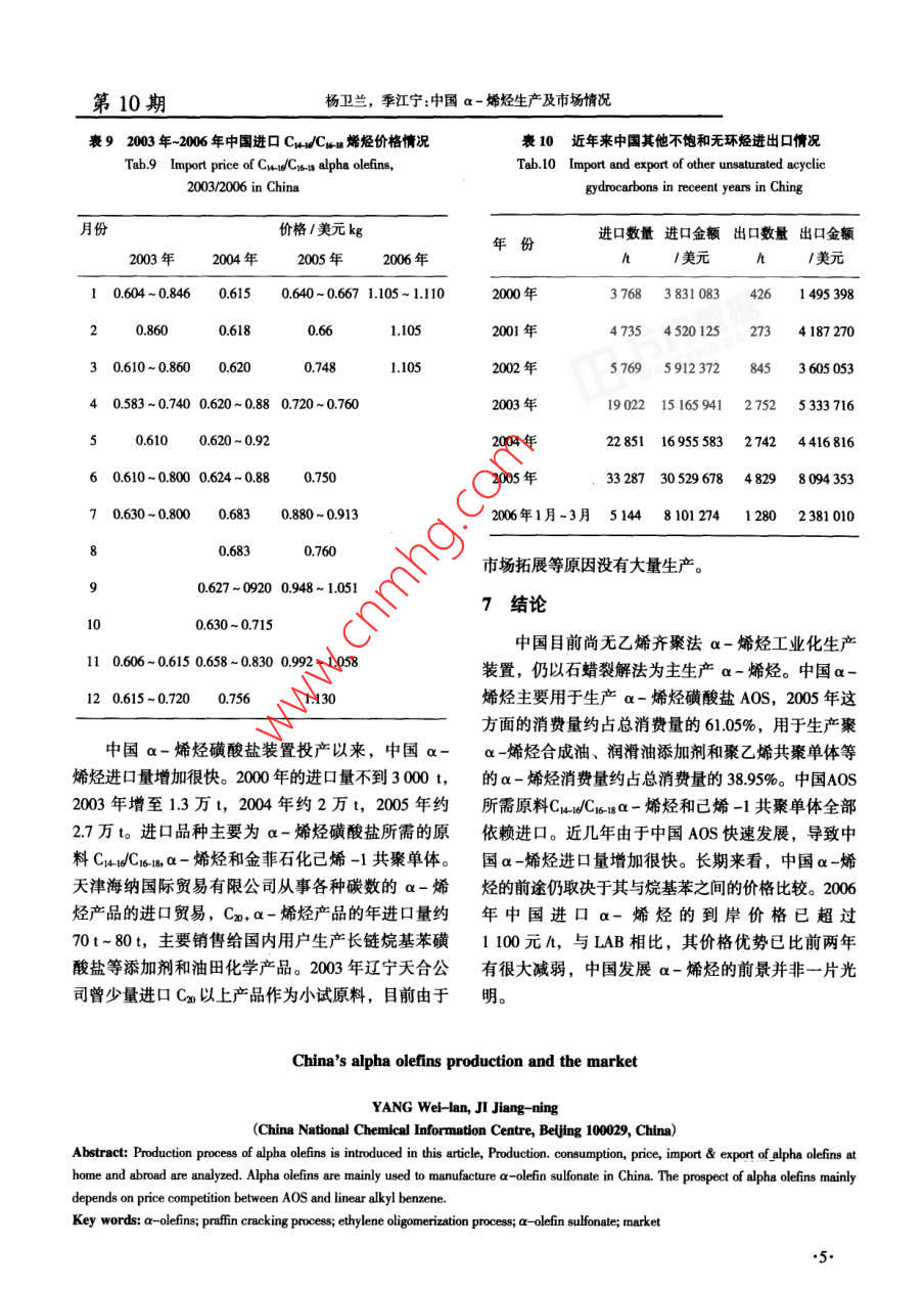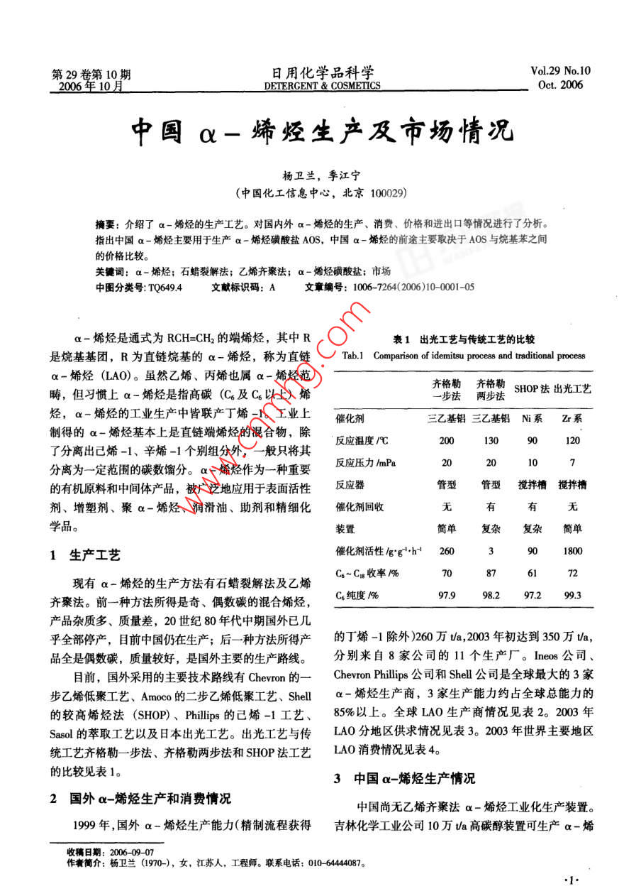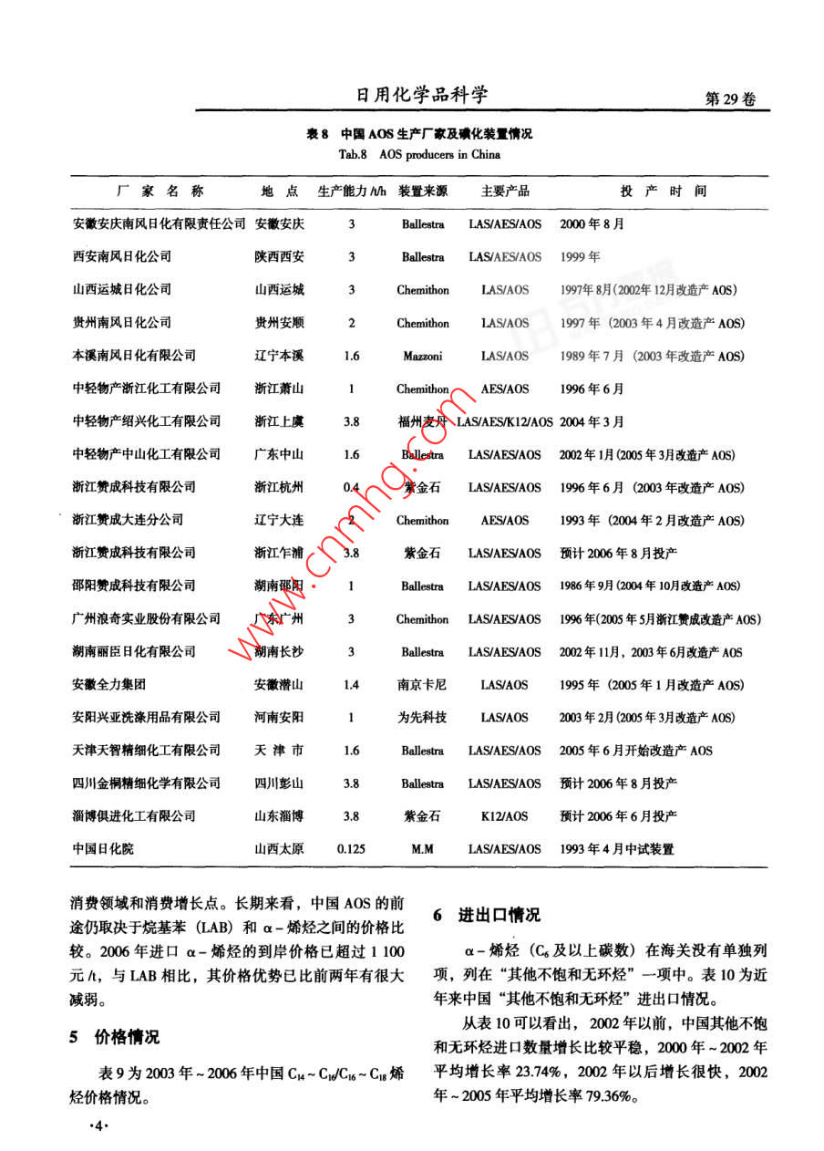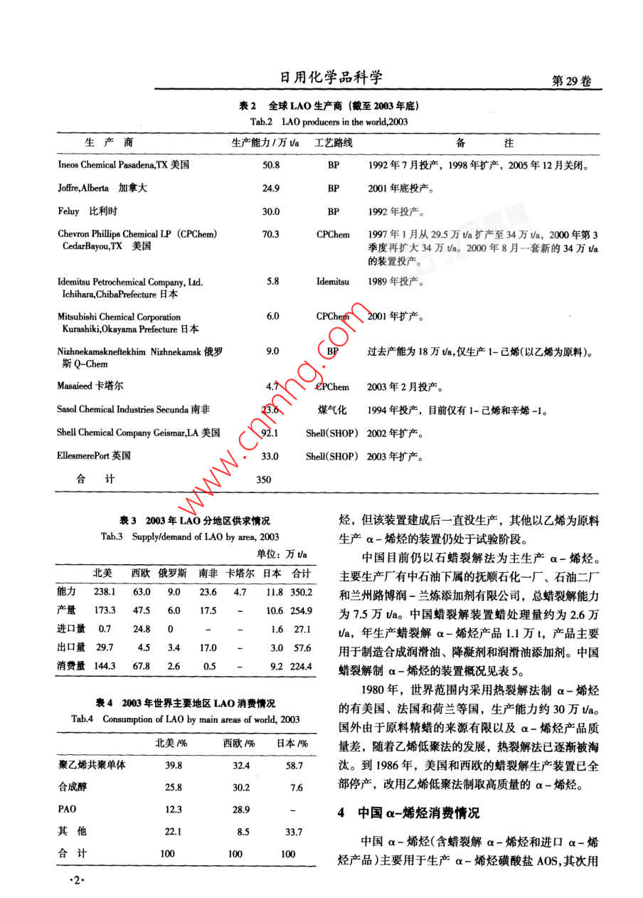 日用化學(xué)品科學(xué)第29卷表2全球 LAO生產(chǎn)商(截至2003年底)Tab.2 LAO producers in the world,2003生產(chǎn)商生產(chǎn)能力1萬(wàn)va工藝路線(xiàn)備注Ineos Chemical Pasadena,TX美國(guó)50.8B1992年7月投產(chǎn),1998年擴(kuò)產(chǎn), 2005年12月關(guān)閉。Jfre,Alberta加拿大24.9BP2001年底投產(chǎn)。Feluy比利時(shí)30.0BI1992年投產(chǎn)。Chevron Pillips Chemical LP (CPChem)70.3CPChem1997年1月從29.5萬(wàn)/a擴(kuò)產(chǎn)至34萬(wàn)Va, 2000 年第3CedarBayou,TX美國(guó)季度再擴(kuò)大34萬(wàn)Uao 2000年8月-套新的34萬(wàn)Ua的裝置投產(chǎn)。Idermitsu Petrochemical Company, Ltd.5.Idemitsu1989年投產(chǎn)。.Ichihara,ChibaPrefecture 日本Mitsubishi Chemical Corporation6.02001年擴(kuò)產(chǎn)。Kurashiki,Okayama Prefecture日本Nizhnekamskneftekhim Nizhnekamsk 俄羅過(guò)去產(chǎn)能為18萬(wàn)tla,僅生產(chǎn)1-己烯(以乙烯為原料)。斯Q-ChemMasaieed 卡塔爾4.72003年2月投產(chǎn)。Sasol Chemical Industries Secunda南非23.6煤氣化1994年投產(chǎn),目前僅有1-已烯和辛烯-1。Shell Chemnical Company Geismar,LA美國(guó)92.1Shell(SHOP) 2002 年擴(kuò)產(chǎn)。EllesmerePort英國(guó)33.0Shell(SHOP) 2003 年擴(kuò)產(chǎn)。合350表3 2003 年LAO分地區(qū)供求情況烴,但該裝置建成后一直沒(méi)生產(chǎn),其他以乙烯為原料Tab.3 Supply/demand of LAO by area, 2003生產(chǎn)a-烯烴的裝置仍處于試驗(yàn)階段。單位:萬(wàn)va中國(guó)目前仍以石蠟裂解法為主生產(chǎn)a-烯烴。北美西歐 俄羅斯南非卡塔爾日本合計(jì)主要生產(chǎn)廠有中石油下屬的撫順石化一廠、石油二廠能力238.1 63.0.023.64.11.8 350.2和蘭州路博潤(rùn)-蘭煉添加劑有限公司,總蠟裂解能力產(chǎn)量173.3 47.517.510.6 254.9為7.5萬(wàn)tla。 中國(guó)蠟裂解裝置蠟處理量約為2.6萬(wàn).進(jìn)口量0.7 24.8 01.6 27.1Va,年生產(chǎn)蠟裂解a-烯烴產(chǎn)品1.1萬(wàn)t,產(chǎn)品主要出口量29.74.5 3.4 17.03.0 57.6用于制造合成潤(rùn)滑油、降凝劑和潤(rùn)滑油添加劑。中國(guó)消費(fèi)量144.3 67.82.60.9.2 224.4蠟裂解制a-烯烴的裝置概況見(jiàn)表5。1980年,世界范圍內(nèi)采用熱裂解法制a-烯烴表4 2003年世界主要地區(qū)LAO消費(fèi)情況的有美國(guó)、法國(guó)和荷蘭等國(guó),生產(chǎn)能力約30萬(wàn)UaoTab.4 Consumption of LAO by main areas of world, 2003國(guó)外由于原料精蠟的來(lái)源有限以及a-烯烴產(chǎn)品質(zhì).北美1%西歐1%日本1%量差,隨著乙烯低聚法的發(fā)展,熱裂解法已逐漸被淘聚乙烯共聚單體39.832.458.7汰。到1986年,美國(guó)和西歐的蠟裂解生產(chǎn)裝置已全合成醇25.830.27.6部停產(chǎn),改用乙烯低聚法制取高質(zhì)量的a-烯烴。PAO12.328.94中國(guó)c-烯烴消費(fèi)情況其他22.18.533.7中國(guó)a-烯烴(含蠟裂解a-烯烴和進(jìn)口a-烯合計(jì)10000烴產(chǎn)品)主要用于生產(chǎn)a-烯烴磺酸鹽AOS,其次用.2.第10期楊衛(wèi)蘭,季江寧:中國(guó)a-烯烴生產(chǎn)及市場(chǎng)情況表5中國(guó)蠟裂解制a烯烴的裝t概況Tab.5 Parafin craking aplha olein plants in China單位:萬(wàn)t蠟裂解能力蠟處理量 a-烯烴產(chǎn)量目的用途備注1萬(wàn)tla1萬(wàn)t中石油撫順石油化1.8).7合成潤(rùn)滑油(聚a- 1970 年投產(chǎn),投產(chǎn)時(shí)蠟處理能力為7萬(wàn)tla,工公司石化一廠烯烴合成油PAO)烯2002 年裝置經(jīng)優(yōu)化改造后,蠟裂解能力為5烴Crors,C1ui8萬(wàn)Vao0.50合成潤(rùn)滑油、降凝劑1970 年投產(chǎn)。工公司石化二廠蘭州路博潤(rùn)-蘭煉0..4添加劑、降凝劑由美國(guó)路博潤(rùn)國(guó)際公司和蘭州煉化公司共同添加劑有限公司投資4.8億元,以蘭煉添加劑廠為基礎(chǔ)組建。合計(jì)7.52.6.1表6近年來(lái)中國(guó)ax烯烴的消費(fèi)情況AOS是目前中國(guó)a-烯烴最主要的消費(fèi)領(lǐng)域,Tab.6 Consumption of alpha olefins in recent yaers in China也是近年來(lái)中國(guó)a-烯烴主要的消費(fèi)增長(zhǎng)點(diǎn)。在國(guó)外,AOS 是一種發(fā)展較快的陰離子表面活性劑,但消費(fèi)量/萬(wàn)tAOS過(guò)去在中國(guó)的推廣應(yīng)用卻較為遲緩,一方面是應(yīng)用領(lǐng)域2003年2004年 2005 年由于中國(guó)沒(méi)有a-烯烴的生產(chǎn),另一方面由于進(jìn)口a-烯烴原料價(jià)格高于烷基苯LAB價(jià)格,因而限制a-烯烴磺酸鹽(AOS)1.161.822.32了AOS的發(fā)展勢(shì)頭。2003 年以來(lái)國(guó)際原油價(jià)格持續(xù)聚a-烯烴合成油(PAO)0.82上漲,LAB的主原料輕蠟、純苯等價(jià)格也隨之上揚(yáng),導(dǎo)致LAB、LAS價(jià)格也大幅上漲,中國(guó)的表面活性劑聚乙烯共聚單體0.140.210.38生產(chǎn)廠家先后改造各自的磺化裝置,開(kāi)始生產(chǎn)雖同樣潤(rùn)滑油黍加劑等0.28價(jià)高但性能優(yōu)良的AOS產(chǎn)品。2002 年~ 2005年,中2.403.133.80國(guó)AOS產(chǎn)量增加很快(見(jiàn)表7)。截至2005年8月中國(guó)AOS生產(chǎn)廠家及磺化裝置情況見(jiàn)表8。于生產(chǎn)聚a-烯烴合成油、潤(rùn)滑油添加劑和聚乙烯共表7近幾年中國(guó)AOS產(chǎn) 情況聚單體。表6為近年來(lái)中國(guó)u -烯烴的消費(fèi)情況。Tab.7 Production of AOS in reccent years in China近幾年中國(guó)a-烯烴消費(fèi)量增長(zhǎng)很快,2003年份AOS產(chǎn)量h年~ 2005年平均增長(zhǎng)率41.4%,主要是這幾年中國(guó)AOS的快速增長(zhǎng)。AOS是由a-烯烴經(jīng)三氧化硫氣19991000相膜式磺化、連續(xù)化中和制備得到的- -種新型陰離子0001 900表面活性劑