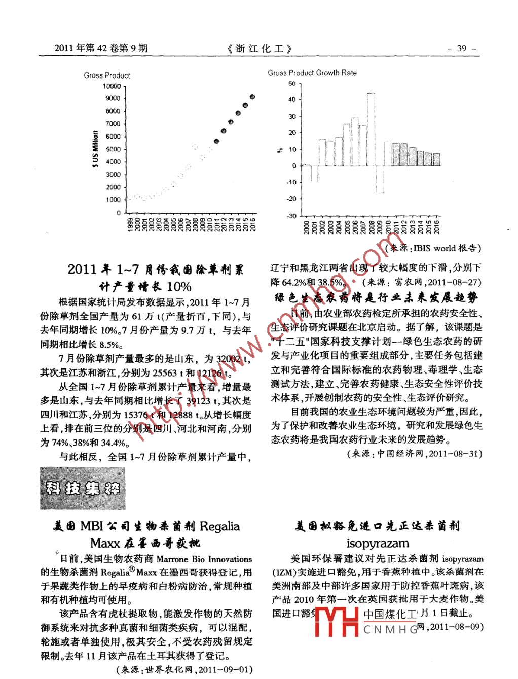 ZHEJIANG CHEMICAL INDUSTRYVol.42No.09(2011)竊場扮祈2001~2010年世界農(nóng)藥市場世界農(nóng)藥市場可分為作物保護(hù)部分與非農(nóng)用農(nóng)藥兩部分,具體數(shù)據(jù)如下表:年份作物保護(hù)億美元非農(nóng)用市場/億美元合計化美元2001年257.6041.3098902002年251.5042.70294.202003年267.1044.45311.552004年307.25354.002005年3119049.05360.952006年304.2551.50355.752007年333905365387.552008年404.755655461.302009年378.6058.60437.202010年382006055442.55(來源:沈陽院農(nóng)藥報告)份額(%)我固農(nóng)藥產(chǎn)品比例及主要農(nóng)藥企些2.2%2010年市場仍額1.6%■南京紅日集團(tuán)15%目前我國農(nóng)藥產(chǎn)品中,殺菌劑占118%,除草劑■南通江山農(nóng)化浙江新安化工占35.5%,殺蟲劑占41.6%,其它占113%主要農(nóng)藥■江蘇揚(yáng)農(nóng)化工企業(yè)2010年市場份額如圖:■山東僑昌化學(xué)(來源: IBIS world報告其它1999~2010年我圍農(nóng)行業(yè)據(jù)及2011~2016年預(yù)測Revenue Growth Rate350004030000250005≌205000中國煤化CNMHG/E50000頸定到會裂類榮萄2011年第42卷第9期《浙江化工》39Gross ProductGross Product Growth Rate600030001000(來源: IBIS world報告)2011年1~7月我圍除草劑累遼寧和黑龍江兩省出現(xiàn)了較大幅度的下滑,分別下計產(chǎn)量增長10%降642%和385%(來源:富農(nóng)網(wǎng),2011-08-27)根據(jù)國家統(tǒng)計局發(fā)布數(shù)據(jù)顯示,2011年1-7月綠色生態(tài)農(nóng)藥將是行業(yè)未泉發(fā)屐趨勢份除草劑全國產(chǎn)量為61萬t(產(chǎn)量折百,下同),與日前,由農(nóng)業(yè)部農(nóng)藥檢定所承擔(dān)的農(nóng)藥安全性去年同期增長10%7月份產(chǎn)量為97萬t,與去年生態(tài)評價研究課題在北京啟動。據(jù)了解,該課題是同期相比增長85‰。"十二五"國家科技支撐計劃一綠色生態(tài)農(nóng)藥的研7月份除草劑產(chǎn)量最多的是山東,為32002t,發(fā)與產(chǎn)業(yè)化項(xiàng)目的重要組成部分,主要任務(wù)包括建其次是江蘇和浙江,分別為25563t和12126t立和完善符合國際標(biāo)準(zhǔn)的農(nóng)藥物理、毒理學(xué)、生態(tài)從全國1-7月份除草劑累計產(chǎn)量來看增量最測試方法建立完善農(nóng)藥健康生態(tài)安全性評價技多是山東,與去年同期相比增長了39123t,其次是術(shù)體系開展創(chuàng)制農(nóng)藥的安全性、生態(tài)評價研究。四川和江蘇,分別為15376t和12888t。從增長幅度目前我國的農(nóng)業(yè)生態(tài)環(huán)境問題較為嚴(yán)重,因此,上看排在前三位的分別是四川河北和河南,分別為了保護(hù)和改善農(nóng)業(yè)生態(tài)環(huán)境,研究和發(fā)展綠色生為74%、38%和344%態(tài)農(nóng)藥將是我國農(nóng)藥行業(yè)未來的發(fā)展趨勢。與此相反,全國1~7月份除草劑累計產(chǎn)量中,(來源:中國經(jīng)濟(jì)網(wǎng),2011-08-31)最園MB貧司物殺酋劑 Regalia最固擬豁免進(jìn)口先正達(dá)殺菌劑Maxx在西哥獲批sopyrazam日前,美國生物農(nóng)藥商 Marrone bio innovations美國環(huán)保署建議對先正達(dá)殺菌劑的生物殺菌劑 Regalia0Max在愚西哥獲得登記用(ZM)實(shí)施進(jìn)口豁免,用于香蕉種植中。該殺菌劑在于果蔬類作物上的早疫病和白粉病防治,常規(guī)種植美洲南部及中部許多國家用于防控香蕉葉斑病,該和有機(jī)種植均可使用。產(chǎn)品2010年第一次在英國獲批用于大麥作物。美該產(chǎn)品含有虎杖提取物,能激發(fā)作物的天然防國進(jìn)口豁御系統(tǒng)來對抗多種真菌和細(xì)菌類疾病,可以混配,H中國煤化工月1日截止。CNMHG網(wǎng),2011-08-09)輪施或者單獨(dú)使用,極其安全,不受農(nóng)藥殘留規(guī)定限制。去年1l月該產(chǎn)品在土耳其獲得了登記。(來源:世界農(nóng)化網(wǎng),2011-09-01)