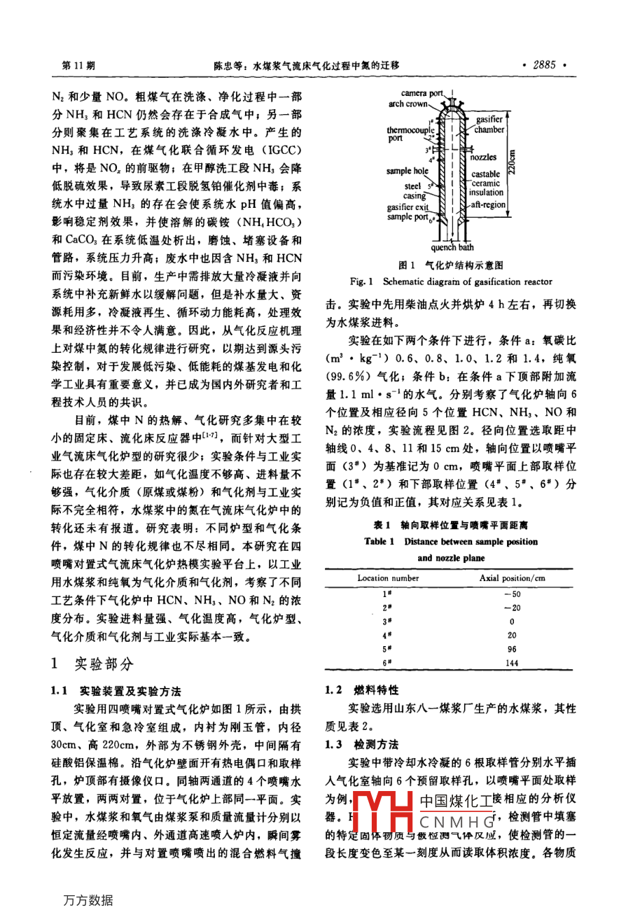 第59卷第11期化工學(xué)報vol2008年11月Journal of Chemical Industry and Engineering (China)November 2008研究論文水煤漿氣流床氣化過程中氮的遷移陳忠,袁帥,梁欽鋒,王輔臣,囝遵宏(華東理工大學(xué)煤氣化教育部重點(diǎn)實(shí)驗室,上海200237)摘要:在四噴嘴對置式氣流床氣化爐中,考察了水煤漿在不同氧碳比氣化條件下HCN、NH3、NO和N2的軸徑向濃度。結(jié)果表明:氮污染物(HCN、NH3、NO)在噴嘴平面處即產(chǎn)生并濃度最高,其主要來源于煤??焖贌峤鈺r析出的揮發(fā)分,遠(yuǎn)離噴嘴平面時三者濃度大幅降低并大多轉(zhuǎn)化為N2,且氧碳比增高有利于N2的生成,氣化室出口處濃度N2>HCN>NH1>NO;流場分布使氣化室出口附近徑向濃度基本一致,而其上部各平面位置靠近爐壁處濃度較低;煤漿中的適量水分有利于HCN和NH3生成,但過量水分不利于揮發(fā)氮析出,使HCNNH3和NO生成量降低關(guān)鍵詞:水煤漿;氣流床;氮;遷移中圖分類號:TQ546文獻(xiàn)標(biāo)識碼:A文章編號:0438-1157(2008)11-2884-07Release of nitrogen during coal water slurrygasification in entrained-flow gasifierCHEN Zhong, YUAN Shuai, LIANG Qinfeng, WANG Fuchen, YU Zunhong(Key Laboratory of Coal Gasification of Ministry of Education, East China University ofScience and Technology, Shanghai 200237, ChinAbstract: Various axial and radial concentrations of HCN, NH3, NO and N2 were measured during thegasification of coal water slurry (CwS)in a laboratory opposed multi-burner gasifier. The results showedthat the majority of nitrogen pollutants(HCN, NH, and NO) came from the release of volatile nitrogen ofcoal during the rapid heating process of devolatilization. The maximum concentrations of nitrogenpollutants were produced at the nozzle plane and decreased away from the plane; moreover, the ordering inthe aft-region was N2 >HCN>NH3>NO Increase of O2/C ratio tended to favor the formation of N2Flowfield distribution led to uniform radial concentrations at the exit and low concentrations near the side-wallin other axial positions. a proper amount of water in CWS tended to favor the formation of HCN andNH,. However, the introduction of excessive steam played a role in restraining the release of volatilenitrogen and reducing the concentrations of HCN, NH; and NOKey words: coal water slurry; entrained-flow gasifier; nitrogen; release引言轉(zhuǎn)化率高、粗煤氣質(zhì)量好等特點(diǎn)成為目前應(yīng)用范圍最廣、工藝最成熟的氣流床氣化技術(shù)。工業(yè)生產(chǎn)表水煤漿氣化以其原料范圍寬、安全易控制、碳明,氣化時煤中的氮(N)會轉(zhuǎn)化為HCN、NH3、2008-03-31收到初稿,2008-07-01收到修改稿中國煤化工聯(lián)系人;王輔臣。第一作者:陳忠(1980—),男,博士研究dYHCNMHG金項目:長江學(xué)者和創(chuàng)新團(tuán)隊發(fā)展計劃項目(IT0620);教育部新世紀(jì)人才支持計劃”項目(NCET050415第11期陳忠等:水煤漿氣流床氣化過程中氮的遷移·2885N2和少量NO。粗煤氣在洗滌、凈化過程中一部camera poarch crown分NH3和HCN仍然會存在于合成氣中;另一部分則聚集在工藝系統(tǒng)的洗滌冷凝水中。產(chǎn)生的NH3和HCN,在煤氣化聯(lián)合循環(huán)發(fā)電(IGCC)nozzles中,將是NO2的前驅(qū)物;在甲醇洗工段NH3會降castabl低脫硫效果,導(dǎo)致尿素工段脫氫鉑催化劑中毒;系nsulation統(tǒng)水中過量NH的存在會使系統(tǒng)水pH值偏高,gasifier ex影響穩(wěn)定劑效果,并使溶解的碳銨( NH HCO3)sample port和CaCO3在系統(tǒng)低溫處析出,磨蝕、堵塞設(shè)備和管路,系統(tǒng)壓力升高;廢水中也因含NH3和HCN圖1氣化爐結(jié)構(gòu)示意圖而污染環(huán)境。目前,生產(chǎn)中需排放大量冷凝液并向Fig 1 Schematic diagram of gasification reactor系統(tǒng)中補(bǔ)充新鮮水以緩解問題,但是補(bǔ)水量大、資源耗用多,冷凝液再生、循環(huán)動力能耗高,處理效擊。實(shí)驗中先用柴油點(diǎn)火并烘爐4h左右,再切換果和經(jīng)濟(jì)性并不令人滿意,。因此,從氣化反應(yīng)機(jī)理為水煤漿進(jìn)料上對煤中氮的轉(zhuǎn)化規(guī)律進(jìn)行研究,以期達(dá)到源頭污實(shí)驗在如下兩個條件下進(jìn)行,條件a:氧碳比染控制,對于發(fā)展低污染、低能耗的煤基發(fā)電和化(m23:kg1)0.6、0.8、1.0、1.2和1.4,純氧學(xué)工業(yè)具有重要意義,并已成為國內(nèi)外研究者和工(99.6%)氣化;條件b:在條件a下頂部附加流程技術(shù)人員的共識。量1.1ml·s-1的水氣。分別考察了氣化爐軸向6目前,煤中N的熱解、氣化研究多集中在較個位置及相應(yīng)徑向5個位置HCN、NH3、NO和小的固定床、流化床反應(yīng)器中1,而針對大型工N2的濃度,實(shí)驗流程見圖2。徑向位置選取距中業(yè)氣流床氣化爐型的研究很少;實(shí)驗條件與工業(yè)實(shí)軸線0、4、8、11和15cm處,軸向位置以噴嘴平際也存在較大差距,如氣化溫度不夠高、進(jìn)料量不面(3“)為基準(zhǔn)記為0cm,噴嘴平面上部取樣位夠強(qiáng),氣化介質(zhì)(原煤或煤粉)和氣化劑與工業(yè)實(shí)置(1、9和下部取樣位置(4"、5°、6”)分際不完全相符,水煤漿中的氮在氣流床氣化爐中的別記為負(fù)值和正值,其對應(yīng)關(guān)系見表1。轉(zhuǎn)化還未有報道。研究表明:不同爐型和氣化條表1軸向取樣位置與噴嘴平面距離件,煤中N的轉(zhuǎn)化規(guī)律也不盡相同。本研究在四Table 1 Distance between sample position噴嘴對置式氣流床氣化爐熱模實(shí)驗平臺上,以工業(yè)用水煤漿和純氧為氣化介質(zhì)和氣化劑,考察了不同Axial position/ cm工藝條件下氣化