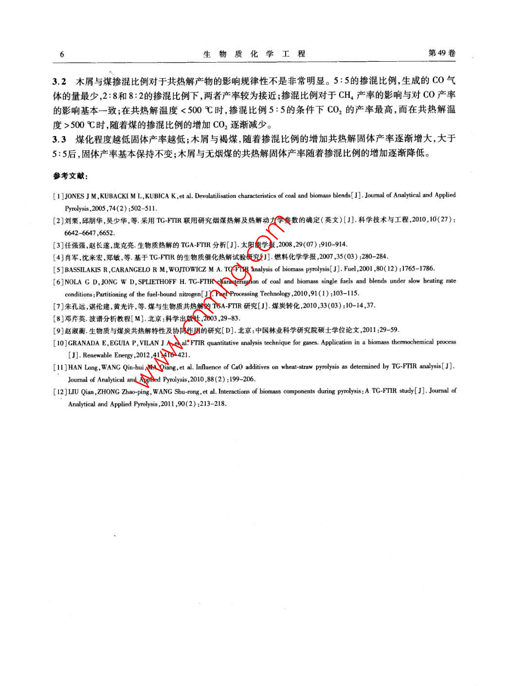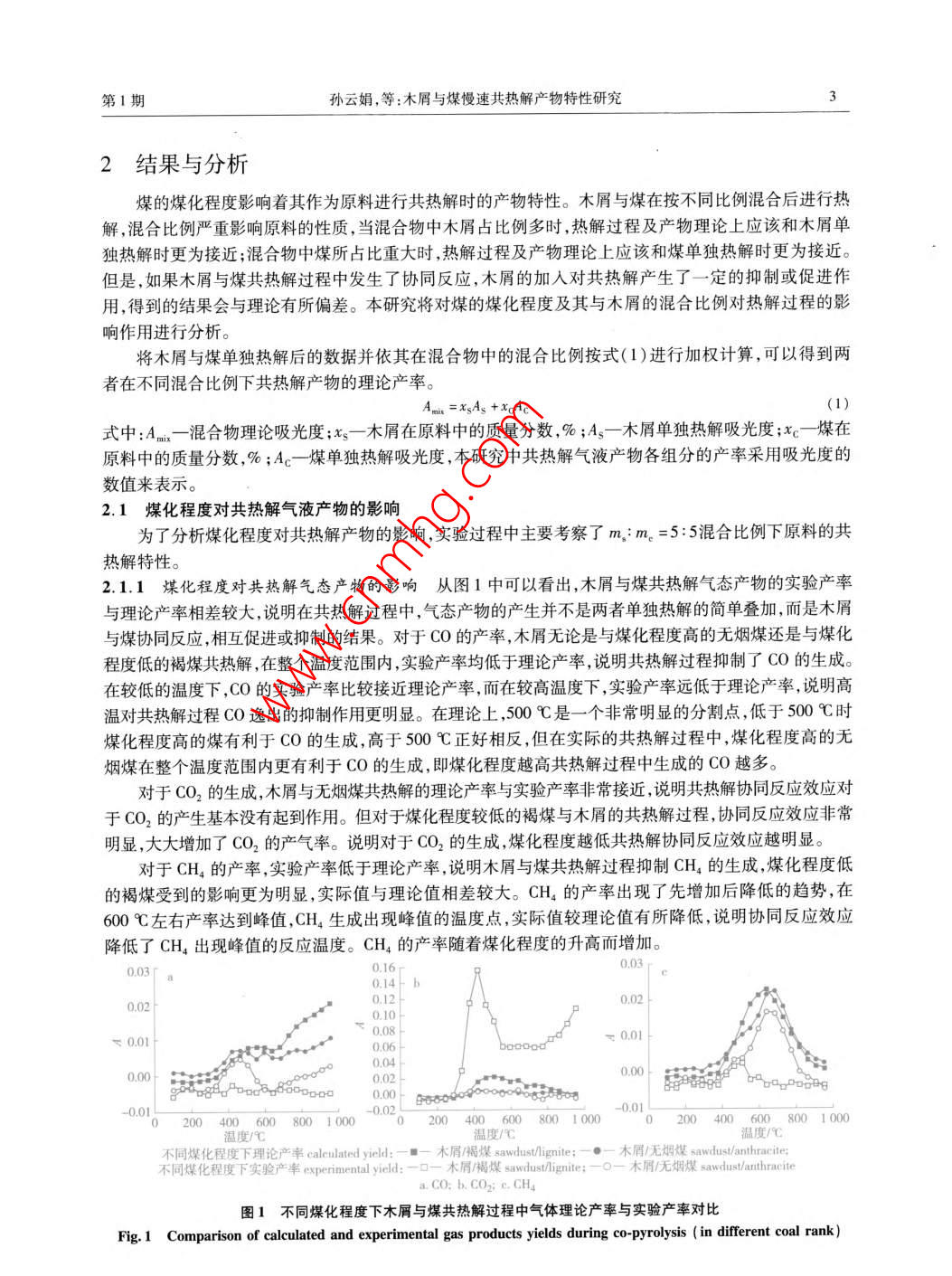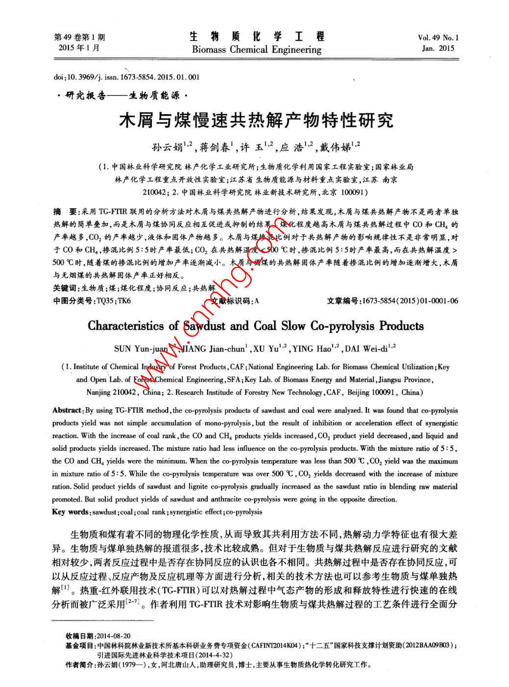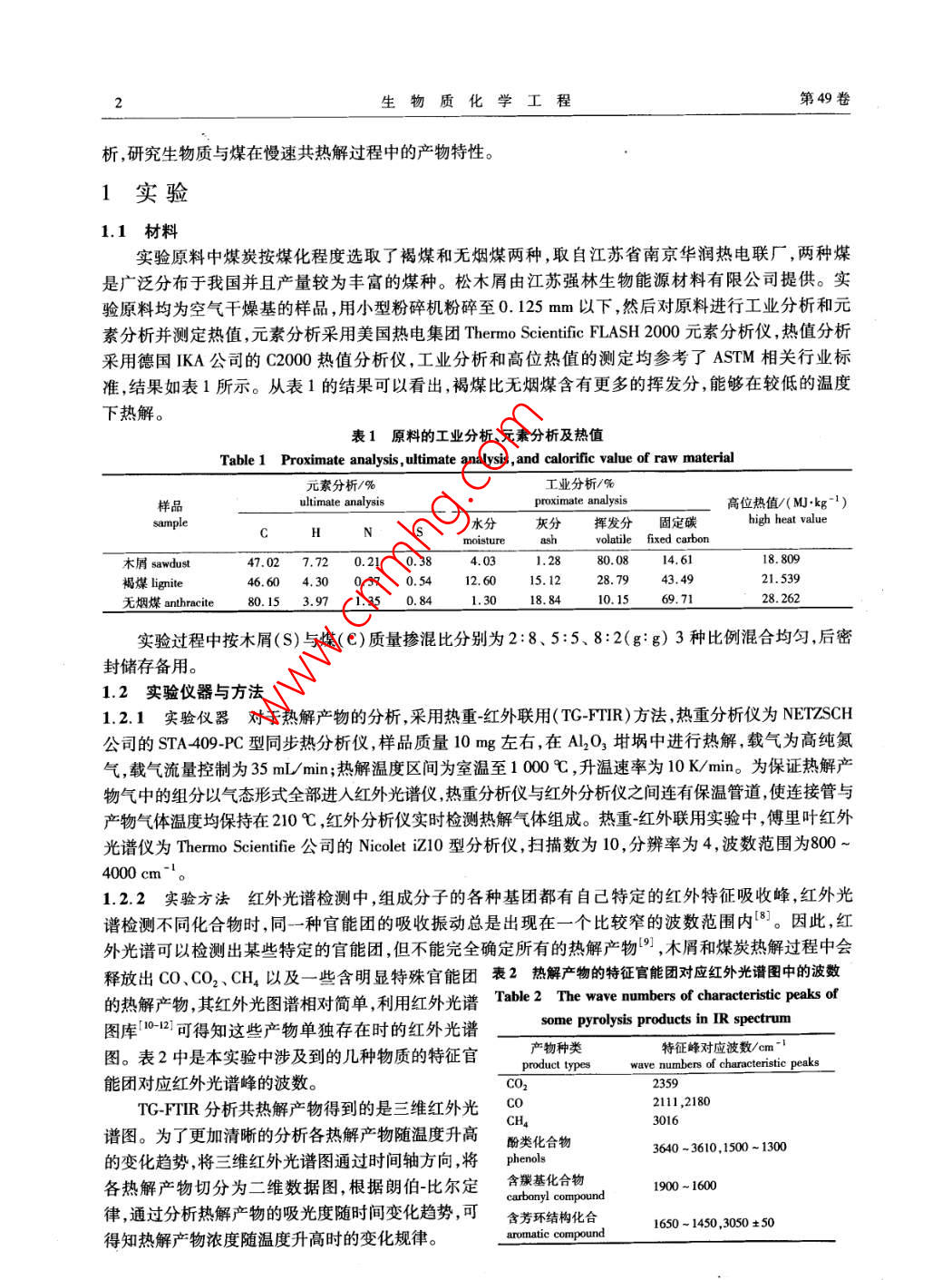 第49卷第1期生物質(zhì)化學(xué)工程Vol. 49 No. 1015年1月Biomass Chemical EngineeringJan.2015doi:10.3969/jisa.16735854.2015.01.001研究報(bào)告—一生物質(zhì)能源木屑與煤慢速共熱解產(chǎn)物特性研究孫云娟2,蔣劍春',許玉12,應(yīng)浩·2,戴偉娣12(1.中國(guó)林業(yè)科學(xué)研究院林產(chǎn)化學(xué)工業(yè)研究所;生物質(zhì)化學(xué)利用國(guó)家工程實(shí)驗(yàn)室;國(guó)家林業(yè)局林產(chǎn)化學(xué)工程重點(diǎn)開放性實(shí)驗(yàn)室;江蘇省生物質(zhì)能源與材料重點(diǎn)實(shí)驗(yàn)室,江蘇南京210042;2.中國(guó)林業(yè)科學(xué)研究院林業(yè)新技術(shù)研究所,北京100091)摘要;采用TG-FIR聯(lián)用的分析方法對(duì)木屑與煤共熱解產(chǎn)物進(jìn)行分析,結(jié)果發(fā)現(xiàn),木屑與煤共熱解產(chǎn)物不是兩者單獨(dú)熱解的簡(jiǎn)單疊加,而是木屑與煤協(xié)同反應(yīng)相互促進(jìn)或抑制的結(jié)果。煤化程度越高木屑與煤共熱解過(guò)程中CO和CH,的產(chǎn)率越多,CO2的產(chǎn)率越少,液體和固體產(chǎn)物越多。木屑與煤摻混比例對(duì)于共熱解產(chǎn)物的影響規(guī)律性不是非常明顯,對(duì)于CO和CH4,摻混比例5:5時(shí)產(chǎn)率最低;CO2在共熱解溫度<500℃時(shí),摻混比例5:5時(shí)產(chǎn)率最高,而在共熱解溫度>00℃時(shí),隨著煤的摻混比例的增加產(chǎn)率逐漸減小。木屑與褐煤的共熱解固體產(chǎn)率隨著摻混比例的增加逐漸增大,木屑與無(wú)煙煤的共熱解固體產(chǎn)率正好相反。關(guān)鍵詞:生物質(zhì);煤;煤化程度;協(xié)同反應(yīng);共熱解中圖分類號(hào):TQ35;TK6文獻(xiàn)標(biāo)識(shí)碼:A文章編號(hào):1673-5854(2015)010001-06Characteristics of Sawdust and Coal Slow Co-pyrolysis ProductsSUN Yun-juan",JIANG Jian-chun, XU Yu", YING Hao, DAI Wei-di,2(1. Institute of Chemical Industry of Forest Products, CAF; National Engineering Lab for Biomass Chemical Utilization; Keyand Open Lab of Forest Chemical Engineering SFA; Key Lab. of Biomass Energy and Material, Jiangsu ProvinceNanjing 210042, China; 2. Research Institude of Forestry New Technology, CAF, Beijing 100091, China)Abstract: By using TG-FTIR method, the co-pyrolysis products of sawdust and coal were analyzed. It was found that co-pyrolysisproducts yield was not simple accumulation of mono-pyrolysis, but the result of inhibition or acceleration effect of synergisticreaction. With the increase of coal rank, the CO and CHa products yields increased, cO2 product yield decreased, and liquid andsolid products yields increased. The mixture ratio had less influence on the co-pyrolysis products. With the mixture ratio of 5: 5the CO and CH4 yields were the minimum. When the co-pyrolysis temperature was less than 500C, cO, yield was the maximumin mixture ratio of 5: 5. While the co-pyrolysis temperature was over 500C, CO, yields decreased with the increase of mixtureration. Solid product yields of sawdust and lignite co-pyrolysis gradually increased as the sawdust ratio in blending raw materialpromoted. But solid product yields of sawdust and anthracite co-pyrolysis were going in the opposite directionKey words: sawdust; coal; coal rank; synergistic effect co-pyrolysis生物質(zhì)和煤有著不同的物理化學(xué)性質(zhì),從而導(dǎo)致其共利用方法不同,熱解動(dòng)力學(xué)特征也有很大差異。生物質(zhì)與煤?jiǎn)为?dú)熱解的報(bào)道很多,技術(shù)比較成熟。但對(duì)于生物質(zhì)與煤共熱解反應(yīng)進(jìn)行研究的文獻(xiàn)相對(duì)較少,兩者反應(yīng)過(guò)程中是否存在協(xié)同反應(yīng)的認(rèn)識(shí)也各不相同。共熱解過(guò)程中是否存在協(xié)同反應(yīng),可以從反應(yīng)過(guò)程、反應(yīng)產(chǎn)物及反應(yīng)機(jī)理等方面進(jìn)行分析,相關(guān)的技術(shù)方法也可以參考生物質(zhì)與煤?jiǎn)为?dú)熱解口。熱重紅外聯(lián)用技術(shù)( TG-FTIR)可以對(duì)熱解過(guò)程中氣態(tài)產(chǎn)物的形成和釋放特性進(jìn)行快速的在線分析而被廣泛采用27。作者利用TGFR技術(shù)對(duì)影響生物質(zhì)與煤共熱解過(guò)程的工藝條件進(jìn)行全面分收稿日期:2014-08-20基金項(xiàng)目:中國(guó)林科院林業(yè)新技術(shù)所基本科研業(yè)務(wù)費(fèi)專項(xiàng)資金( CAFIN204K04);“十二五”國(guó)家科技支撐計(jì)劃資助(2012BAA09B03);引進(jìn)國(guó)際先進(jìn)林業(yè)科學(xué)技術(shù)項(xiàng)目(2014-4-32)作者簡(jiǎn)介:孫云娟(1979),女,河北唐山人,助理研究員博士,主要從事生物質(zhì)熱化學(xué)轉(zhuǎn)化研究工作2生物質(zhì)化學(xué)工程第49卷析研究生物質(zhì)與煤在慢速共熱解過(guò)程中的產(chǎn)物特性。1實(shí)驗(yàn)1.1材料實(shí)驗(yàn)原料中煤炭按煤化程度選取了褐煤和無(wú)煙煤兩種,取自江蘇省南京華潤(rùn)熱電聯(lián)廠,兩種煤是廣泛分布于我國(guó)并且產(chǎn)量較為豐富的煤種。松木屑由江蘇強(qiáng)林生物能源材料有限公司提供。實(shí)驗(yàn)原料均為空氣干燥基的樣品,用小型粉碎機(jī)粉碎至0.125mm以下,然后對(duì)原料進(jìn)行工業(yè)分析和元素分析并測(cè)定熱值,元素分析采用美國(guó)熱電集團(tuán) Thermo Scientific FLASH2000元素分析儀,熱值分析采用德國(guó)KA公司的C2000熱值分析儀,工業(yè)分析和高位熱值的測(cè)定均參考了ASTM相關(guān)行業(yè)標(biāo)準(zhǔn),結(jié)果如表1所示。從表1的結(jié)果可以看出褐煤比無(wú)煙煤含有更多的揮發(fā)分,能夠在較低