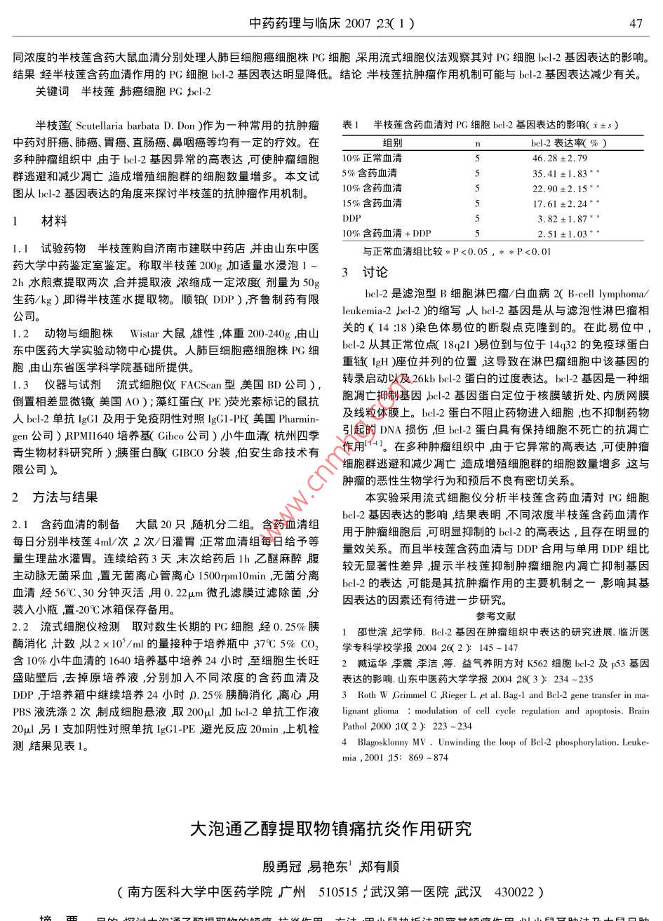 中藥藥理與臨床200723(1)47同濃度的半枝蓮含藥大鼠血清分別處理人肺巨細(xì)胞癌細(xì)胞株P(guān)G細(xì)胞采用流式細(xì)胞儀法觀察其對(duì)PG細(xì)胞bl2基因表達(dá)的影響結(jié)果經(jīng)半枝蓮含藥血清作用的PG細(xì)胞bl-2基因表達(dá)明顯降低。結(jié)論半枝蓮抗腫瘤作用機(jī)制可能與bcl-2基因表達(dá)減少有關(guān)。關(guān)鍵詞半枝蓮肺癌細(xì)胞PGel-2半枝蓮( Scutellaria barbata D.Don)作為一種常用的抗腫瘤表1半枝蓮含藥血清對(duì)PG細(xì)胞bc2基因表達(dá)的影響(x±s)中藥對(duì)肝癌、肺癌、胃癌、直腸癌、鼻咽癌等均有一定的療效。在多種腫瘤組織中由于lcl-2基因異常的高表達(dá)可使腫瘤細(xì)胞0%正常血清46.28±2.79群逃避和減少凋亡造成增殖細(xì)胞群的細(xì)胞數(shù)量增多。本文試5%含藥血清35.41±1.83圖從bl-2基因表達(dá)的角度來探討半枝蓮的抗腫瘤作用機(jī)制10%含藥血清15%含藥血清17.61±2.241材料DDP3.82±1.810%含藥血清+DDP2.51±1,01.1試驗(yàn)藥物半枝蓮購自濟(jì)南市建聯(lián)中藥店并由山東中醫(yī)與正常血清組比較*P<0.05,**P<0.01藥大學(xué)中藥鑒定室鑒定。稱取半枝蓮200g加適量水浸泡13討論2h水煎煮提取兩次合并提取液濃縮成一定濃度(劑量為50g生藥/kg)即得半枝蓮水提取物。順鋃(DDP)齊魯制藥有限hel-2是濾泡型B細(xì)胞淋巴瘤/白血病2(B- cell lymphoma.公司leukemia-2lel-2)的縮寫人bel-2基因是從與濾泡性淋巴瘤相12動(dòng)物與細(xì)胞株Wim大鼠雄性,體重20240g由山關(guān)的(14:8)染色體易位的斷裂點(diǎn)克隆到的。在此易位中,東中醫(yī)藥大學(xué)實(shí)驗(yàn)動(dòng)物中心提供。人肺巨細(xì)胞癌細(xì)胞株P(guān)G細(xì)bcl2從其正常位點(diǎn)18q21)易位到與位于142的免疫球蛋白胞由山東省醫(yī)學(xué)科學(xué)院基礎(chǔ)所提供重銥lgH)座位并列的位置這導(dǎo)致在淋巴瘤細(xì)胞中該基因的1.3儀器與試劑流式細(xì)胞儀 FACScan型美國BD公司),轉(zhuǎn)錄啟動(dòng)以及26kbb2蛋白的過度表達(dá)。bol2基因是一種細(xì)倒置相差顯微美國AO);藻紅蛋白(PE)蕨光素標(biāo)記的鼠抗胞凋亡抑制基因J-2基因蛋白定位于核膜皺折處、內(nèi)質(zhì)網(wǎng)膜人bcl2單抗lgGl及用于免疫陰性對(duì)照lgGl-PH(美國 Pharmic及線粒體膜上。bel-2蛋白不阻止藥物進(jìn)入細(xì)胞也不抑制藥物gen公司)RPM640培養(yǎng)基 Gibco公司)小牛血漬杭州四季引起的DNA損傷但bkl2蛋白具有保持細(xì)胞不死亡的抗凋亡青生物材料研究所)膜蛋白釃GBCO分裝伯安生命技術(shù)有作用。在多種腫瘤組織中由于它異常的高表達(dá)可使腫瘤限公司細(xì)胞群逃避和減少凋亡造成增殖細(xì)胞群的細(xì)胞數(shù)量增多這與腫瘤的惡性生物學(xué)行為和預(yù)后不良有密切關(guān)系2方法與結(jié)果本實(shí)驗(yàn)采用流式細(xì)胞儀分析半枝蓮含藥血清對(duì)PG細(xì)胞bl2基因表達(dá)的影響結(jié)果表明不同濃度半枝蓮含藥血清作2.1含藥血清的制備大鼠20只隨機(jī)分二組。含藥血清組用于腫瘤細(xì)胞后可明顯抑制的b2的高表達(dá),且存在明顯的每日分別半枝蓮4ml次2次/日灌胃正常血清組毎日給予等量效關(guān)系。而且半枝蓮含藥血清與DDP合用與單用DDP組比量生理鹽水灌胃。連續(xù)給藥3天末次給藥后1乙醚麻醉腹較無顯著性差異提示半枝蓮扣制腫瘤細(xì)胞內(nèi)凋亡抑制基因主動(dòng)脈無菌采血,置無菌離心管離心1500rpml0min無菌分離bel-2的表達(dá)可能是其抗腫瘤作用的主要機(jī)制之-影響其基血清經(jīng)56℃、30分鐘滅活用0.22μm微孔濾膜過濾除菌分因表達(dá)的因素還有待進(jìn)一步研究。裝入小瓶置20℃冰箱保存?zhèn)溆脜⒖嘉墨I(xiàn)2.2流式細(xì)胞儀檢測取對(duì)數(shù)生長期的PG細(xì)胞經(jīng)0.25%胰1邵世濱紀(jì)學(xué)師B2基因在腫瘤組織中表達(dá)的研究進(jìn)展臨沂醫(yī)酶消化汁數(shù)以2×10°/ml的量接種于培養(yǎng)瓶中37℃5%CO2學(xué)??茖W(xué)校學(xué)報(bào)2004262)145-147含10%小牛血清的1640培養(yǎng)基中培養(yǎng)24小時(shí)至細(xì)胞生長旺2臧運(yùn)華李震李潔等.益氣養(yǎng)陰方對(duì)K62細(xì)胞d2及p53基因盛貼壁后,去掉原培養(yǎng)液,分別加入不同濃度的含藥血清及表達(dá)的影響山東中醫(yī)藥大學(xué)學(xué)報(bào)2004283)234-235DDP于培養(yǎng)箱中繼續(xù)培養(yǎng)24小時(shí)ρ.25%胰酶消化離心用3 Roth W Grimme C Rieger L et al.Bag- and bel-2ε ene transfer in maPBS液洗滌2次制成細(xì)胞懸液取200μl加bcl-2單抗工作液 lignant glioma: modulation of cell cycle regulation and apoptosis, Brain20μl另1支加陰性對(duì)照單抗IGPE避光反應(yīng)20min,上機(jī)檢 Pathol2002)223-234測結(jié)果見表1。4 Blagosklonny MV, Unwinding the loop of Bcl-2 phosphorylation. Leuke-mia,20015:869~874大泡通乙醇提取物鎮(zhèn)痛抗炎作用研究殷勇冠易艷東'鄭有順南方醫(yī)科大學(xué)中醫(yī)藥學(xué)院廣州510515;武漢第一醫(yī)院武漢430022)48中藥藥理與臨床200723(1)脹法觀察其抗炎作用。結(jié)果:大泡通乙醇提取物能顯著抑制二甲苯所致小鼠耳腫脹及角叉菜膠致大鼠足腫脹提高熱板法小鼠痛閾值。結(jié)論大泡通乙醇提取物具有明顯鎮(zhèn)痛、抗炎作用。關(guān)鍵詞大泡通抗炎鎮(zhèn)痛大泡通( Impatiens pritzellii Hook. f.war. hupehensis Hook)2.2對(duì)二甲苯所致小鼠耳廓腫脹的影響小鼠50只隨機(jī)為五加科植物惠序鵝掌
