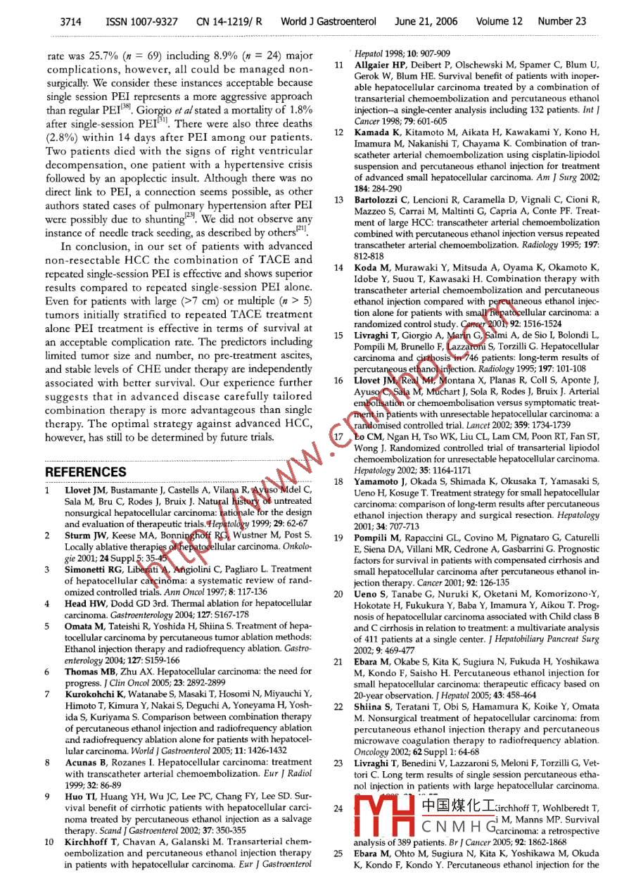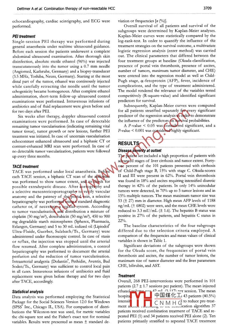 PO Box 2345, Beijing 100023, ChinaWorld Gastroenterol 2006 June 21: 12(23): 3707-3715orld Joumal of Gastroenterology ISSN 1007-9327Tjgwwignet.com@2006 The wJG Press. All rights reserved.CⅣ RCACERCombination of repeated single-session percutaneous ethanolinjection and transarterial chemoembolisation compared torepeated single-session percutaneous ethanol injection itpatients with non-resectable hepatocellular carcinomaArne Dettmer, Timm D Kirchhoff, Michael Gebel, Lars Zender, Nisar P Malek, Bernhard Panning, Ajay Chavan,Herbert Rosenthal, Stefan Kubicka, Susanne Krusche, Sonja Merkesdal, Michael Galanski, Michael P MannJoerg s BleckArne Dettmer, Michael Gebel, Lars Zender, Nisar P Malek, RESULTS: The 1-and 3-year survival of all patientsStefan Kubicka, Susanne Krusche, Michael P Manns, Joerg was 73% and 47%. In the subgroup analyses, theS Bleck, Department of Gastroenterology, Hepatology and combination of TACE and PEI(1)was associated withEndocrinology, Hannover Medical School, GermarTimm D Kirchhoff, Herbert Rosenthal, Michael Galanski, and 43%)compared to PEI treatment alone(2)(1-,3,ermanyBernhard Panning Department of Anaesthesiology, hannoveafter initial stratification to TACE(3) yielded comparableMedical School, Germanyresults(1-,3-5-year survival: 91%, 40%, and 30%)Ajay Chavan, Department of Diagnostic and Interventional while PEI after stratification to best supportive care(4)Radiology, Klinikum Oldenburg, Germanywas associated with decreased survival (1-,3-5-yearSonja Merkesdal, Division of Rheumatology, Hannover Medical survival: 50%, 23%, 12%). Apart from the chosenSchool, Germanytreatment modalities, predictors for better survival wereCo-first-authors: Timm d Kirchhofftumor number(n< 5),tumor size(< 5 cm), no ascitesCorrespondence to: Timm D Kirchhoff, MD, Hannover Medi- before PEI, and stable serum cholinesterase after PEI (Pal School, Department of Diagnostic Radiology OE 8220, Car<0.05). The mortality within 2 wk after PEI was 2.8%euberg-Str. 1, D-30625 HannoverGermany. kirchhoff. timm @mh-hannover de(n 3). There were 24(8.9%)major complicationsTelephone:+49511-32342lFax:+49-511-5323885after PEI including segmental liver infarction, focal liverReceived:2005-11-29Accepted: 2006-01-09necrosis, and liver abscess. All complications could bemanaged non-surgicallyCONCLUSION: Repeated single-session PEI is effectiveAbstractin patients with advanced HCc at an acceptable andmanageable complication rate. Patients stratified to aAIM: To evaluate the treatment effect of percutaneous combination of TACE and PEI can expect longer survivalethanol injection(PEI) for patients with advanced, than those stratified to repeated PEI alone. Furthermorenon-resectable HCC compared with combination of patients with large or multiple tumors in good clinicaltransarterial chemoembolisation(TACE)and repeated status may also profit from a combination of TAce andsingle-session PEI, repeated single-session PEI alone, reconsideration for secondary PEIrepeated TACE alone, or best supportive carec 2006 The WJG Press. All rights reservedMETHODS: All patients who received PEI treatmentduring the study period were included and stratified to Key words: HCC; Single-session PEI; TACE; Survivalone of the following treatment modalities according to Predictionphysical status and tumor extent: combination of TACEand repeated single-session PEI, repeated single-session Dettmer A, Kirchhoff TD, Gebel M, Zender L, Malek NPPEI alone, repeated TACE alone, or best supportive Panning B, Chavan A, Rosenthal H, Kubicka S, Krusche $carePrognosticvalueofclinicalparametersincludingMerkesdalS,GalanskiM,MannsMp,BleckJs.combinAtionOkuda-classification, presence of portal vein thrombosis, of repeated single-session percutaneous ethanol injectionpresence of ascites, number of tumors, maximum tumor and trardiameter, and serum cholinesterase(CHE), as well as single-sl中國煤化工 -njection in patientsChild-Pugh stage, a-fetoprotein(AFP), fever, incidence of with nCNMH GarcinomaWorldcomplications were assessed and compared between the Gastroergroups. Survival was determined using Kaplan-Meier andmultivariate regression analyses.http://www.wjgnet.com/1007-9327/12/3707.asp3708 ISSN 1007-9327 CN 14-1219/R World J Gastroenterol June 21, 2006 Volume 12 Number 23INTRODUCTIONLimitedThe prognosis of untreated HCC remains poor. The3-year survival ranges from 21% to 28% and declinesto about 8% for advanced tumors". The only therapiesTACE-PEIthat currently offer potential cure are surgical resectionand liver transplantation. Despite improved surgicalstatusTACE(3)(date not shown)techniques, only about 20% of HCC are amenable toresection, mainly due to advanced tumor growth andReducedthe underlying cirrhosis 2. Systemic chemotherapy hasPEI alonedinicalbest supportive fi supportive careficant survival benefit in comparisonstatuscare(4best supportive care. Hence, locoregional modalities liketransarterial chemoembolization ( TACE, percutaneousure 1 Stratification algorithm for the treatment of advanced unresectable HCCethanol injection(PED), laser induced thermo therapyITT), and radiofrequency ablation(RFA) are employedidely in non-resectable HCC in an attempt to prolong treatment from July 1999 until July 2003 in our institutionrred mocwith large and disseminated HCC in good physical status, were included into the present study.whereas repeated PEI has shown efficacy in cases of smalltumors Both modalities have proven their effectiveneStratificationin terms of tumor response and survival, even moreIn an interdisciplinary gastroenterological-radiologicalconference, patients were stratified to one of the followingn combinetreatment modalities according to physical status andPEI has gained importance in small HCC due to its tumor extent( Figure 1): combination of TACE andsafety and ease of operation. The method is both effectiveand economically sound. The survival data of patients alone, repeated TACE alone, or best supportive care. Afterafter surgic