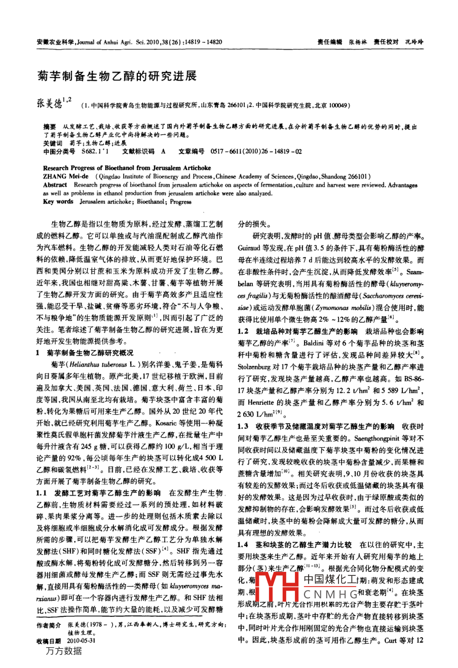 安微農(nóng)業(yè)科學(xué), Joumal of Anhui Agri..Soi.2010,38(26):14819-14820責(zé)任編輯張楊林寶任校對況玲玲菊芋制備生物乙醇的研究進展張美德2(中國科學(xué)院青島生物能源與過程研究所山東青島261012中國科學(xué)院研究生院,北京1009摘要從發(fā)酵工藝、栽培、收獲等方面概逑了國內(nèi)外菊竽制備生物乙醇方面的研究進展,在分析菊芋制備生物乙醇的優(yōu)勢的同時,提出了菊芋制備生物乙醇產(chǎn)業(yè)化中尚待解決的一些問題。關(guān)鍵詞菊芋;生物乙醇;進展中圖分類號S682.1·1文獻標(biāo)識碼A文章編號0517-6611(010)26-14819-02Research Progress of Bioethanol from Jerusalem ArtichokeZHANG Mei-de (Qingdao Institute of Bioenergy and Process, Chinese Academy of Sciences, Qingdao, Shandong 266101)Abstract Research progress of bioethanol from jerusalem artichoke on aspects of fermentation, culture and harvest were reviewed. Advantageswell as problems in ethanol production from jerusalem artichoke were also analyzeey words Jerusalem artichoke; Bioethanol生物乙醇是指以生物質(zhì)為原料,經(jīng)過發(fā)酵、蒸餾工藝制分的損失。成的燃料乙醇。它可以單獨或與汽油混配制成乙醇汽油作研究表明發(fā)酵時的pH值酵母類型會影響乙醇的產(chǎn)率。為汽車燃料。生物乙醇的開發(fā)能減輕人類對石油等化石燃 Guiraud等發(fā)現(xiàn)在pH值35的條件下,具有菊粉酶活性的酵料的依賴降低溫室氣體的排放,從而更好地保護環(huán)境。巴母在半連續(xù)過程培養(yǎng)7d后能達(dá)到較高水平的發(fā)酵效果。而西和美國分別以甘蔗和玉米為原料成功開發(fā)了生物乙醇。在非酸性條件時,會產(chǎn)生沉淀,從而降低發(fā)酵效率。Sam近年來我國也相繼對甜高粱、木薯、甘薯、菊芋等植物開展 belan等研究表明,當(dāng)用具有菊粉酶活性的酵母( kluyeromy了生物乙醇開發(fā)方面的研究。由于菊芋高效多產(chǎn)且適應(yīng)性 ces fragilis)與無菊粉酶活性的釀酒酵母( Saccharomyces cervi.強能忍受干早、鹽堿、貧瘠等惡劣環(huán)境符合“不與人爭糧、siae)或運動發(fā)酵單胞菌(2 zymomonas mobilis)混合使用時,能不與糧爭地”的生物質(zhì)能源開發(fā)原則,因而引起了廣泛的獲得比使用單個微生物高2%-12%的乙醇產(chǎn)量。關(guān)注。筆者綜述了菊芋制備生物乙醇的研究進展旨在為更1.2栽培品種對菊芋z醇生產(chǎn)的影響栽培品種也會影響好地開發(fā)生物能源提供參考。菊芋乙醇的產(chǎn)率。 Baldini等對6個菊芋品種的塊莖和莖1菊芋制備生物乙醇研究概況稈中菊粉和糖含量進行了評估,發(fā)現(xiàn)品種間差異較大。菊芋( Helianthus tuberosus L.)別名洋姜鬼子姜是菊科 Stolzenburg對17個菊芋栽培品種的塊莖產(chǎn)量和乙醇產(chǎn)率進向日葵屬多年生植物。原產(chǎn)北美,17世紀(jì)移植于歐洲目前行了研究,發(fā)現(xiàn)塊莖產(chǎn)量越高,乙醇產(chǎn)率也越高。如BS8遍及加拿大美國英國法國德國意大利、荷蘭、日本、印17塊莖產(chǎn)量和乙醇產(chǎn)率分別為12.2hm2和5589Lh度等國我國從南至北均有栽培。菊芋塊莖中富含豐富的菊而 Henriette I塊莖產(chǎn)量和乙醇產(chǎn)率分別為.6v/hm2和粉轉(zhuǎn)化為果糖后可用來生產(chǎn)乙醇。國外從20世紀(jì)20年代2630Lhm21。開始就已經(jīng)研究利用菊芋生產(chǎn)乙醇。Koai等使用一種凝1.,3收獲季節(jié)及儲藏溫度對菊芋乙醇生產(chǎn)的影響收獲時聚性莫氏假單胞桿菌發(fā)酵菊芋汁液生產(chǎn)乙醇在批量生產(chǎn)中間對菊芋乙醇生產(chǎn)也是至關(guān)重要的。 Saengthongpinit等對不每升汁液含有245g糖,可以獲得乙醉約10L.相當(dāng)于理同收獲時間以及儲藏溫度下菊芋塊莖中菊粉的變化情況進論產(chǎn)量的92%,每公頃每年生產(chǎn)的塊莖可以轉(zhuǎn)化成4500L行了研究發(fā)現(xiàn)較晚收獲的塊莖中菊粉含量減少,而果糖和乙醇和碳?xì)淙剂?。目前已經(jīng)在發(fā)酵工藝、栽培、收獲等蔗糖含量增加。相關(guān)研究表明,9、10月份收獲的塊莖具方面開展了菊芊制備生物乙醇的研究有較差的發(fā)酵效果;而過冬后收獲或低溫儲藏的塊莖具有很1.1發(fā)酵工藝對菊芋乙醇生產(chǎn)的影響在發(fā)酵生產(chǎn)生物好的發(fā)酵效果。這是因為過早收獲時,由于綠原酸或類似的乙醇前,生物質(zhì)材料需要經(jīng)過一系列的預(yù)處理,如材料破發(fā)酵抑制物的存在,會影響發(fā)酵效果。而過冬后收獲或低碎、果肉果漿分離等。進一步的處理則包括木質(zhì)素去除以及將細(xì)胞或半細(xì)胞成分水解消化成可發(fā)酵成分。根據(jù)發(fā)酵溫儲藏時,塊莖中的菊粉會降解成大量可發(fā)酵的糖分,從而具有理想的發(fā)酵效果所需的步驟,可以把菊芋發(fā)酵生產(chǎn)乙醇工藝分為單獨水解發(fā)酵法(SHF)和同時糖化發(fā)酵法(SF)。SHF指先通過1,4莖和塊莖的乙醇生產(chǎn)潛力比較在以往的研究中,主要用塊莖來生產(chǎn)乙醇。近年來開始有人研究用菊芋的地上酸或酶水解將菊粉轉(zhuǎn)化成可發(fā)酵糖分,然后轉(zhuǎn)移到另一容器用細(xì)菌或酵母發(fā)酵生產(chǎn)乙醇:而SF則無需經(jīng)過事先水部分(莖)來生產(chǎn)乙醇。根據(jù)光合同化物分配模式的變解直接用具有菊粉酶活性的一類酵母(如 kluyveromyces mo化中國煤化工期:萌發(fā)和形態(tài)建成sianis)即可在一個容器內(nèi)進行發(fā)酵生產(chǎn)乙醇。和SHF法相