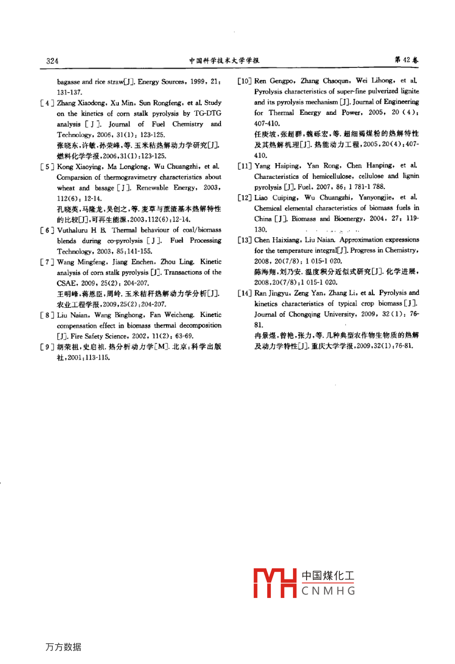 第42卷第4期vo.42,No.42012年4月JOURNAL OF UNIVERSITY OF SCIENCE AND TECHNOLOGY OF CHINAApr.2012文章編號:02532778(2012)04031807麥稈熱解機理研究李小民,李永平,鄧權威,林其釗中國科學技術大學熱科學與能派工程系安合屁230026)摘要:采用熱重法對不同加熱速率、氮氣氣氛條件下的麥稈失重行為進行了研究研究發(fā)現(xiàn),麥稈失重主要由水分析出、有機物熱解和無機物分解等3個階段組成,其中在無機物分解階段還伴隨有輕微的炭化;此外,隨著加熱速率增加,有杋物分解的初始溫度、終了溫度、峰值失重速率對應溫度等相應增加,利用雙外推法推斷了麥稈中有杌物熱解的最概然機理函數(shù),發(fā)現(xiàn)麥稈熱解可以用二級反應機理進行?;?同時,確定了麥稈熱解的活化能、指前因子等反應動力學參數(shù).對利用雙外推法得到的模型計算結果與實驗結果進行了對比,結果表明,兩者之間符合較妤,但仍存在一定偏差.對引起偏差的原因進行了分析關鍵詞:生物質(zhì);熱解;熱重分析;雙外推法中圖分類號:TK6文獻標識碼:Adoi:10.3969/.isn.0253-2778.2012.04.009引用格式:李小民李永平鄧權威,等,麥稈熱解機理研究[門].中國科學技術大學學報,2012,42(4):318324Li Xiaomin, Li Yongping, Deng Quanwei, et al Research on mechanisms of pyrolysis of wheat straw[]. Journal of University of Science and Technology of China, 2012, 42(4): 318-324.Research on mechanisms of pyrolysis of wheat strawLI Xiaomin, LI Yongping, DENG Quanwei, LIN QizhaoCUhniuersity of Sciene and Technology of China. De partment of Thermal Science and Energy Engineering, Hefei 230026, China)Abstract: a thermogravimetric experiment was performed to investigate the mass loss of wheat straw ininertial ambience of nitrogen. The results show that, in the process of mass loss, there exist three stages:preheat drying, pyrolysis and thermal decomposition of inorganic components, accompanying mildcarbonization in the third stage. At the same time, the characteristic parameters, such as onsettemperature, final temperature and peak temperature, increase along with the increase of heating rate.Furthermore, the dual extrapolation method was utilized to obtain appropriate kinetic mechanisms tomodel the pyrolysis of wheat straw. It was concluded that the mechanisms of pyrolysis for wheat strawfollow second-order reaction. In addition, the parameters of chemical kinetics, such as activation energyand frequency factor, were obtained as well. The preliminary comparisons between the model and thexperimental data validate the reliability of the kinetic mechanisms as a whole. Finally, the causes of thediscrepancy were analyzed.Key words: biomass; pyrolysis; thermo-gravimetric analyse; dual extrapolation method收稿日期:201107-18修回日期:2011-10-14基金項目:國家重點基礎研究發(fā)展(973)計劃(2010CB22730)資助YHS中國煤化工作者簡介:李小民,男,1971年生博士生,研究方向:秸稈生物質(zhì)利用CNMHG通訊作者林其釗博上/教授,Emai:qlin@ use edu en第4期麥稈熱解機理研究0引言1實驗方法熱解是生物質(zhì)熱化學轉換的初始反應,對熱1.1實驗原料化學轉換裝置的效率、運行水平等具有重要影本文利用熱重法對麥稈熱解進行了研究.為了響口.熱重法是生物質(zhì)熱解研究的常用方法14.消除顆粒粒徑對反應的影響,采用的試樣粒度為劉乃安等2利用熱重法對林木的熱解進行了研100~120pm麥稈試驗樣品的主要性質(zhì)參數(shù)如表1究,認為可以使用二級反應動力學模型對其進行所示?;? Nassar等{3利用熱重法研究了稻殼熱解,使1.2實驗儀器與實驗條件用的是準一級反應模型.張曉東等利用熱重法使用日本島津的熱分析裝置DTG60H得到了研究了玉米秸稈的熱解,采用的反應機理為一級麥稈樣品的熱重分析(TGA)曲線和微分熱重分析反應,孔曉英等利用熱重法對麥稈和蔗渣的熱(DTG)曲線;采用DSC60得到了差熱分析(DTA)解進行了比較研究,分析了加熱速率對麥稈和蔗線,參比物為aAl2O為.實驗時加熱爐由室溫加熱渣熱解特性的影響. Vuthaluru利用熱重法對麥到1273K,升溫速率分別為5,10,20,40K/min,加稈/煤混合物的熱解特性進行了研究,分析了不同熱爐通入的氮氣流速為50mL/min,每次實驗使用比例混合物的熱解特性眾所周知,在熱解動力學的樣品約為10mg為了消除系統(tǒng)誤差,每個實驗結研究中,由于反應活化能和指前因子的補償效應,束后作一個相同條件下的空白實驗使很多機理函數(shù)都能有一個良好的線性結果81這使研究得到的同一物質(zhì)的動力學參數(shù)出入很2結果與討論大. Vuthaluru!°在麥稈熱解研究中,當反應級數(shù)取2.1麥稈熱解失重行為0.8時,計算得到的活化能為80.2kJ/mol,指前因實驗得到的4種加熱速率條件下的熱重分析曲子為1.6×10min-;而當反應級數(shù)取0.52時,計線如圖1所示,微分熱重曲線如圖2所示,差熱分析算得到的活化能為1148kJ/mol,指前因子為曲線如圖3所示4.7×10°min-.這是由于選擇的機理函數(shù)與實際從圖1、圖2和圖3可以看出,麥稈失重主要經(jīng)發(fā)生的動力學過程之間存在差異造成的,故選擇最歷3個階段首先是水分析出階段,主要是麥稈中自概然機理函數(shù)非常重要.最概然機理函數(shù)的推斷方法很多,如雙外推法、 Satava法、 bagchi法、 Malek法等.王明峰等利用 Malek法推斷了玉米秸稈解的機理函數(shù),認為玉米秸稈熱解服從隨機成核K/隨后生長機理任庚坡等0利用雙外推法對元寶山褐煤的熱解機理進行了推斷,認為其熱解服從 Anti-Jander的三維擴散機理.本文首先利用熱重法,對麥稈熱解進行了實驗研究然后利用雙外