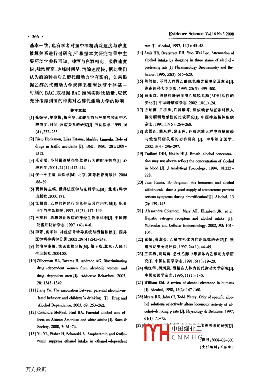 記得升學20年第16卷(第3期)酒的種類對乙醇代謝動力學的影響白璐‘廖林川“顏有儀*北京市疾病預防控制中心,北京100020;*四川大學華西醫(yī)學中心法醫(yī)學院成都610041)【摘要】目的乙醇代謝動力學受諸多因素形響,關(guān)于酒的種類對其彩響少見報道。方法本研究讓志愿者在相同的飲酒時間內(nèi),飲用含相同乙醇量的啤酒、白酒,將所得數(shù)據(jù)用藥代動力學計算程序DASver1.0進行處理。結(jié)果乙醇的體內(nèi)過程符合一級吸收、非線性消除、一室模型,權(quán)重為1。啤酒與白酒相比,嗄收速度快,濃度高,達峰時間早,消除速度快。姷論酒的種類對乙醇代謝動力學有彩響,如果根據(jù)乙醇的代謝動力學規(guī)律來推測飲酒個體某一時剡的BAC,或根據(jù)BAC推測實際飲酒量,應(yīng)該充分考慮到酒的種類財乙醇代謝動力學的影響【關(guān)鍵詞】乙醇;代謝動力學;酒的種奧;頂空氣相色譜法【中圖分類號】D9194【文獻標識碼】A【文章編號】1674-1226(2008)03-0361-06The Pharmacokinetic Effects of Beer and Liquor. Bai Lu, Liao Linchuan, Yan Youyi. Beiing Municipal Cen-ter for Disease Prevention and Control, Beying 100020, China.[Abstract] The pharmacokinetic effects of alcohol are subject to the influence of many factors. Differenttypes of alcohol products have varying effects, but are seldom reported. This study investigated in 9 healthy volun-teers the effects after their oral administration of 50g alcohol per capita according to the alcohol consistency ofliquor and beer. Blood and urine samples were collected to examine the concentration of alcohol at different inter-rals after administration. The result showed that during the same interval after drinking, compared with liquor, ab-sorption of alcohol is faster for beer, its Cmax is higher, and its Tmax is earlier with faster clearance. Thereforethe pharmacokinetic effects of various alcohol products should be considered when we conjecture the drinkingdose according to BAC, or BAC according to the total drinking dose in a certain time.[Key Words] Alcoho, Pharmacokinetic Efects, Alcohol Types, Headspace Gas Chromatography乙醇( Alcohol)俗稱酒精,是酒精飲料的主要循環(huán)運送至大腦作用于腦中樞神經(jīng)細胞膜上的成分,是世界范圍內(nèi)被普遍濫用的一種物質(zhì)。過某些酶影響細胞功能,從而影響自我行為控制量飲酒會損害健康,也可能會引起行為異常,導能力。因為血液中乙醇濃度( Blood alcohol致意外甚至犯罪,號比如車禍、吸入嘔吐物窒息 concentration,BAC)最能直接反映乙醇對人體造而死、酒后肇事等?,F(xiàn)有研究表明,乙醇進入人體成的影響,所以很多情況下都需對BAC進行檢后吸收、分布、代謝有一般的規(guī)律,通過血液測,并以BAC檢測結(jié)果作為正確處理與乙醇有中國煤化工CNMHG白璐,碩士,北京市疾病預防控制中心研究人員,主要從事毒(藥)物廖林川,四川大學華西醫(yī)學中心法醫(yī)學院教授博士生導師主要從事毒(藥)物分析方面研究。362Evidence science vol 16 No. 3 2008關(guān)的事(案)件的主要依據(jù)。同時,尿中乙醇濃度歲,身體健康肝、腎功能正常隨機編為1~9號,( Urine alcohol concentration,UAC)也能反映乙醇均體重64kg代謝動力學的情況。二、實驗方法和檢測方法飲酒后,BAC與乙醇代謝動力學密切相關(guān),以往有學者試圖揭示出普遍適用的乙醇代謝動實驗志愿者受試前3天禁酒。實驗開始前,力學規(guī)律,并由此來推測飲酒個體某一時刻的在肘部靜脈放入靜脈留置針用肝素鈉作為抗凝BAC,或根據(jù)BAC推測實際飲酒量。但實際上,劑。按50g乙醇/劑量讓志愿者在30mn內(nèi)勻乙醇代謝動力學受飲酒方式、飲酒的種類、飲酒速飲完酒邊飲酒邊進食食物葷素搭配。飲第一時所吃的食物種類以及肝酶活性等多種因素的口酒后開始計時在不同時間點采血,在實驗志影響此類問題受到眾多學者的關(guān)注,而愿者有尿意時采集尿液,記錄采尿時間和采尿有關(guān)這方面的研究又少見報道。本文通過研究酒量,應(yīng)用頂空氣相色譜法對血液和尿液進行檢的種類對乙醇代謝動力學的影響,為進一步揭示測。實驗分兩次進行;第一次仗啤酒,第二次飲白乙醇代謝動力學規(guī)律提供基礎(chǔ)研究資料。酒,兩次實驗間隔3天以上。采集的血液和尿液應(yīng)用頂空氣相色譜法進儀器、試劑、實驗材料及對象行檢測,以異丙醇為內(nèi)標。色譜條件如下:頂空平氣相色譜儀,頂空進樣儀。乙醇(色譜純),異衡溫度60℃,進樣環(huán)溫度125℃,傳輸線溫度丙醇(色譜純),超純水(電阻率≥183M)。白125℃,樣品平衡時間10min,進樣間隔時間10酒,酒精度56%(VN);啤酒,酒精度4%(VⅣ);min;WAX52CB毛細管柱(30mx0.25mmx0.25兩種酒的酒精度用文中所建乙醇檢測方法進行pm),柱溫48℃,進樣口溫度220℃;FID檢測器檢測并得到確認。溫度250℃,載氣為氮氣,流速1 ml/min,氫氣流根據(jù)實驗志愿者的一般情況調(diào)查表,結(jié)合實速30 ml/min,空氣流速300 ml/min,分流比20:1,際情況,選擇9名不經(jīng)常飲酒的男性實驗志愿者檢測時間8min(四川大學華西醫(yī)學中心在校學生),年齡22~28三、實驗結(jié)果和數(shù)據(jù)處理裹19名實驗志愿者30分鐘內(nèi)飲啤酒BAC檢測結(jié)果BAC檢測結(jié)果(mg/100mL)39平均值0080.25468028170.37292o0859702160.500677154641.50700003852%7249395658中國煤化工10.0000000030001200RHSCNMHG注:“一”未采到血。記學20年第16卷(第3期)饔29名實驗志愿者30分鐘內(nèi)飲白酒BAC檢測結(jié)果BAC檢測結(jié)果(mg/100mL)278平