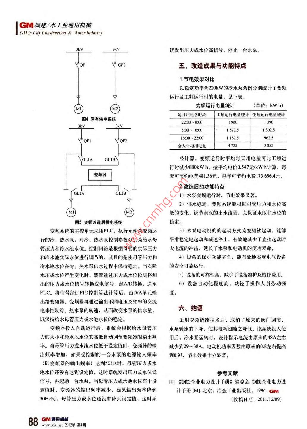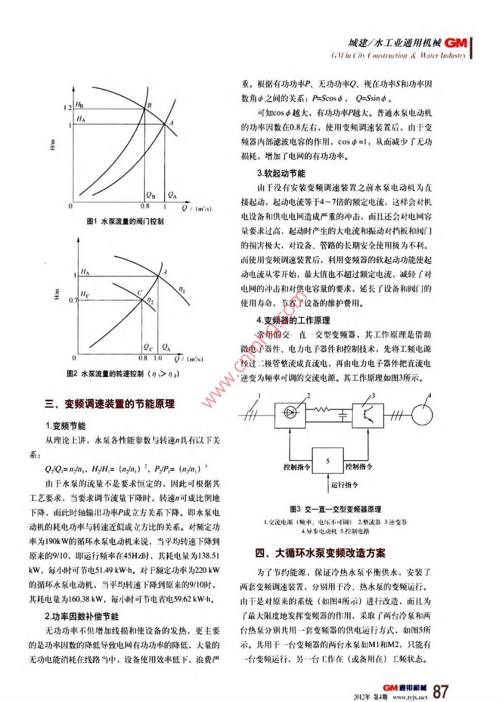 GM城建水工業(yè)通用機(jī)械6, lin cis(atnet . t later ledon變頻調(diào)速裝置在循環(huán)水泵中的應(yīng)用中鋁洛陽銅業(yè)有限公司(河南471039)王桂霞【摘要】由于水系電動機(jī)都是按照滿足最大運行循環(huán)水泵配套電動機(jī)有兩種型號,一種Y355-6,工況設(shè)計的、因此在非最大負(fù)荷時電動機(jī)輸出了相當(dāng)額定電壓3kV,額定電流55.5A,額定功率220kW,部分多功率、浪費電能。采用變煩調(diào)速后,閥門全定轉(zhuǎn)速985/min,2臺;另一種JS1286,額定電壓開,不需閥門調(diào)節(jié),提高了系統(tǒng)的自動化運行程度,變3kV,額定電流469A,額定功率19kW,額定轉(zhuǎn)速頻器自動根據(jù)需求量調(diào)節(jié)轉(zhuǎn)速、而且平滑穩(wěn)定,不但節(jié)980rmin,6臺。約了能源,而且減少了職工的勞動工作量?!娟P(guān)鍵詞】變頻調(diào)速功率能耗流量壓力二、水泵特性分析水泵節(jié)能如圖和圖2所示,分別為閥門控制和轉(zhuǎn)速控制流量的特性曲線。根據(jù)水泵的功率(P)、流量(Q)與壓力(H)三者之間的關(guān)系:P=QH,由圖可知,當(dāng)、前言流量降到80%時,功耗為原來的96%,即PB=HaQt中鋁洛銅是高耗水企業(yè),生產(chǎn)用水主要用于設(shè)備0.96P。以及產(chǎn)品的直接和間接冷卻。隨著公司生產(chǎn)規(guī)模的不斷由圖2可見,當(dāng)流量下降到80%時,功耗為原來的擴(kuò)大以及10萬(高精度電子銅板帶系統(tǒng)陸續(xù)投產(chǎn),生產(chǎn)56%,降低了4%,即PC=HQ=0.56P。由此可得,用水量大幅增加。為滿足生產(chǎn)用水需要,擔(dān)負(fù)公司生產(chǎn)調(diào)速比調(diào)閥門增加的節(jié)電率為41%。供水任務(wù)的動力廠大循環(huán)水泵站也進(jìn)行了擴(kuò)建,新增綜上所述,對于水泵來說,按照其工藝要求的流循環(huán)水泵2臺。循環(huán)水泵站現(xiàn)有循環(huán)水泵8臺,其中3臺量,實現(xiàn)變速變流量控制,是節(jié)電的最有效方法。是冷泵,4臺是熱泵,另一臺水泵根據(jù)需要既可作冷泵對于循環(huán)水泵站,傳統(tǒng)的流量控制方式是:當(dāng)流用,也可作熱泵用。量需要改變時,操作人員通過調(diào)節(jié)閥門的開度進(jìn)行控大循環(huán)水泵站主要工藝流程為:從用戶回收的廢制,電動機(jī)的輸出功率沒有改變,因而用電量也沒有改水及臟水經(jīng)初沉池后進(jìn)入熱水池,由熱水泵泵到冷卻塔變,造成了一定程度的能源浪費。為了節(jié)約能源,提高上冷卻、然后經(jīng)隔油池、氣浮池和濾池,回到冷水池,調(diào)整的精度和速度,減輕職工的勞動強(qiáng)度,公司在201l再由冷水泵供給用戶,如此反復(fù)循環(huán)利川。年7、8月份對大循環(huán)水泵站進(jìn)行了變頻改造86GM通用醺uwyi.t2012年第4明城建/水工業(yè)通用機(jī)械cMG l/in(itt (ansruetinn t' later IndusTr重。根據(jù)有功功率P、無功功率Q、視在功率S和功率因數(shù)角中之間的關(guān)系:P=Scos,Q=sind可知cosφ越大,有功功率P越大。普通水泵電動機(jī)的功率因數(shù)在0.8左右,使用變頻調(diào)速裝置后,由于變頻器內(nèi)部濾波電容的作用,cosφ≈l,從而減少了無功損耗,增加了電網(wǎng)的有功功率。3軟起動節(jié)能由于沒有安裝變頻調(diào)速裝置之前水泵電動機(jī)為直2B g接起動,起動電流等于4~7倍的額定電流,這樣會對機(jī)圖1水泵流量的閥門控制電設(shè)備和供電電網(wǎng)造成嚴(yán)重的沖擊,而且還會對電網(wǎng)容量要求過高,起動時產(chǎn)生的大電流和振動對擋板和閥門的損害極大,對設(shè)備、管路的長期安全使用極為不利。而使用變頻調(diào)速裝置后,利用變頻器的軟起動功能使起動電流從零開始,最大值也不超過額定電流、減輕了對電網(wǎng)的沖擊和對供電容量的要求,延長了設(shè)備和閥門的0使用存命,節(jié)省了設(shè)備的維護(hù)費用。4變頻器的工作原理常用的交直一交型變頻器,其工作原理是借助gc pa微電子器件、電力電子器件和控制技術(shù),先將工頻電源經(jīng)過二極管整流成直流電,再由電力電子器件把直流電圖2水泵流量的轉(zhuǎn)速控制(n1>n2)逆變?yōu)轭l率可調(diào)的交流電源。其工作原理如圖3所示。三、變頻調(diào)速裝置的節(jié)能原理變頻節(jié)能從理論上講,水泵各性能參數(shù)與轉(zhuǎn)速n具有以下關(guān)Q/Q=n /n, H JH=(n /n, ) P/P=(n n,控制指令控制指令由于水泵的流量不是要求恒定的,因此可根據(jù)其運行指令工藝要求,當(dāng)要求調(diào)節(jié)流量下降時,轉(zhuǎn)速n可成比例地下降,而此時軸輸出功率P成立方關(guān)系下降。即水泵電圖3變一直一交型變頻器原理動機(jī)的耗電功率與轉(zhuǎn)速近似成立方比的關(guān)系。對額定功1交流電源(頻率,電壓不可調(diào))2整流器3逆變器4異步電動機(jī)5控制電路率為190kW的循環(huán)水泵電動機(jī)米說,當(dāng)平均轉(zhuǎn)速下降到原來的9/10,即運行頻率在45Hz時,其耗電量為138.51四、大循環(huán)水泵變頻改造方案kW,每小時可節(jié)電5149kWh。對于額定功率為220kW為了節(jié)約能源,保證冷熱水泵平衡供水,安裝了的循環(huán)水泵電動機(jī),當(dāng)平均轉(zhuǎn)速下降到原來的910時,兩套變頻調(diào)速裝置,分別用于冷、熱水泵的變頻運行其耗電量為l6038kW,每小時可節(jié)電省電5962kWh。由于是對原來的系統(tǒng)(如圖4所示)進(jìn)行改造,而且為2功率因數(shù)補償節(jié)能了最大限度地發(fā