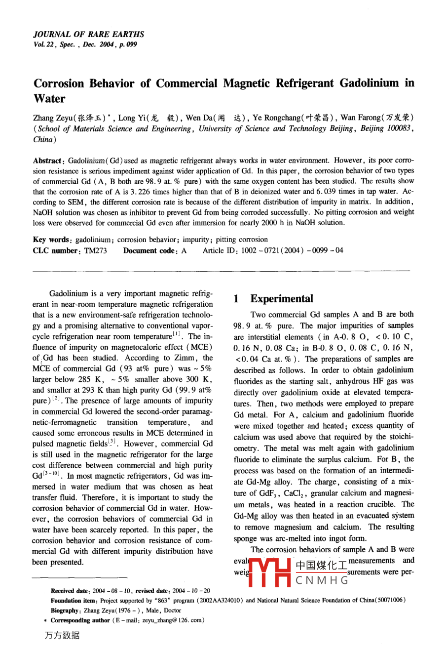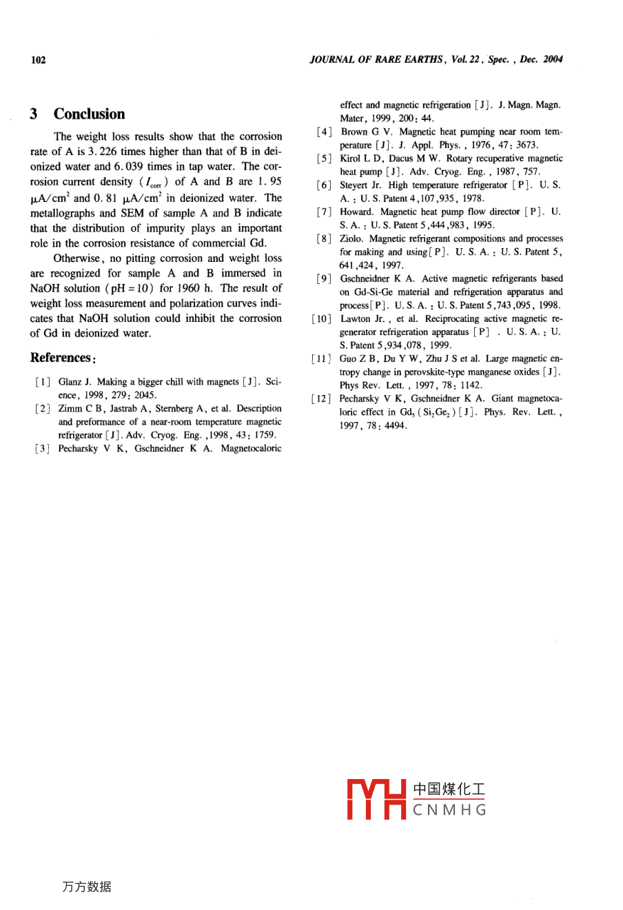 JOURNAL OF RARE EARTHS .Vol. 22, Spec. , Dec. 2004, p. 099Corrosion Behavior of Commercial Magnetic Refrigerant Gadolinium inWaterZhang Zeyu(張澤玉)*, Long Yi(龍毅), Wen Da(聞達(dá)), Ye Rongchang(葉榮昌), Wan Farong(萬發(fā)榮)(School of Materials Science and Engineering, University of Science and Technology Bejing, Bejing 100083,China)Abstract: Gadolinium( Gd ) used as magnetic refrigerant always works in water environment. However, its poor COrTO-sion resistance is serious impediment against wider application of Gd. In this paper, the corrosion behavior of two typesof commercial Gd (A, B both are 98.9 at. % pure) with the same oxygen content has been studied. The results showthat the corrosion rate of A is 3. 226 times higher than that of B in deionized water and 6. 039 times in tap water. Ac-cording to SEM, the different corrosion rate is because of the different ditribution of impurity in matrix. In addition ,NaOH solution was chosen as inhibitor to prevent Gd from being corroded scessfully. No pitting corrosion and weightloss were observed for commercial Gd even after immersion for nearly 2000 h in NaOH solution.Key words: gadolinium; corrosion behavior ; impurity; pitting corrosionCLC number: TM273Document code: AAricle ID: 1002 -0721 (2004) -0099 -04Gadolinium is a very important magnetic refrig-1 Experimentalerant in near- room temperature magnetic refrigerationthat is a new environment-safe refrigeration technolo-Two commercial Gd samples A and B are bothgy and a promising alternative to conventional vapor-98.9 at. % pure. The major impurities of samplescycle refrigeration near room temperature. The in-are interstitial elements (in A-0. 80,<0. 10 C,fluence of impurity on magnetocaloric effect ( MCE)0.16N, 0.08 Ca; in B-0.8 O, 0.08 C, 0.16 N,of ,Gd has been studied. According to Zimm, the<0.04 Ca at. % ). The preparations of samples areMCE of commercial Gd (93 at% pure) was ~ 5%described as follows. In order to obtain gadoliniumlarger below 285 K,~ 5% smaller above 300 K ,fluorides as the starting salt, anhydrous HF gas wasand smaller at 293 K than high purity Gd (99.9 at%directly over gadolinium oxide at elevated tempera-pure)2). The presence of large amounts of impuritytures. Then, two methods were employed to preparein commercial Gd lowered the second- order paramag-Gd metal. For A, calcium and gadolinium fluoridenetic-ferromagnetic transition temperature, andwere mixed together and heated; excess quantity ofcaused some erroneous results in MCE determined incalcium was used above that required by the stoichi-pulsed magnetic fields3. However , commercial Gdometry. The metal was melt again with gadoliniumis still used in the magnetic refrigerator for the largefluoride to eliminate the surplus calcium. For B, thecost difference between commercial and high purityprocess was based on the formation of an intermedi-Gds- 10。 In most magnetic refrigerators, Gd was im-mersed in water medium that was chosen as heatate Gd-Mg alloy. The charge, consisting of a mix-ture of GdF3, CaCl2,granular calcium and magnesi-transfer fluid. Therefore, it is important to study them metals, was heated in a reaction crucible. Thecorrosion behavior of commercial Gd in water. How-ever, the corrosion behaviors of commercial Gd inGd-Mg alloy was then heated in an evacuated systemwater have been scarcely reported. In this paper, theto remove magnesium and calcium. The resutingcorrosion behavior and corrosion resistance of com-sponge was arc-melted into ingot form.mercial Gd with different impurity distribution haveThe corrosion behaviors of sample A and B werebeen presented.eval中國煤化工. measurements anweigsurements were per-MHCNMHGReceived date: 2004 -08 - 10, revised date: 2004 - 10 -20Foundation item: Project spprted by "863" program (2002AA324010) and National Natural Science Foundation of China(50071006)Biography: Zhang Zeyu( 1976- ), Male, DoctorCorresponding author (E - mail: zeyu_ zhang@ 126. com)100JOURNAL OF RARE EARTHS, Vol.22, Spec. , Dec. 20041.0(ab)0.5BI0.0而-0.5-1.0--1.5Fig.2 Photographs of(a)A and ( b)B immersed2.0-in deionized water for 168 h-9-8-7-6-5-4-3-2log()JA metal8B metalFig.1 Potentiodynamic polarization curves豆1.2of A and B in deionized water票1.0formed in a three-elctrode cell using a platinum0.8|mesh as a counter electrode and a saturated0.6|calomel electrode ( SCE) as a reference elec-0.4trode. Potentiodynamic polarization curves were0.2measured with a potential sweep rate of 18 mV .min'0.0LTap waterDeionized waterto construct the Tafel plots ( logarithmic variation ofcurrent as a function of voltage). The working elec-trode was made by attaching Cu wire to one end ofFig.3 Corrosion rates of A and B in dif-the specimens and sealing into a plastic tube with ep-ferent wateroxy resin. Before immersion test for the detection 0To further investigate the different corrosion re-weight loss, the specimens were carefully groundsults for A and B with nearly same purity, the impu-with silicon carbide papers up to NO. 1000, de-rity distribution and corrosion behaviors were ana-greased in acetone and dried in air. After immersion ,lyzed by optical microscopy and SEM. Fig. 4 ilus-the specimens were cleaned manually. The surface oftrates the metallographs of A and B that have notspecimen was ground again and new fresh solutionbeen immersed in water. There are many circular andwas used for each measurement. Magnetization werelttesized impurities, which are dispersed uniformlymeasured from 278 K to 310 K by the superconduct-in sample A. The sample B had fewer impurities ,ing quanta interfere device ( SQUID).which are bigger than that in sample A but dispersed2 Results and Discussionmore concentratedly. The SEM of sample A and Bthat immersed in deionized water for 1 hour arePotentiodynamic polarization curves for A and Bshown in Fig. 5. It is obvious that corrosion occurredimmersed in deionized water at room temperature areat the boundary between the impurity and matrix 