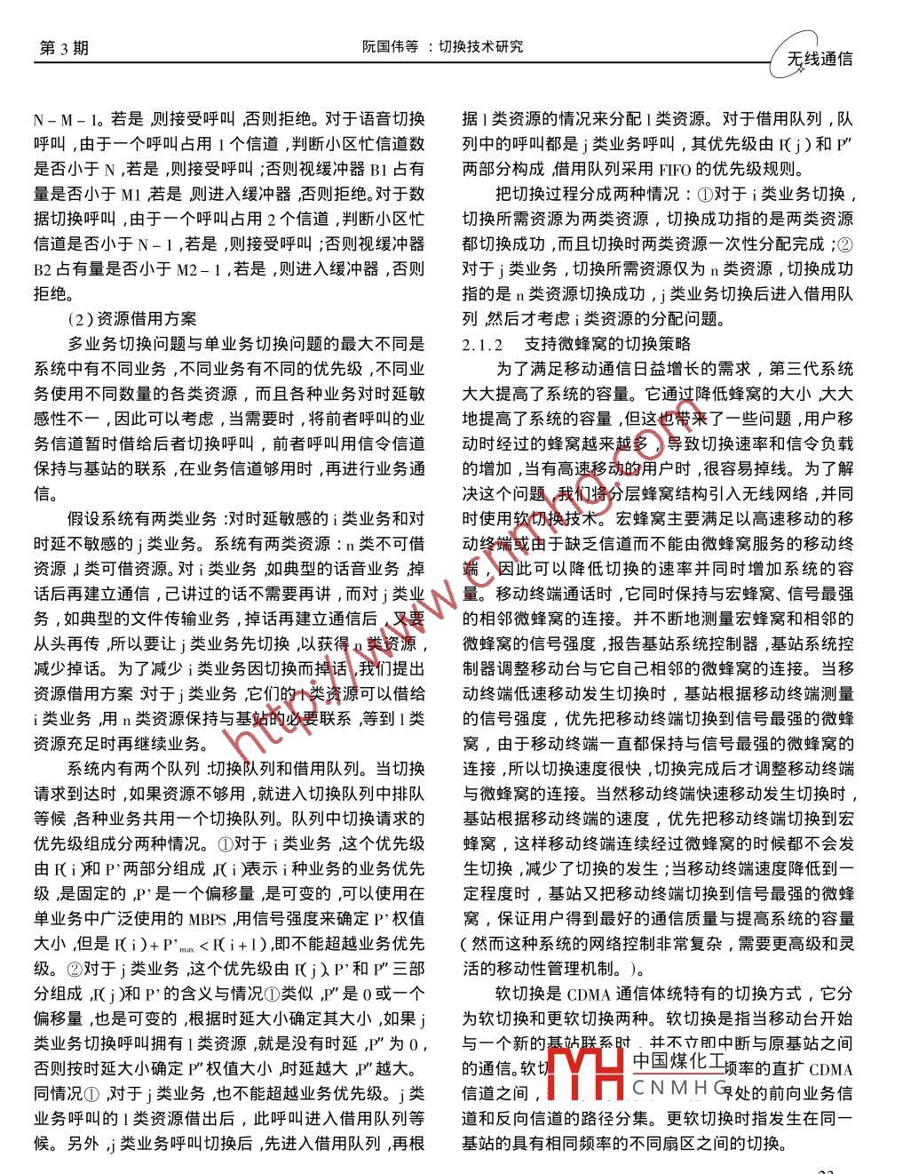 2004年3月第24卷第3期廣東通信技術(shù)Vol .24 No.3 March 2004GUANGDONG COMMUNICATION TECHNOLOGY無(wú)線(xiàn)通信切換技術(shù)研究The Study on Handover Technology阮國(guó)偉黃本雄王芙蓉(華中科技大學(xué))摘要隨著通信的發(fā)展新業(yè)務(wù)的增加給移動(dòng)通信系統(tǒng)帶來(lái)新的技術(shù)問(wèn)題,也對(duì)切換提出了更高的要求。微小區(qū)的應(yīng)用導(dǎo)致切換的頻繁發(fā)生。多業(yè)務(wù)的并存也使切換的策略發(fā)生了改變。面對(duì)切換的新問(wèn)題本文先詳細(xì)介紹當(dāng)前的切換技術(shù)然后指出解決當(dāng)前問(wèn)題的方法最后提出切換的研究方向。關(guān)鍵詞切換切換策略 多 業(yè)務(wù)切換微小區(qū)切換 新呼叫 切換呼叫 業(yè) 務(wù)模型也是針對(duì)單業(yè)務(wù)系統(tǒng)的。但第三代通信系統(tǒng)也將要投1引言入使用,第三代系統(tǒng)與第二代系統(tǒng)相比,有兩個(gè)明顯的現(xiàn)在,無(wú)線(xiàn)移動(dòng)網(wǎng)絡(luò)己經(jīng)成為通信基礎(chǔ)網(wǎng)絡(luò)中非優(yōu)點(diǎn),一是支持高速的數(shù)據(jù)業(yè)務(wù),使通信系統(tǒng)能承載多常重要的部分,成為人們生活中的-部分,人們對(duì)通信種業(yè)務(wù);二是使用微蜂窩技術(shù),使 系統(tǒng)容量大大增加。的要求也越來(lái)越高,希望隨時(shí)隨地都能享受到通信所為了支持系統(tǒng)的這些優(yōu)點(diǎn),切換的策略也要做相應(yīng)的帶來(lái)的豐富多彩的服務(wù)。但是在目前的無(wú)線(xiàn)移動(dòng)網(wǎng)絡(luò)改變。中,嚴(yán)重的帶寬限制己經(jīng)不能滿(mǎn)足人們?cè)絹?lái)越多的需2.1.1支持多業(yè)務(wù)的切換策略求,迫使設(shè)計(jì)者將服務(wù)區(qū)域分為能夠重復(fù)使用無(wú)線(xiàn)頻第三代移動(dòng)通信系統(tǒng)支持寬帶多媒體業(yè)務(wù),如語(yǔ)譜的蜂窩而且蜂窩還有越來(lái)越小的趨勢(shì)。當(dāng)移動(dòng)臺(tái)從音、數(shù)據(jù)等多種業(yè)務(wù)。不同的業(yè)務(wù)對(duì)切換有不同的要一個(gè)蜂窩移動(dòng)到另一個(gè)蜂窩時(shí),呼叫需要從一個(gè)基站求。語(yǔ)音業(yè)務(wù)對(duì)時(shí)延很敏感,但它對(duì)誤碼率要求比較;切換到另-一個(gè)基站。蜂窩越小,切換的平均次數(shù)將越低,數(shù)據(jù)業(yè)務(wù)對(duì)時(shí)延不太敏感,但是它要求數(shù)據(jù)分組傳多。很顯然,這樣的切換嚴(yán)重影響了呼叫的服務(wù)質(zhì)量,輸?shù)目煽啃院芨?即要求誤碼率很低。所以要分別對(duì)待從而嚴(yán)重影響蜂窩系統(tǒng)的設(shè)計(jì)和性能。另外通信系統(tǒng)這兩種業(yè)務(wù)的切換。下面先介紹基本的切換策略再介的各種業(yè)務(wù)對(duì)切換的要求也不一樣,切換的時(shí)候要區(qū)紹對(duì)多業(yè)務(wù)系統(tǒng)應(yīng)采用的切換策略:別對(duì)待,這樣就增加了切換的復(fù)雜性。因此,如何減少①無(wú)優(yōu)先級(jí)策略,基站對(duì)新呼叫請(qǐng)求和切換呼叫切換,并使切換平滑進(jìn)行是-個(gè)蜂窩移動(dòng)通信系統(tǒng)是請(qǐng)求不做任何區(qū)別,在這種情況下,若沒(méi)有空閑信道分否成功的重要標(biāo)志。所以進(jìn)行切換的研究是十分必要配給呼叫就將其清除。的。②排隊(duì)優(yōu)先權(quán)策略,如果沒(méi)有信道可用,則新到呼叫會(huì)形成呼損,但切換呼叫可以排隊(duì)等候信道釋放,2切換技術(shù).而且排隊(duì)等候信道的釋放可以是多種多樣的。2.1切換策略③預(yù)留信道策略,為了降低切換呼叫的失敗率每.當(dāng)前,各國(guó)使用的通信系統(tǒng)主流是第二代通信系個(gè)蜂窩都預(yù)留出固定數(shù)量的信道,專(zhuān)用于切換呼叫,如統(tǒng),由于第二代系統(tǒng)的業(yè)務(wù)比較單一,所以切換的策略果空閑信道數(shù)大于保留信道數(shù),則新呼叫到達(dá)不形成阮國(guó)偉電子 與信息工程系碩士研究生, 主要研究方向:下一代呼損,而對(duì)于切換呼叫只要有空閑信道就不會(huì)形成呼網(wǎng)絡(luò)中的切換技術(shù)。黃本雄電子與信息工程系教授 ,碩士生導(dǎo)師,主要研究方向:多叫接近接收④基于MH中國(guó)煤化工換請(qǐng)求是根據(jù)呼媒體通信技術(shù)。CNMHG不是按照先入先王芙蓉電子與信息工程系教授 ,碩士生導(dǎo)師,主要研究方向:移服務(wù)的原則給這些呼叫分配信道。動(dòng)通信系統(tǒng)和軟件工程。⑤半速策略,將每個(gè)小區(qū)定義一些信道,當(dāng)該小21廣東通信技術(shù)2004年無(wú)線(xiàn)通信.區(qū)信道繁忙時(shí),可以暫時(shí)將這些信道-分為二,即半速權(quán)最高。信道,-個(gè)信道用于正在進(jìn)行的呼叫,另一個(gè)用于切換假設(shè)語(yǔ)音信道占用一個(gè)信道,業(yè)務(wù)信道占用兩個(gè)呼叫。以使切換呼叫繼續(xù)進(jìn)行減少了強(qiáng)制中斷率。當(dāng)信道。新呼叫和切換呼叫的業(yè)務(wù)模型如圖1( a)和圖1一個(gè)半速信道釋放后,可以與其他空閑的半速率信道(b)所示,其中M為保留信道數(shù),供切換呼叫專(zhuān)用,B1結(jié)合成一個(gè)全速率信道,但這種方法實(shí)現(xiàn)起來(lái)需要空為語(yǔ)音業(yè)務(wù)切換呼叫的緩沖器,B2為數(shù)據(jù)業(yè)務(wù)切換的中接口的結(jié)構(gòu)能夠支持將全速信道分成兩個(gè)子速率信緩沖器。道的功