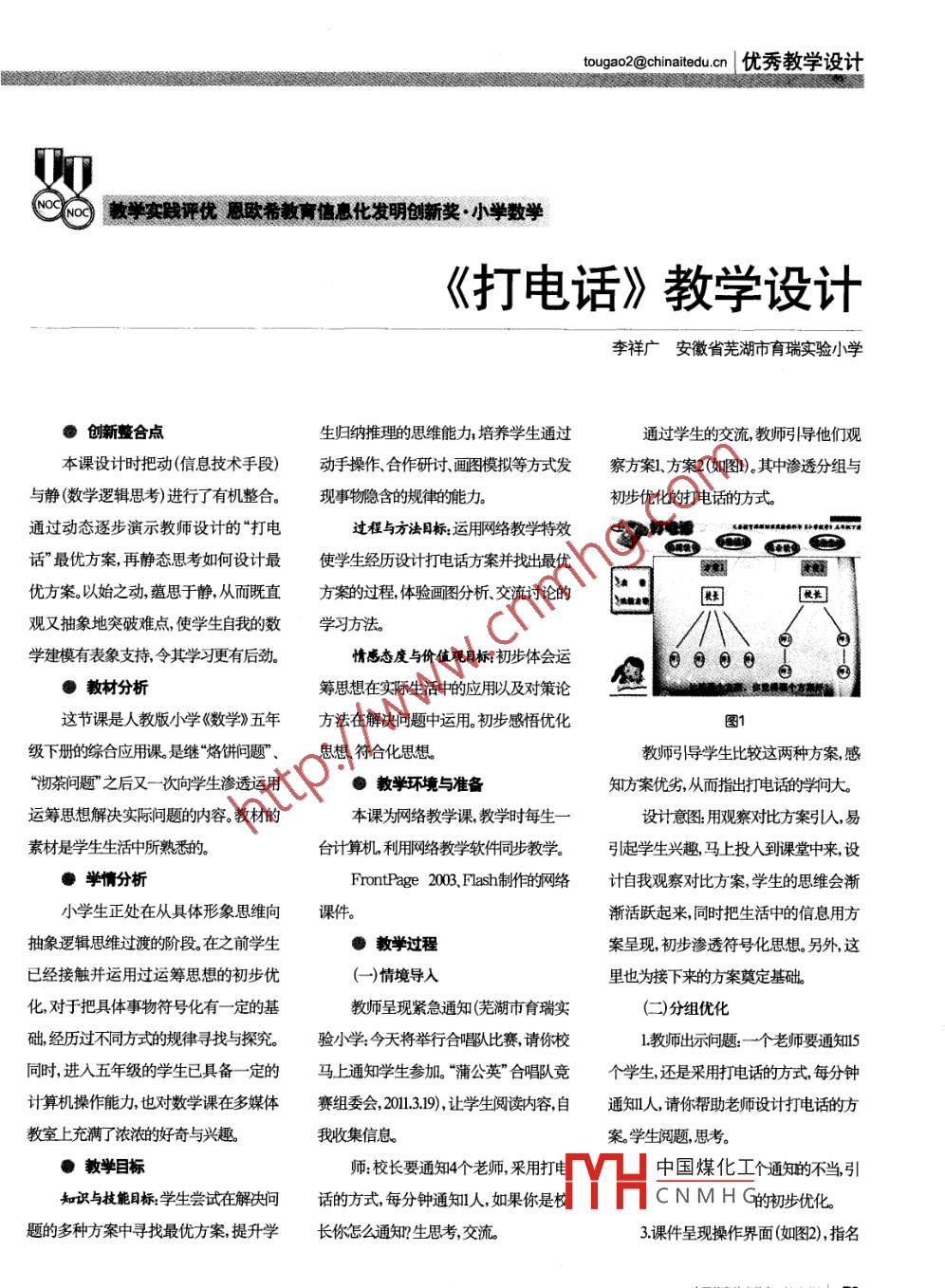 tougao2@chinaitedu.cn優(yōu)秀教學(xué)設(shè)計0CoSMo教學(xué)實踐評優(yōu)惠歐希教育信息化發(fā)明創(chuàng)新獎.小學(xué)數(shù)學(xué)《打電話》教學(xué)設(shè)計李祥廣安徽省蕪湖市 育瑞實驗小學(xué)D創(chuàng)新整合點生歸納推理的思維能力培養(yǎng)學(xué)生通過通過學(xué)生的交流,教師引導(dǎo)他們觀本課設(shè)計時把動(信息技術(shù)手段)動手操作合作研討、畫圖模擬等方式發(fā)察方案1.方案2(如圖)。其中滲透分組與與靜(數(shù)學(xué)邏輯思考)進(jìn)行了有機(jī)整合。現(xiàn)事物隱含的規(guī)律的能力。初步優(yōu)化的打電話的方式。通過動態(tài)逐步演示教師設(shè)計的“打電過程與方法標(biāo):運(yùn)用網(wǎng)絡(luò)教學(xué)特效書電g話”最優(yōu)方案,再靜態(tài)思考如何設(shè)計最使學(xué)生經(jīng)歷設(shè)計打電話方案并找出最優(yōu)優(yōu)方案。以始之動,蘊(yùn)思于靜,從而既直方案的過程,體驗畫圖分析、交流討論的觀又抽象地突破難點,使學(xué)生自我的數(shù)學(xué)習(xí)方法。學(xué)建模有表象支持,令其學(xué)習(xí)更有后勁。情感態(tài)度與價值觀目標(biāo):初步體會運(yùn)????●教材分析籌思想在實際生活中的應(yīng)用以及對策論這節(jié)課是人教版小學(xué)《數(shù)學(xué)》五年方法在解決問題中運(yùn)用。初步感悟優(yōu)化圖1級下冊的綜合應(yīng)用課。是繼“烙餅問題"、思想符合化思想。教師引導(dǎo)學(xué)生比較這兩種方案,感“沏茶問題”之后又一次向?qū)W生滲透運(yùn)用?教學(xué)環(huán)境與準(zhǔn)備知方案優(yōu)劣,從而指出打電話的學(xué)何大。運(yùn)籌思想解決實際問題的內(nèi)容。教材的本課為網(wǎng)絡(luò)教學(xué)課,教學(xué)時每生一設(shè)計意圖:用觀察對比方案引人,易素材是學(xué)生生活中所熟悉的。臺計算機(jī)利用網(wǎng)絡(luò)教學(xué)軟件同步教學(xué)。引起學(xué)生興趣,馬上投入到課堂中來,設(shè)?學(xué)情分析FrontPage 2003. Flash制作的網(wǎng)絡(luò)計自我觀察對比方案,學(xué)生的思維會漸小學(xué)生正處在從具體形象思維向課件。漸活躍起來,同時把生活中的信息用方抽象邏輯思維過渡的階段。在之前學(xué)生●教學(xué)過程案呈現(xiàn),初步滲透符號化思想。另外,這已經(jīng)接觸并運(yùn)用過運(yùn)籌思想的初步優(yōu)(→)情境導(dǎo)入里也為接下來的方案奠定基礎(chǔ)。化,對于把具體事物符號化有一定的基教師呈現(xiàn)緊急通知(蕪湖市育瑞實(二)分組優(yōu)化礎(chǔ),經(jīng)歷過不同方式的規(guī)律尋找與探究。驗小學(xué):今天將舉行合唱隊比賽,請你校1.教師出示問題:一個老師要通知115同時,進(jìn)人五年級的學(xué)生已具備- -定的馬上通知學(xué)生參加?!捌压ⅰ焙铣牳倐€學(xué)生,還是采用打電話的方式,每分鐘計算機(jī)操作能力,也對數(shù)學(xué)課在多媒體賽組委會, 201.3.19),讓學(xué)生閱讀內(nèi)容,自通知人,請你幫助老師設(shè)計打電話的方教室上充滿了濃濃的好奇與興趣。我收集信息。案。學(xué)生閱題,思考。●教學(xué)目標(biāo)師;校長要通知4個老師,采用打電中國煤化工個通知的不當(dāng),引知識與技能目標(biāo):學(xué)生嘗試在解決問話的方式,每分鐘通知1人,如果你是校MYHcNMHG的初步優(yōu)化。題的多種方案中尋找最優(yōu)方案,提升學(xué)長你怎么通知?生思考,交流。3.課件呈現(xiàn)操作界面(如圖2),指名中國信息技術(shù)教育2012/02| 73優(yōu)秀教學(xué)設(shè)計| tougao2@chinaitdu.cn讀操作提示。教師可適當(dāng)演示操作。好的方案呢?怎樣才能保證時間最少呢?示到第幾分鐘接到通知的師生總數(shù),與****** 547學(xué)生交流。前兩個規(guī)律對比,讓學(xué)生自我發(fā)現(xiàn)暢談。設(shè)計意圖:通過交流平均分是否能5.利用規(guī)律解決問題: 5分鐘最多可優(yōu)化、組分得多少是否優(yōu)化這兩個問題,以通知多少人?如果-個合唱隊有50人,讓學(xué)生思考優(yōu)化的本質(zhì)。突破學(xué)生的慣最少花多少時間就能通知到每個人?學(xué)性思維,發(fā)展學(xué)生的優(yōu)化思想是這個環(huán)生也根據(jù)規(guī)律相互提問題并解決。。節(jié)所要體現(xiàn)與實現(xiàn)的。(四)生活種的優(yōu)化(三)揭示優(yōu)化1.引出生活中的獎金有多少的問題,圖21.課件呈現(xiàn)操作界面,可讓學(xué)生說學(xué)生閱題、思考交流。師生共同驗證感4.教師提出問題:怎樣打電話的方說如何操作。讓學(xué)生自我操作,重在啟發(fā)知倍增現(xiàn)象。案才是最優(yōu)秀的呢?學(xué)生進(jìn)行自我活動,學(xué)生認(rèn)識到:只有每個接到通知的隊員2.教師指出在我們生活中其實有很自我操作探究。都繼續(xù)通知后面的隊員,直到全部通知多此類問題,請學(xué)生自我選擇-一個閱讀5.教師參與到學(xué)生活動中,及時發(fā)到為止,每個接到通知的隊員都不空閑并嘗試做- -做。現(xiàn)問題,掌握學(xué)生的分組方案情況。根據(jù)才是最優(yōu)方案。設(shè)計意圖:從枯燥乏味的純方案設(shè)學(xué)生分組方案情況,突出兩種情況:2.學(xué)生設(shè)計最優(yōu)方案,教師展示。計中轉(zhuǎn)換到生活中各個優(yōu)化案例,讓學(xué)(1) 分組組數(shù)相同,可每組人數(shù)不均。盡量選擇不同的最優(yōu)方案示意圖,讓學(