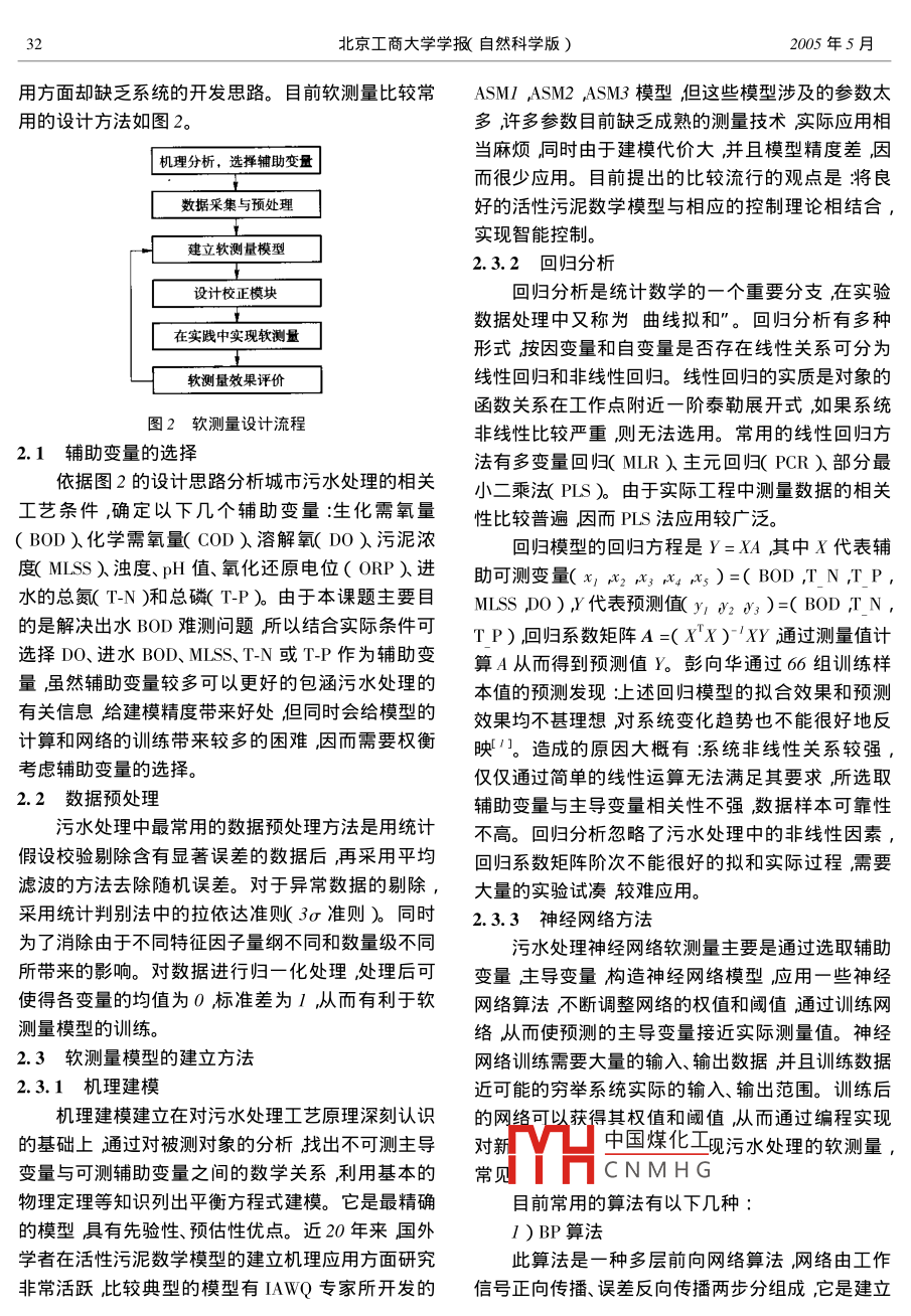 第23卷第3期北京工商大學(xué)學(xué)報(bào)(自然科學(xué)版)Vol. 23 Na 32005年5月Journal of Bejing Technology and Business University( Natural Science Edition )May 2005文章編號(hào):1671-1513( 2005 )03-0031-04污水處理過(guò)程的軟測(cè)量技術(shù)王正祥,劉載文,薛福霞(北京工商大學(xué)信息工程學(xué)院,北京 100037 )摘要:污水處理過(guò)程的軟測(cè)量技術(shù)是為解決污水處理出水水質(zhì)(如BOD,、COD等)難以在線(xiàn)實(shí)時(shí)檢測(cè)而提出的它為污水處理質(zhì)量參數(shù)的在線(xiàn)預(yù)測(cè)和閉環(huán)控制創(chuàng)造必要的前提條件并提供可行的解決方案,從而穩(wěn)定出水水質(zhì)和提高污水處理的效率。介紹軟測(cè)量技術(shù)的概念研究污水處理軟測(cè)量建模方法,以及工程設(shè)計(jì)方法。關(guān)鍵詞:污水處理;軟測(cè)量技術(shù);建模方法中圖分類(lèi)號(hào):X502 ;TP273*. 5文獻(xiàn)標(biāo)識(shí)碼:A目前污水生物處理廣泛使用的是活性污泥法,水處理過(guò)程的自動(dòng)監(jiān)測(cè)和預(yù)報(bào)系統(tǒng)實(shí)現(xiàn)出水的優(yōu)其實(shí)質(zhì)是以存在于污水中的有機(jī)物作為培養(yǎng)基(底化排放具有重要的實(shí)際意義和應(yīng)用價(jià)值。物)在有氧的條件下對(duì)各種微生物群體進(jìn)行混合連續(xù)培養(yǎng)通過(guò)凝聚、吸附、氧化分解、沉淀等過(guò)程去1軟測(cè)量的概念除有機(jī)物的一種污水處理方法。目前污水處理廠的所謂軟測(cè)量技術(shù)就是利用易測(cè)過(guò)程變量與難以出水水質(zhì)BOD,(生物化學(xué)需氧量) COD(化學(xué)耗氧直接測(cè)量的待測(cè)過(guò)程變量之間的數(shù)學(xué)關(guān)系通過(guò)各量)T-N(總含氮量)T-P(總含磷量)等濃度參數(shù)大種數(shù)學(xué)計(jì)算和估計(jì)方法,從而實(shí)現(xiàn)對(duì)待測(cè)過(guò)程變量多靠人工化驗(yàn)來(lái)確定尤其是BOD3需經(jīng)過(guò)5天之的測(cè)量。這樣建立的軟測(cè)量模型可以完成一些實(shí)際后才能得到化驗(yàn)結(jié)果。顯然化驗(yàn)結(jié)果大大滯后于硬件檢測(cè)所不能完成的測(cè)量任務(wù)。圖1中y代表主.污水的排放過(guò)程,也就是說(shuō)等到知道出水水質(zhì)指標(biāo)導(dǎo)變量R代表可測(cè)的輔助變量d和u分別表示可BOD,不合格時(shí)早已排出大量不合格的處理水造測(cè)的干擾和控制變量。軟測(cè)量的目的就是利用所有成二次污染。針對(duì)此情況國(guó)外少量污水處理廠采用了在線(xiàn)可獲得的信息求取主導(dǎo)變量的最優(yōu)" 估計(jì)值j ,即分析儀表進(jìn)行測(cè)量。但目前污水處理自動(dòng)控制系統(tǒng)構(gòu)造從可測(cè)信息集R到j(luò)的映射:中所采用的一些檢測(cè)專(zhuān)用儀器檢修與維護(hù)困難、價(jià)j( S)=K( S)k( S)格昂貴并且技術(shù)尚不完善,誤差較大,檢測(cè)精度達(dá)不到預(yù)期效果,以致于難以提供實(shí)時(shí)質(zhì)量信息作為對(duì)|一十 y質(zhì)量控制的反饋信號(hào)。而反映污水水質(zhì)的最重要參象R數(shù)有機(jī)污染物濃度( BOD或COD )還沒(méi)有實(shí)時(shí)在線(xiàn)圖1軟測(cè)量模型傳感器,因而直接影響了污水處理的效率與效果。因此將軟測(cè)量技術(shù)應(yīng)用于污水處理過(guò)程建立出水2污水處理軟測(cè)量模型建立水質(zhì)BOD,等參數(shù)的軟測(cè)量模型,以實(shí)現(xiàn)污水處理中國(guó)煤化工成較好的基礎(chǔ),但在應(yīng)過(guò)程的實(shí)時(shí)計(jì)算機(jī)監(jiān)測(cè)和預(yù)報(bào),在 此基礎(chǔ)上開(kāi)發(fā)污MYHCNMHG收稿日期:2005 -03 -01基金項(xiàng)目: 北京市優(yōu)秀人才項(xiàng)目北京市教育委員會(huì)科技發(fā)展項(xiàng)目(編號(hào)KM200310011040 )作者簡(jiǎn)介:王正祥( 1973- )男,甘肅金昌人碩士研究生研究方向?yàn)橹悄芸刂坪臀鬯幚磉^(guò)程控制。劉載文( 1954- )男廣東南海人教授主要從事智能控制與測(cè)控網(wǎng)絡(luò)方面的研究。3北京工商大學(xué)學(xué)報(bào)(自然科學(xué)版)2005年5月用方面卻缺乏系統(tǒng)的開(kāi)發(fā)思路。目前軟測(cè)量比較常ASMI ,ASM2 ,ASM3模型,但這些模型涉及的參數(shù)太用的設(shè)計(jì)方法如圖2。多,許多參數(shù)目前缺乏成熟的測(cè)量技術(shù)實(shí)際應(yīng)用相當(dāng)麻煩同時(shí)由于建模代價(jià)大,并且模型精度差,因| 機(jī)理分析,選擇輔助變量而很少應(yīng)用。目前提出的比較流行的觀點(diǎn)是:將良數(shù)據(jù)采集與預(yù)處理好的活性污泥數(shù)學(xué)模型與相應(yīng)的控制理論相結(jié)合,實(shí)現(xiàn)智能控制。建立軟測(cè):量模型2.3.2回歸分析設(shè)計(jì)校正模塊回歸分析是統(tǒng)計(jì)數(shù)學(xué)的一-個(gè)重要分支,在實(shí)驗(yàn)數(shù)據(jù)處理中又稱(chēng)為曲線(xiàn)擬和”?;貧w分析有多種在實(shí)踐中實(shí)現(xiàn)軟測(cè)量形式按因變量和自變量是否存在線(xiàn)性關(guān)系可分為軟測(cè)量效果評(píng)價(jià)線(xiàn)性回歸和非線(xiàn)性回歸。線(xiàn)性回歸的實(shí)質(zhì)是對(duì)象的函數(shù)關(guān)系在工作點(diǎn)附近-階泰勒展開(kāi)式,如果系統(tǒng)圖2軟測(cè)量設(shè)計(jì)流程非線(xiàn)性比較嚴(yán)重則無(wú)法選用。常用的線(xiàn)性回歸方2.1輔助變量的選擇依據(jù)圖2的設(shè)計(jì)