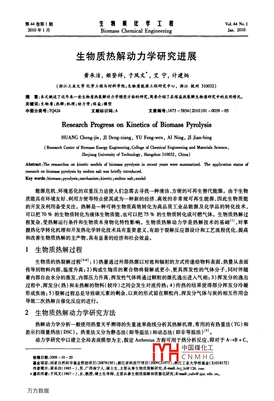 第44卷第1期生物質(zhì)化學(xué)工程Vol 44 No. 12010年1月Biomass Chemical EngineeringJan.2010生物質(zhì)熱解動(dòng)力學(xué)研究進(jìn)展黃承潔,姬登祥,于鳳文,艾寧,計(jì)建炳(浙江工業(yè)大學(xué)化學(xué)工程與材料學(xué)院;生物質(zhì)能源工程研究中心,浙江杭州310032)擴(kuò)要:本文橛迷了近年來一些生物質(zhì)熱裂解動(dòng)力學(xué)模型方面的研究,簡(jiǎn)要介紹了在熔鹽熱裂解生物質(zhì)研究中的應(yīng)用情況關(guān)鍵詞:生物質(zhì);熱解;機(jī)理;動(dòng)力學(xué);熔鹽;模型中圖分類號(hào):TQ424文獻(xiàn)標(biāo)識(shí)碼:A文章編號(hào):163-5854(2010)0-0039-05Research Progress on Kinetics of Biomass PyrolysisHUANG Cheng- jie, JI Deng-xiang, YU Feng-wen, AI Ning, JI Jian-bingResearch Center of Biomass Energy Engineering, College of Chemical Engineering and Materials ScienceZhejiang University of Technology, Hangzhou 310032, China)Abstract: The researches on kinetic models of biomass pyrolysis in recent years were summarized. The application status ofresearch on biomass pyrolysis by molten salt was briefly introduced.Key words: biomass Pyrolysis; mechanism; kinetic; molten salt能源危機(jī)、環(huán)境惡化的雙重壓力迫使人們急需去尋找一種清潔、方便的可再生替代能源。由于生物質(zhì)能具有環(huán)境友好利用方便等特點(diǎn)使其成為一種新的經(jīng)濟(jì)高效的非常規(guī)可再生能源,因此生物質(zhì)能的開發(fā)及利用備受關(guān)注。熱解是一種可將生物質(zhì)高效轉(zhuǎn)化為高品質(zhì)工業(yè)品能源及化學(xué)品的轉(zhuǎn)化技術(shù),可以把70%的生物質(zhì)轉(zhuǎn)化為液體生物質(zhì)能,也可以把75%的生物質(zhì)轉(zhuǎn)化成可燃?xì)怏w。生物質(zhì)熱解過復(fù)雜受熱解運(yùn)行條件和生物質(zhì)本身物化特性影響。生物質(zhì)熱解動(dòng)力學(xué)是熱解技術(shù)的基礎(chǔ)(,對(duì)掌握熱化學(xué)轉(zhuǎn)化機(jī)理和開發(fā)熱化學(xué)轉(zhuǎn)化技術(shù)具有重要意義,有助于裂解反應(yīng)器設(shè)計(jì)和工藝流程優(yōu)化,提高和改善生物質(zhì)熱解的主產(chǎn)物,具有顯著的經(jīng)濟(jì)和社會(huì)效益。1生物質(zhì)熱解過程生物質(zhì)的熱裂解過程24:1)熱量通過外部熱源以對(duì)流和輻射的方式傳遞給物料表面熱量從表面?zhèn)鲗?dǎo)到物料內(nèi)部,溫度升高;2)構(gòu)成生物質(zhì)的聚合物將裂解成更小、更具揮發(fā)性的氣體分子,同時(shí)伴隨著內(nèi)部自由水分的蒸發(fā),內(nèi)部壓力升高揮發(fā)性氣體將通過顆粒的微孔逸出進(jìn)入氣相;3)揮發(fā)分的逸出過程中,揮發(fā)分(熱)和未熱解的物料(較冷)之間會(huì)發(fā)生對(duì)流傳熱;4)傳熱的結(jié)果使得部分揮發(fā)分冷凝形成焦油;5)裂解過程總是導(dǎo)致碳元素的剩余以炭的形式留在顆粒內(nèi)揮發(fā)分氣體與炭的相互作用會(huì)導(dǎo)致二次熱解自催化反應(yīng)的進(jìn)行。2生物質(zhì)熱解動(dòng)力學(xué)研究方法熱解動(dòng)力學(xué)分析一般使用熱重天平測(cè)得的失重速率曲線分析其熱解機(jī)理,常用的有熱重法(TG)和差示掃描量熱法(DSC)。熱重法又分為靜態(tài)法(即等溫法)和動(dòng)態(tài)法(即非等溫法)1。動(dòng)力學(xué)研究中以建立全局表觀模型為主,假定 Arrhenius方程可用于熱分析反應(yīng),即對(duì)于A→B+C中國煤化工收稿日期:2009-10-20CNMHG金項(xiàng)目:國家自然科學(xué)基金資助項(xiàng)目(20876150);斷江省科技廳項(xiàng)目(200c01073);浙江工業(yè)大學(xué)?;?X01872)作者簡(jiǎn)介:黃承潔(1985-),男,廣西南寧人,碩士生,主要從事生物質(zhì)裂解研究;E-mail:hcj_hie@126.com通訊作者:于風(fēng)文(1967-),女教授,碩土生導(dǎo)師,主要從事生物質(zhì)裂解和資源化研究;Emal;yufw@ zjut. edu,cmo生物質(zhì)化學(xué)工程第44卷其反應(yīng)速率方程可表示為6do(a)f(a)為反應(yīng)機(jī)理函數(shù),一般認(rèn)為其與溫度T和時(shí)間t無關(guān),只與反應(yīng)程度a(反應(yīng)的失重率轉(zhuǎn)化率)有關(guān),按較為常見的假設(shè)為f(a)=(1-a),結(jié)合 Arrhenius方程得:Ae kr(1-a)將B=dT/dt代人(2)式得(3)式da A式中;a=(m-m)/(mo-m),m、m、m分別為樣品的初始、時(shí)刻的質(zhì)量和不能分解殘余物的質(zhì)量;k速率常數(shù);A—指前因子,min;E-活化能,kJ/mol;R-氣體常數(shù),8.314kJ/mol;t升溫時(shí)間min;T反應(yīng)溫度K;n-反應(yīng)級(jí)數(shù);B—升溫速率,Kmin。對(duì)(3)式取對(duì)數(shù)差分后得到常用表達(dá)式(4):A(1ad-)-1()-小n(4)式的左端對(duì)△(1/T)/An(1-a)作圖,從圖中可求得E、n,再結(jié)合(1)式和 Arrhenius方程及f(a)即能求出A以上是微分法,對(duì)于積分法,對(duì)(3)式采用 Coats和 Redfern積分得到G(BE/RT其中G(a)得到cn=1G(a)=(1-(1-a)-")/(1-n)n≠1若所假設(shè)的反應(yīng)級(jí)數(shù)n與真實(shí)的裂解反應(yīng)級(jí)數(shù)一致,則ln[G(a)/72]~1/T圖形應(yīng)該是一條直線,便可從直線的斜率和截距分別計(jì)算出樣品熱解的活化能E和指前因子A。3生物質(zhì)熱解動(dòng)力學(xué)研究生物質(zhì)主要由纖維素、半纖維素及木質(zhì)素組成。纖維素的熱裂解行為很大程度上體現(xiàn)了生物質(zhì)的整體熱裂解規(guī)律,因此生物質(zhì)熱解動(dòng)力學(xué)的研究基本都基于纖維素的熱解9。纖維素?zé)峤鈾C(jī)理的探索源于對(duì)纖維素燃燒過程的研究。1975年, Broido等在低溫條件