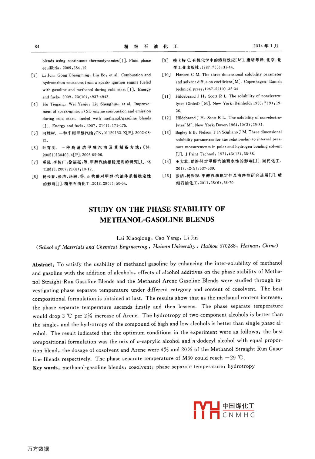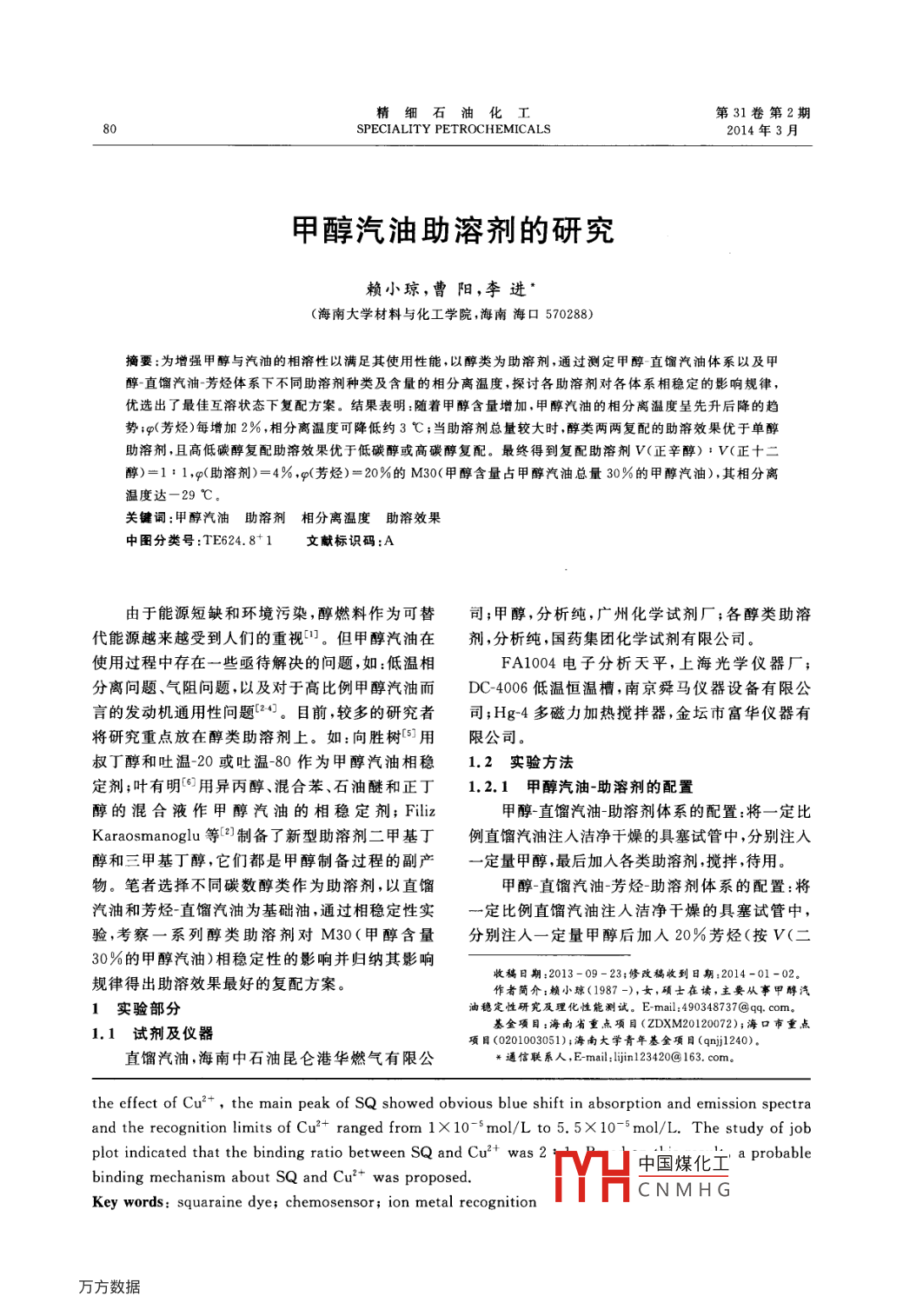 精細(xì)石油化工第31卷第2期SPECIALITY PETROCHEMICALS2014年3月甲醇汽油助溶劑的研究賴小瓊,曹陽,李進(jìn)(海南大學(xué)材料與化工學(xué)院,海南海口570288)摘要:為增強(qiáng)甲醇與汽油的相溶性以滿足其使用性能,以醇類為助溶劑,通過測定甲醇直餾汽油體系以及甲醇直餾汽油芳烴體系下不同助溶劑種類及含量的相分離溫度,探討各助溶劑對各體系相穩(wěn)定的影響規(guī)律優(yōu)選出了最佳互溶狀態(tài)下復(fù)配方案。結(jié)果表明:隨著甲醇含量增加,甲醇汽油的相分離溫度呈先升后降的趨勢;φ(芳烴)每增加2%,相分離溫度可降低約3℃;當(dāng)助溶劑總量較大時(shí),醇類兩兩復(fù)配的助溶效果優(yōu)于單醇助溶劑,且高低碳醇復(fù)配助溶效果優(yōu)于低碳醇或高碳醇復(fù)配。最終得到復(fù)配助溶劑v(正辛醇):V(正十二醇)=1:1,g(助溶劑)=4%,g(芳烴)=20%的M30(甲醇含量占甲醇汽油總量30%的甲醇汽油),其相分離溫度達(dá)-29℃。關(guān)鍵詞:甲醇汽油助溶劑相分離溫度助溶效中圖分類號:TE624.81文獻(xiàn)標(biāo)識碼:A由于能源短缺和環(huán)境污染,醇燃料作為可替司;甲醇,分析純,廣州化學(xué)試劑廠;各醇類助溶代能源越來越受到人們的重視。但甲醇汽油在劑,分析純,國藥集團(tuán)化學(xué)試劑有限公司。使用過程中存在一些亟待解決的問題,如:低溫相FA1004電子分析天平,上海光學(xué)儀器廠;分離問題、氣阻問題,以及對于高比例甲醇汽油而DC4006低溫恒溫槽,南京舜馬儀器設(shè)備有限公言的發(fā)動機(jī)通用性問題2。目前,較多的研究者司;Hg4多磁力加熱攪拌器,金壇市富華儀器有將研究重點(diǎn)放在醇類助溶劑上。如:向勝樹用限公司。叔丁醇和吐溫-20或吐溫-80作為甲醇汽油相穩(wěn)1.2實(shí)驗(yàn)方法定劑;葉有明用異丙醇、混合苯、石油醚和正丁1.2.1甲醇汽油-助溶劑的配置醇的混合液作甲醇汽油的相穩(wěn)定劑; Filiz甲醇直餾汽油助溶劑體系的配置:將一定比Karaosmanoglu等2制備了新型助溶劑二甲基丁例直餾汽油注入潔凈干燥的具塞試管中,分別注入醇和三甲基丁醇,它們都是甲醇制備過程的副產(chǎn)一定量甲醇,最后加入各類助溶劑,攪拌,待用物。筆者選擇不同碳數(shù)醇類作為助溶劑,以直餾甲醇直餾汽油芳烴-助溶劑體系的配置:將汽油和芳烴-直餾汽油為基礎(chǔ)油,通過相穩(wěn)定性實(shí)定比例直餾汽油注人潔凈干燥的具塞試管中,驗(yàn),考察一系列醇類助溶劑對M30(甲醇含量分別注入一定量甲醇后加入20%芳烴(按V(二30%的甲醇汽油)相穩(wěn)定性的影響并歸納其影響規(guī)律得出助溶效果最好的復(fù)配方案。收稿日期:2013-09-23;修改稿收到日期:2014-01-02作者簡介:賴小瓊(1987-),女,碩士在讀,主要從事甲醇汽1實(shí)驗(yàn)部分油穩(wěn)定性研究及理化性能測試。E-mail:490348737@qq.com。1.1試劑及儀器基金項(xiàng)目:海南省重點(diǎn)項(xiàng)目(ZDXM20120072);海口市重點(diǎn)項(xiàng)目(0201003051);海南大學(xué)青年基金項(xiàng)目(qnjl240)直餾汽油,海南中石油昆侖港華燃?xì)庥邢薰ㄐ怕?lián)系人,E-mail:lijin123420@163.comthe effect of Cu2+, the main peak of sQ showed obvious blue shift in absorption and emission spectraand the recognition limits of Cu2+ ranged from 1 X10'mol/L to 5. 5 X10 mol/L. The study of jobplot indicated that the binding ratio between SQ and Cut was 2中國煤化工a probablebinding mechanism about SQ and Cu2+ was proposedCNMHGKey words: squaraine dye; chemosensor; ion metal recognition第31卷第2期賴小瓊,等.甲醇汽油助溶劑的研究甲苯):V(甲苯):V(萘)=4:3:3的方式混表2各溶劑的溶解度合),最后加入各類助溶劑,攪拌,待用。物質(zhì)名稱b/(J·cm-3)2.2相穩(wěn)定性影響評價(jià)異丙醇23.2異丁醇參照DB61/T352-2004《車用M15甲醇汽異戊醇油陜西省地方標(biāo)準(zhǔn)》將1.2.1配制的無助溶劑體正庚醇系和含助溶劑體系放置于低溫恒溫槽,實(shí)驗(yàn)溫度正辛醇20.1正十二醇18.7為-36.0~50.0℃,溫度由高至低調(diào)節(jié)。測試正十四醇時(shí),使溫度恒定于一點(diǎn)2~3min,取出試管,振蕩2~3s,若均一澄清體系出現(xiàn)混濁,記錄該點(diǎn)溫甲苯18.4二甲苯19.3度,即體系相分離溫度。;若體系仍均一澄清,繼續(xù)調(diào)節(jié)溫度并恒溫,直到體系出現(xiàn)混濁現(xiàn)象,記錄體系相分離溫度。繪制醇類助溶劑與相分離溫度2.2無助溶劑時(shí),甲醇含量對相穩(wěn)定性的影響關(guān)系曲線。室溫下,無助溶劑時(shí),甲醇含量對相分離溫度2結(jié)果與討論的影響結(jié)果見圖1。2.1甲醇直餾汽油助溶劑的選擇助溶劑之間的復(fù)配效應(yīng)可以用經(jīng)驗(yàn)溶解度參數(shù)δ值解釋9。助溶劑復(fù)配之所以會有較明顯的協(xié)同效應(yīng),應(yīng)該就是由于助溶劑的復(fù)配相當(dāng)于對δ值進(jìn)行了較之單一助溶劑精確的微調(diào),使混合溶劑δ值更加接近于甲醇的δ值,從而提高了溶劑體系對甲醇的溶解能力10。物質(zhì)的溶解度參數(shù)可根據(jù)重復(fù)結(jié)構(gòu)單元中各基團(tuán)的摩爾吸引常數(shù)之和來計(jì)算m。φ(甲醇),%8=p∑G/M(1)圖1無助溶劑時(shí),甲醇含量對相分離溫度的影響式中,p密度,kg/m3;M—平均相對分子質(zhì)量。由圖1可知:無助溶劑時(shí),隨著φ(甲醇)的增斯摩爾和霍義計(jì)算了摩爾基團(tuán)引力常數(shù),表加,相分離溫度呈先上升后下降的趨勢,相分離溫1給出了一些化學(xué)基團(tuán)的G值。