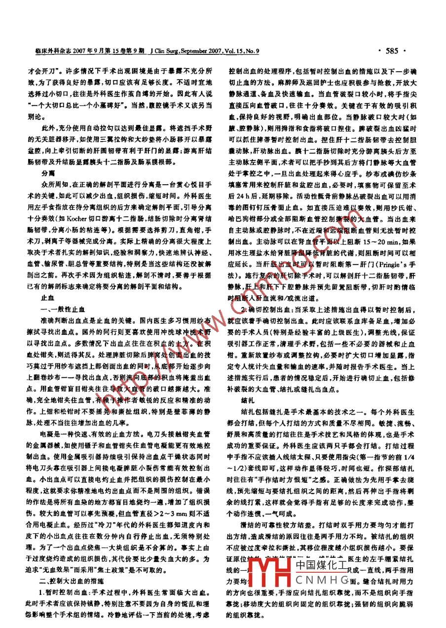 臨床外科雜志2007年9月第15卷第9期」 Clin Surg,Septermber 2007 . Vol.15,No.9劑,殺菌力較強(qiáng),能殺滅多種細(xì)菌及真菌,雖然對(duì)革蘭陰性桿菌新沽爾滅殺菌的有效部分是一個(gè)陽離子基團(tuán),帶有正電荷,正及腸道病毒作用弱、對(duì)結(jié)核桿菌及芽胞無效,但對(duì)于明確有綠負(fù)電荷相互吸引并結(jié)合,使殺菌效果明顯降低。肥皂是陰離子膿桿菌感染的創(chuàng)面,0.5%新潔爾相對(duì)1.0%碘伏具有更好的治清潔劑,若與新潔爾滅相遇,因陰、陽離子相互結(jié)合而使該消毒療作用。在燒傷創(chuàng)面早期無金黃色葡萄球菌和綠膿桿菌感的劑的殺茵能力減弱或喪失。因此,當(dāng)皮膚上殘留過氧化氯或肥,情況下,由于0.05%洗必泰抗菌譜廣、刺激性小和價(jià)格低廉,也皂水,在使用新潔爾滅之前須用生理鹽水徹底沖洗并抹干。是理想的外用消毒劑,但1.0%碘伏仍是首選的外用消毒劑。3.戊二醛溶液與新潔爾滅消毒有協(xié)同作用:在戊二醛溶液2.手術(shù)治療中的消毒:①刷手是外科醫(yī)生手術(shù)的一個(gè)重要中加入適量的表面活性劑可獲得多組分的配伍協(xié)同滅菌效果,操作,如何正確選擇和使用消毒劑對(duì)手術(shù)至關(guān)重要。因?yàn)槿梭w組分中的苯扎澳銨除其能同細(xì)菌細(xì)胞壁上的多磷脂反應(yīng)發(fā)揮皮膚存在常居菌和暫居菌,暫居菌較易去除,常居菌用一般消本身所具有的殺菌作用外,也能使細(xì)菌細(xì)胞壁上的肽變性,隨毒劑不易去除,而且在手術(shù)過程中,由于術(shù)者出汗或其他原因,后戊二醛破壞細(xì)菌表面的蛋白受體,還有降低溶液界面張力、可使細(xì)菌從皮膚皺褶和毛孔處脫出,若手套破損,則可污染手增強(qiáng)消毒劑在消毒物體表面上的潤濕作用,使戊二醛與病原體術(shù)切口,造成手術(shù)切口感染。因此選用具有持續(xù)作用的消毒劑微生物充分接觸,提高戊二醛對(duì)菌體的滲透能力,降低使用濃極為重要,國內(nèi)醫(yī)院為了增加洗手液的消毒效果現(xiàn)多選用復(fù)合度。二者聯(lián)合同時(shí)參與滅菌過程,形成溶液滅菌平推效應(yīng),實(shí)消毒劑,氯已定與乙醇復(fù)方消毒劑是常用皮膚消毒劑,為了使現(xiàn)消毒滅菌過程的互補(bǔ),充分發(fā)揮了二者的殺滅效果,擴(kuò)大了此類消毒劑對(duì)皮膚具有更好的護(hù)膚作用,在配方中常常加人甘殺菌譜,使用方便,又避免了各自單獨(dú)使用時(shí)的限制條件。油和維生素E等成分。②術(shù)區(qū)的消毒方法很多,碘伏對(duì)皮膚消參考文獻(xiàn).毒不僅靠有效碘的氧化作用,加之表面括性劑增效和去污作用,因此能發(fā)揮較強(qiáng)的殺菌作用,但有效碘含量必須保證。有[1]孫備.李德輝.皮膚清毒液的種類及特點(diǎn)[J].中國實(shí)用外科雜志,研究表明,含有效碘10g/L的碘伏擦拭2遍消毒,消毒效果可2]王素玲.許秀萍。趙毅.新潔爾滅替代酒精微指血糖皮膚消毒的效果得到保證,但含有效碘5g/L的碘伏消毒效果即有波動(dòng)[3]。含[3]田蒔.趙友娟.高興蓮.等.胸腹部手術(shù)患者不同皮膚消毒方法效果觀素[J].中國實(shí)用護(hù)理雜志,2006 22(7):11-12.量1g/L的碘伏以及洗必泰酊和氯已定液消毒效果均得不到保比較[J]. 中國消毒學(xué)雜志,2006.23(5);458.證。術(shù)區(qū)的消毒還可以應(yīng)用安爾碘:①安爾碘能直接使用原[4]胡玲,石強(qiáng),張冬梅,等.酸度對(duì)碘伏消海劑穩(wěn)定性的影響[J].中國消毒學(xué)雜志,2005 ,22(4):410-411.液,不需分別配制、測(cè)試依度更換容器等繁瑣程序,避免了污染環(huán)節(jié),且使用時(shí)不需脫碘,涂擦兩遍即可達(dá)到消毒目的,減少[作者簡介}孫備(1970- ),男,博士,教授,博士生導(dǎo)師。.了工作量,提高了消毒效果;②安爾碘為含碘皮膚消毒劑,有輕(收稿8期:2007-05-08)徽的黃染,可指示其消毒區(qū)域,以免漏擦,比無色消毒劑更為安全;③持續(xù)消毒時(shí)間較長,具有6h以上的持續(xù)抗菌作用,比碘外科基本技術(shù)伏殺菌效果好,可有效地控制手術(shù)時(shí)皮膚造成的再污染;④安爾碘消毒后,干燥迅速,且消毒區(qū)域不黏不滑,便于使用手術(shù)貼膜。而碘伏為水溶液,干燥慢,而且黏滑,影響手術(shù)貼膜的使用.南京醫(yī)科大學(xué)第一附屬醫(yī)院普通外科(210029)效果。應(yīng)當(dāng)注意的是,在使用電刀時(shí),安爾碘涂擦用量不宜過苗毅多,且要稍干后再使用電刀,以防引燃消毒劑中的揮發(fā)成分。傳統(tǒng)使用碘酊與乙醇雙消毒方法,碘酊與乙醇雙消毒主要靠有[關(guān)鍵詞]外科;基礎(chǔ)技術(shù)效碘的強(qiáng)氧化作用,使微生物蛋白質(zhì)氧化變性,從而殺滅各種[中圈分類號(hào)} R6[文獻(xiàn)標(biāo)識(shí)碼]C .微生物,對(duì)于皮膚消毒效果可靠,但因乙醇對(duì)皮膚刺激性較大,[文章編號(hào)]1005-6483(2007 )09-0584-03近來很少應(yīng)用。四、消毒操作中的注意要點(diǎn)外科基本技術(shù)包括暴蹀分離、止血、結(jié)扎、切開、縫合六大1.在使用碘伏過程中應(yīng)注意:①碘伏原液量深棕色,性質(zhì)基本操作。這些技術(shù)往往決定手術(shù)風(fēng)格和手術(shù)質(zhì)量。自外科穩(wěn)定,一經(jīng)稀釋,穩(wěn)定性相對(duì)下降,因此需要現(xiàn)配現(xiàn)用;②碘伏誕生的那天起,基本功就是一一個(gè)永恒話題。新技術(shù)、新設(shè)備的稀釋液的顏色可作為濃度指示劑,稀