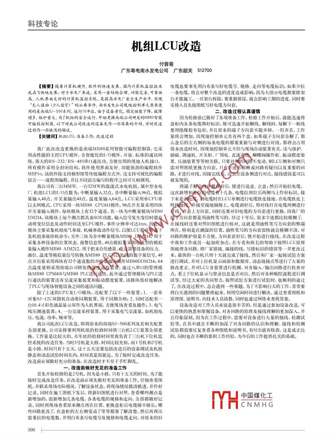 科技專論機組LCU改造付蓉菊廣東粵電南水發(fā)電公司廣東韶關(guān)512700【摘要】隨著計算機硬件、軟件的快速發(fā)展,國內(nèi)計算機監(jiān)控技術(shù)電纜也要事先用白布條寫奷電纜號、規(guī)格、走向等電纜標識;如果少拉也在飛快地發(fā)展;對于水電廠來說,采用一套結(jié)構(gòu)合理、功能完善、可靠條電纜,將會對整個改造的進度造成影響;因為大部分電纜都要搭架高、人機界面友好的計算機監(jiān)控系統(tǒng),是提高水電廠安全生產(chǎn)水平,實現(xiàn)臺才能施工,一旦架臺拆除,要重新搭設(shè),就會影響工期的進度,同時要無人值班(少人值守)”的必要條件。南水發(fā)電公司現(xiàn)地控制單元原來使安排人員先按圖紙寫用的是南瑞J-500系列,運行10年后,由于設(shè)備老化,穩(wěn)定性能下降,故障二、改造過程認真謹慎增多,維護量大,為了機組的安全運行,開始更換南瑞公司研發(fā)的MB80智能因為檢修前已做好了各項準備工作,檢修工作開始后,就能迅速將可編程控制器。以下對我公司改造的設(shè)備先作一些簡要的介紹,并對改造盤柜內(nèi)各條電纜綁好標識,便可迅速開始解線。解線時,毎解下一根線過程作一些膚淺的描述。要用絕緣膠布包好,并且原來的端子方向套不能弄掉,一但弄丟,工作【關(guān)鍵詞】機組LCU;準備工作;改造過程量將會增加。因現(xiàn)地控制單元共冇兩個盤,如果端子方向套全解了,那么盤后的左右側(cè)的每條電纜的都要重新與對側(cè)進行對線,那將會占用我廠此次改造更換的是南瑞MB80系列智能可編程控制器,它采很多改造時間。因現(xiàn)地控制單元不但與現(xiàn)場自動裝置有關(guān),還與保護用高性能的主控CPU模件,全智能化的Ⅰ/o模件,開放、標準的通訊網(wǎng)勵磁、調(diào)速機、開關(guān)柜、廠用電、直流系統(tǒng)、蝴蝶閥操作柜、振動擺度裝絡(luò),強大的RS-232/RS-485串口通訊功,方便實用的現(xiàn)地人機接口,置、壓油裝置等等相關(guān)聯(lián)。只要對側(cè)的回路不變動,則LCU側(cè)和對側(cè)只所有模件采用全封閉結(jié)構(gòu),軟件使用界面友好、功能強勁的編程軟件需對照圖紙更換方向套。只有字跡不清晰或回路有疑問以及重要的回MBPro,該軟件除支持梯形圖等傳統(tǒng)編程方式外,還支持可視化的編程路,才進行對線。因接完線后,還會在設(shè)備側(cè)進行對點,接線錯誤是可以語言——流程圖編程,并且不同語言編寫的程序之間可互相調(diào)用被發(fā)現(xiàn)的。我公司有二臺34MW、一臺32MW的混流式水電機組,屬中型水電將端子解完線并整理好后,便進行退盤、立盤;然后開始拉電纜,J,機組LCU的ⅠO點數(shù)為:中斷量輸入32點,非中斷量輸入96點,模擬這次新增和重拉的電纜有十幾條,電纜拉到位后兩側(cè)馬上作好標識。接量輸入48點,開關(guān)量輸出48點,溫度量輸入64點。LCU采用單CPU單下來是剝電纜,剝電纜時在LCU單側(cè)進行電纜鐵皮接地,在電纜鐵皮上以太網(wǎng)模式,CPU采用一塊MB80cPU6l1模件。96點開關(guān)量采用四塊焊接地線,并接至接地銅排上。電纜剝好后,用對線燈在電纜兩側(cè)進行開關(guān)量輸入模件,每塊模塊上有32個通道,其一塊為中斷量模塊MB80對線,并套上方向套。同時還要對舊電纜的方向套進行更換,因我廠的IM214,該模塊上毎個測點都具備SOE功能,輸入信號發(fā)生變位時能自端子方向套都是用油性筆寫的,經(jīng)過十年后,很多字跡都比較模糊了,動將變位信息及動作時間送至cPU模件,事件分辨率可達lms,因此該在接線時還要對照舊圖紙進行核對。這就是用油性筆寫方向套的弊端模塊主要采集機組電氣事故、機械事故動作信號,以便LCU程序快速下所在,特別是在潮濕的位置,油性筆寫的方向套很快就會模糊不清,對發(fā)機組事故停機命令;另外三塊為非中斷量模塊MB80DIM214,用于回路的維護很是不方便。方向套套好后,便開始進行接線。在改造過程采集各種設(shè)備的位置狀態(tài)、報警信息等。48點模擬量采用電流型的模擬中我和工作成員一起加班加點,在專責和班長的幫助下按照LCU原理量輸入模件MB80AIM212,用于把來自傳感器、變送器等設(shè)備的壓力、圖疏理各回路,將廠家錯接、漏接的線,寫錯標識的錯誤等一并更改過液位、溫度等模擬量信號轉(zhuǎn)換為MB80PLC可以處理的數(shù)字量信號。48來,最快的一臺機只用十天就完成了接線。然后和廠家一起按試驗方案點開出量采用兩塊有32個通道數(shù)的開關(guān)量輸出模件MB8oDOM214;64進行調(diào)試,并對上位機顯示畫面和數(shù)據(jù)庫、動態(tài)鏈接點等進行了大量的點溫度量則采用南瑞公司硏發(fā)的溫度巡檢裝置,通過八串口的管理模修改更正,并對LCU各裝置進行檢測,對各輸入/輸出回路進行檢査對MB8oCPM418與MB80PLC進行通訊,此外通過管理模塊與PLC進點,看上下位機顯示與登錄信息是否對應(yīng),然后對各種順控流程進行i行通訊的裝置還有交流采集裝置和振動擺度裝置,該模塊很好地解決試等。經(jīng)過大家的共同努力,按照試驗方案進行試驗時,也順利的通過了PLC與現(xiàn)場智能設(shè)備之間的通訊問題了。在改造過程中,總會遇到一些難題,為了不影響白天的工作,常常要除了上述的CPU及Ⅰ/o模塊,還配置了以下一些裝置:1、一套單將白天遇到的問題整理起來,利用空閑時間進行解決。通過查看圖紙和對