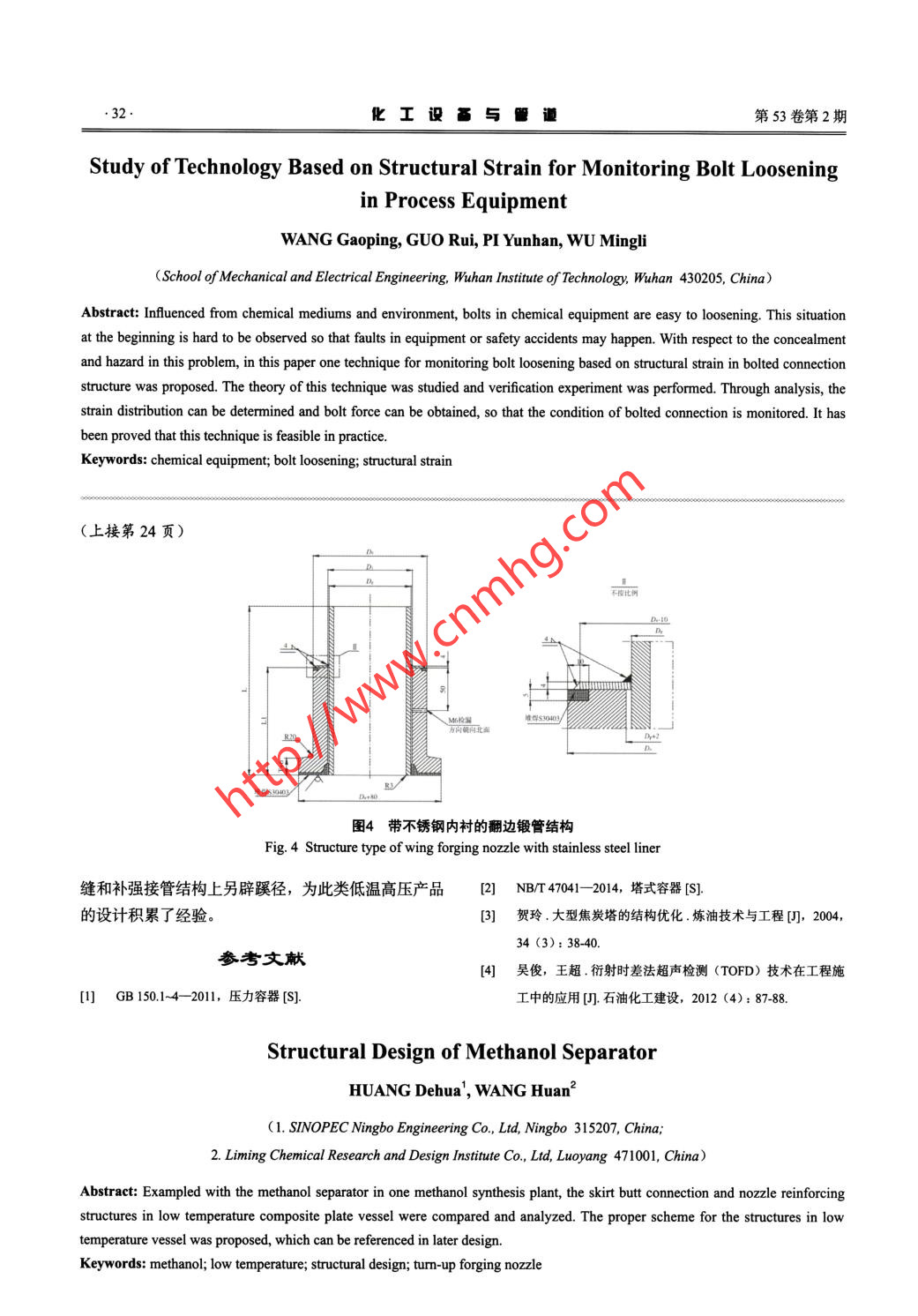 .24.化工設(shè)備與管譴第53卷第2期狹窄空間的焊接作業(yè),經(jīng)過(guò)多個(gè)項(xiàng)目的設(shè)備裙座內(nèi)狹窄間隙堆焊的驗(yàn)證實(shí)施,效果良好,提高焊接效率的12同時(shí)又保證了焊接質(zhì)量。使用狹窄空間復(fù)合焊接脈沖自動(dòng)/半自動(dòng)焊機(jī)焊接完成后,焊縫在空氣中冷卻后形成自然的內(nèi)凹,熔池金屬與兩側(cè)殼體呈現(xiàn)圓滑過(guò)渡的弧線,焊縫成形良好,采用R10的樣板測(cè)量,完全無(wú)需打磨。3補(bǔ)強(qiáng)接 管結(jié)構(gòu)設(shè)計(jì)a.普通對(duì)接型b.堆焊改進(jìn)型工程規(guī)定要求本設(shè)備所有接管焊縫均要求為對(duì)圖2裙座與封頭對(duì)接結(jié)構(gòu)形式接焊縫,所有接管補(bǔ)強(qiáng)均采用自補(bǔ)強(qiáng)翻邊鍛件。Fig. 2 Structure type of skirt and bottom headR1938 電/\R193810/圖3翻邊鍛管結(jié)構(gòu)Fig. 3 Structure type of wing forging nozzle其中,對(duì)于DN≤100 mm的儀表口,采用封閉不銹鋼管與鍛件的空隙,鍛管外緣機(jī)加工- -圈,LWN長(zhǎng)高頸整體法蘭帶翻邊結(jié)構(gòu)(見(jiàn)圖3左),翻邊形成凸緣,并將機(jī)加工后的凹臺(tái)堆焊S30403 與末端尺寸為鍛管外徑加100mm;DN≥150mm的管口齊平,并與環(huán)板用不銹鋼焊條焊接,采用該方式是為采用翻邊鍛管加法蘭焊接(見(jiàn)圖3右),鍛管翻邊尺了避免異種鋼焊接。在距離端部50mm的鍛管側(cè)面寸為鍛管外徑加80mm。所有鍛管的翻邊尺寸以適開(kāi)設(shè)-一個(gè)M6的檢漏孔,整件制造完畢,檢漏孔應(yīng)通合射線檢測(cè)時(shí)貼膠片為宜。對(duì)于下封頭上帶引出管的入0.4~0.5 MPa的壓縮空氣進(jìn)行焊縫質(zhì)量檢查,以保接管,設(shè)計(jì)時(shí)考慮了3種方案:證結(jié)構(gòu)安全。同時(shí),在翻邊鍛管殼體焊接完畢后,按(1)采用翻邊補(bǔ)強(qiáng)鍛件焊接分段接管,分別堆標(biāo)準(zhǔn)規(guī)定要求對(duì)焊縫進(jìn)行100%射線檢測(cè),滿(mǎn)足JB/T焊完成;4730.2- -2005 I級(jí)合格,技術(shù)等級(jí)AB級(jí),由于殼體(2)采用不銹鋼翻邊鍛管和不銹鋼管組成;和翻邊翼緣厚度達(dá)到(90+4) mm,采用射線(Ir192)(3)采用碳鋼鍛件內(nèi)襯不銹鋼管組成。檢測(cè)因曝光時(shí)間長(zhǎng),受環(huán)境和場(chǎng)地限制,而采用超方案一補(bǔ)強(qiáng)接管堆焊成形可以滿(mǎn)足要求,但是聲波衍射時(shí)差法(TOFD)代替射線檢測(cè)4,并輔以由于接管分段處內(nèi)壁堆焊質(zhì)量不能保證,不可取;100%MT和100%PT檢測(cè),以杜絕焊接缺陷的存在。方案二,接管所需補(bǔ)強(qiáng)厚度超厚,翻邊部分需要的厚度比簡(jiǎn)體厚30 mm,且主要焊縫存在異種鋼焊接,4結(jié)束語(yǔ)不可取;方案三,由于補(bǔ)強(qiáng)鍛管為碳鋼,厚度適宜,在甲醇分離器的設(shè)計(jì)過(guò)程中,充分考慮設(shè)計(jì)溫且引出管為不銹鋼,不存在堆焊問(wèn)題,為最佳方案,度和環(huán)境溫度對(duì)設(shè)備造成的影響,結(jié)構(gòu)形式上盡量簡(jiǎn)如圖4為下封頭補(bǔ)強(qiáng)接管形式。單可操作,優(yōu)化存在薄弱環(huán)節(jié)的結(jié)構(gòu),在裙座對(duì)接焊在該結(jié)構(gòu)中,對(duì)補(bǔ)強(qiáng)鍛管的端部采用不銹鋼環(huán)板(下轉(zhuǎn)第32頁(yè))..32.化工設(shè)晶與管道第53卷第2期Study ofTechnology Based on Structural Strain for Monitoring Bolt Looseningin Process EquipmentWANG Gaoping, GUO Rui, PI Yunhan, WU Mingli(School of Mechanical and Elecrical Enginering, Wuhan Institute of Technology, Wuhan 430205, China)Abstract: Infuenced from chemical mediums and environment, bolts in chemical equipment are easy to loosening. This situationat the beginning is hard to be observed so that faults in equipment or safety accidents may happen. With respect to the concealmentand hazard in this problem, in this paper one technique for monitoring bolt loosening based on structural strain in bolted conectionstructure was proposed. The theory of this technique was studied and verification experiment was performed. Through analysis, thestrain distribution can be determined and bolt force can be obtained, so that the condition of bolted connection is monitored. It hasbeen proved that this technique is feasible in practice.Keywords: chemical equipment; bolt loosening; structural strain(上接第24頁(yè))不樓比網(wǎng)D-10堆50403/萬(wàn)向朝向北面上n,王堆型SJ0H0Y圖4帶不銹鋼內(nèi)襯的翻邊鍛管結(jié)構(gòu)Fig. 4 Structure type of wing forging nozzle with stainless steel liner縫和補(bǔ)強(qiáng)接管結(jié)構(gòu)上另辟蹊徑,為此類(lèi)低溫高壓產(chǎn)品[2] NB/T 47041- -2014, 塔式容器[S].的設(shè)計(jì)積累了經(jīng)驗(yàn)。3] 賀玲.大型焦炭塔的結(jié)構(gòu)優(yōu)化.煉油技術(shù)與工程[], 2004,34 (3): 38-40.參考文獻(xiàn)4] 吳俊,王超.衍射時(shí)差法超聲檢測(cè)(TOFD)技術(shù)在工程施1] GB150.1-4- -2011, 壓力容器[S].工中的應(yīng)用[J].石油化工建設(shè),2012 (4): 87-88.Structural Design of Methanol SeparatorHUANG Dehua', WANG Huan2(1. SINOPEC Ningbo Engineering Co., Ltd, Ningbo 315207, China;2. Liming Chemical Research and Design Institute Co., Ltd, Luoyang 471001, China)Abstract: Exampled with the methanol separator in one methanol synthesis plant, the skirt butt connection and nozzle reinforcingstructures in low temperature composite plate vessel were compared and analyzed. The proper scheme for the structures in lowtemperature vessel was proposed, which can be referenced in later design.Keywords: methanol; low temperature; structural design; turn-up forging 