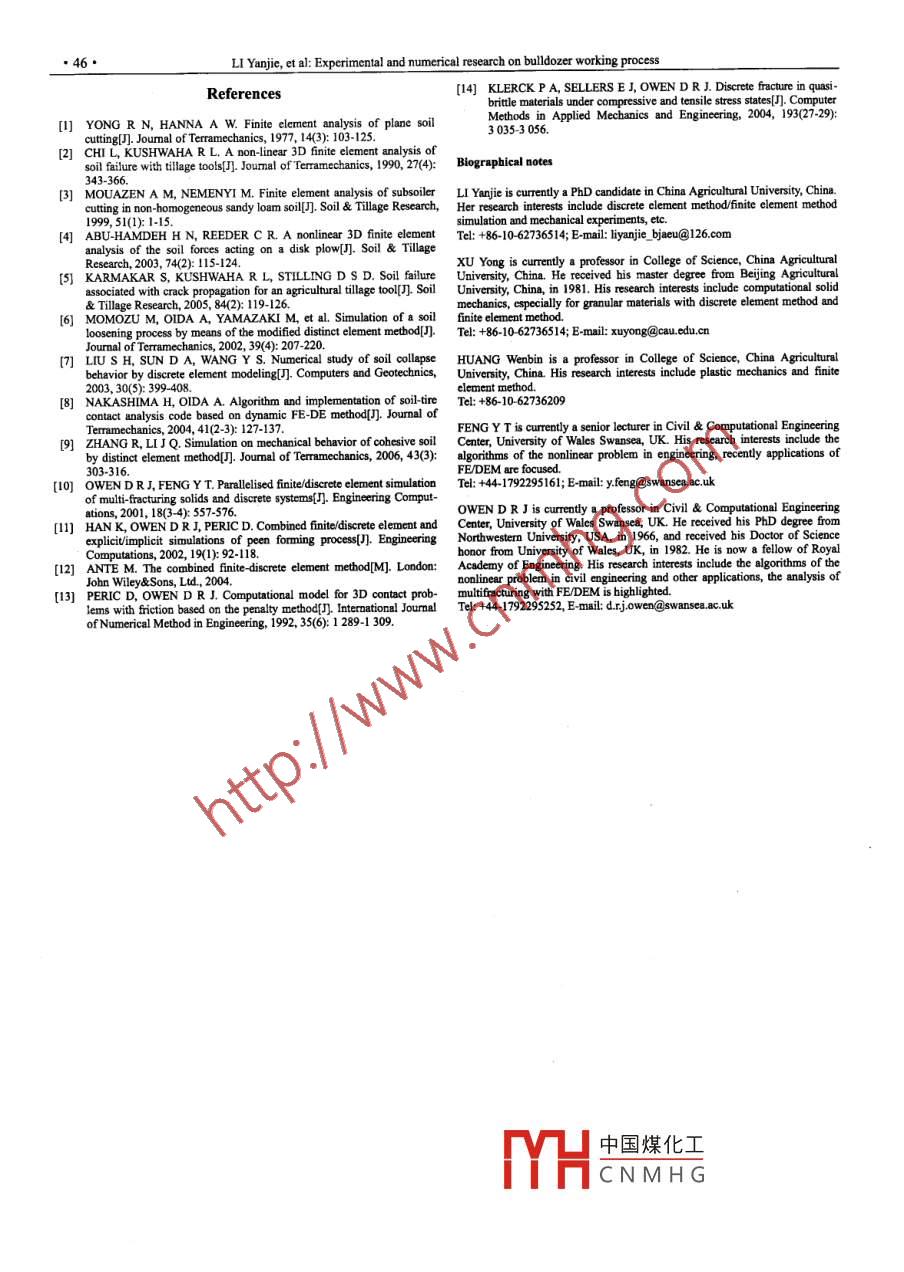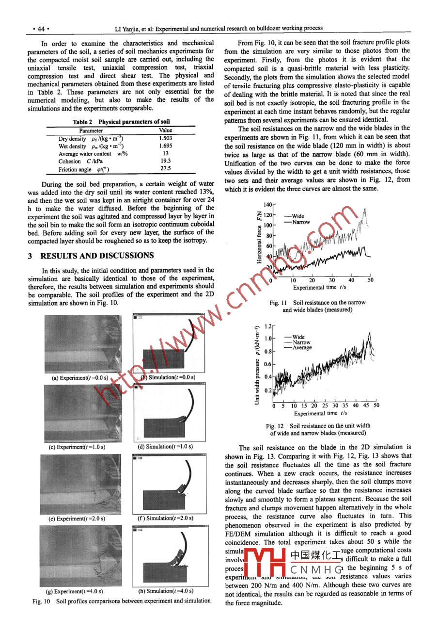 CHINESE JOURNAL OF MECHANICAL ENGINEERINGVol. 20, No. 2, 2007●41●EXPERIMENTAL AND NUMERICALL YanjieRESEARCH ON BULLDOZERXU YongWORKING PROCESS*HUANG WenbinCollge of Science,China Agiutural Universily,Beijing 10083, Chinain theELFEN package. Before snmlation the soil spcimes are cxamined yhrough wrixiaitesilecompression, trixia! copression and direet shear ests to obltin mode: Cacacristits andFENG YTrelevant paramneters, then soil cuting experiments are caried out vIaamini-son binsystem wIthasonlbed of 60/120 mm in widh and 10 mm in deph cut bya.1/9 scale model blldoer blade moving withOWEN DRJthe velocity of 10 mp/s. The soil cositive model includes the ensile castite me for tensilebreakage and the compressive eatplastic rlationship with Mohr-Coulomb crterion. The cutingCivil & Computational Engineringlength in simulatiou is set as 14 of tha in the xerimet dvided into 1 869 tiangular cemems. TheCenter. ,comparison betwen the simulated results and experimental ones shows that the used model is capableUniversityof Wales Swansea,of analyzing soil dynamic behaviors qualitatively, and the predicted fracturing profles in generalns;Swansea SA2 8PP UKconform to the experiment. Hence the feasibility for analyzing soil fracturing bchaviors in tllage orother similar proceses is validated.Key words: Finite element method Discrete element methodFinite elementdistinct clement method(FE/DEM) Soil Bulldozerdisadvantages in analyzing soil behavior. The FEM is hard to0 INTRODUCTIONbreak while the DEM is hard to aggregate.To overcome the limitation ofFEM and to take the advantageSoil failure and its subsequent breakage under the action ofof DEM in dealing with the discrete system, OWEN, et alu“,soil cutting tools is common to may applications, i.e. tllagehave developed a so called combined finite/discrete elementpross with a plow in gricitural nginering and soil lveig mehod for the simolaton of muiatrini of the qusibritein civil engineering. A certain volume of soil in the process maymaterials. In addition to the classical FEM formulation, this newexperience large deformation, crack generation and furthermethod consists of two additional parts: One is the failure andfragmentation, while the resulting discrete blocks may movefracture mechanism based on the theory of fracture mechanics,wibin he suroundingn are, and Colide wih each otber. These and he other is the agoritimis for the conter ieretieon betveencomplex physical phenomena evolve transient changes fromthe discrete elements resulted from the fragmentation of thecontinuum to discontinuous states. Therefore the general theorycontinum. The finite element/distinct element method (FE/DEM)for (nuumnd related numerical methods can mnodel ooly the combined the advantages of FEM and DEM together, therefore itsoil behavior at the continuous stage, whereas cannot deal withcan be used in multi-fracturing analysis of quasibritle materialsthe consequent discontinuous state. Unlike the remarkablesuch as rock and concrete. ANTE4I described the FE/DEM in hisadvance in numerical methods for continuous problems,book in detail.comparatively less success has been achieved in the numericalAlthoughhe FE/DEM has been scessfully applied tomodeling of soil dynamics due to the diversity of the constitutive many eginering problems involving multifacturing phenom-relationships and the lack of iteraction mechanism for the ena, its use for analyzing the soil dynamics has not bee reporteddiscrete soil blocks, even though great efforts have been made inup to date. The purpose of this paper is to investigate the potentialthe field. On the other hand, the need for gaining a gooapplicability of the method to numerically analyze the fracturingunderstanding on the transient process of soil from continuous toof a dense moist clay bed disturbed by a bulldozer blade, anddiscontinuous states becomes crucial due to its important role further to validate the numeriricalresultsuts by' experimental teplaying in many engineering applications, such as dam collapse,In order to focus the application aspect of FE/DEM for theexplosion and slope stability, etc.current problem, the algorithmic detail of the FE/DE method isThere are mainly two numerical methods used in soil omitted in the paper. The detailed description of the method,dynamics: the finite element method (FEM) and the discrete however, can be found in Refs. [13-14].element method(DEM). The former is commonly used in solid1 NUMERICAL MODEL AND MATERIALmechanics and fluicdynamics, whilethe later is suitable forparticle/discontinuous systems. Many investigators studied soilPARAMETERScutting and tllage with FEM[+4. These works, however, do nottake into account crack initiation, propagation and subsequent1.1 Soil failure constitutive modelfracturing in their numerical models. Recently KARMAKAR, etThe core of the FE/DEM is to choose a proper constitutiveals, carried out an experimental study on soil failure associatedwith crack popagation for an aigcuturat tlgeg tl Compared model for the soil concemed. Sine the compresive stengh iswith the FEM, the DEM, which is based on the iteraction much greater than the tnsile strengh for qusibittle materialsbetween discrete objects and the motion law, has its advantage inthe main form of failure is mostlv due to the tensile stress. Hencedescription of discrete particle systerms or agglomerates. There the soi中國煤化工aper is a combination ofare fewer investigators studying the soil dynamic behavior with tensile:npressive elasto-plasticDEM[69. Both FEM and DEM have their own advantages and deformCNMHGipalstresatapointistensile, the stress value is checked whether it reaches the tensile* This project is supported by National Natural Science Foundation of Chinastrength according to the maximum (tensile) stress theory. If not,(No.10372113) and Royal Society-NSFC China-UK Joint Project (No.the deformnation is elastic, otherwise the point will start linearly16468). Reeved September 7. 20060 reeived in 