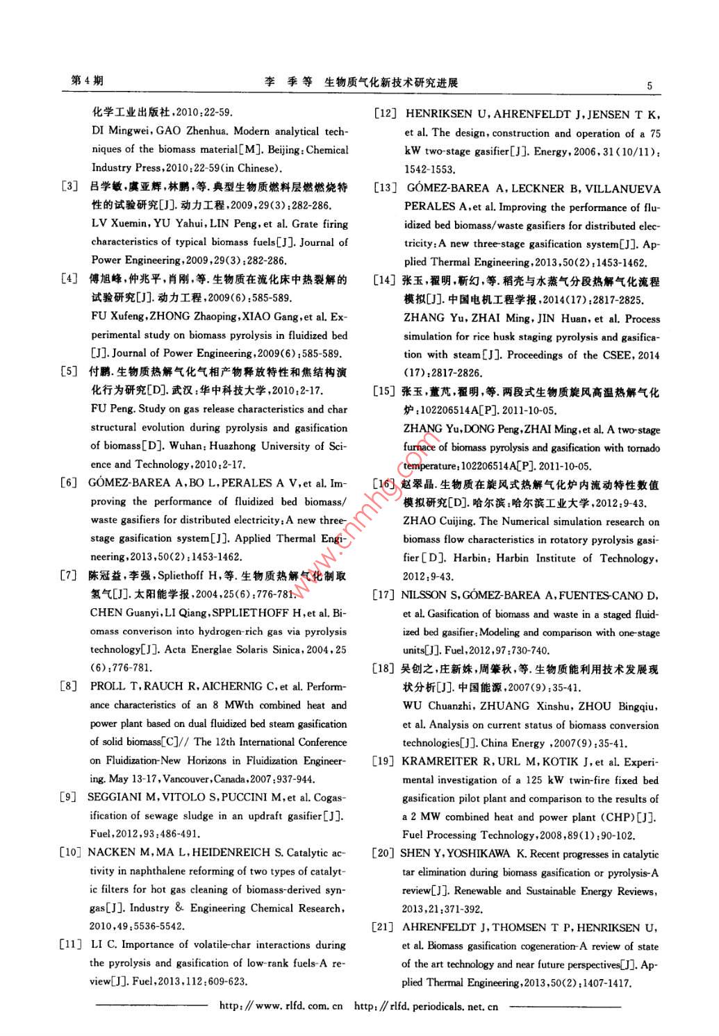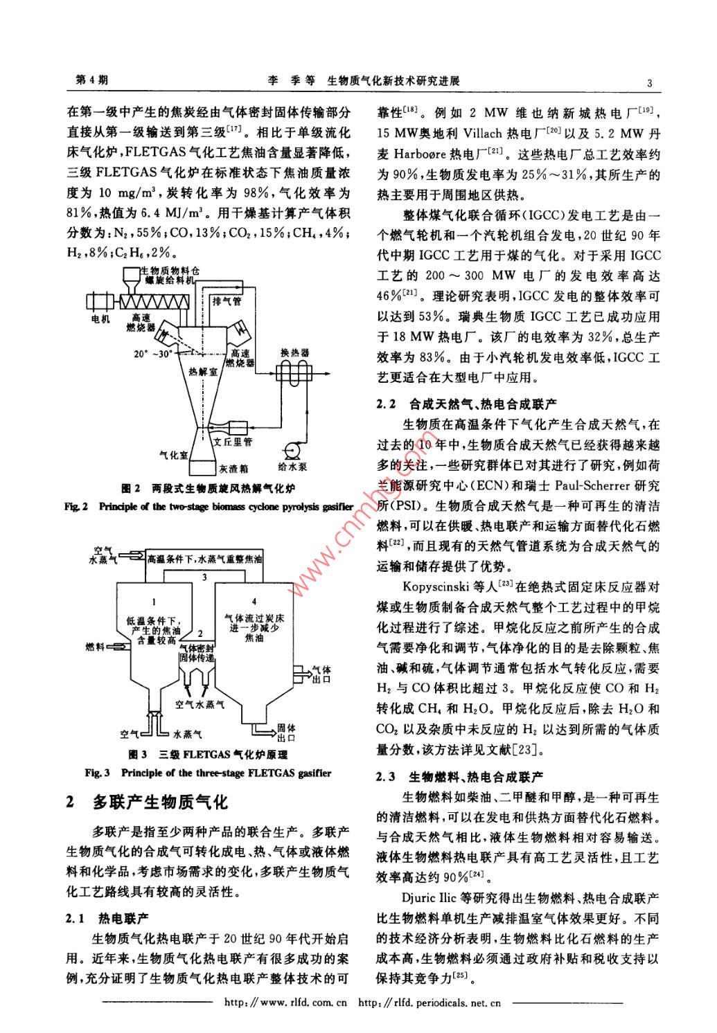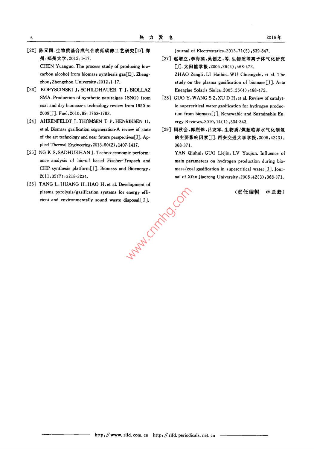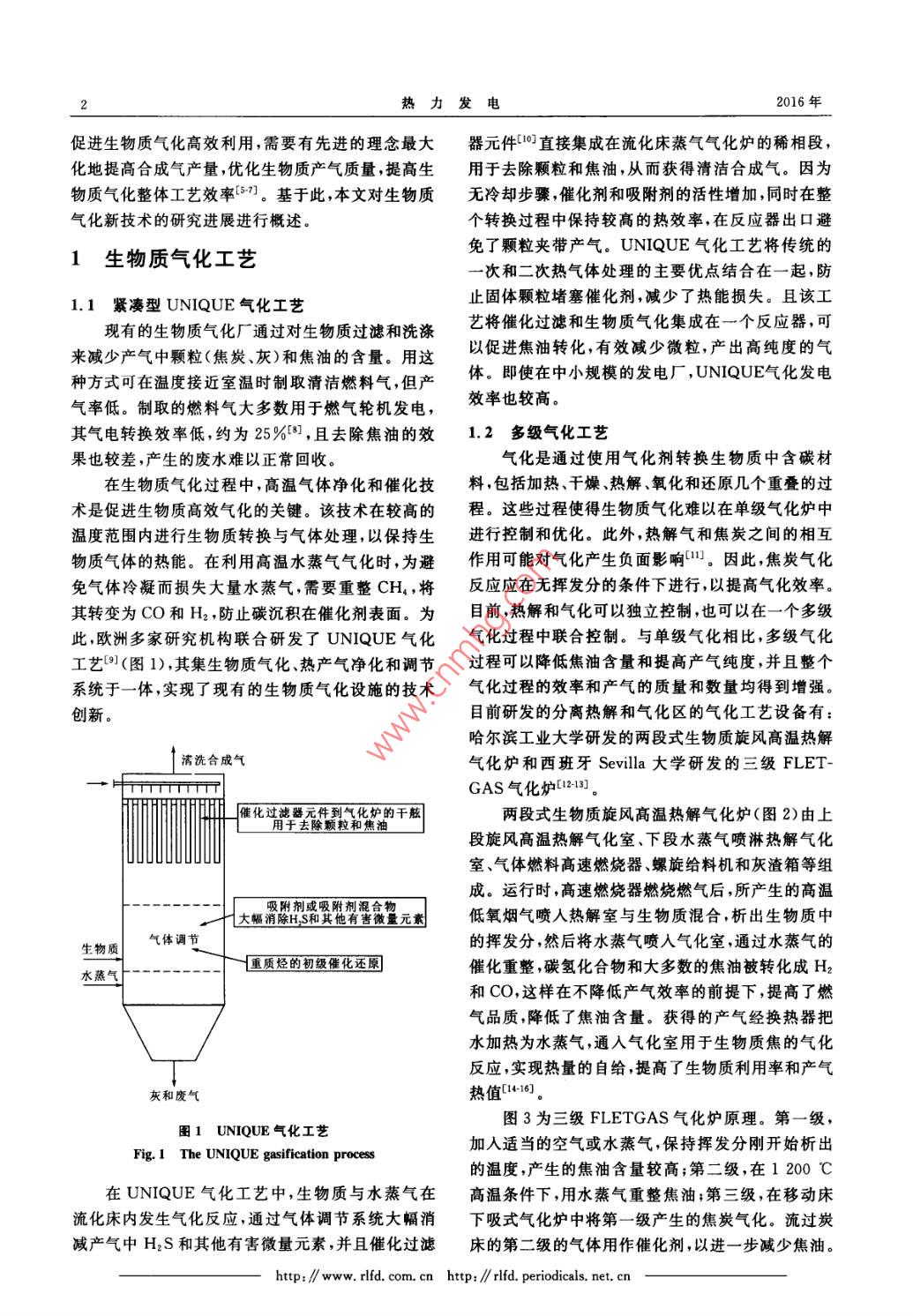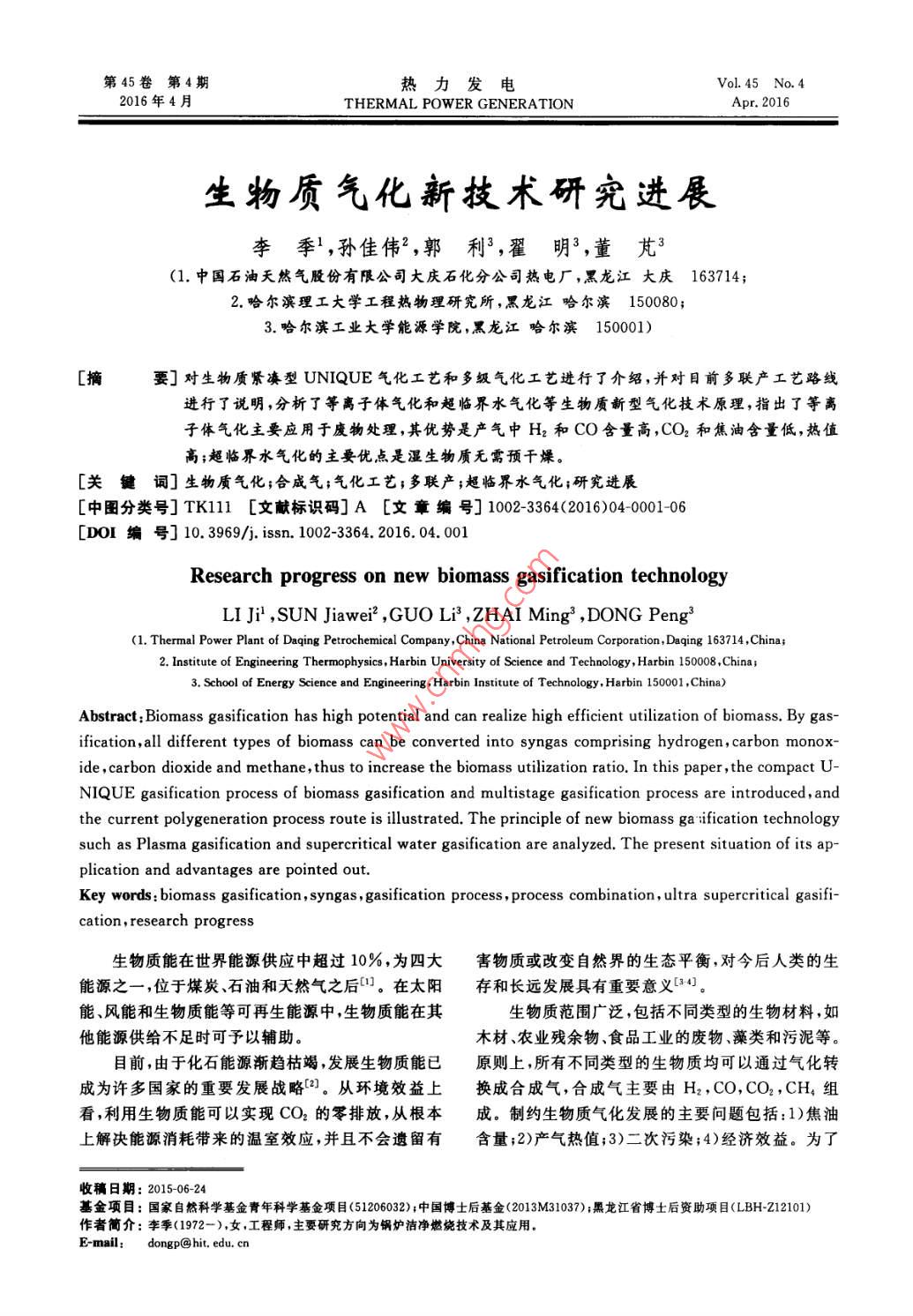 第45卷第4期熱力發(fā)電Vol. 45 No. 42016年4月.THERMAL POWER GENERATIONApr. 2016生物質(zhì)氣化新技術(shù)研究進展李季',孫佳偉,郭利,翟明3,董芃3(1.中國石油天然氣股份有限公司大慶石化分公司熱電廠,黑龍江大慶163714;2.哈爾濱理工大學(xué)工程熱物理研究所,黑龍江哈爾濱150080;3.哈爾濱工業(yè)大學(xué)能源學(xué)院,黑龍江哈爾濱150001). [摘要]對生物質(zhì)緊湊型UNIQUE氣化工藝和多級氣化工藝進行了介紹,并對目前多聯(lián)產(chǎn)工藝路線進行了說明,分析了等離子體氣化和超臨界水氣化等生物質(zhì)新型氣化技術(shù)原理,指出了等離子體氣化主要應(yīng)用于廢物處理,其優(yōu)勢是產(chǎn)氣中H2和CO含量高,CO2和焦油含量低,熱值高;超臨界水氣化的主要優(yōu)點是濕生物質(zhì)無需預(yù)干燥。[關(guān)鍵詞]生物質(zhì)氣化;合成氣;氣化工藝;多聯(lián)產(chǎn);超臨界水氣化;研究進展[中團分類號] TK111 [文獻標(biāo)識碼]A [文 章編號] 1002-3364(2016)04-0001-06[DOI編號] 10. 3969/j. issn. 1002-3364. 2016. 04. 001Research progress on new biomass gasification technologyLI Ji' ,SUN Jiawei? ,GUO Li ,ZHAI Ming3 ,DONG Peng3(1. Thermal Power Plant of Daqing Petrochemical Company ,China National Petroleum Corporation,Daqing 163714,China;2. Institute of Engineering Thermophysics,Harbin University of Science and Technology , Harbin 150008 ,China;3. School of Energy Science and Engineering, Harbin Institute of Technology, Harbin 150001 ,China)Abstract: Biomass gasification has high potential and can realize high efficient utilization of biomass. By gas-ification,all different types of biomass can be converted into syngas comprising hydrogen , carbon monox-ide ,carbon dioxide and methane, thus to increase the biomass utilization ratio. In this paper ,the compact U-NIQUE gasification process of biomass gasification and multistage gasification process are introduced , andthe current polygeneration process route is illustrated. The principle of new biomass ga ification technologysuch as Plasma gasification and supercritical water gasification are analyzed. The present situation of its ap-plication and advantages are pointed out.Key words : biomass gasification, syngas, gasification process, process combination, ultra supercritical gasifi-cation, research progress生物質(zhì)能在世界能源供應(yīng)中超過10%,為四大害物質(zhì)或改變自然界的生態(tài)平衡,對今后人類的生能源之一,位于煤炭、石油和天然氣之后”。在太陽存和長遠發(fā)展具有重要意義[34。能、風(fēng)能和生物質(zhì)能等可再生能源中,生物質(zhì)能在其生物質(zhì)范圍廣泛,包括不同類型的生物材料,如他能源供給不足時可予以輔助。木材、農(nóng)業(yè)殘余物、食品工業(yè)的廢物、藻類和污泥等。目前,由于化石能源漸趨枯竭,發(fā)展生物質(zhì)能已原則上,所有不同類型的生物質(zhì)均可以通過氣化轉(zhuǎn)成為許多國家的重要發(fā)展戰(zhàn)略[1。從環(huán)境效益上換成合成氣,合成氣主要由H2,CO,CO2,CH, 組看,利用生物質(zhì)能可以實現(xiàn)CO2的零排放,從根本成。制約生物質(zhì)氣化發(fā)展的主要問題包括:1)焦油上解決能源消耗帶來的溫室效應(yīng),并且不會遺留有含量;2)產(chǎn)氣熱值;3)二次污染;4)經(jīng)濟效益。為了收稿日期: 2015-06-24基金項目:國家自然科學(xué)基金青年科學(xué)基金項目(51206032);中國博士后基金(2013M31037) ;黑龍江省博士后資助項目(LBH-Z12101)作者簡介:李季(1972- -),女,工程師,主要研究方向為鍋爐沽凈燃燒技術(shù)及其應(yīng)用。E-mail: dongp@hit. edu. cn熱力發(fā)電2016年促進生物質(zhì)氣化高效利用,需要有先進的理念最大器元件[10]直接集成在流化床蒸氣氣化爐的稀相段,化地提高合成氣產(chǎn)量,優(yōu)化生物質(zhì)產(chǎn)氣質(zhì)量,提高生用于去除顆粒和焦油,從而獲得清潔合成氣。因為物質(zhì)氣化整體工藝效率[57]?;诖?本文對生物質(zhì)無冷卻步驟,催化劑和吸附劑的活性增加,同時在整氣化新技術(shù)的研究進展進行概述.個轉(zhuǎn)換過程中保持較高的熱效率,在反應(yīng)器出口避免了顆粒夾帶產(chǎn)氣。UNIQUE氣化工藝將傳統(tǒng)的1生物質(zhì)氣化工藝一次和二次熱氣體處理的主要優(yōu)點結(jié)合在- -起,防止固體顆粒堵塞催化劑,減少了熱能損失。且該工1.1 緊湊型UNIQUE氣化工藝現(xiàn)有的生物質(zhì)氣化廠通過對生物質(zhì)過濾和洗滌藝將催化過濾和生物質(zhì)氣化集成在一個反應(yīng)器,可來減少產(chǎn)氣中顆粒(焦炭、灰)和焦油的含量。用這以促進焦油轉(zhuǎn)化,有效減少微粒,產(chǎn)出高純度的氣種方式可在溫度接近室溫時制取清潔燃料氣,但產(chǎn)體。即使在中小規(guī)模的發(fā)電廠,UNIQUE氣化發(fā)電氣率低。制取的燃料氣大多數(shù)用于燃氣輪機發(fā)電,效率也較高。其氣電轉(zhuǎn)換效率低,約為25%[8,且去除焦油的效1.2多級氣化工藝果也較差,產(chǎn)生的廢水難以正?;厥?。氣化是通過使用氣化劑轉(zhuǎn)換生物質(zhì)中含碳材在生物質(zhì)氣化過程中,高溫氣體凈化和催化技料,包括加熱、干燥、熱解,氧化和還原幾個重疊的過術(shù)是促進生物質(zhì)高效氣化的關(guān)鍵。該技術(shù)在較高的程。這些過程使得生物質(zhì)氣化難以在單級氣化爐中溫度范圍內(nèi)進行生物質(zhì)轉(zhuǎn)換與氣體處理,以保持生進行控制和優(yōu)化。此外,熱解氣和焦炭之間的相互物質(zhì)氣體的熱能。在利用高溫水蒸氣氣化時,為避